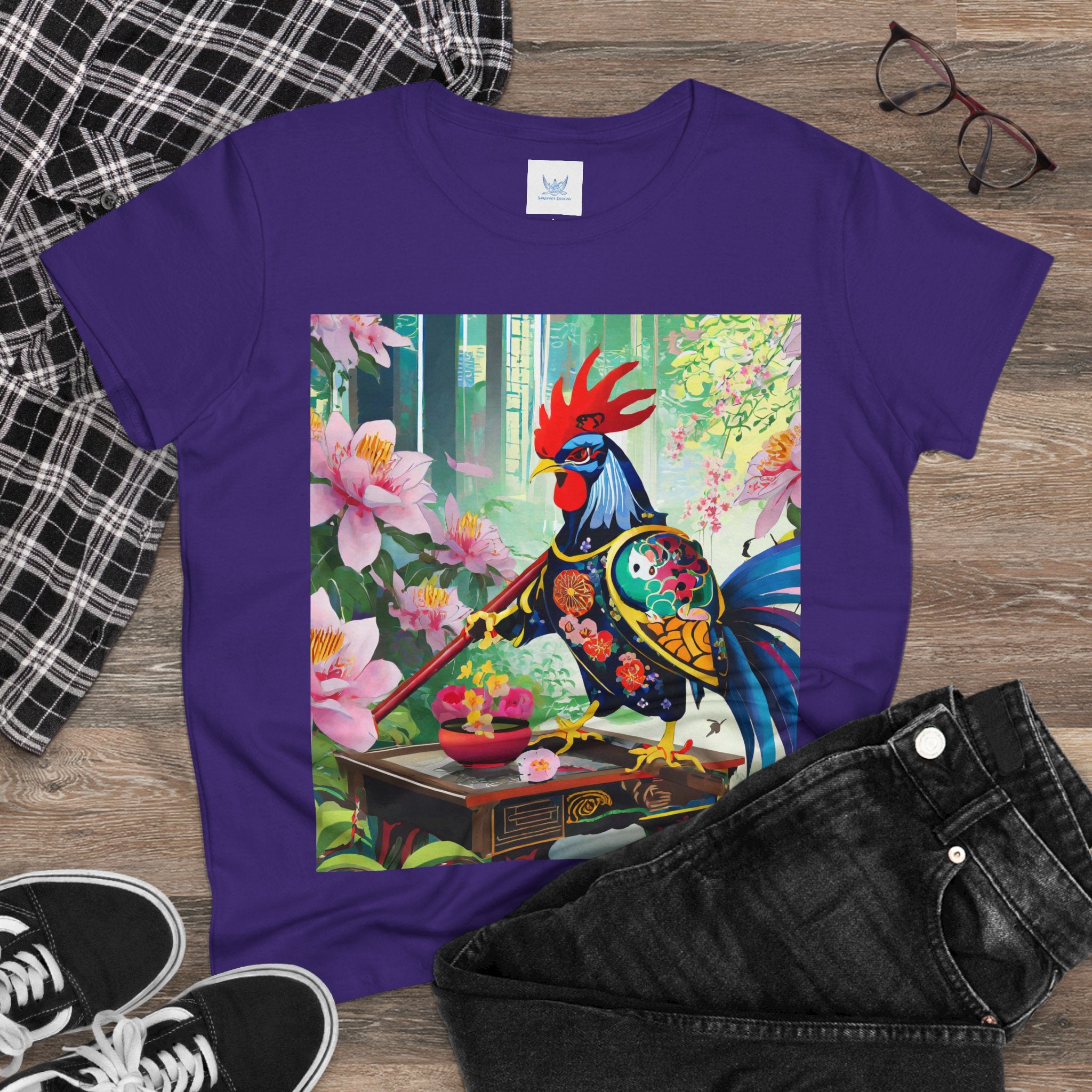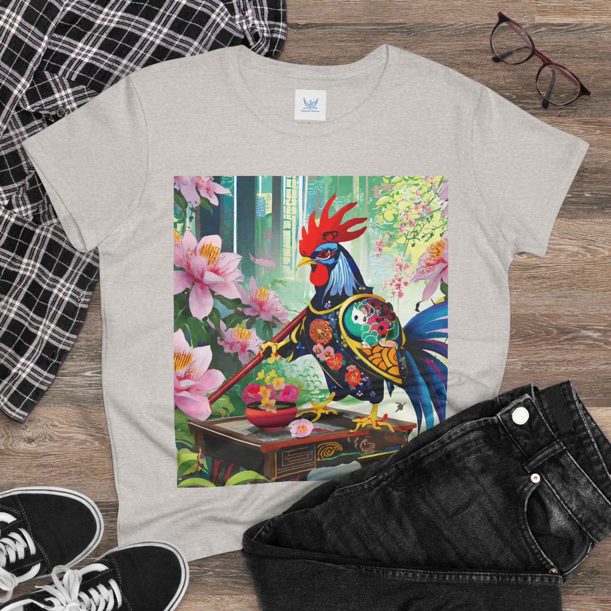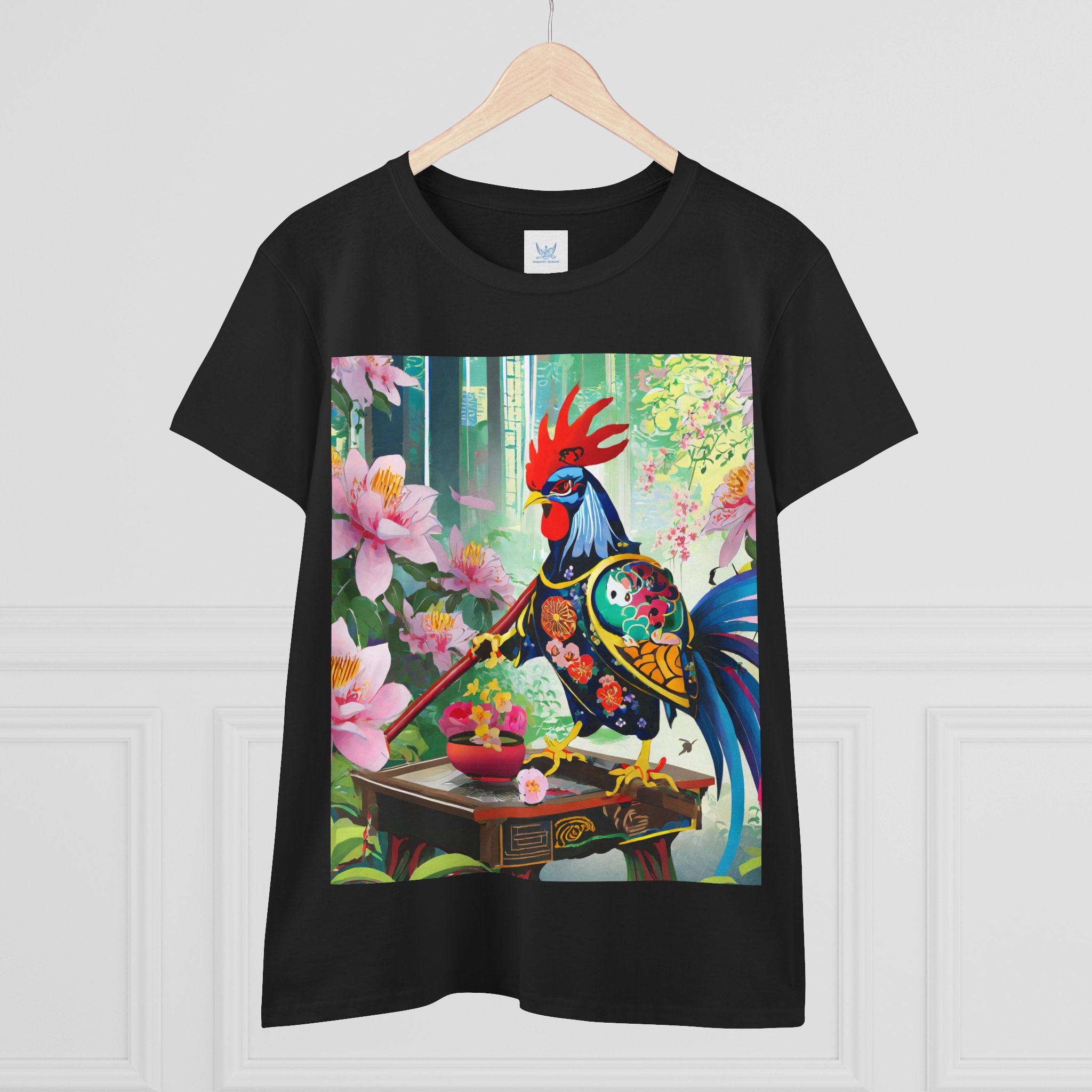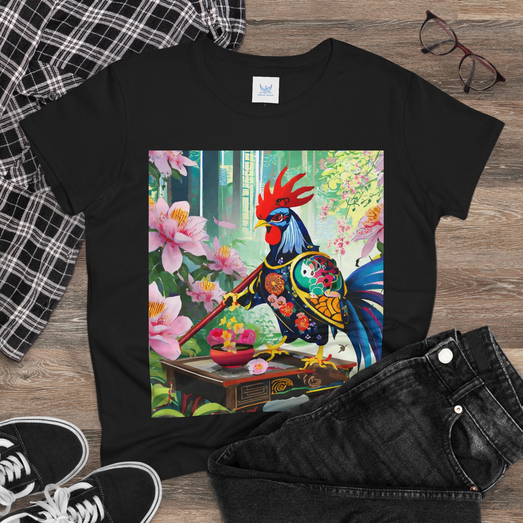 Across the front, a samurai-rooster infused with cybernetic enhancements practices the art of Japanese flower arranging amid a neon-soaked cyberpunk garden. Fusing ancient tradition with futuristic technology, the design blends discipline, culture, and striking innovation—turning this tee into wearable storytelling.