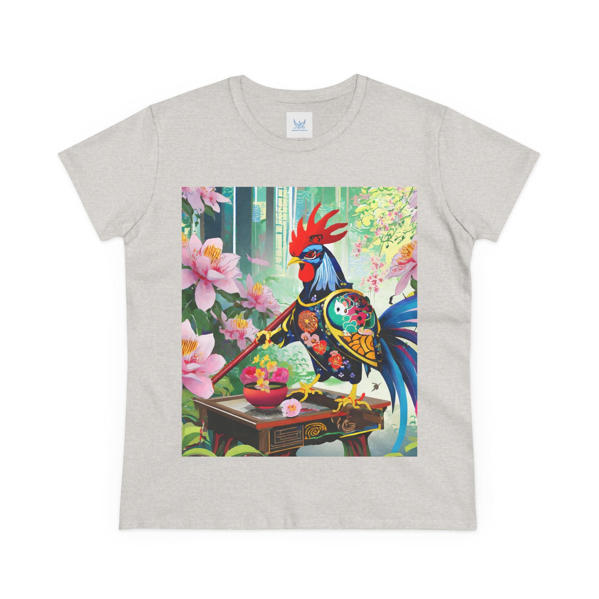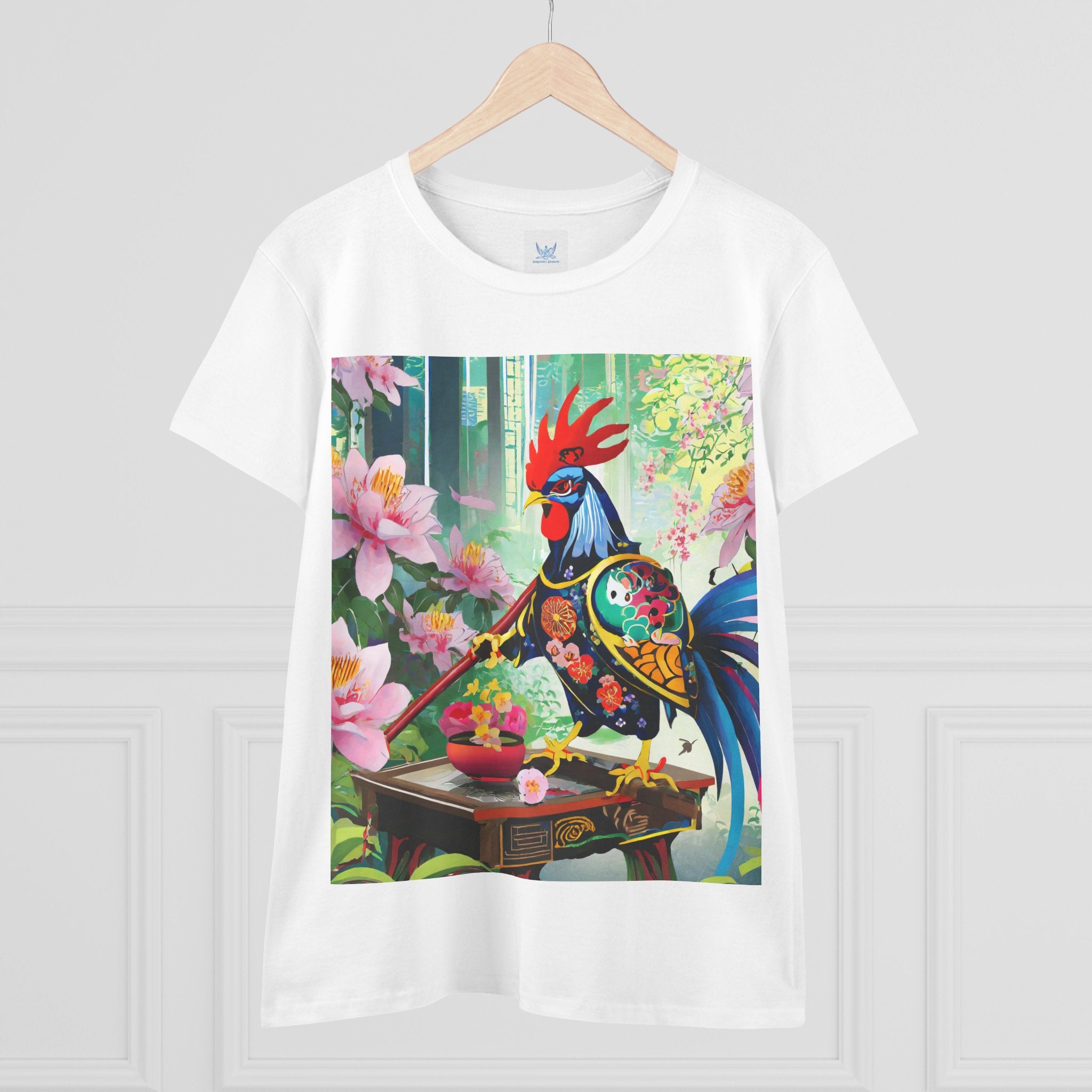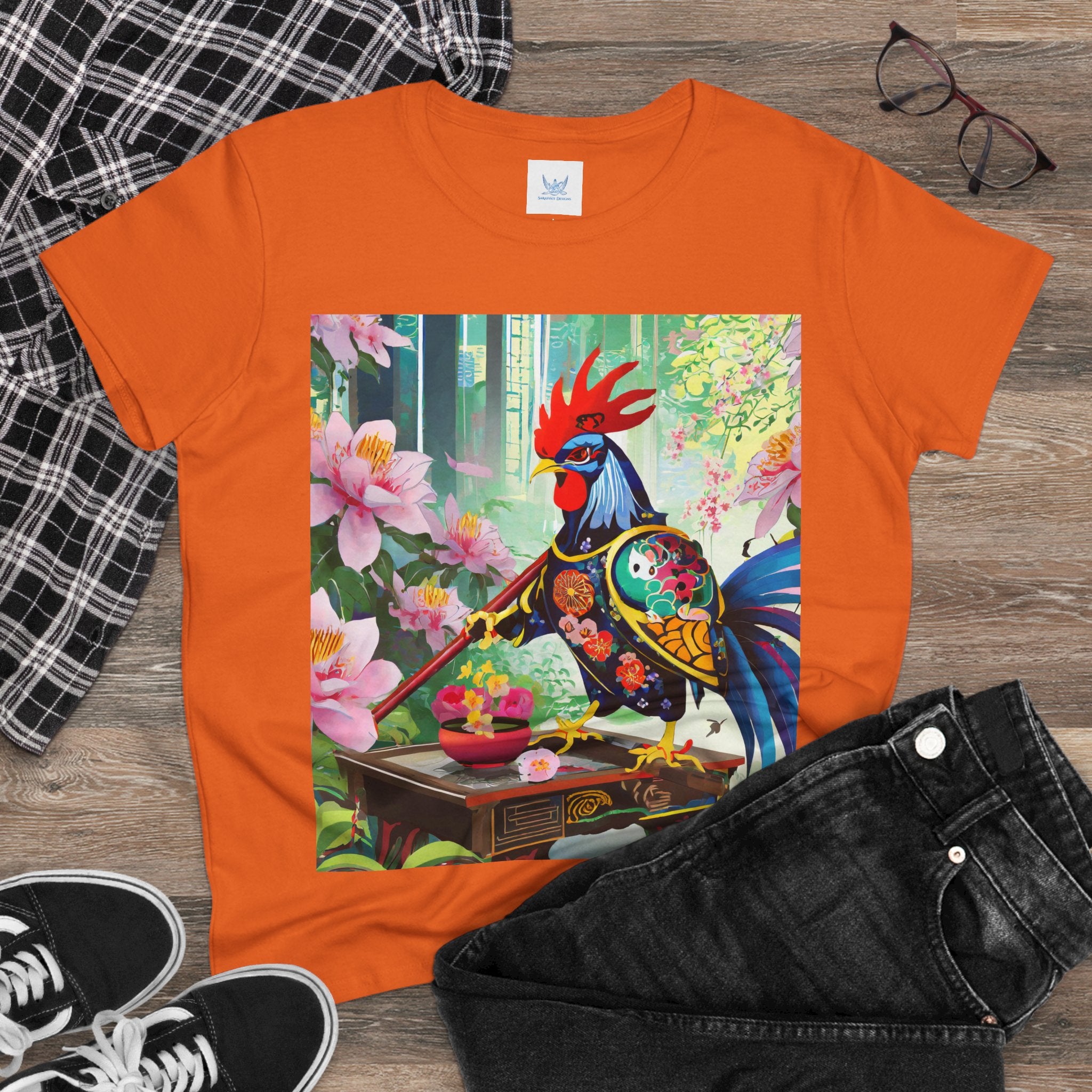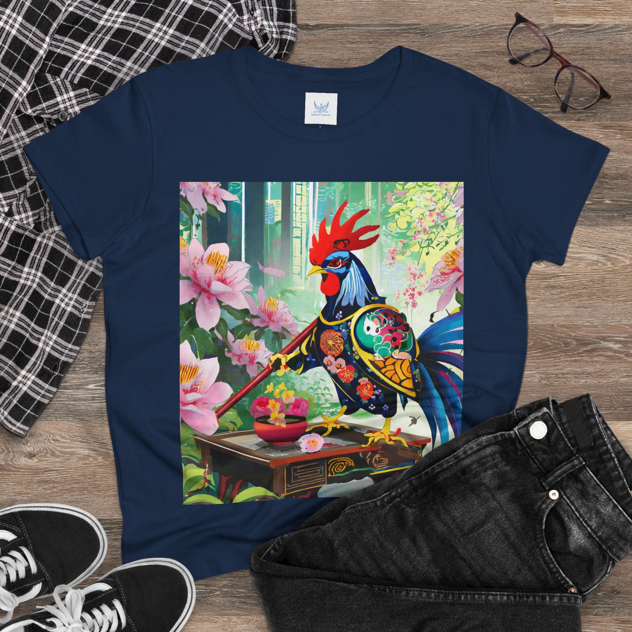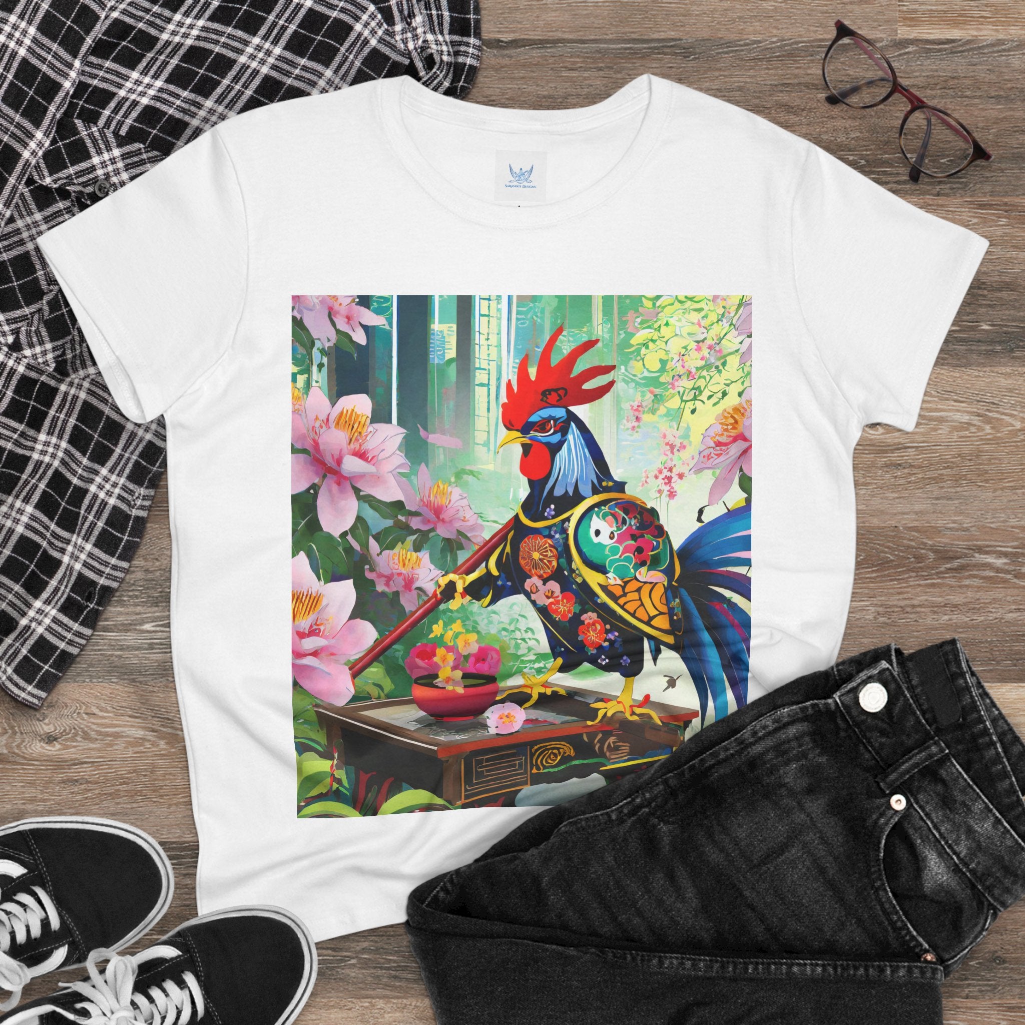 Across the front, a samurai-rooster infused with cybernetic enhancements practices the art of Japanese flower arranging amid a neon-soaked cyberpunk garden. Fusing ancient tradition with futuristic technology, the design blends discipline, culture, and striking innovation—turning this tee into wearable storytelling.