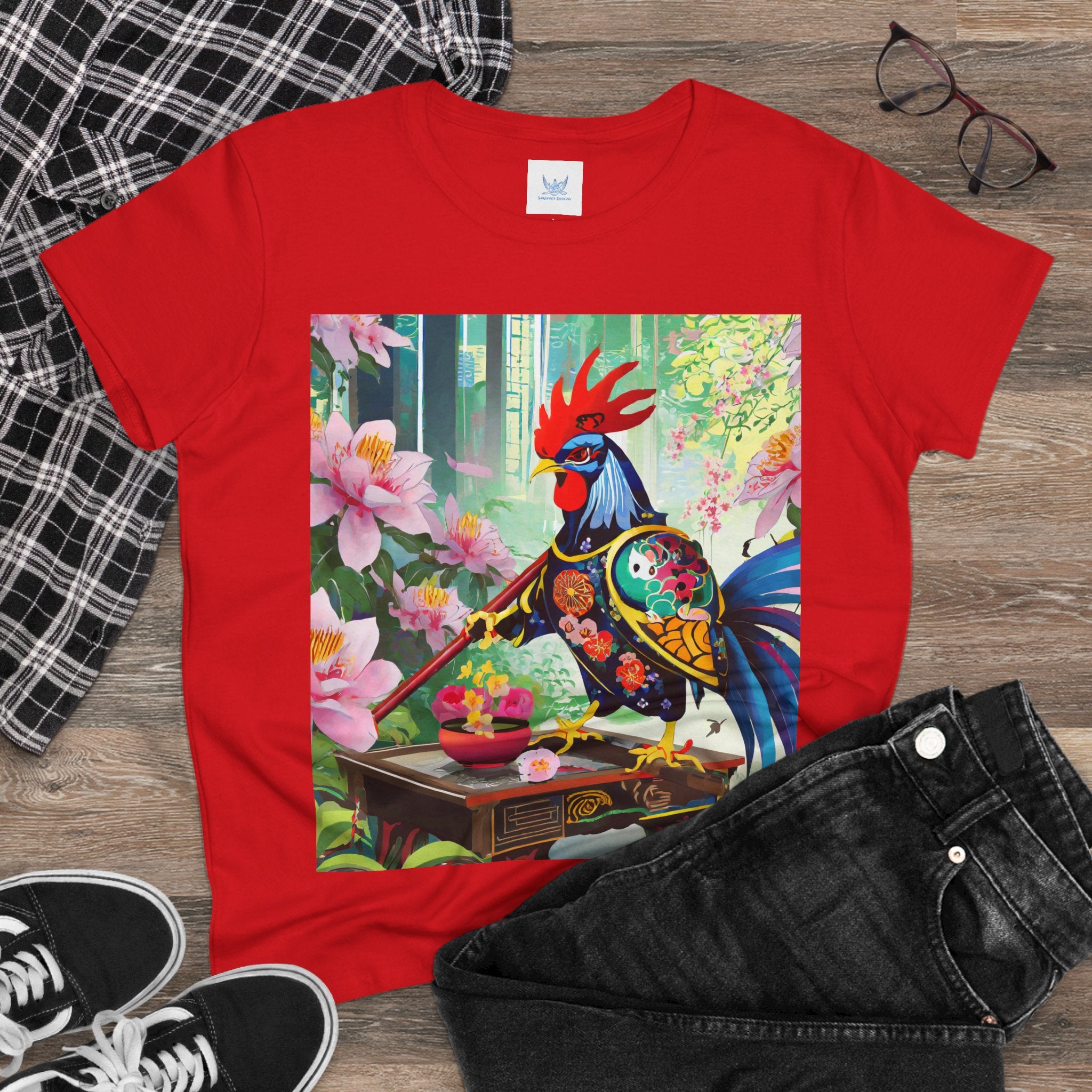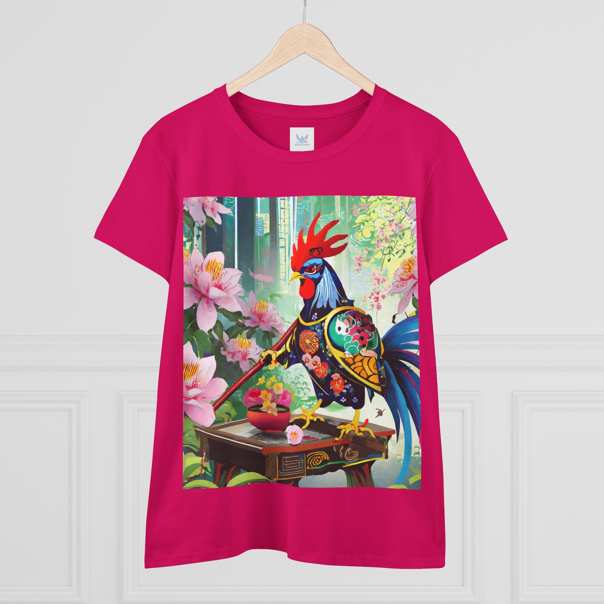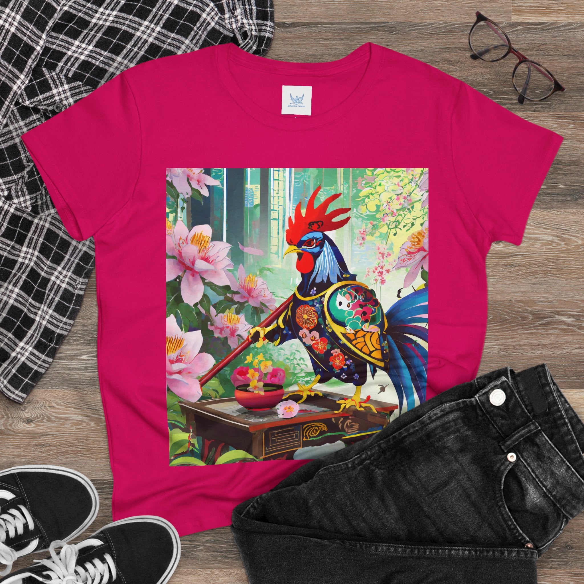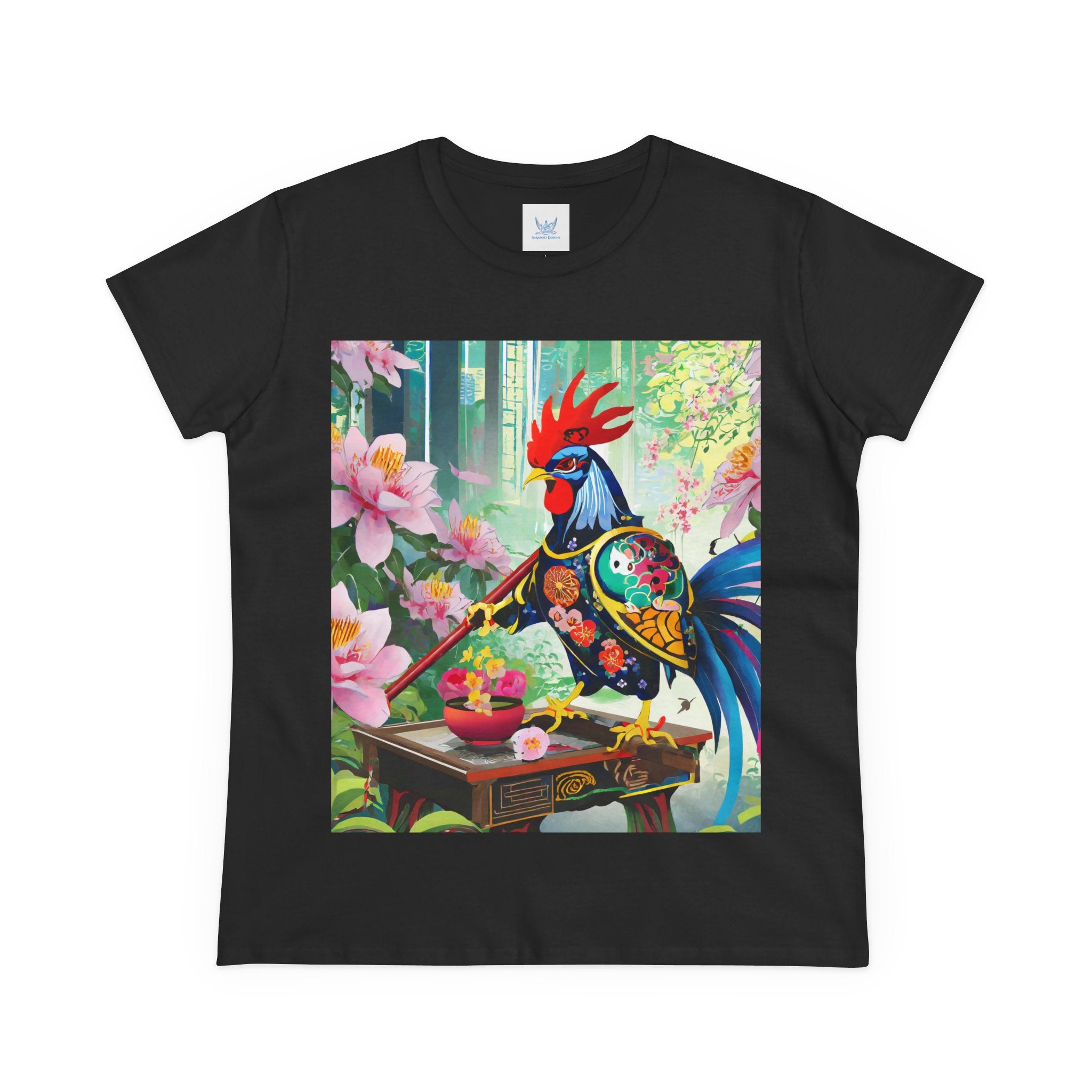 Across the front, a samurai-rooster infused with cybernetic enhancements practices the art of Japanese flower arranging amid a neon-soaked cyberpunk garden. Fusing ancient tradition with futuristic technology, the design blends discipline, culture, and striking innovation—turning this tee into wearable storytelling.