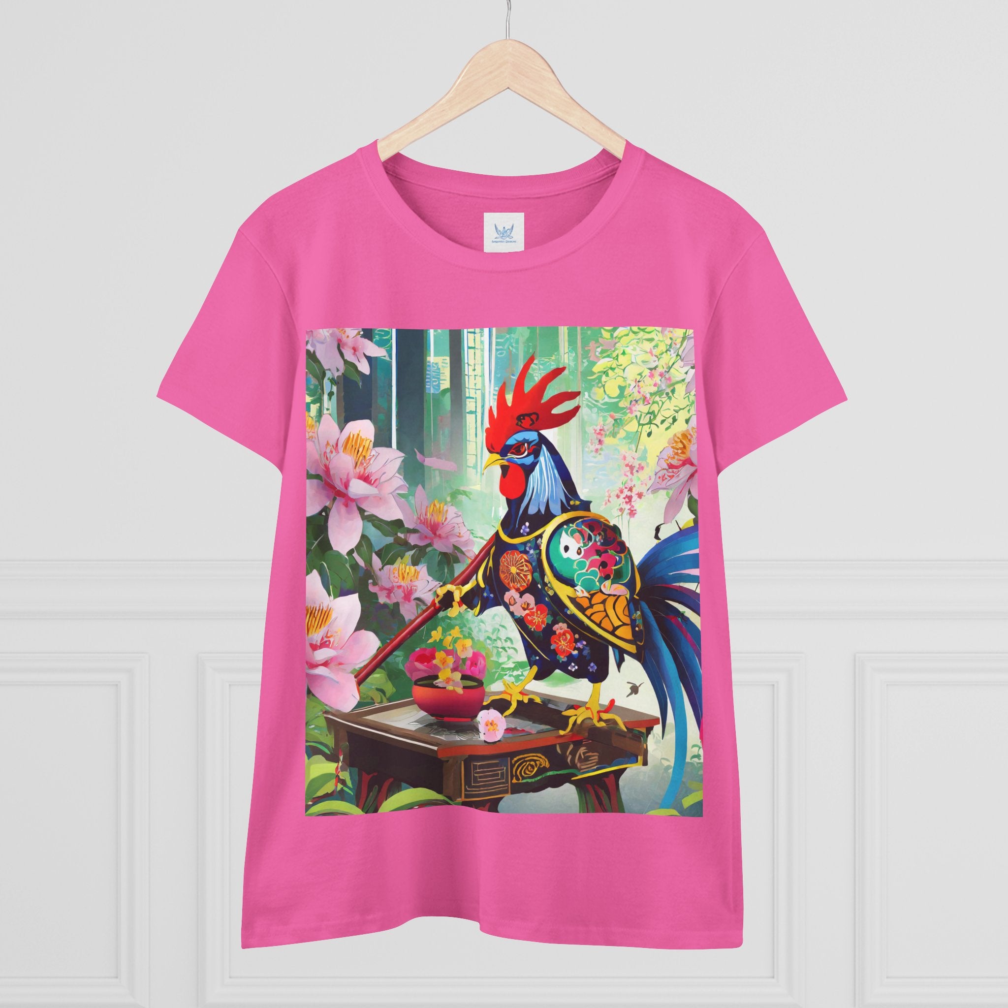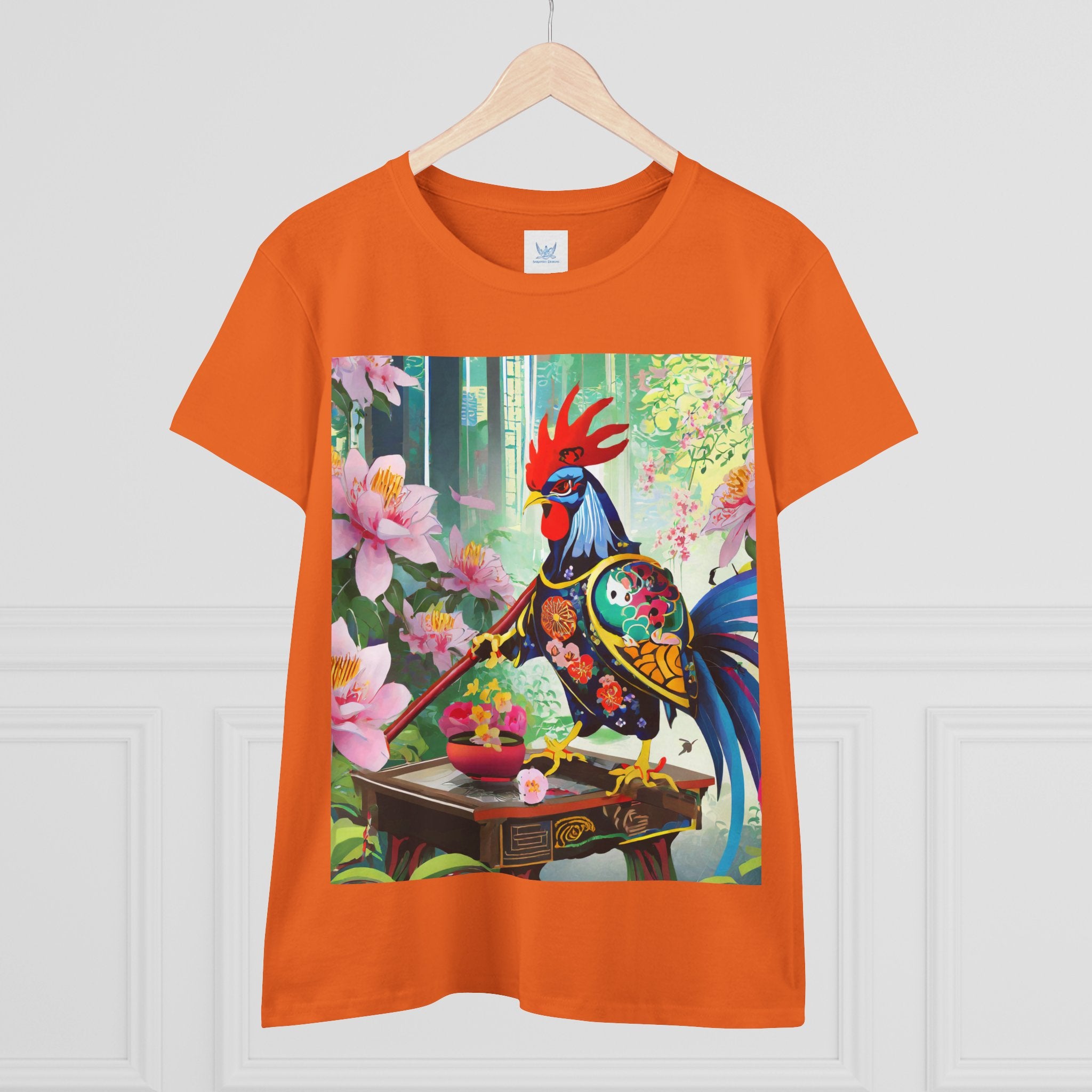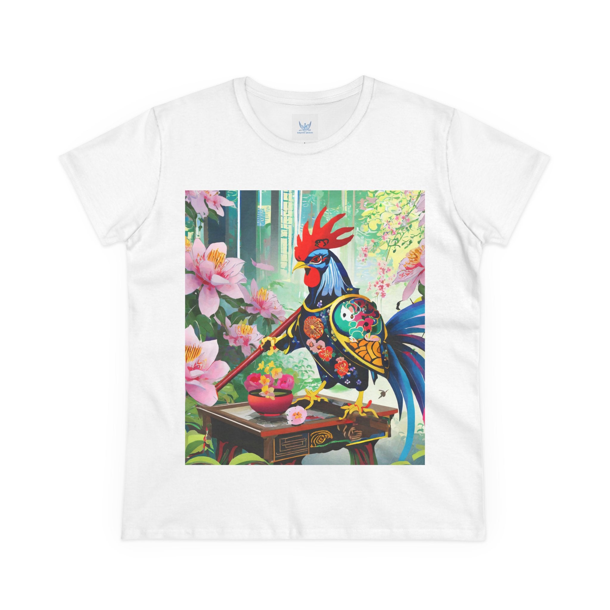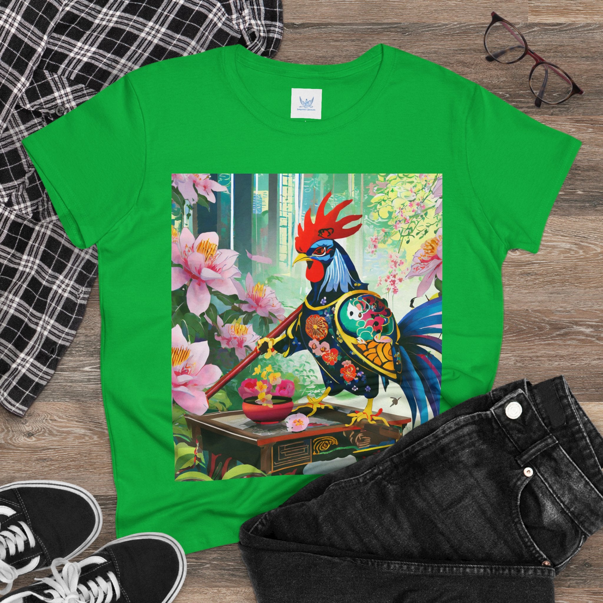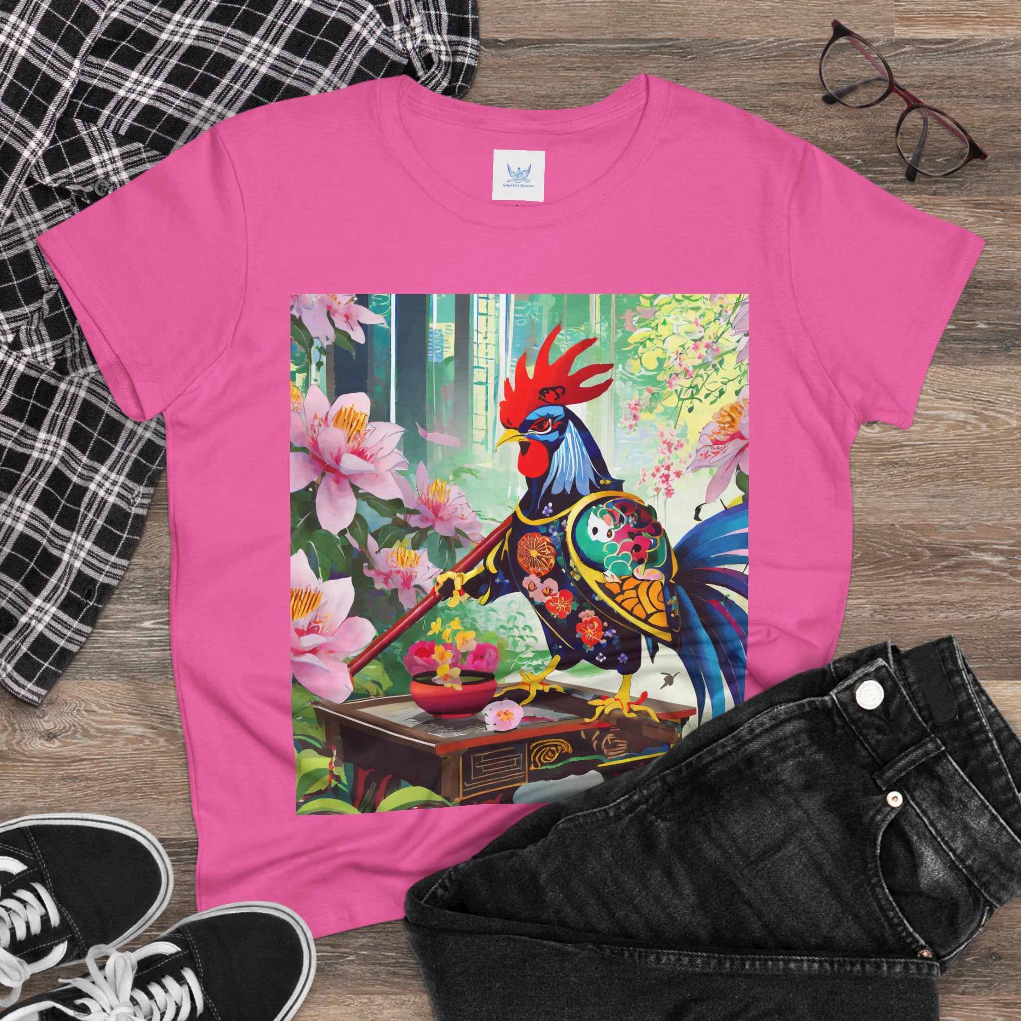 Across the front, a samurai-rooster infused with cybernetic enhancements practices the art of Japanese flower arranging amid a neon-soaked cyberpunk garden. Fusing ancient tradition with futuristic technology, the design blends discipline, culture, and striking innovation—turning this tee into wearable storytelling.