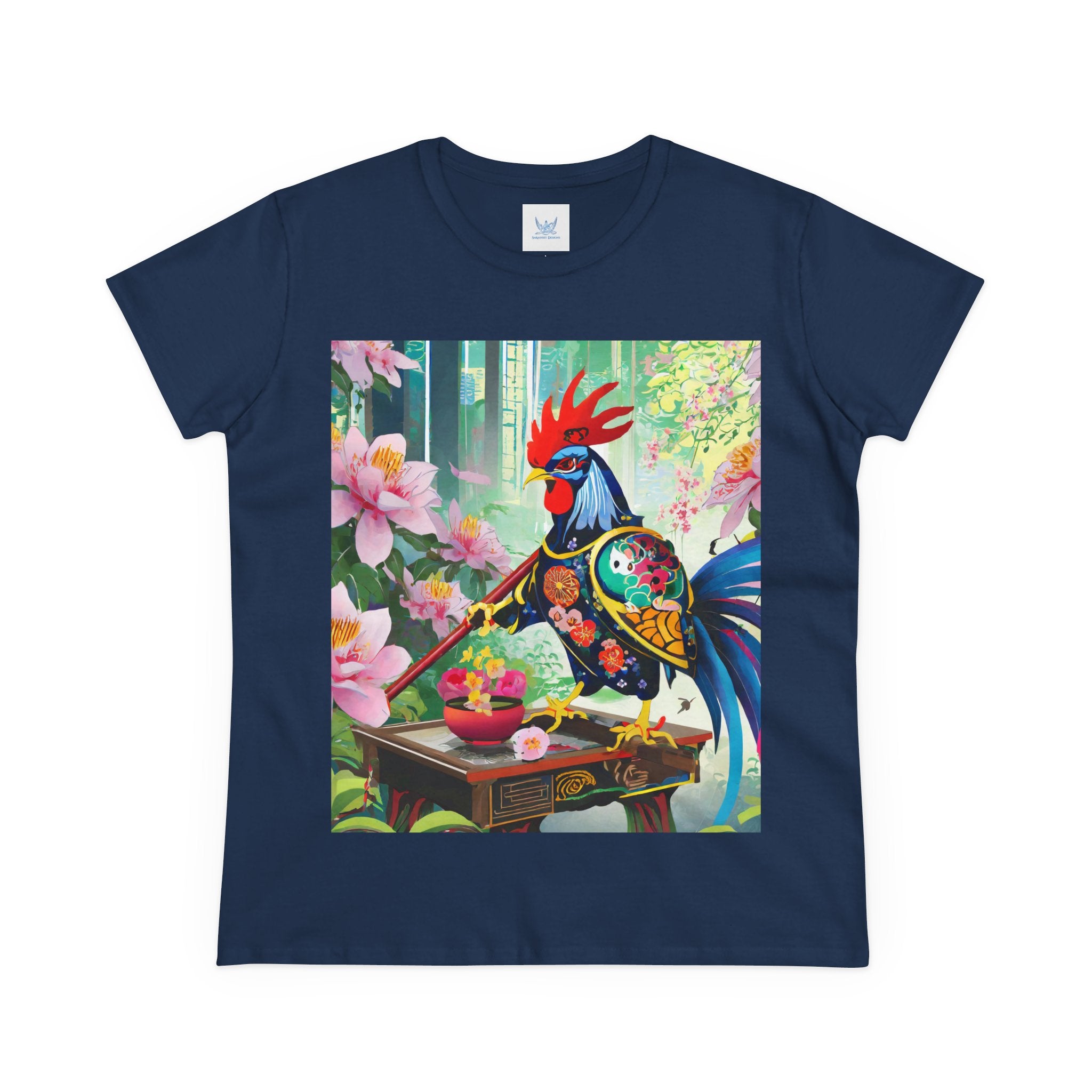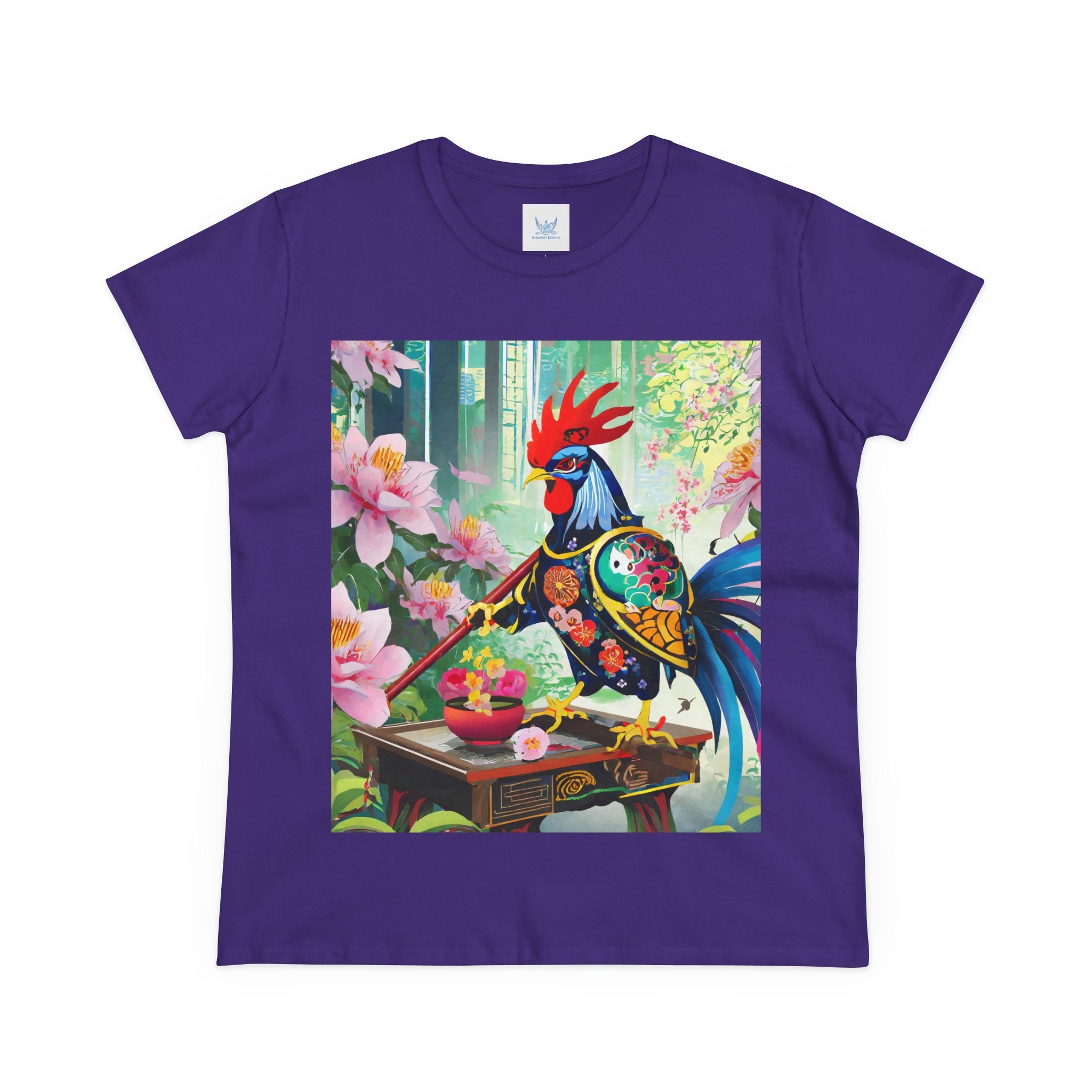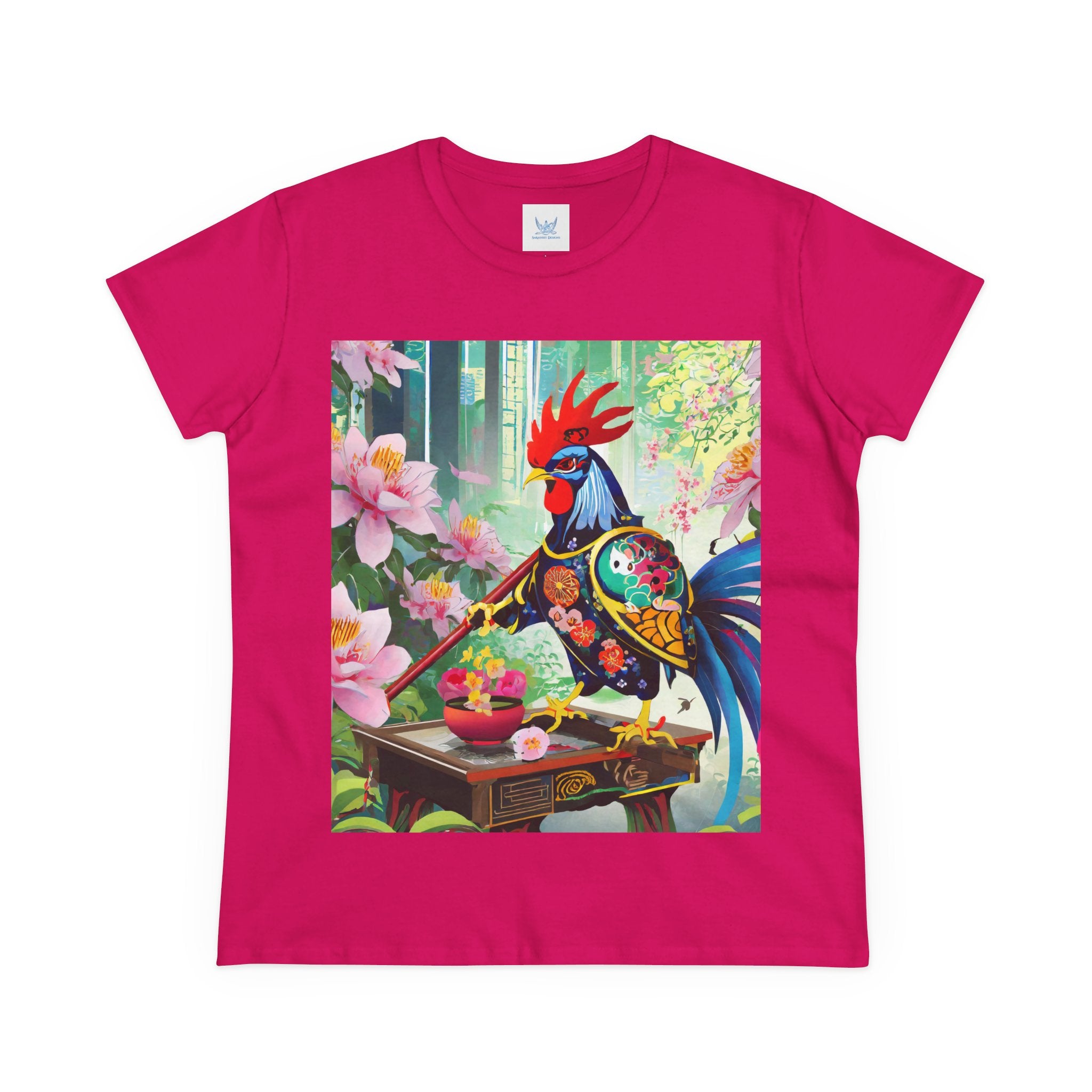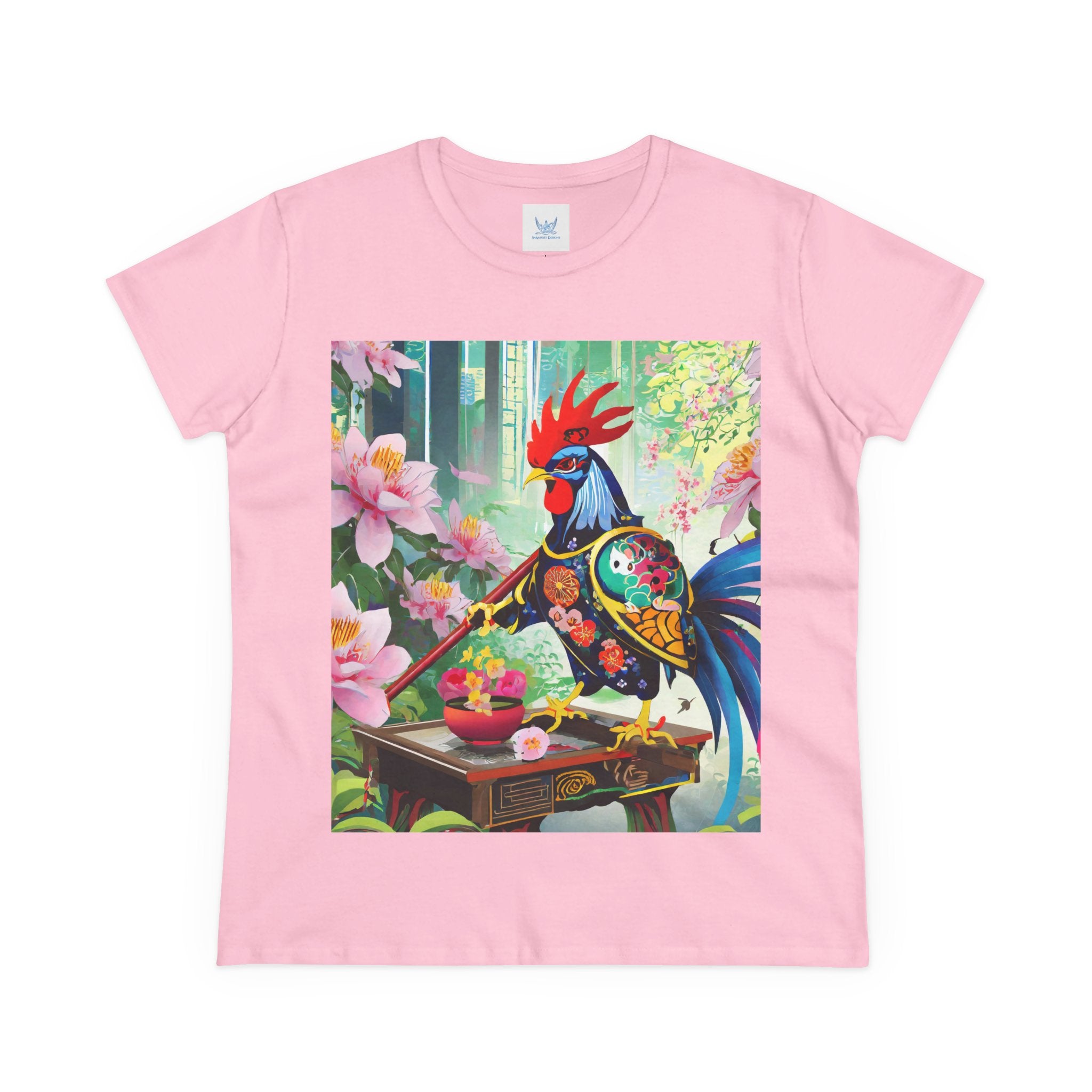 Across the front, a samurai-rooster infused with cybernetic enhancements practices the art of Japanese flower arranging amid a neon-soaked cyberpunk garden. Fusing ancient tradition with futuristic technology, the design blends discipline, culture, and striking innovation—turning this tee into wearable storytelling.