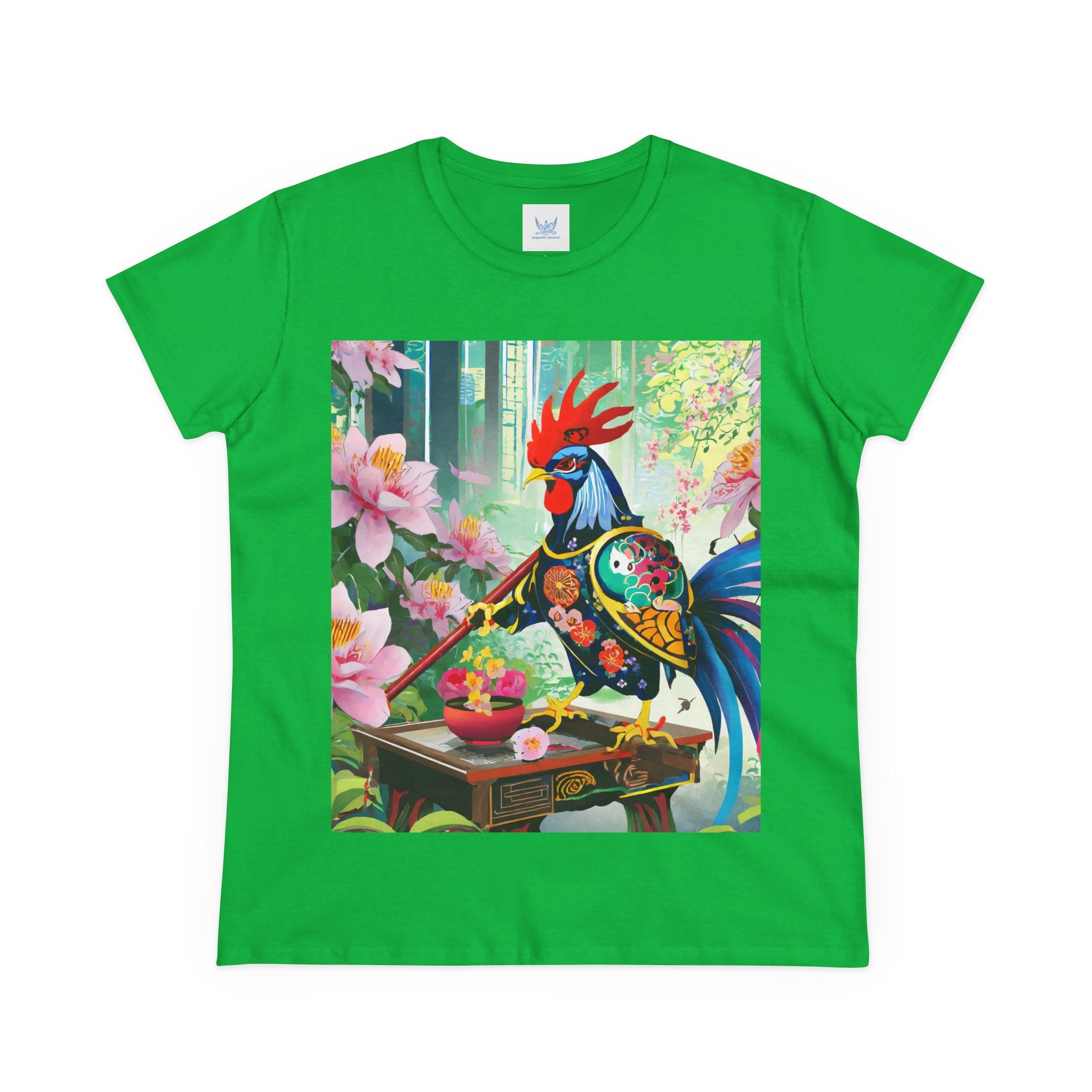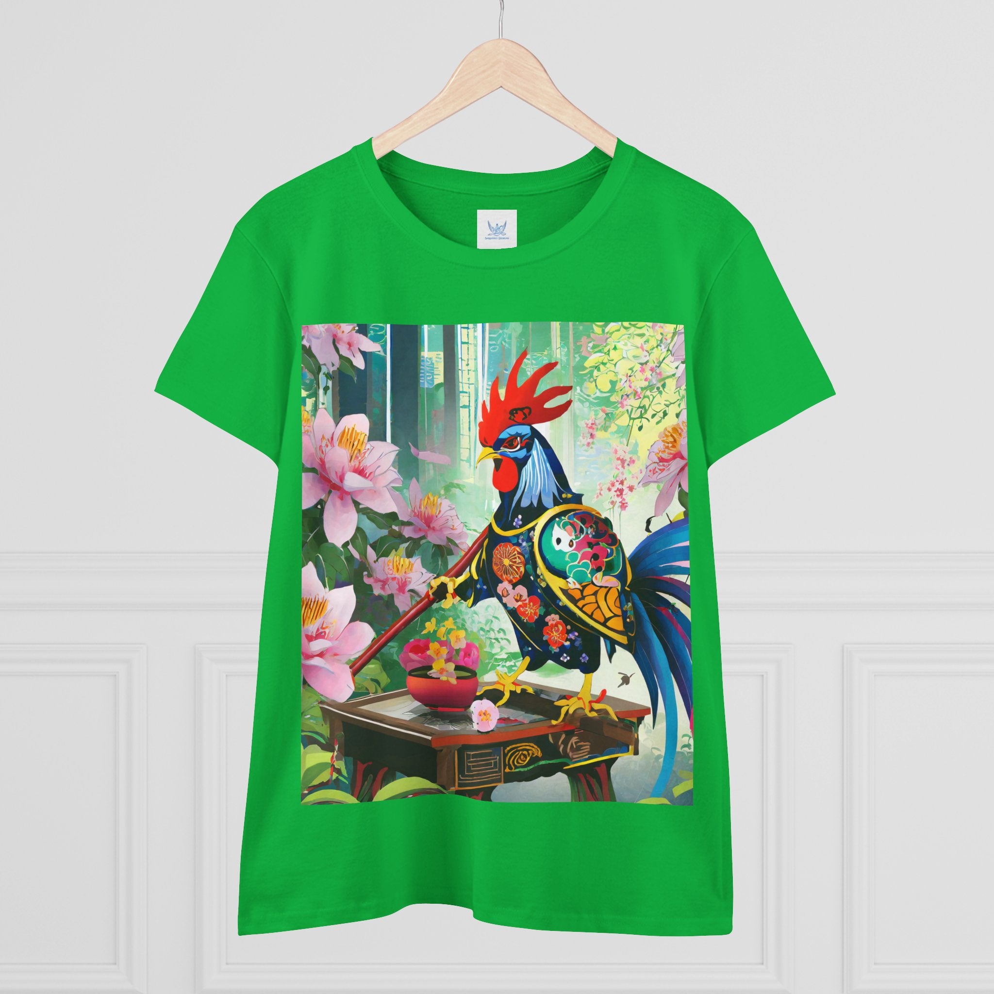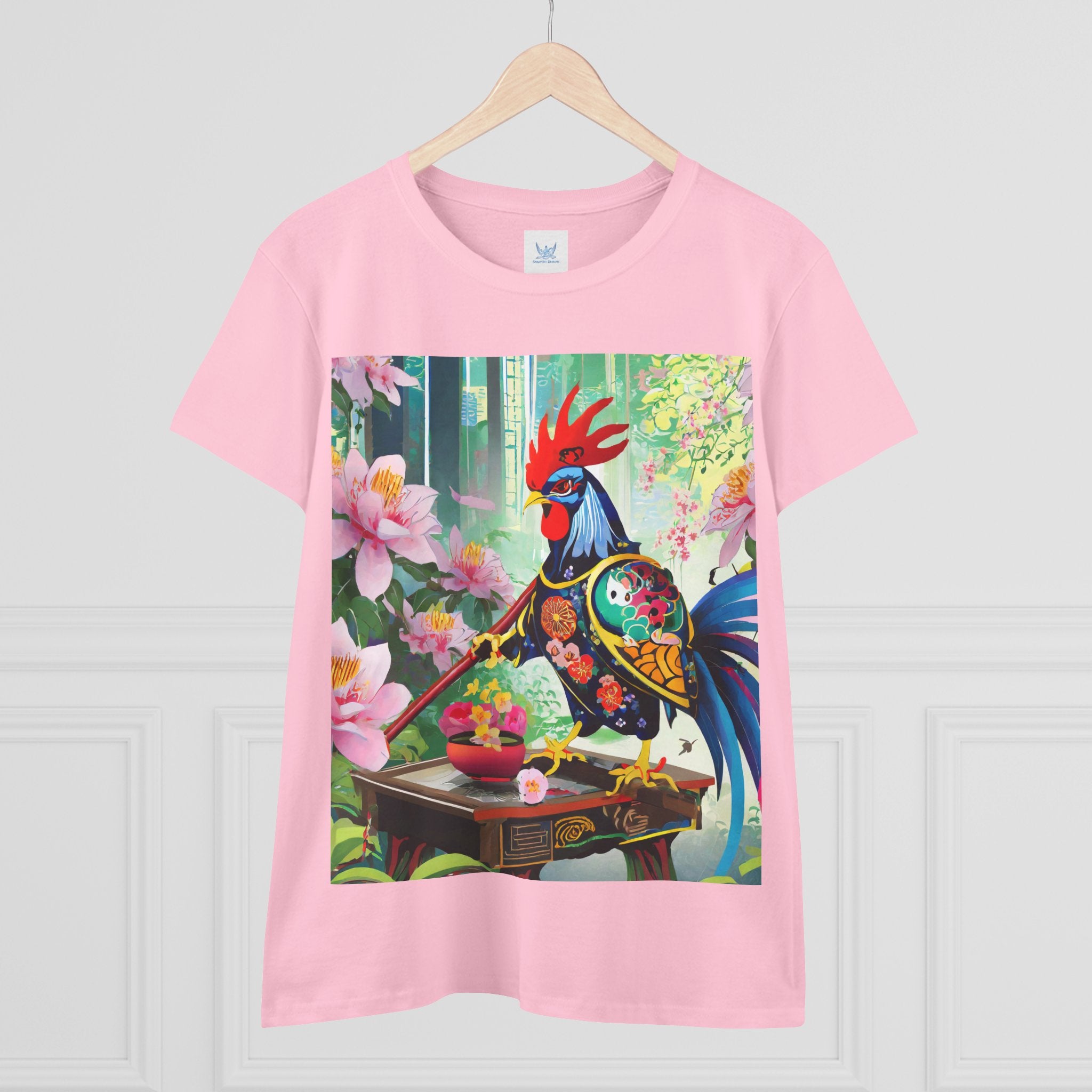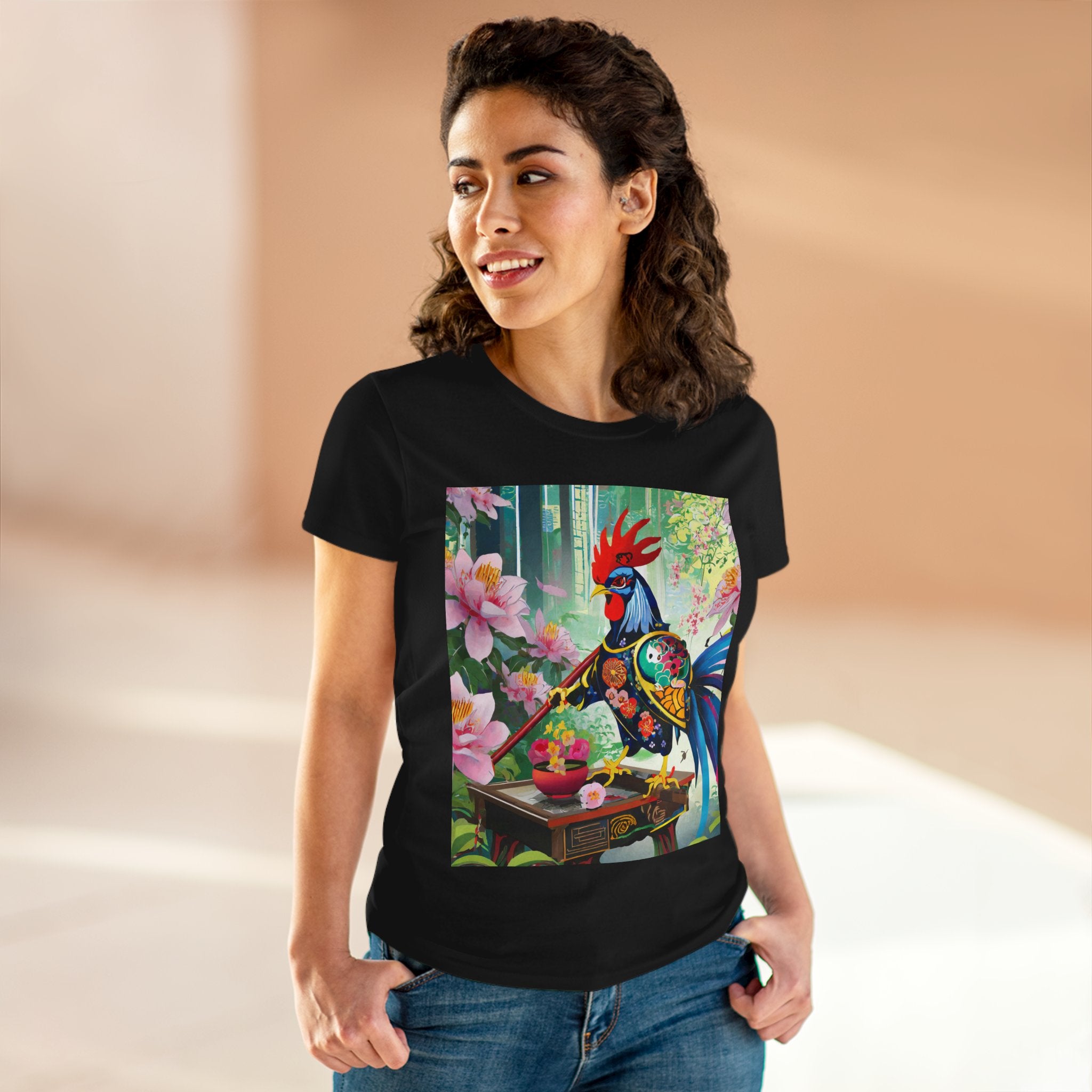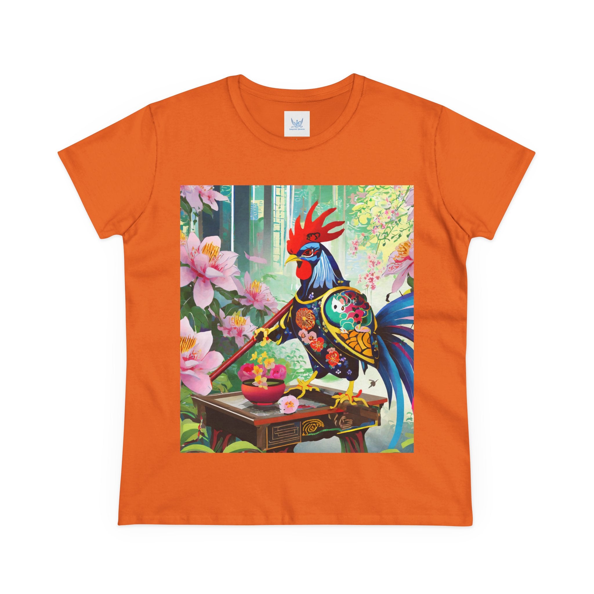 Across the front, a samurai-rooster infused with cybernetic enhancements practices the art of Japanese flower arranging amid a neon-soaked cyberpunk garden. Fusing ancient tradition with futuristic technology, the design blends discipline, culture, and striking innovation—turning this tee into wearable storytelling.