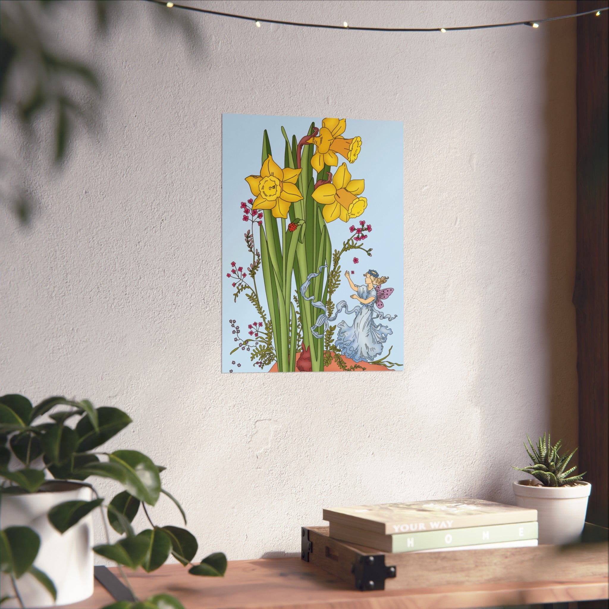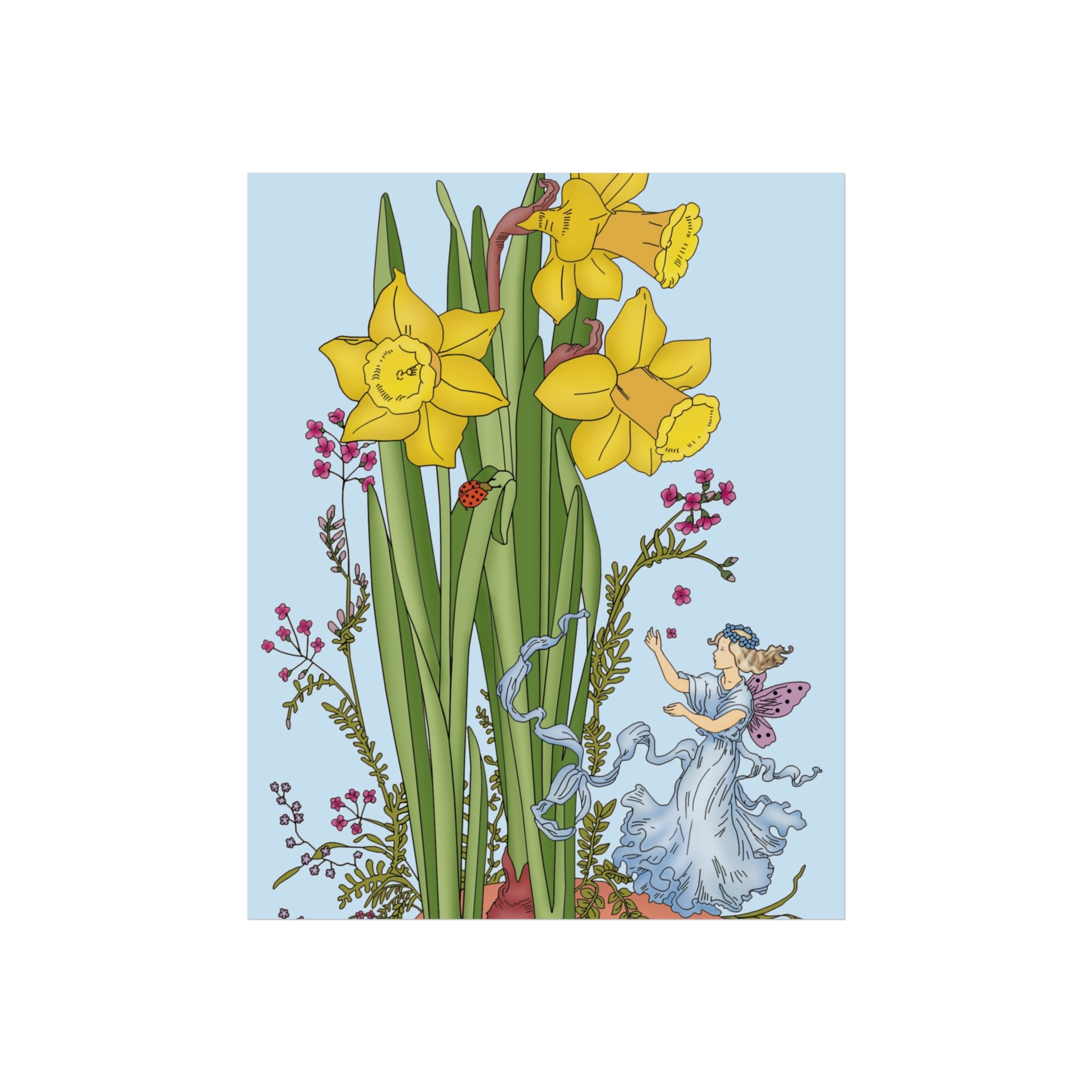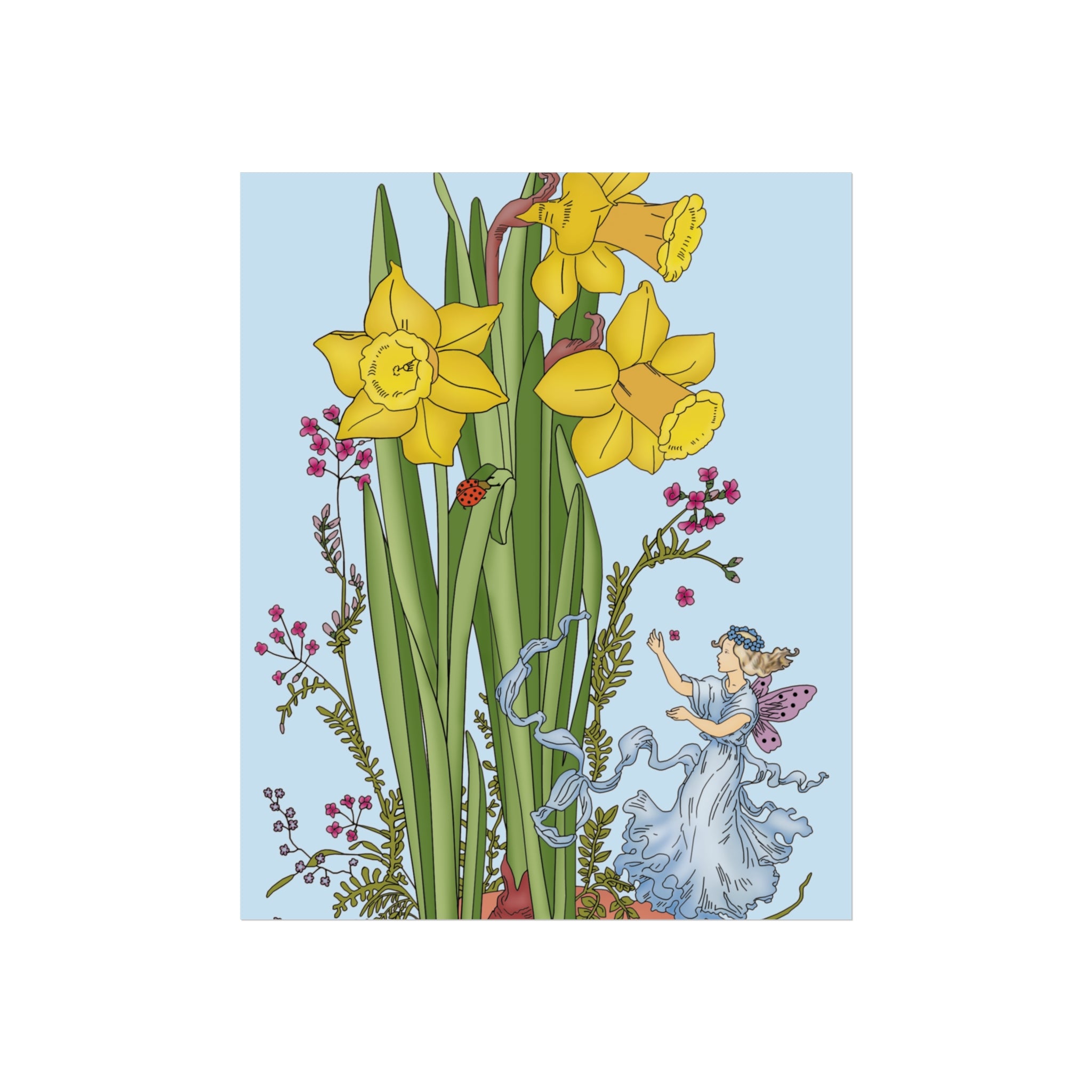 Bring a touch of springtime enchantment to your walls with this Daffodil Fairy fine art print. The vintage illustration features a graceful fairy dressed in soft blue, her delicate lavender wings shimmering as she stands among tall daffodils. The scene captures the gentle magic of nature in bloom, rendered in timeless colors and a nostalgic, dreamlike style.