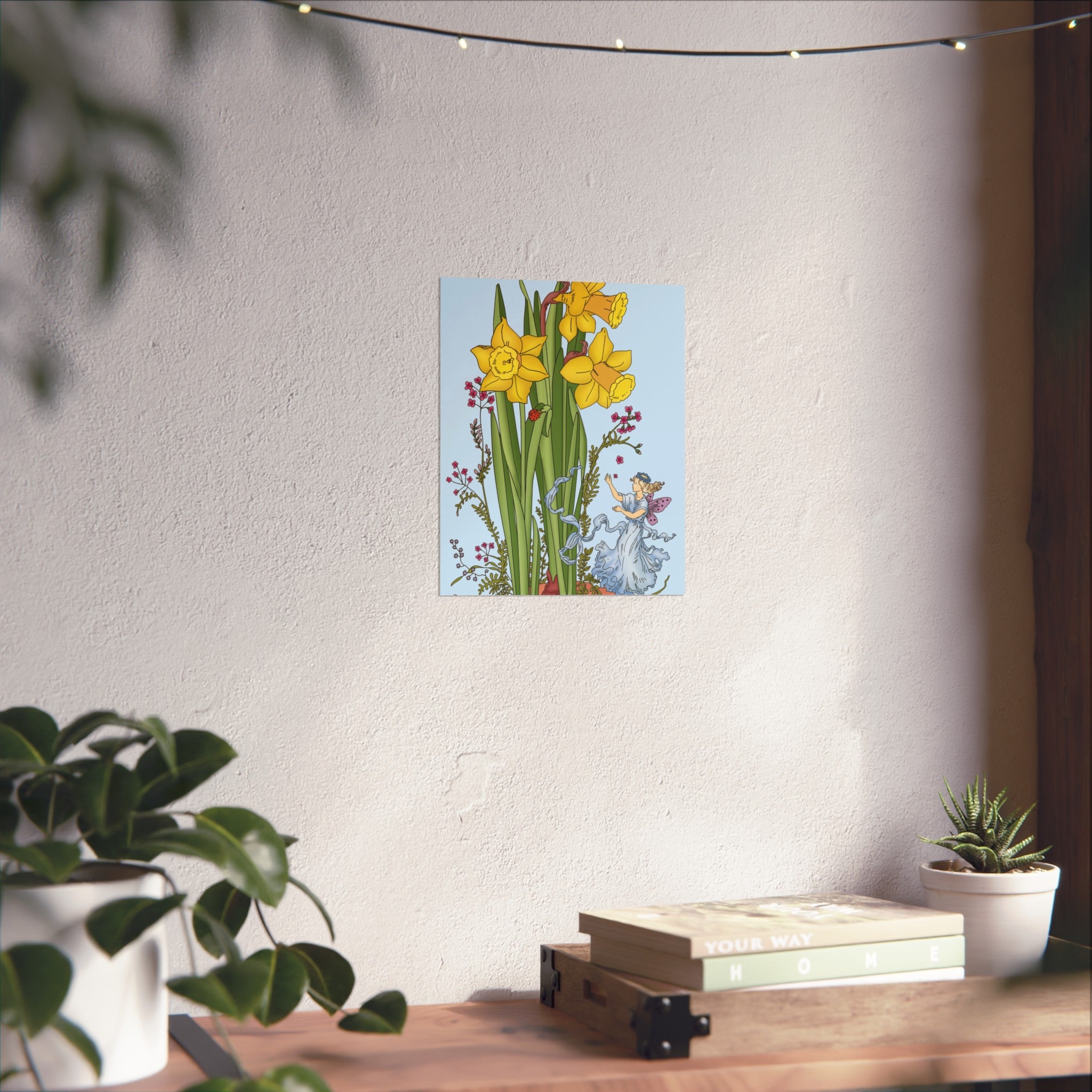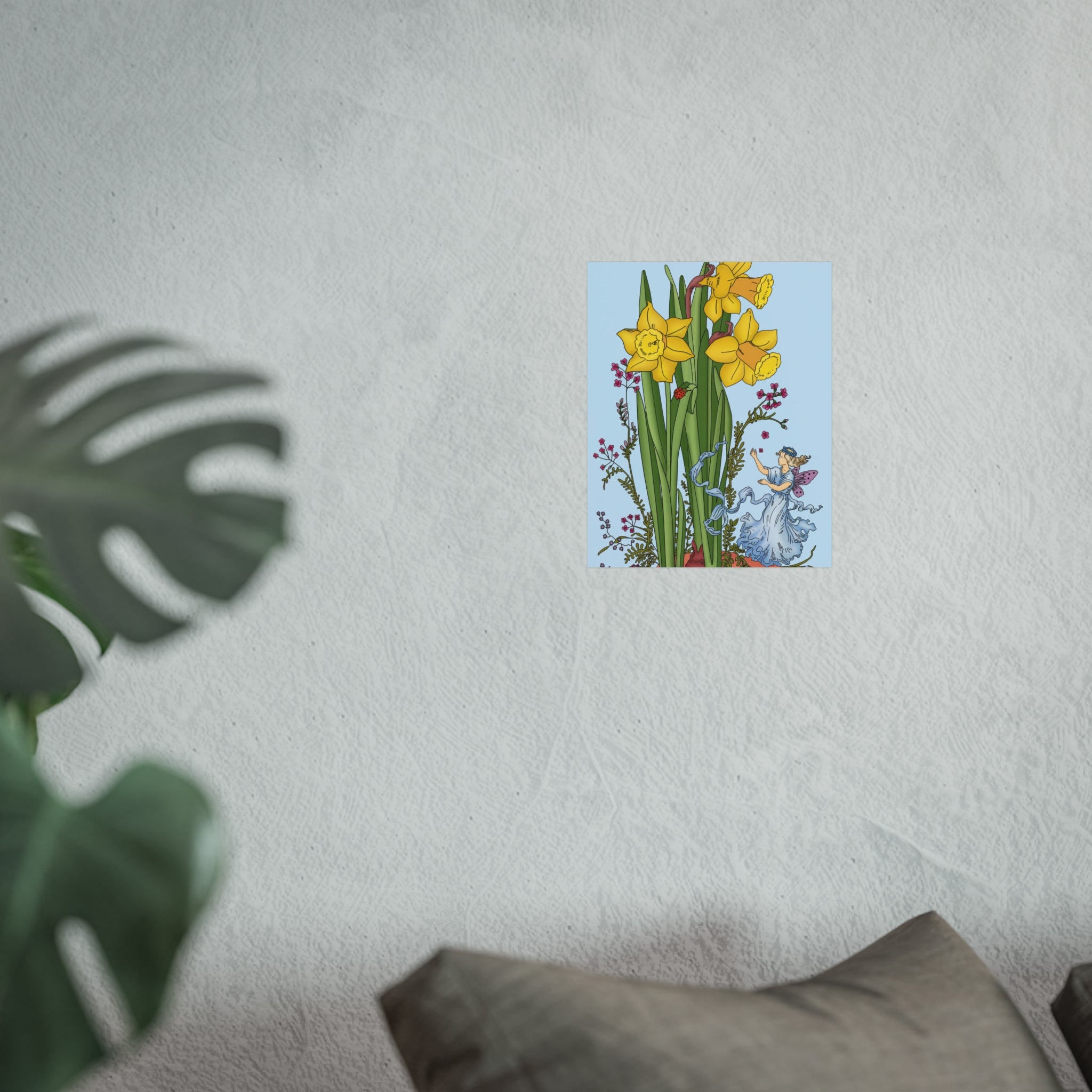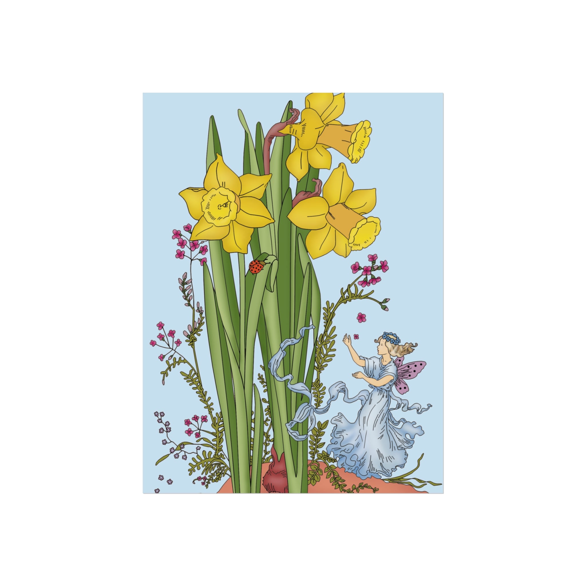 Bring a touch of springtime enchantment to your walls with this Daffodil Fairy fine art print. The vintage illustration features a graceful fairy dressed in soft blue, her delicate lavender wings shimmering as she stands among tall daffodils. The scene captures the gentle magic of nature in bloom, rendered in timeless colors and a nostalgic, dreamlike style.