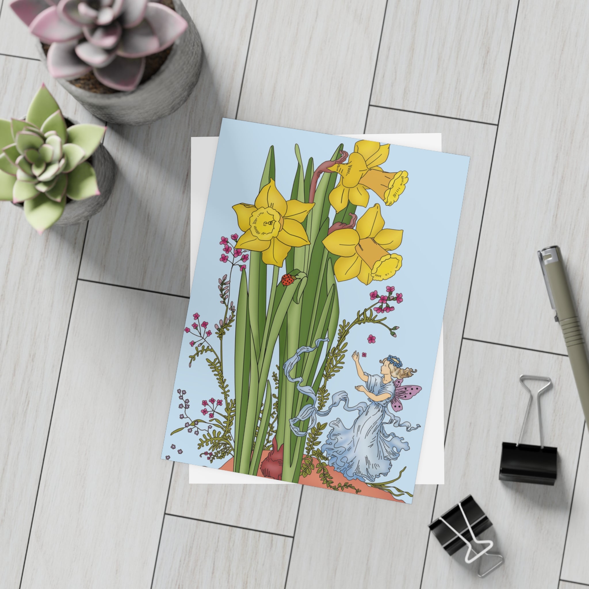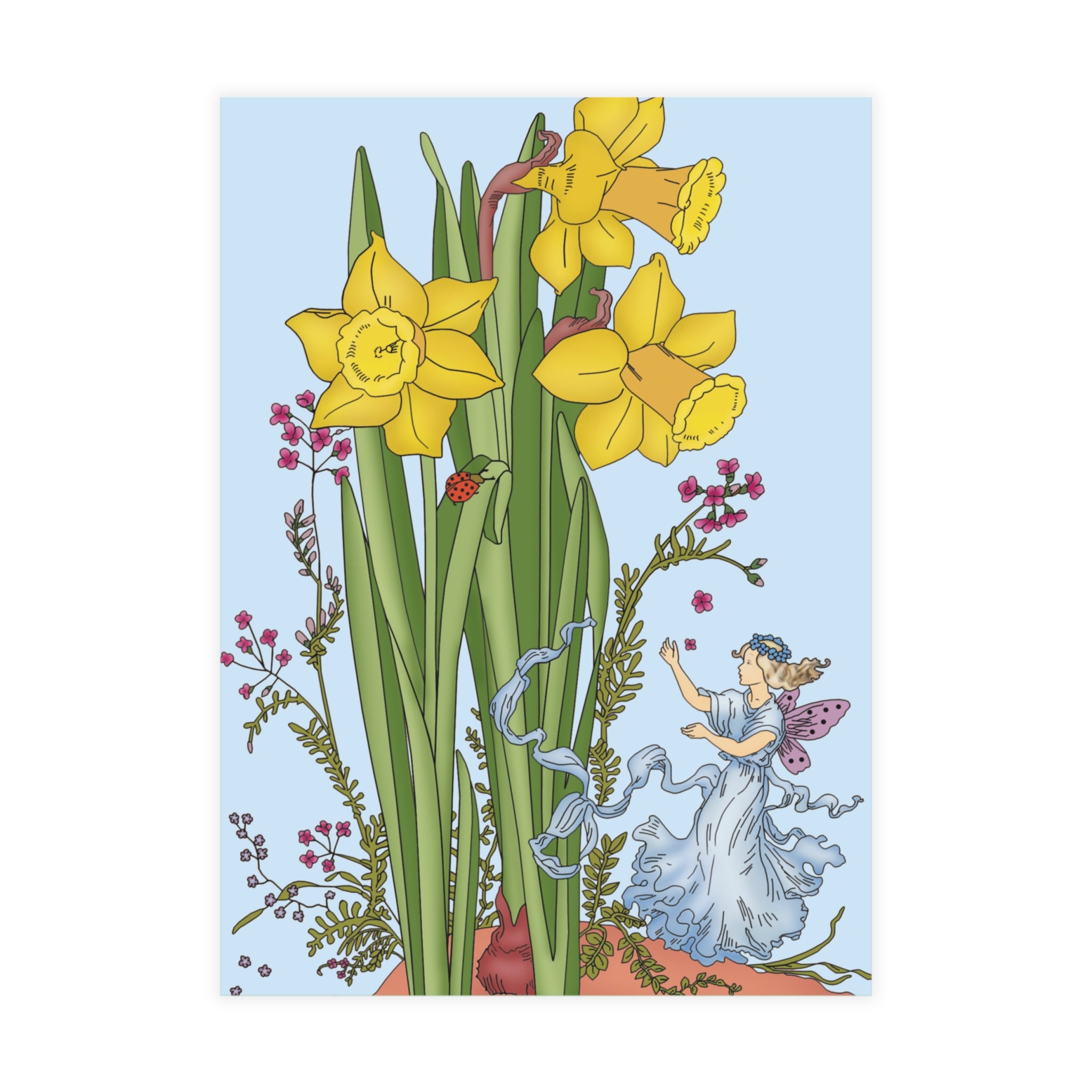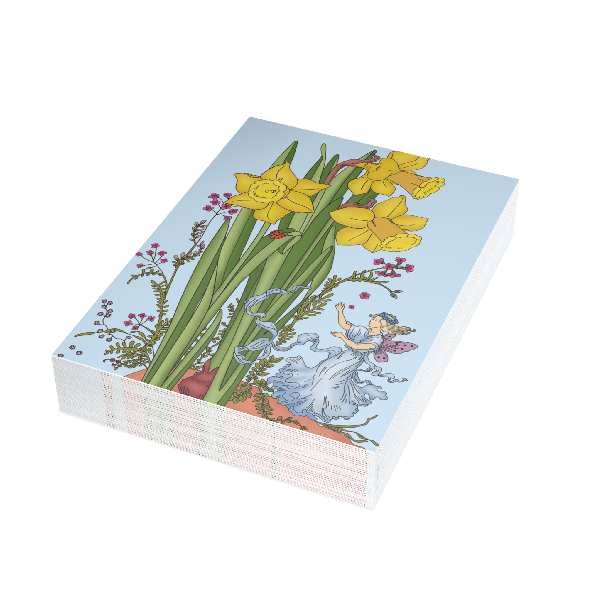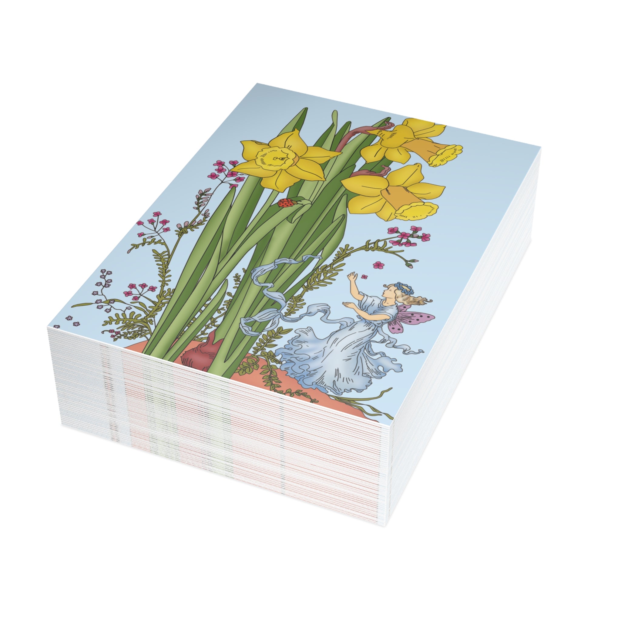 Send a touch of springtime magic with these enchanting postcards featuring the Daffodil Fairy. This vintage illustration depicts a graceful fairy in soft blue, her lavender wings shimmering as she stands quietly among blooming daffodils. The gentle palette and timeless style evoke the beauty and wonder of nature in full bloom—making each card a nostalgic delight.