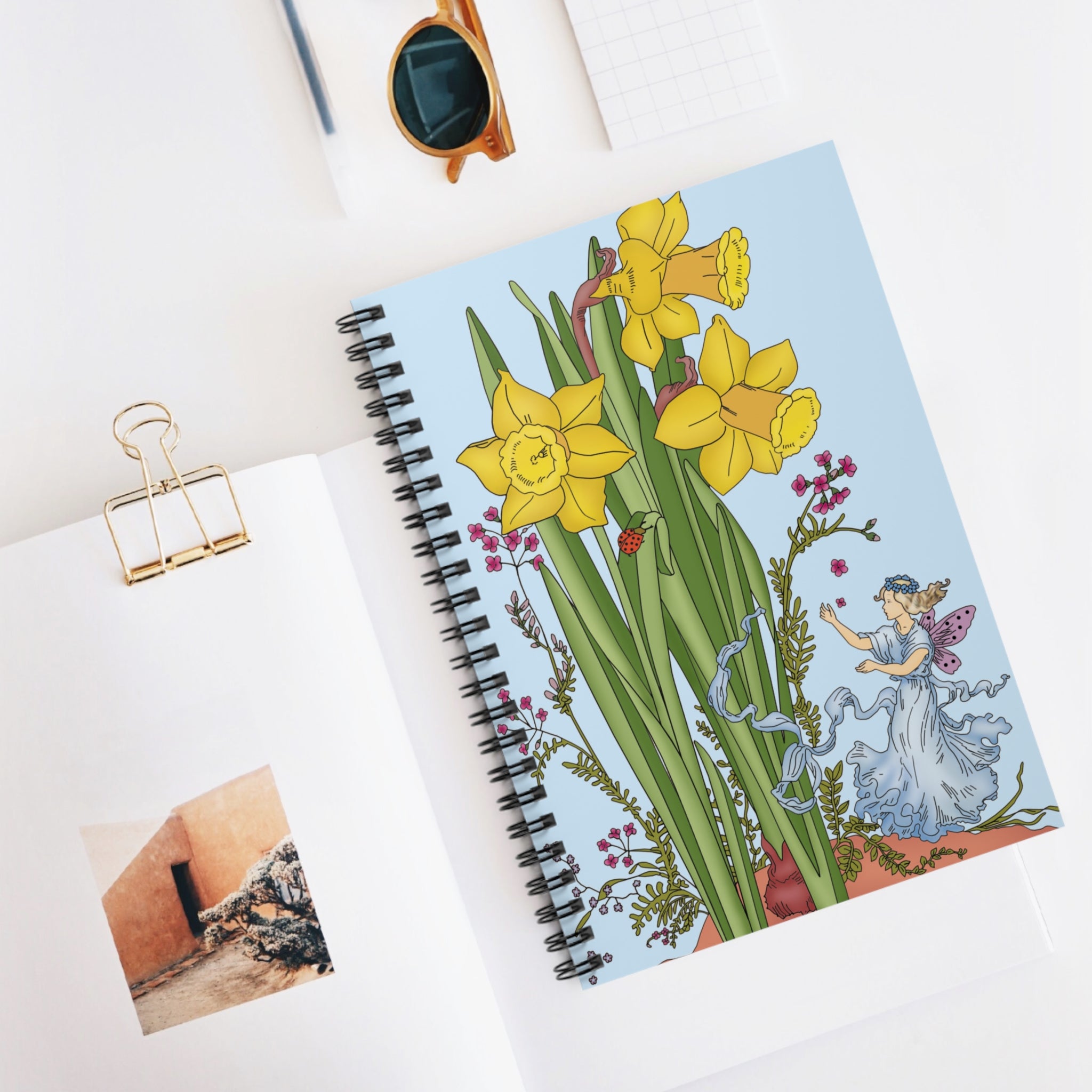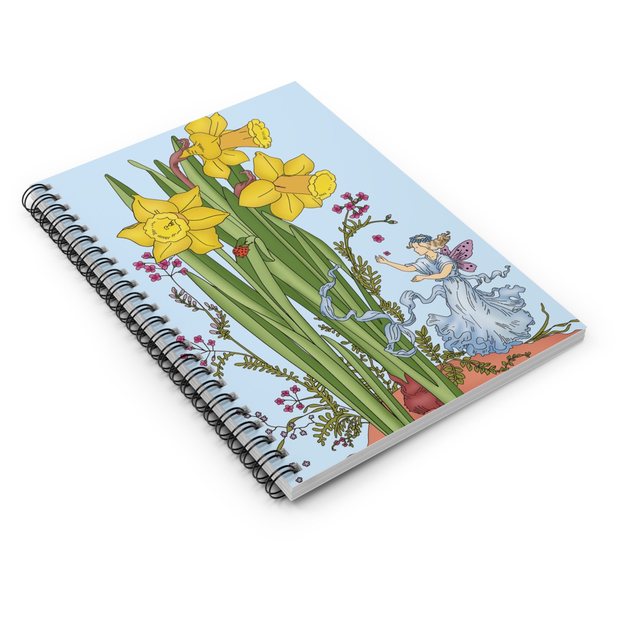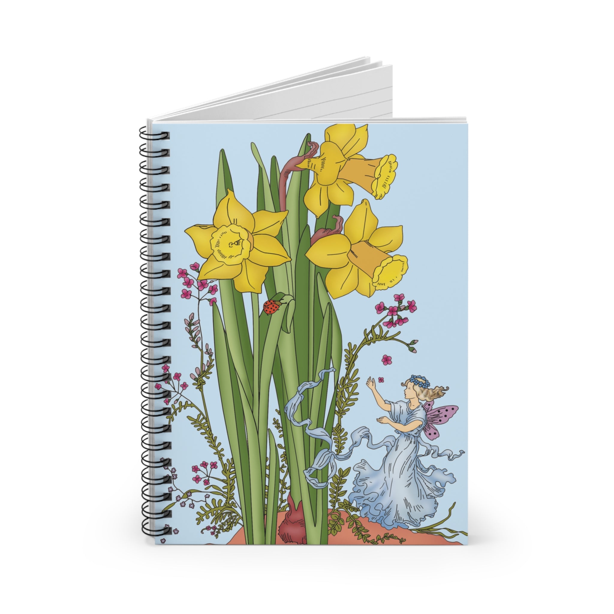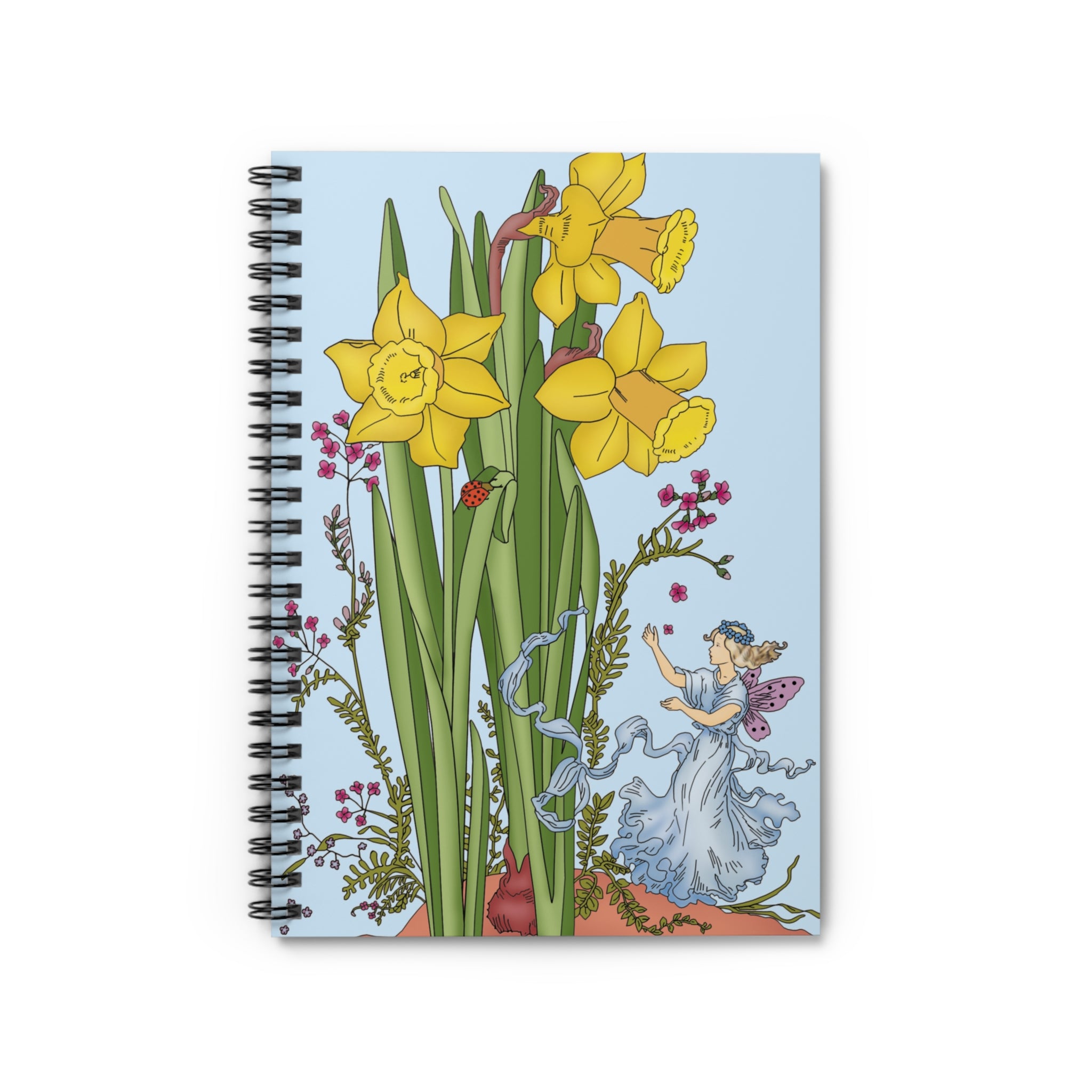 Shopping lists, school notes, or poems—this 118-page spiral notebook with ruled line paper is the perfect companion for everyday inspiration. The cover features the Daffodil Fairy, a vintage illustration of a graceful fairy in soft blue with lavender wings, quietly standing among tall daffodils. The gentle colors and nostalgic charm capture the delicate beauty of springtime and invite a sense of calm and creativity.