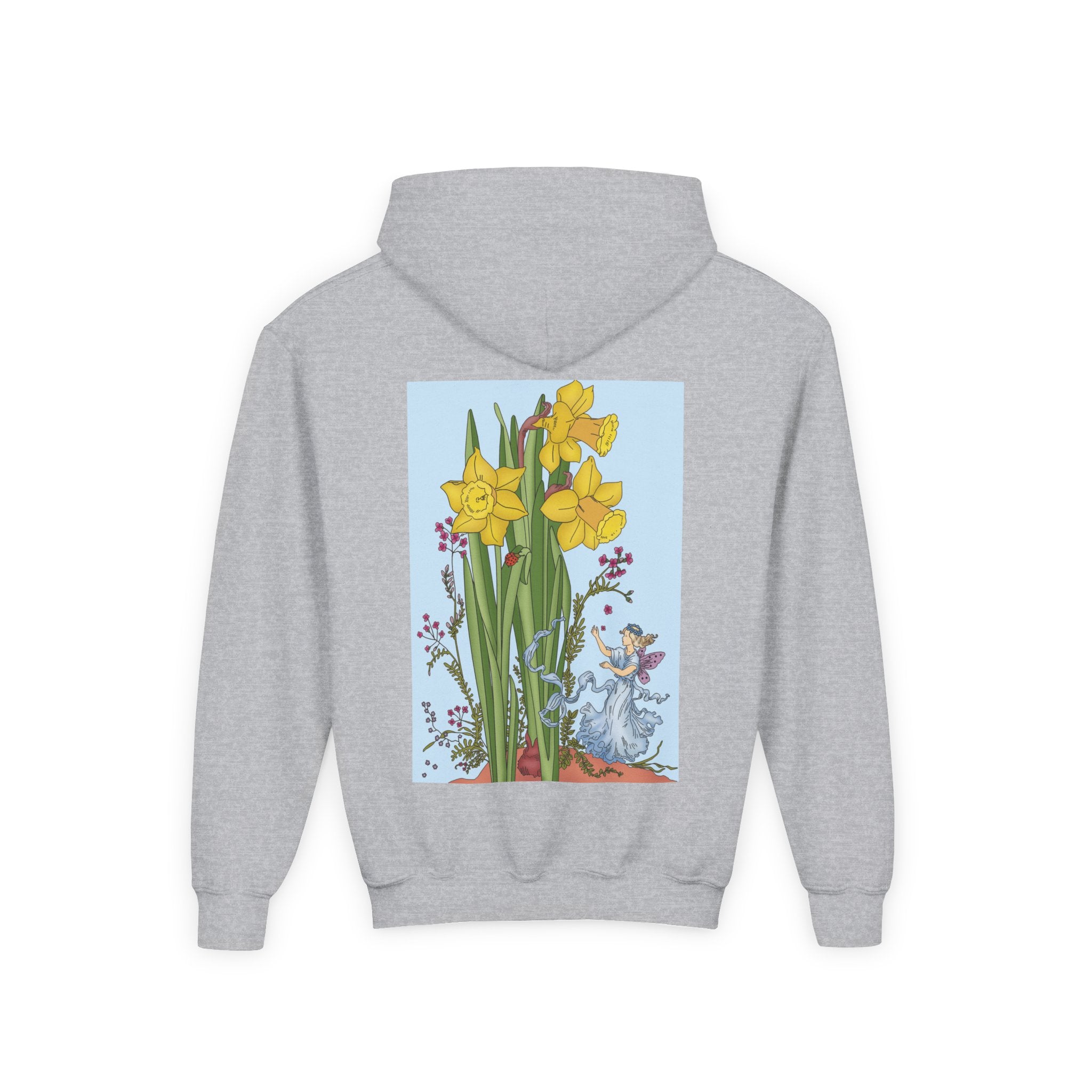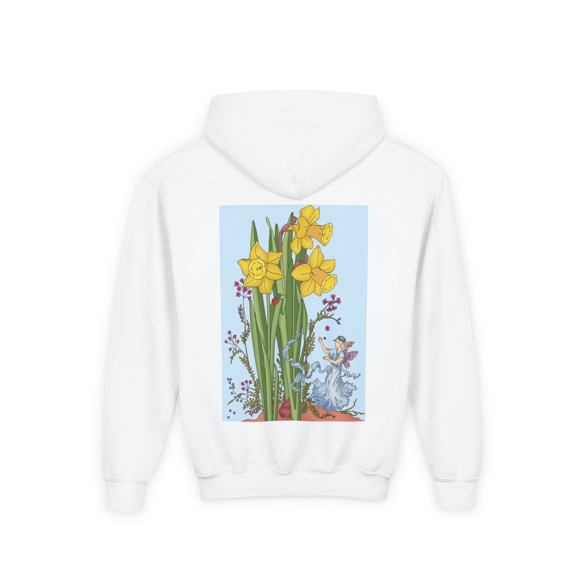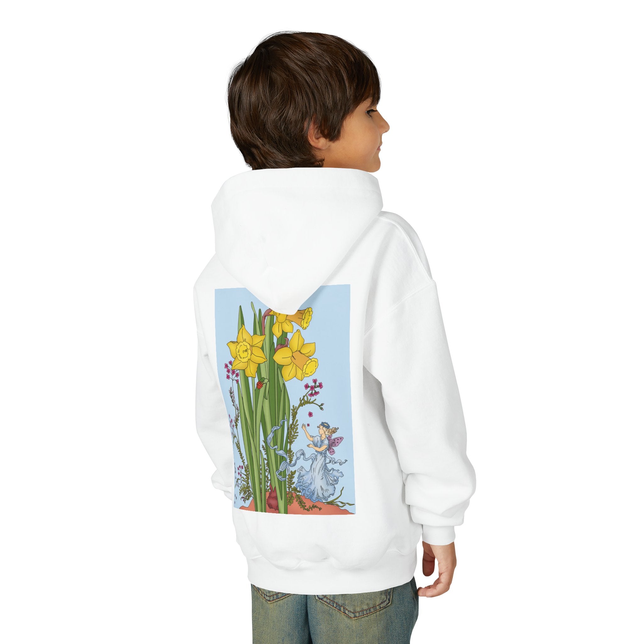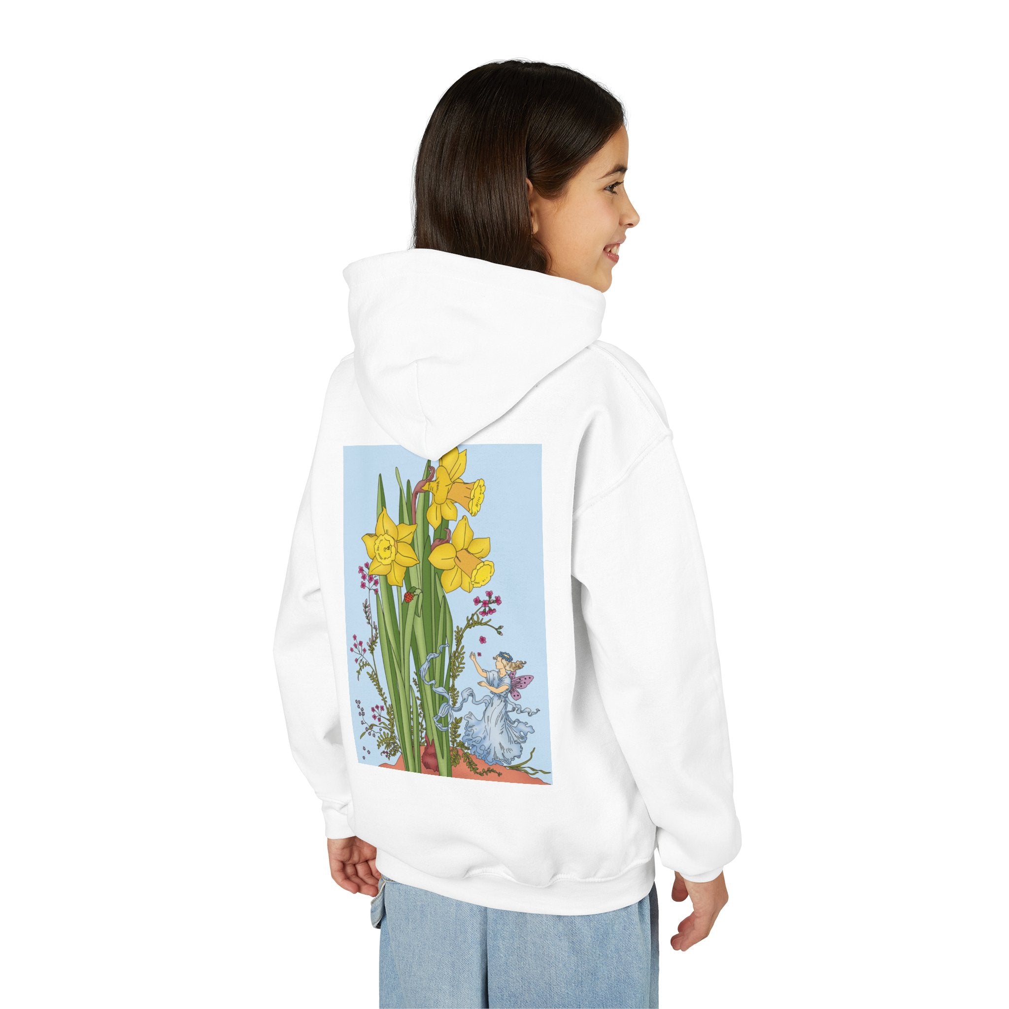 Daffodil Fairy Youth Heavy Blend Hooded Sweatshirt brings together cozy comfort and timeless charm. Crafted from an ultra-soft, preshrunk 50/50 cotton-polyester fleece, this sweatshirt feels wonderfully gentle on the skin and resists lint buildup for lasting quality. The medium-weight fabric offers just the right amount of warmth for everyday wear, while the roomy kangaroo pocket keeps hands toasty. A twill-reinforced neck ensures extra durability. Please note: due to the fabric properties, the White color variant may appear slightly off-white.