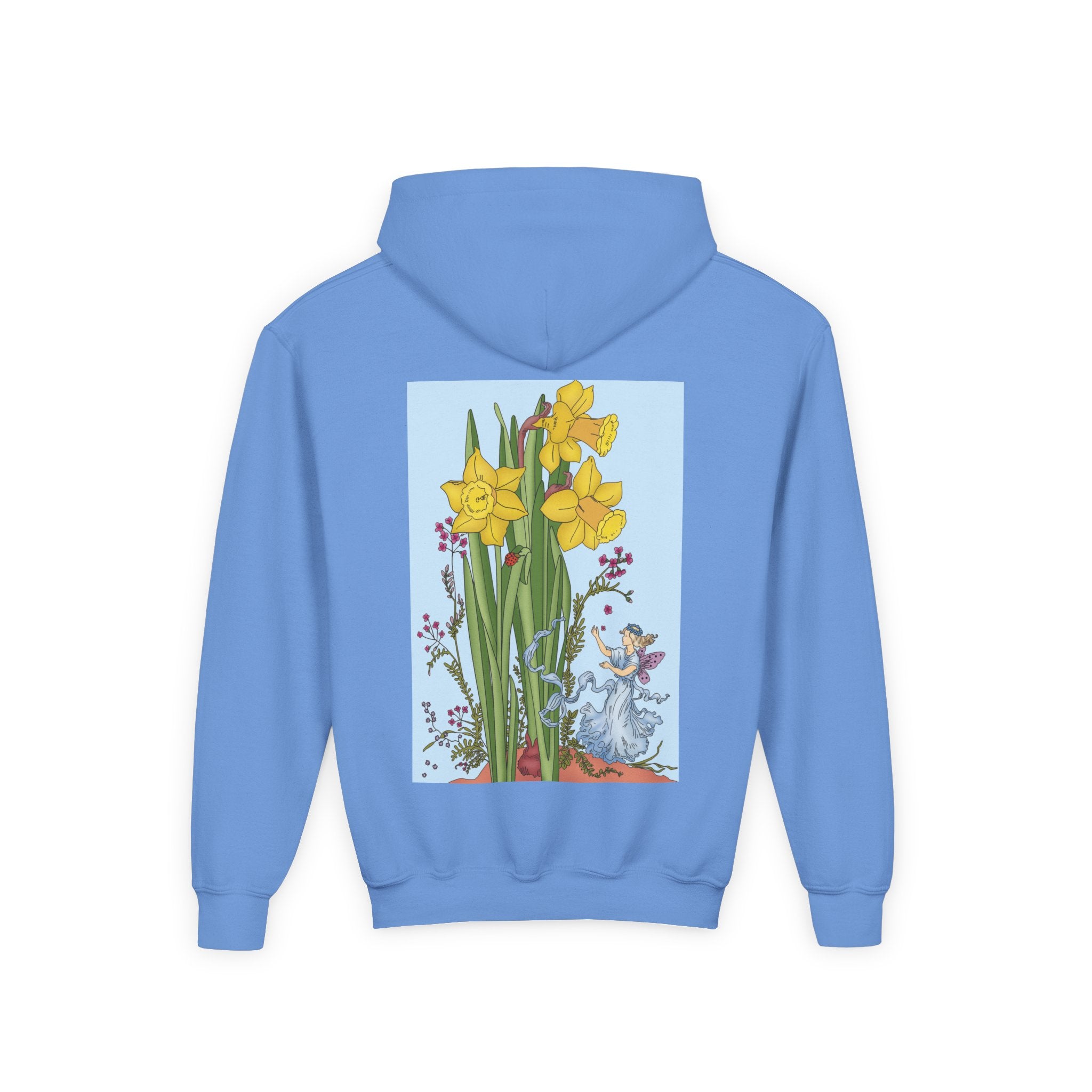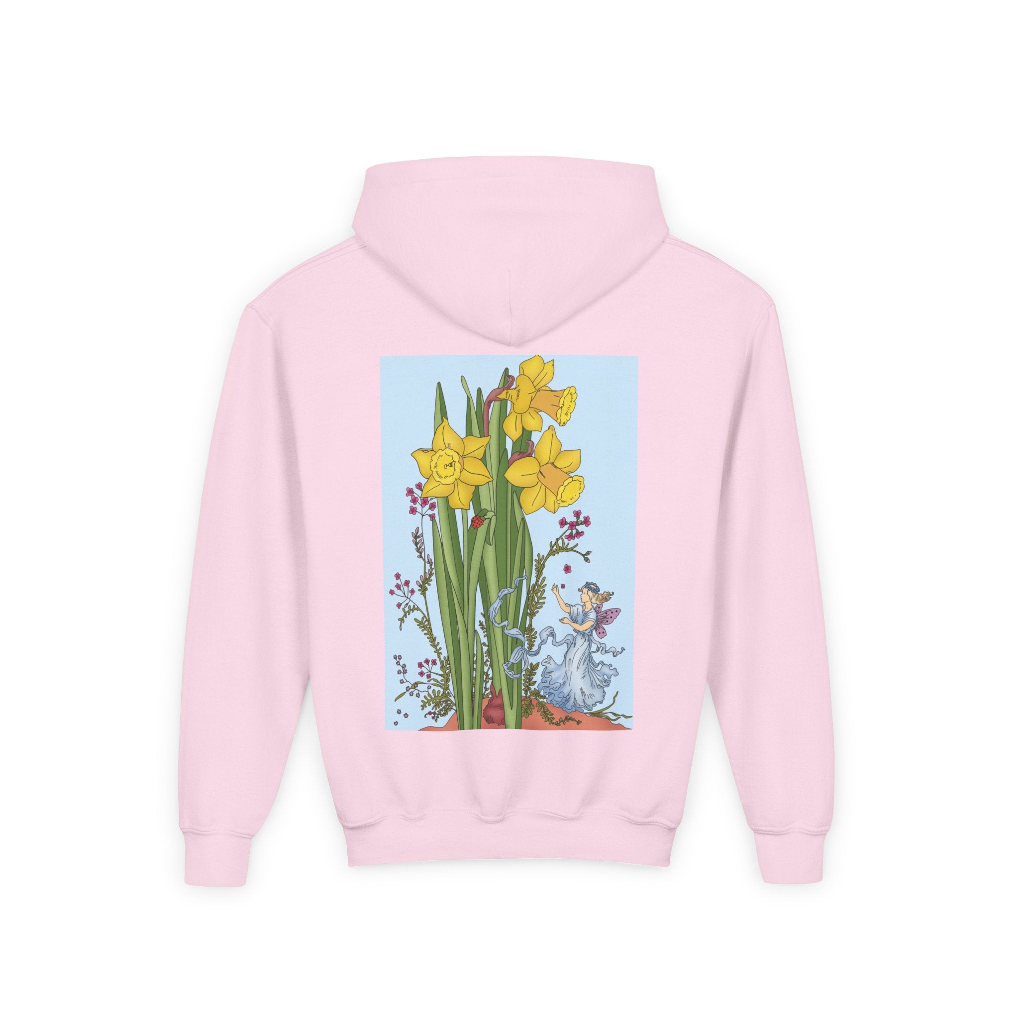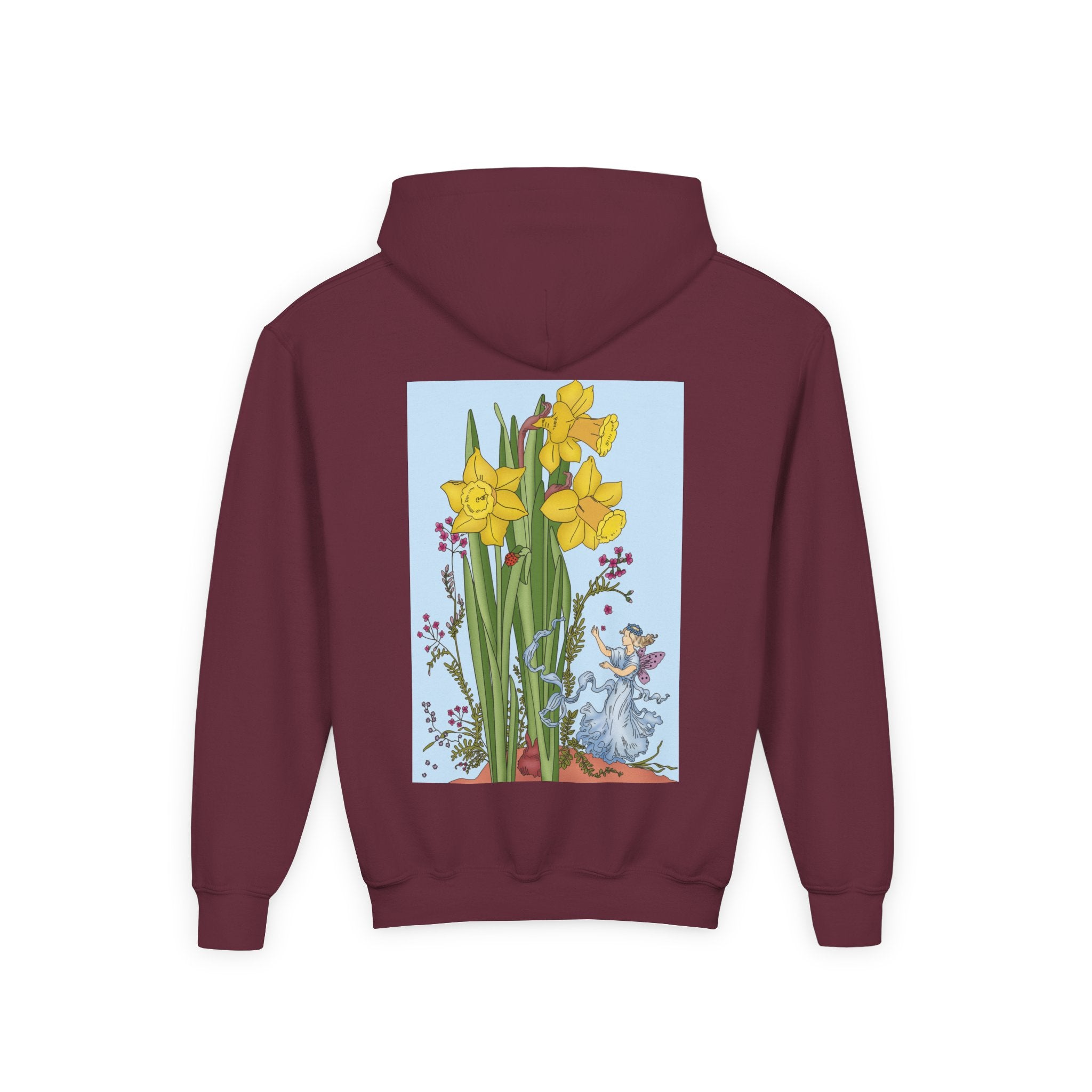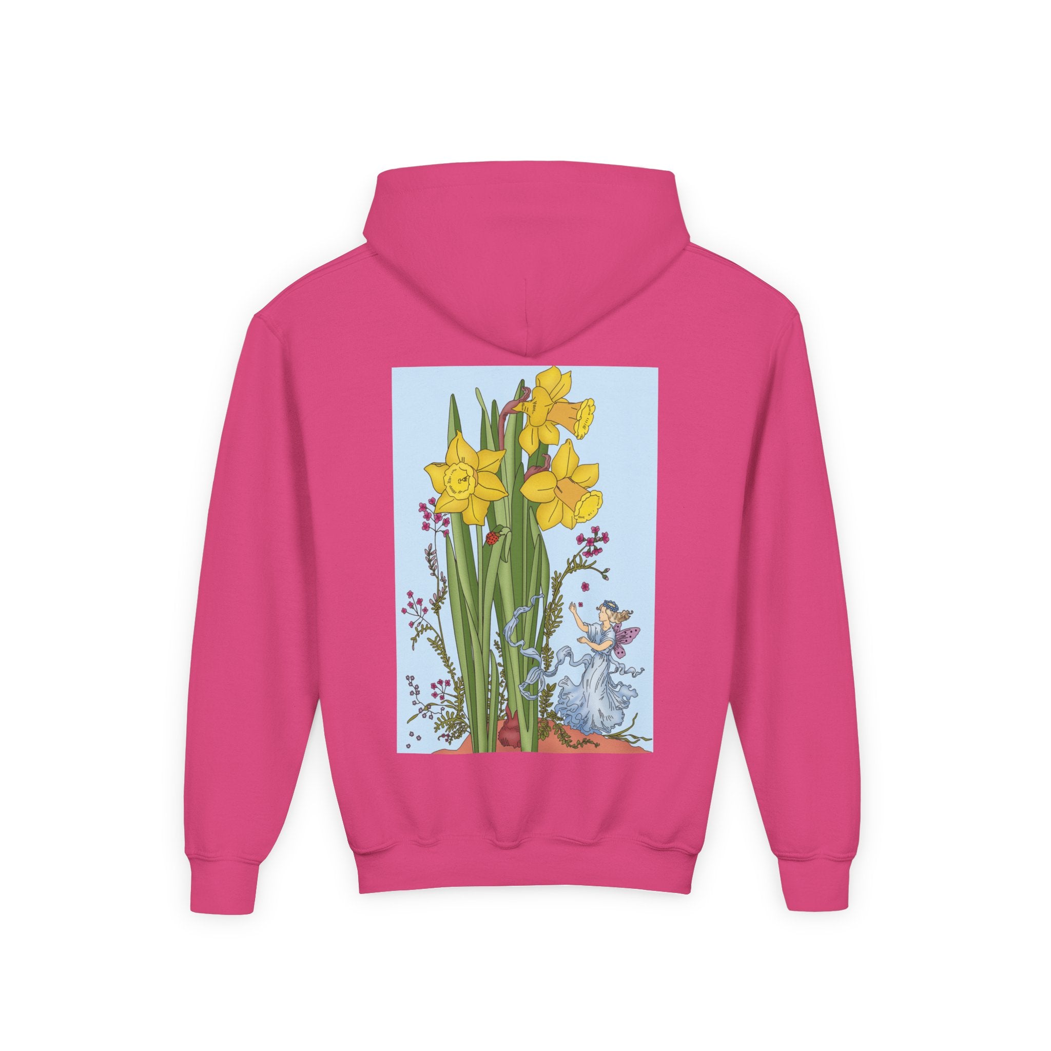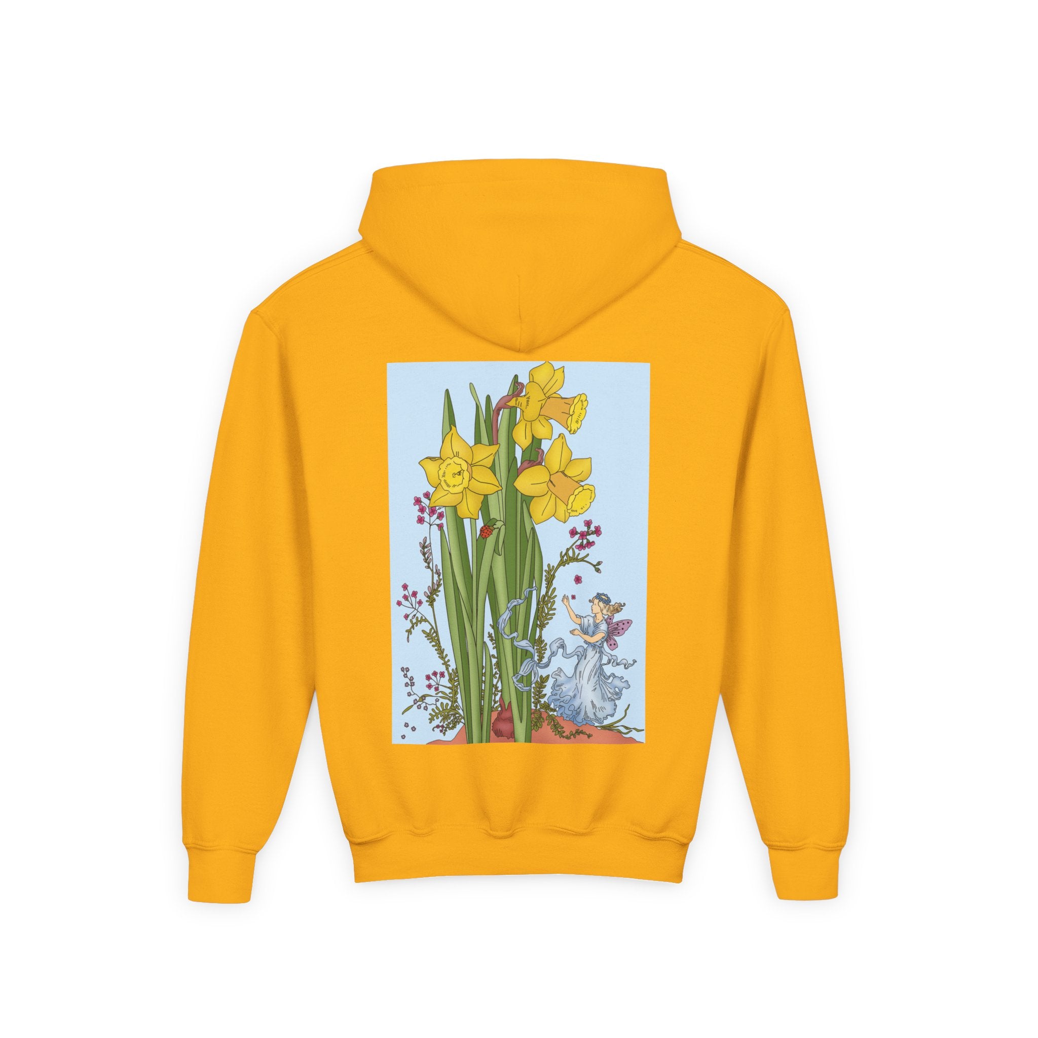 Daffodil Fairy Youth Heavy Blend Hooded Sweatshirt brings together cozy comfort and timeless charm. Crafted from an ultra-soft, preshrunk 50/50 cotton-polyester fleece, this sweatshirt feels wonderfully gentle on the skin and resists lint buildup for lasting quality. The medium-weight fabric offers just the right amount of warmth for everyday wear, while the roomy kangaroo pocket keeps hands toasty. A twill-reinforced neck ensures extra durability. Please note: due to the fabric properties, the White color variant may appear slightly off-white.