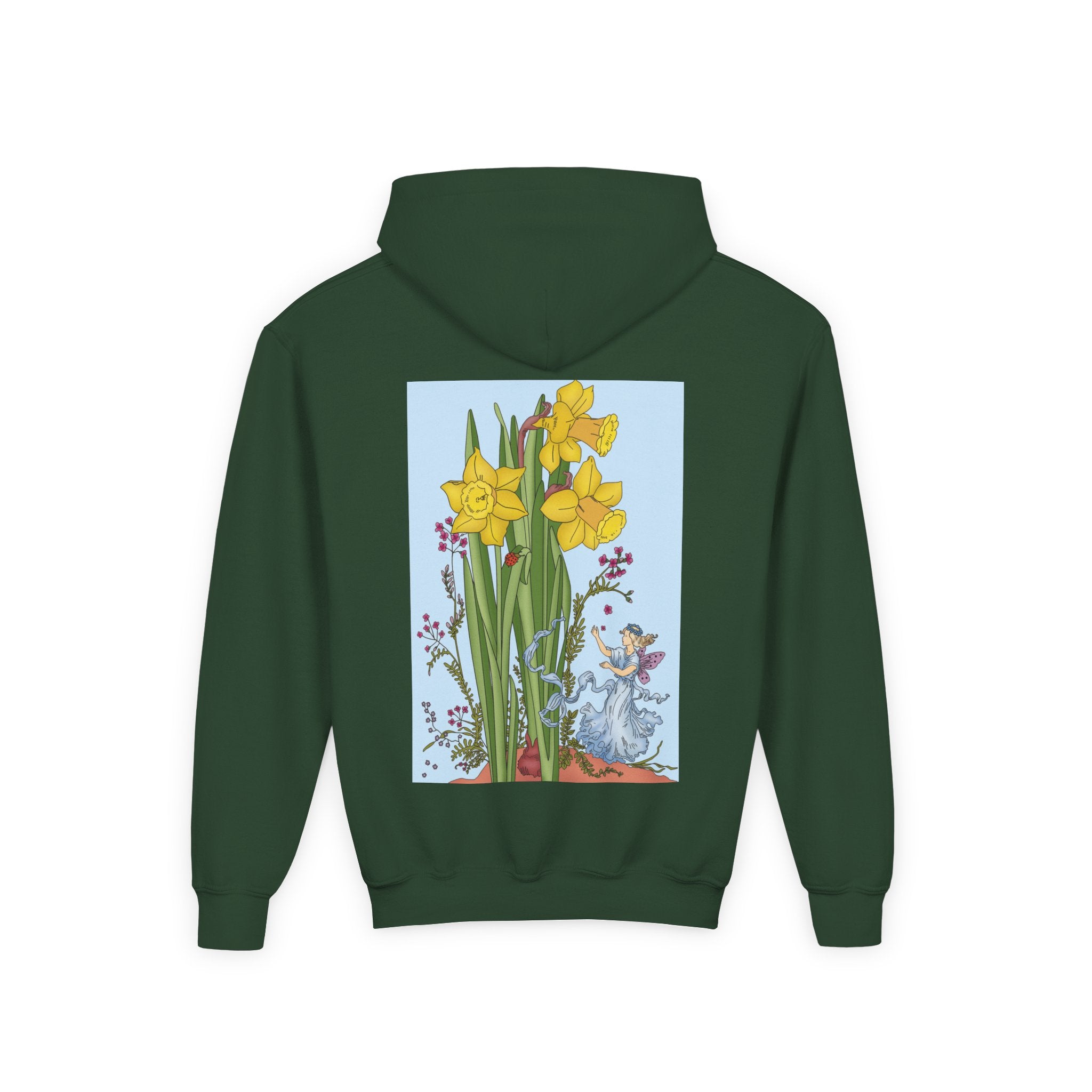Featured on the back is the Daffodil Fairy—a vintage illustration of a graceful fairy dressed in soft blue with shimmering lavender wings. Surrounded by tall daffodils, she embodies the gentle magic and renewal of springtime. The timeless colors and delicate details create a serene and imaginative scene, making this sweatshirt a perfect choice for young dreamers who love fairytales and nature’s beauty.