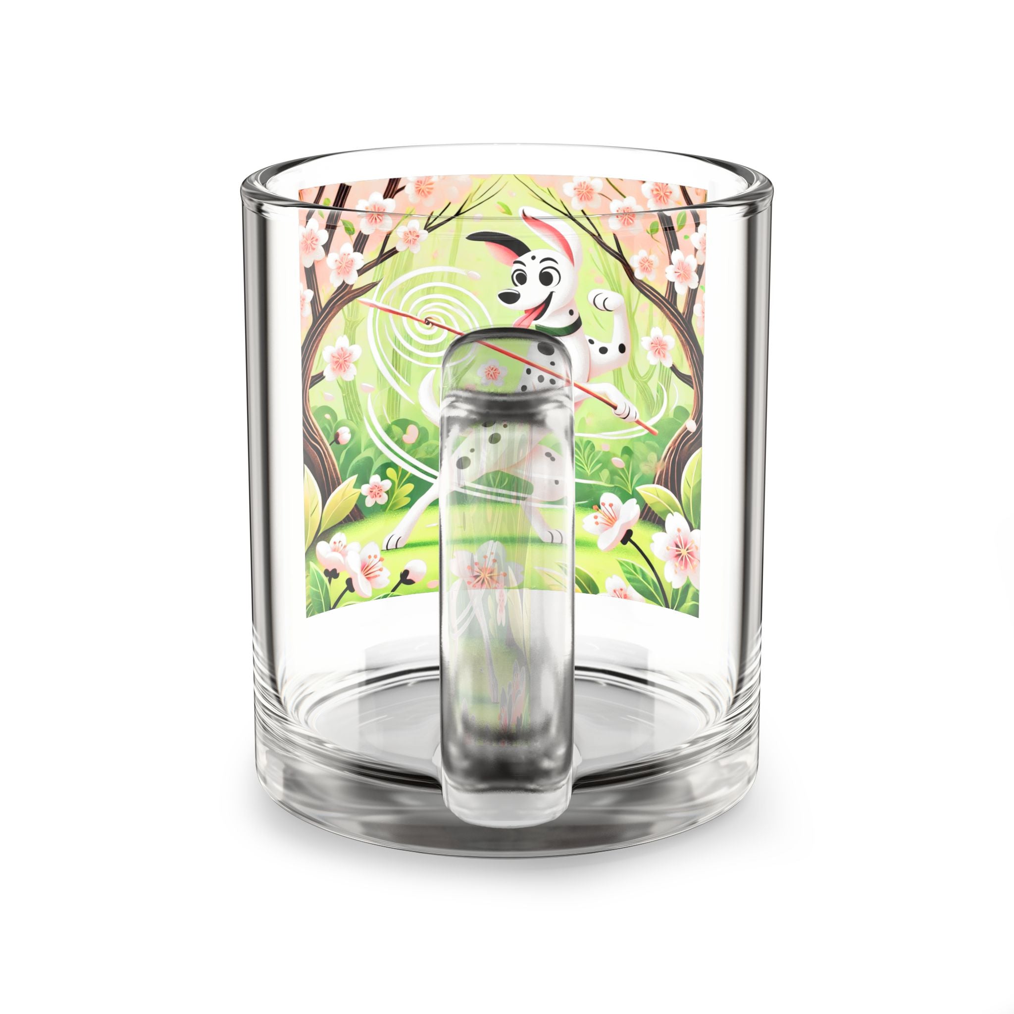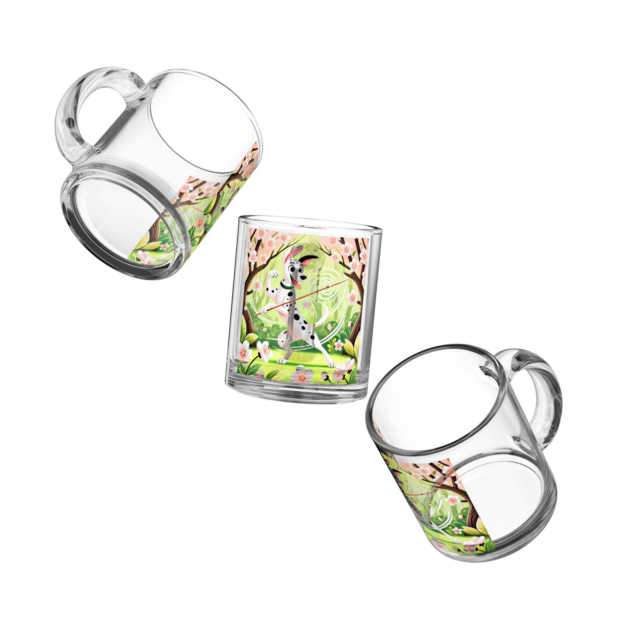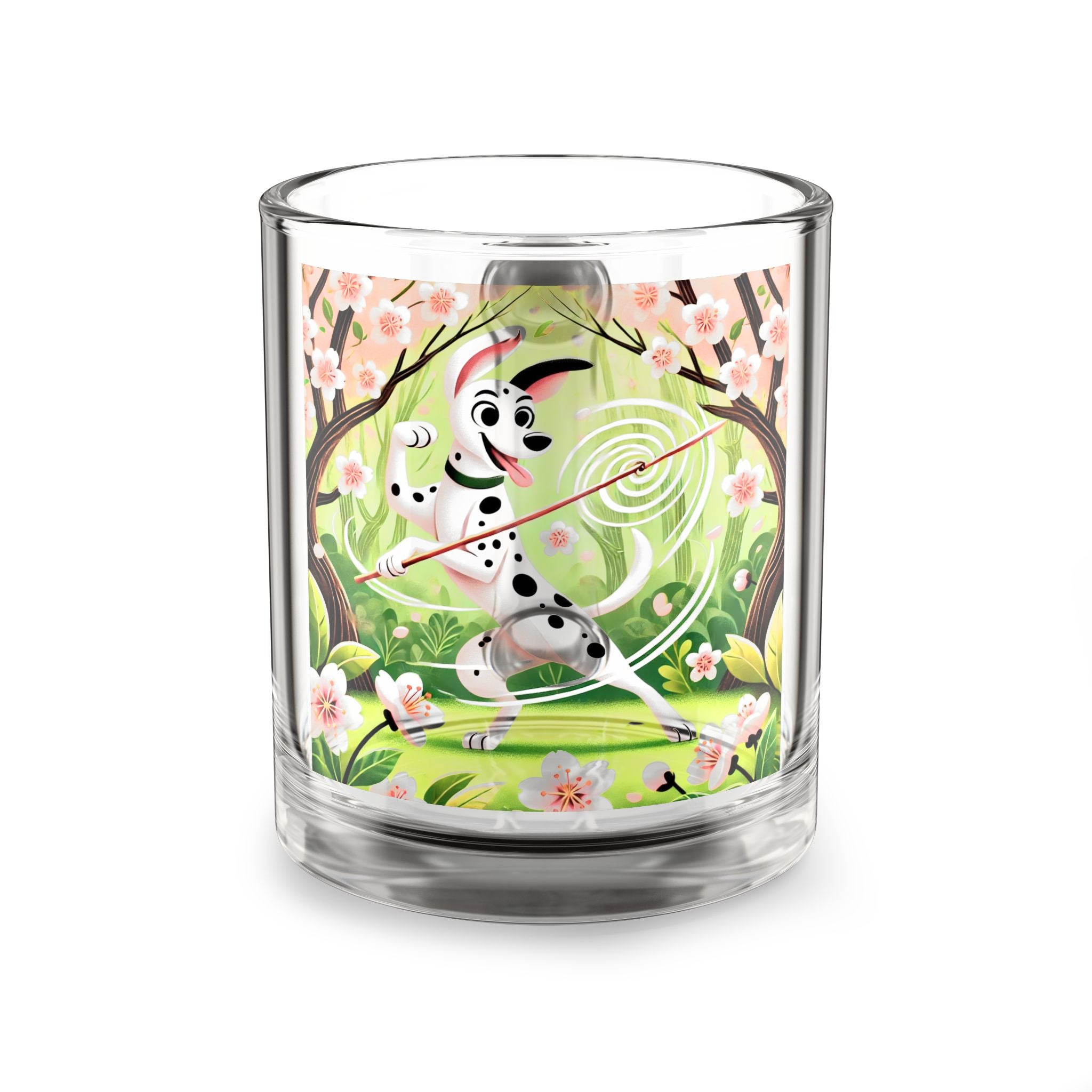A whimsical artwork featuring a lively Dalmatian gracefully spinning a sleek spear amidst a breathtaking cherry tree forest in full bloom. The artwork radiates a sense of motion, joy, and the spirited charm of this agile, spotted warrior dancing with nature.