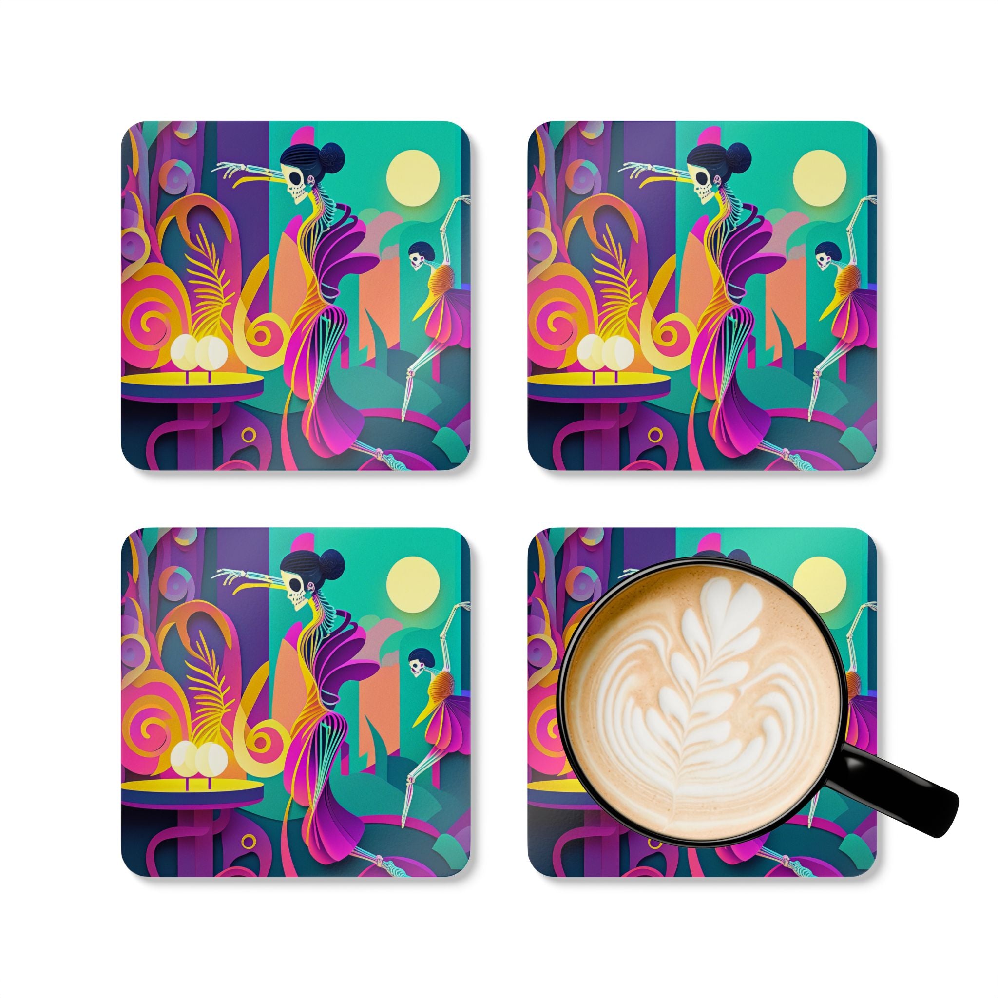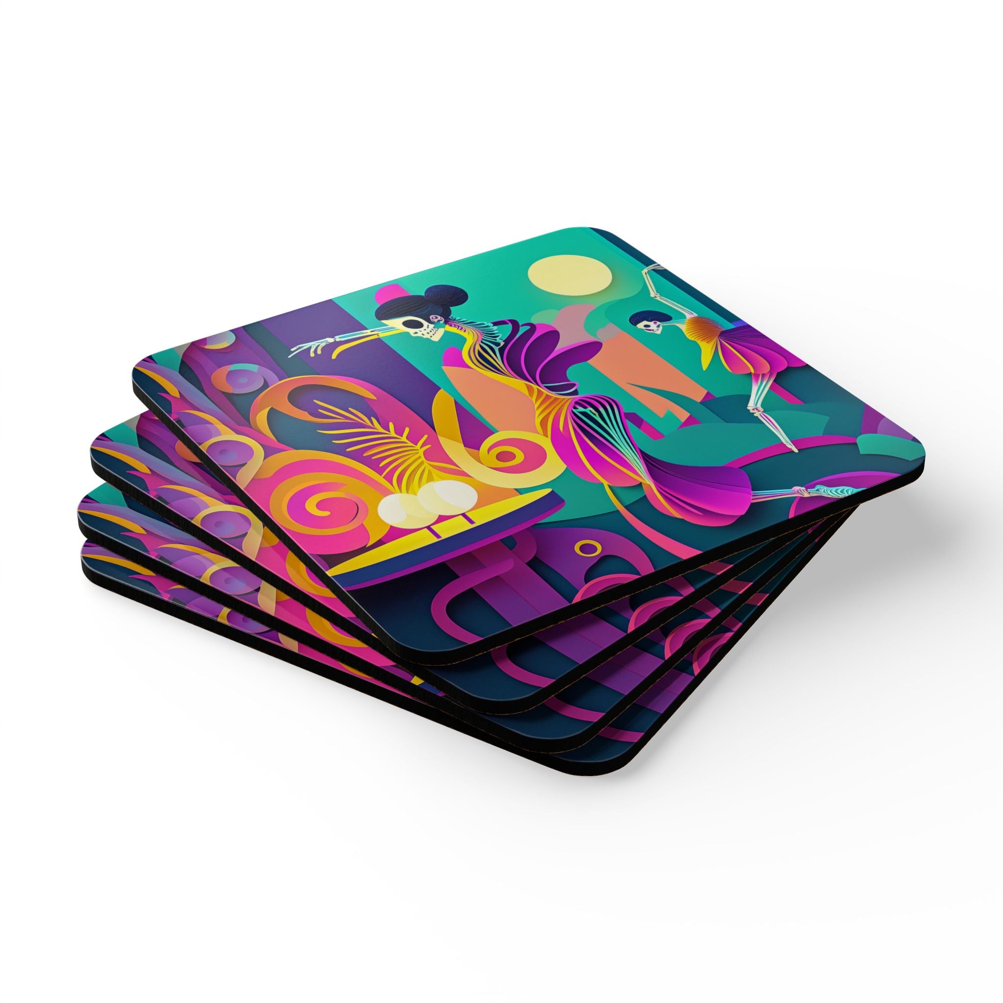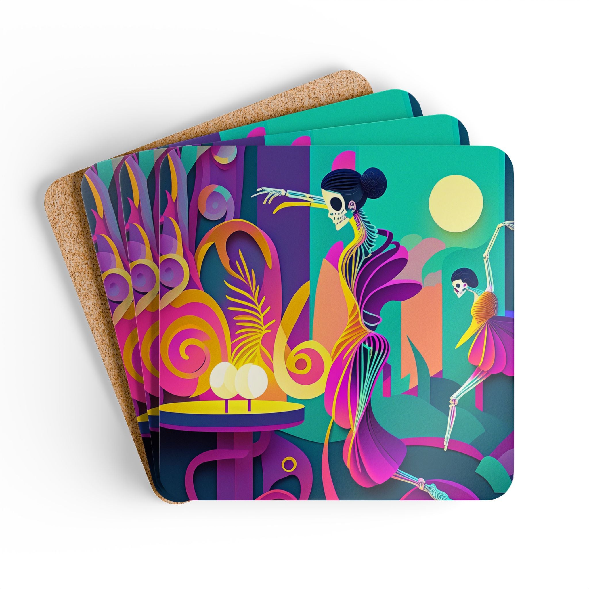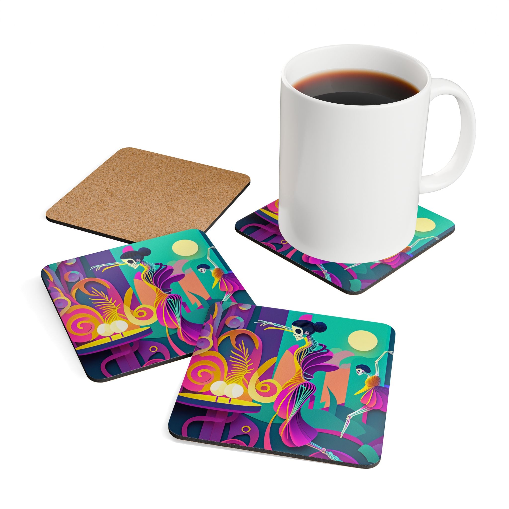 Add a festive touch to your Halloween decor with this elegant set of coasters. Each set includes four coasters, all featuring captivating Halloween designs. Crafted with a high-gloss top and a cork back, these coasters offer both style and functionality, preventing any unwanted sliding while adding a spooky charm to your home or business.