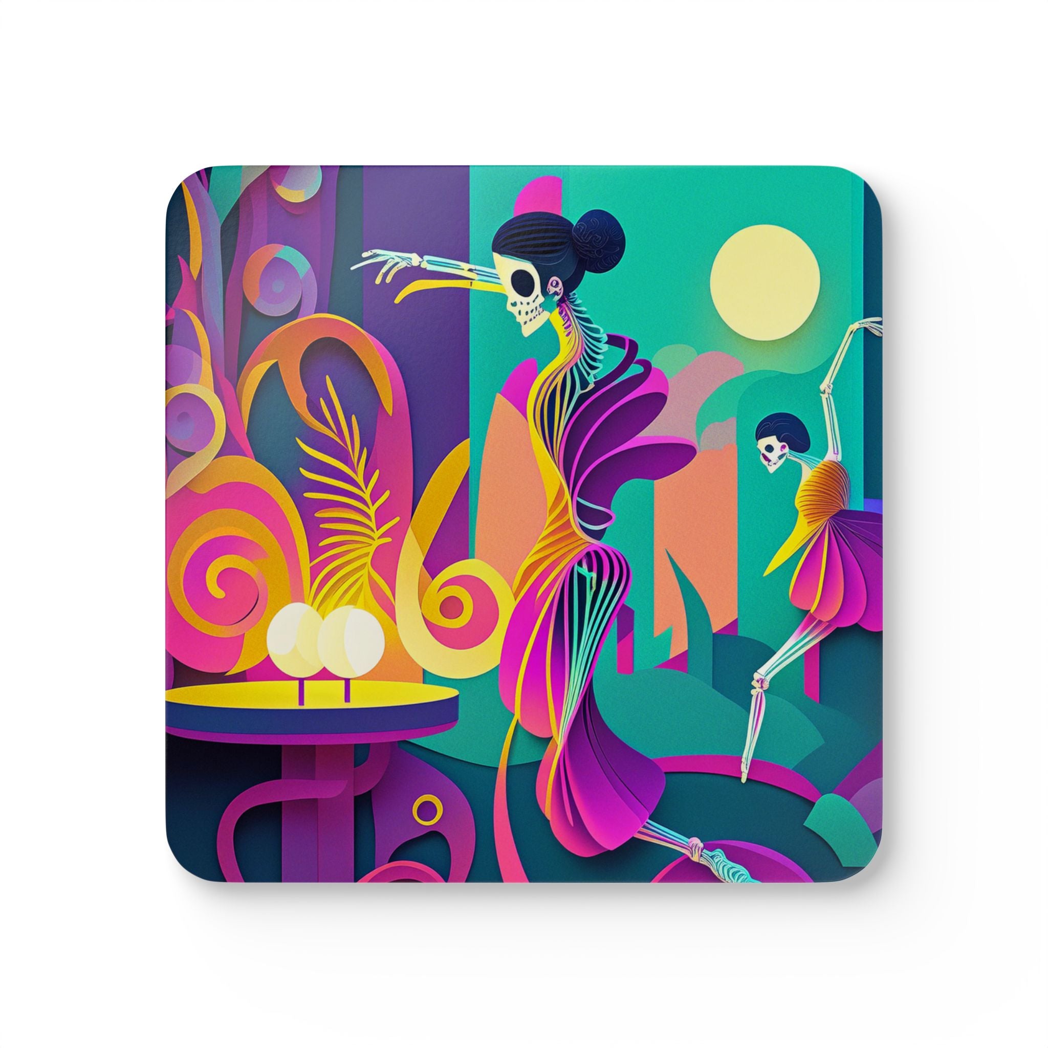 Artwork created, designed and digitally remastered by Sarasvati Designs. Under a vibrant, surreal sky bursting with neon blues, purples, pinks, oranges, and yellows, two skeletal ballerinas perform a mesmerizing ballet. Their bony forms gracefully mimic the elegance of living dancers, each movement fluid and enchanting. Above them, a bright yellow moon hangs in the sky, casting an ethereal glow over the scene. The surreal colors blend and swirl, creating a dreamlike atmosphere that feels both whimsical and eerie.