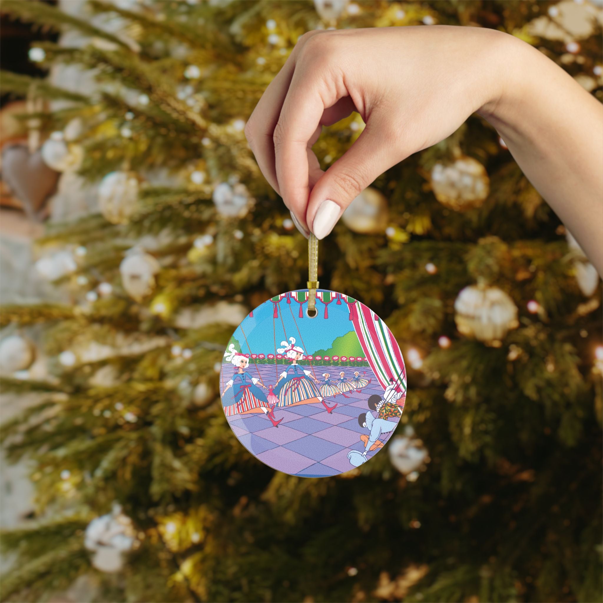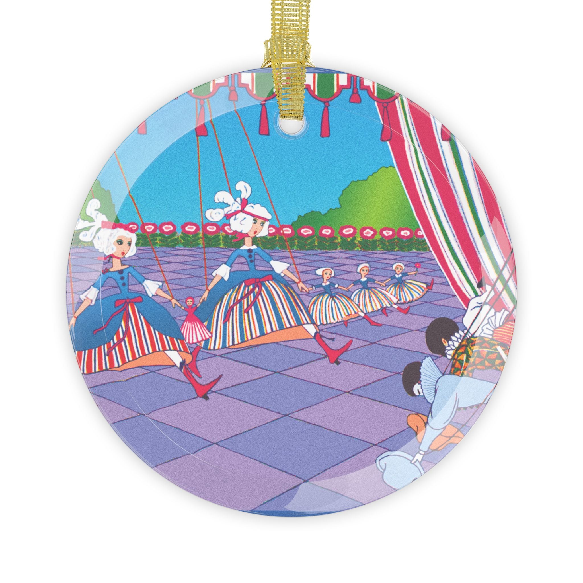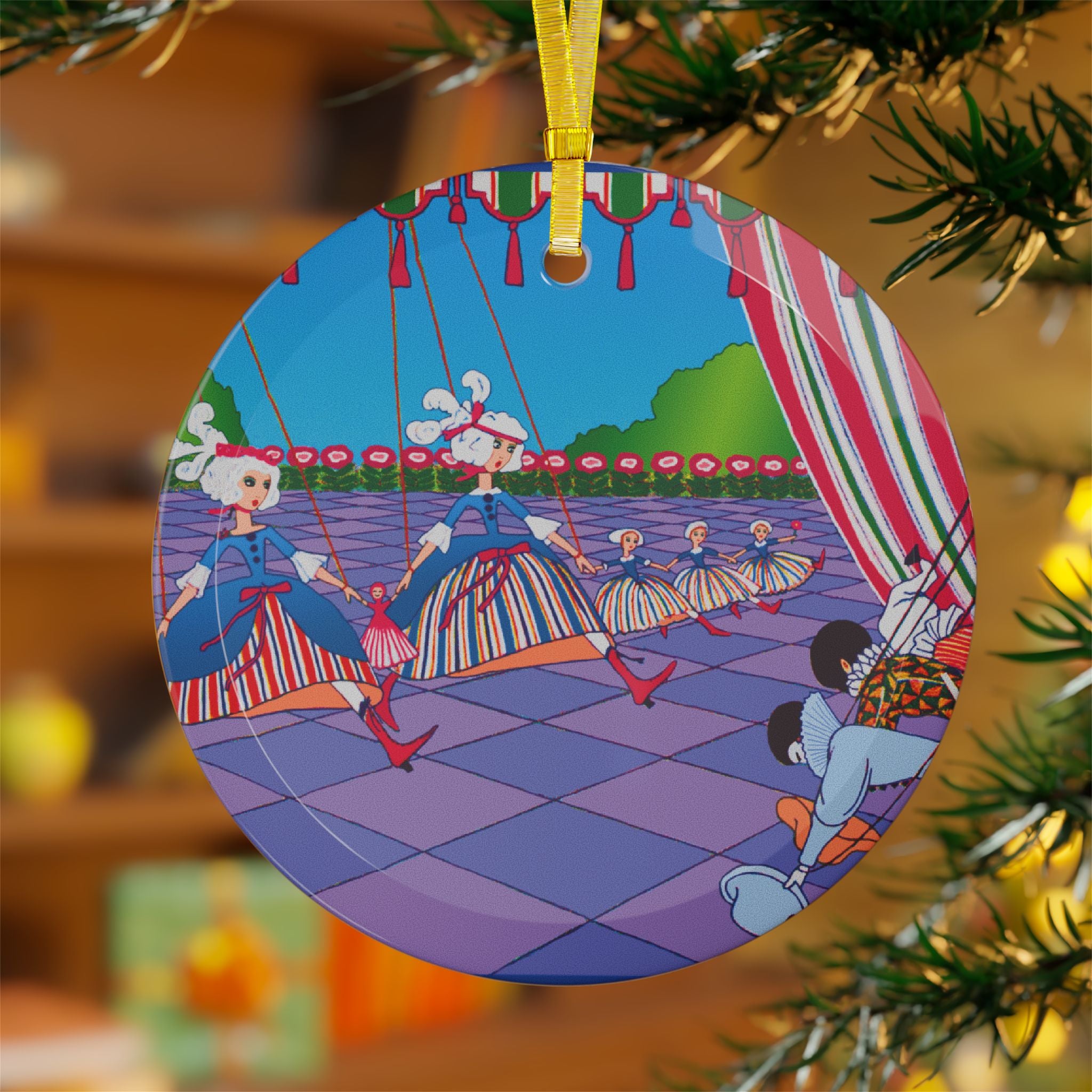 Dancing Puppets Glass Ornament brings whimsical charm and artistic flair to your holiday décor. Crafted from 100% glass, this elegant ornament features beveled edges and a shimmering gold ribbon, making it a standout addition to any tree or festive display. Each ornament arrives in a beautifully packaged gift box, perfect for gifting or collecting.