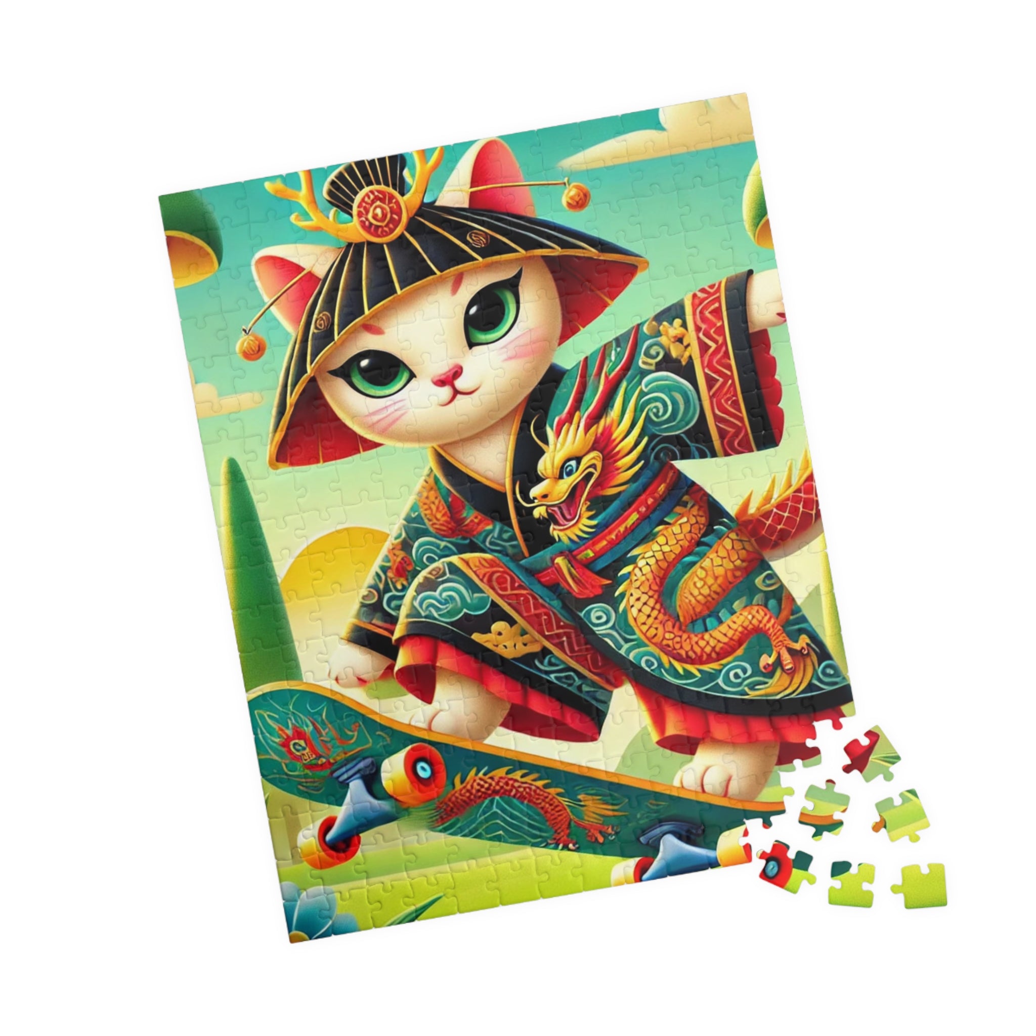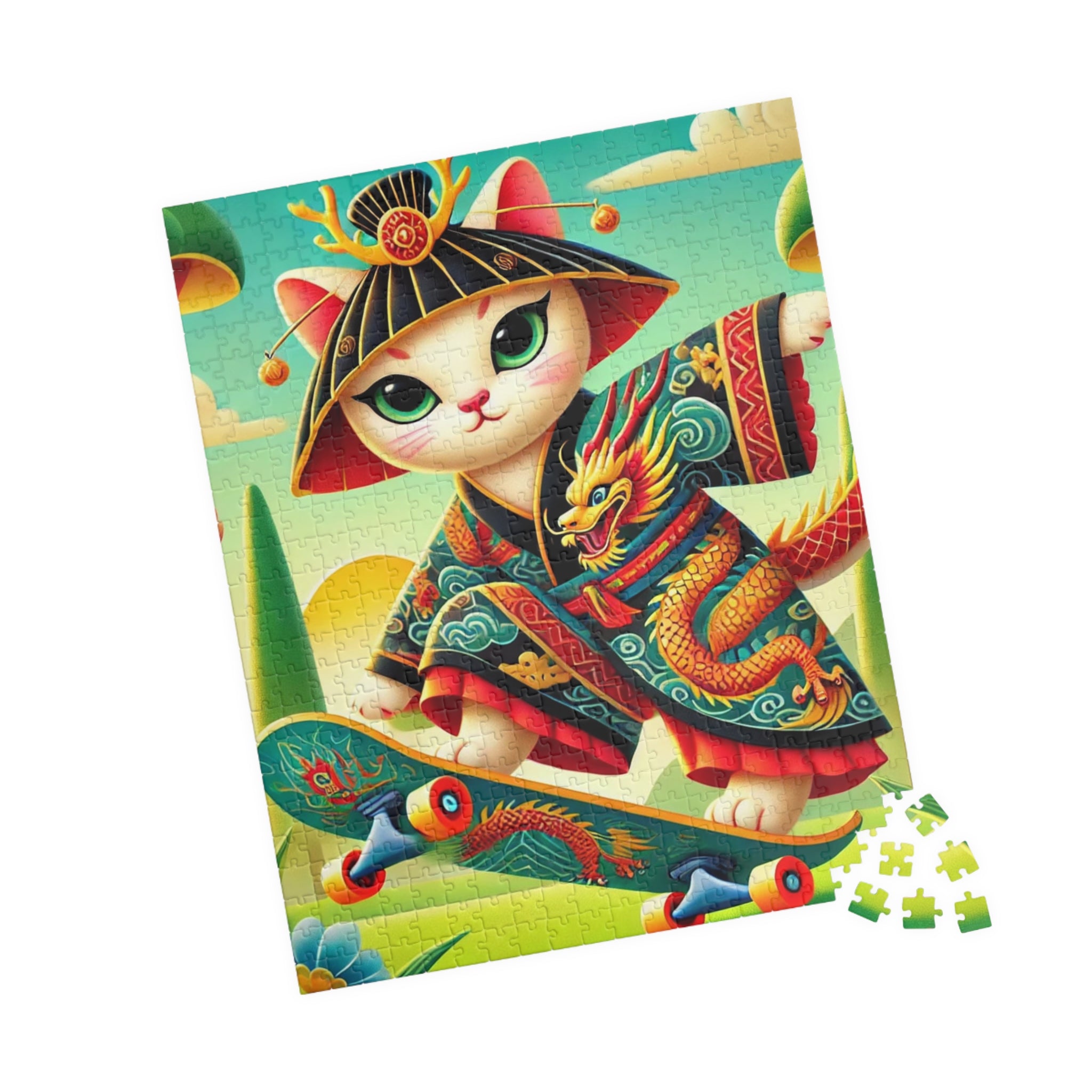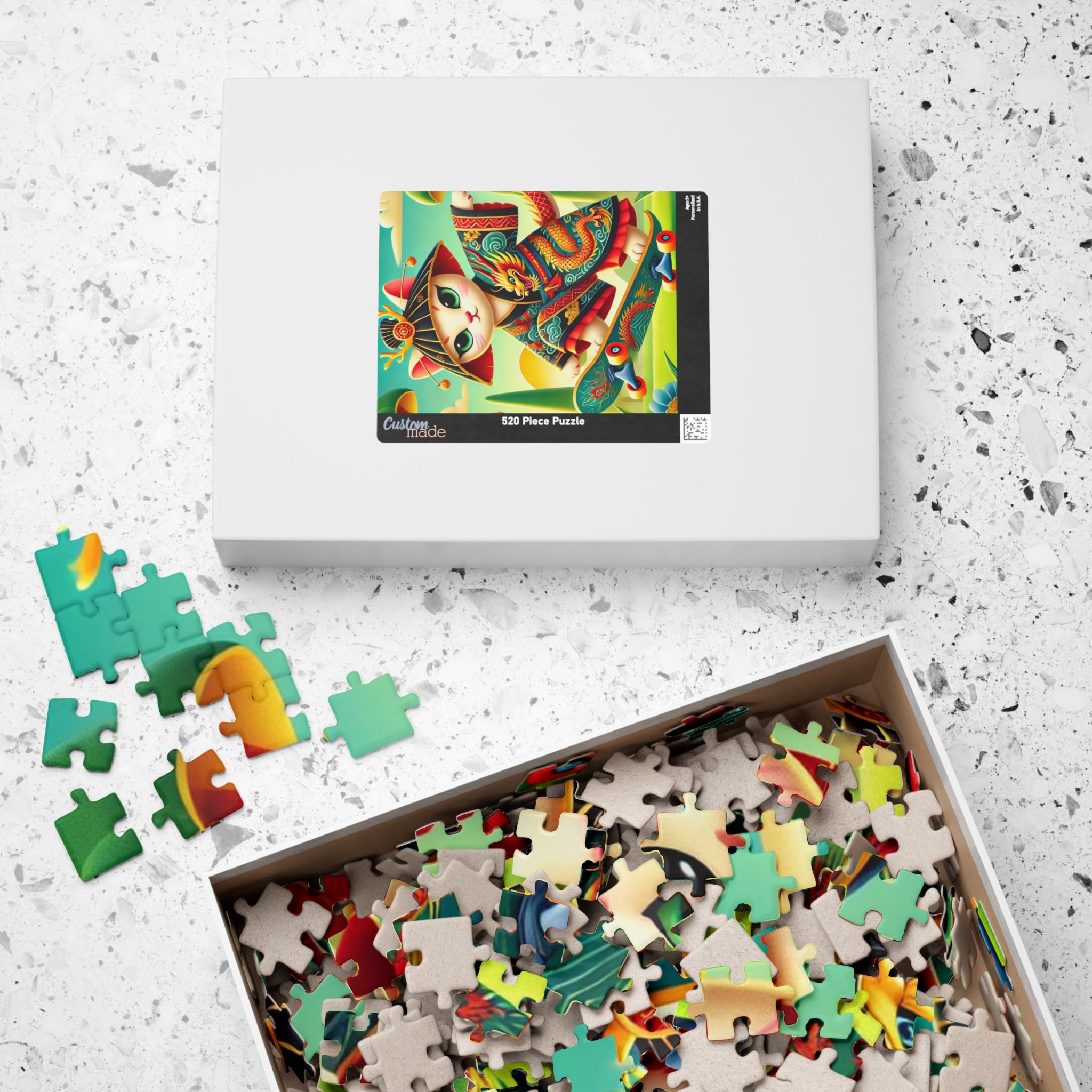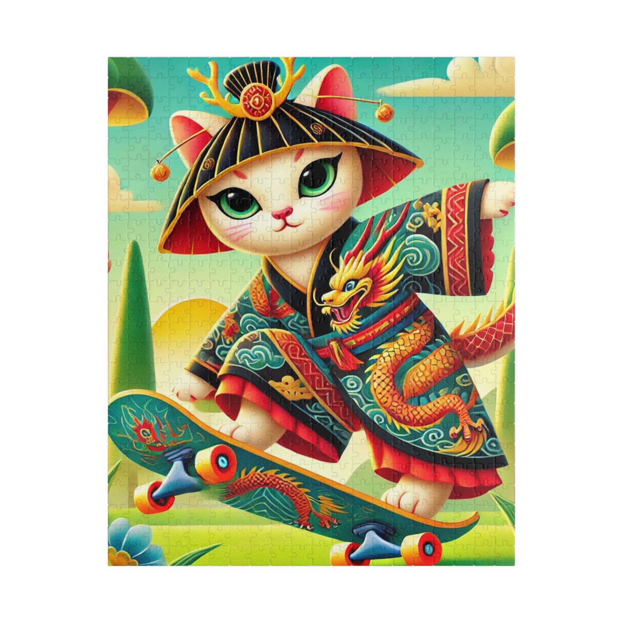 The Dragon Dance on Wheels artwork showcases a bold geisha kitten in a striking kimono adorned with intricate dragon patterns. With effortless grace, she performs daring tricks on a skateboard, blending traditional elegance with modern excitement. The dynamic composition radiates adventure, color, and artistic charm — an irresistible fusion of East and West that turns every puzzle session into a celebration of creativity.