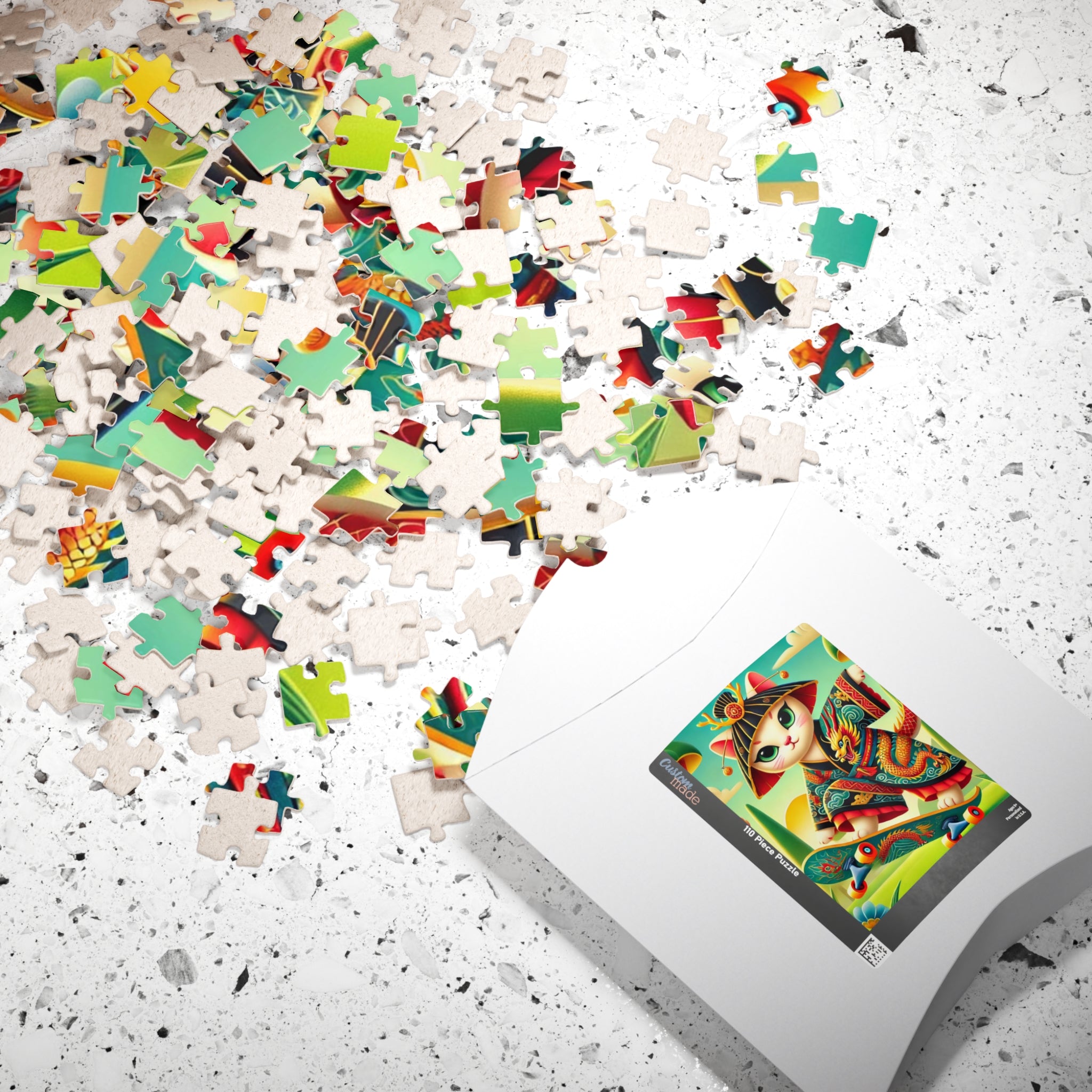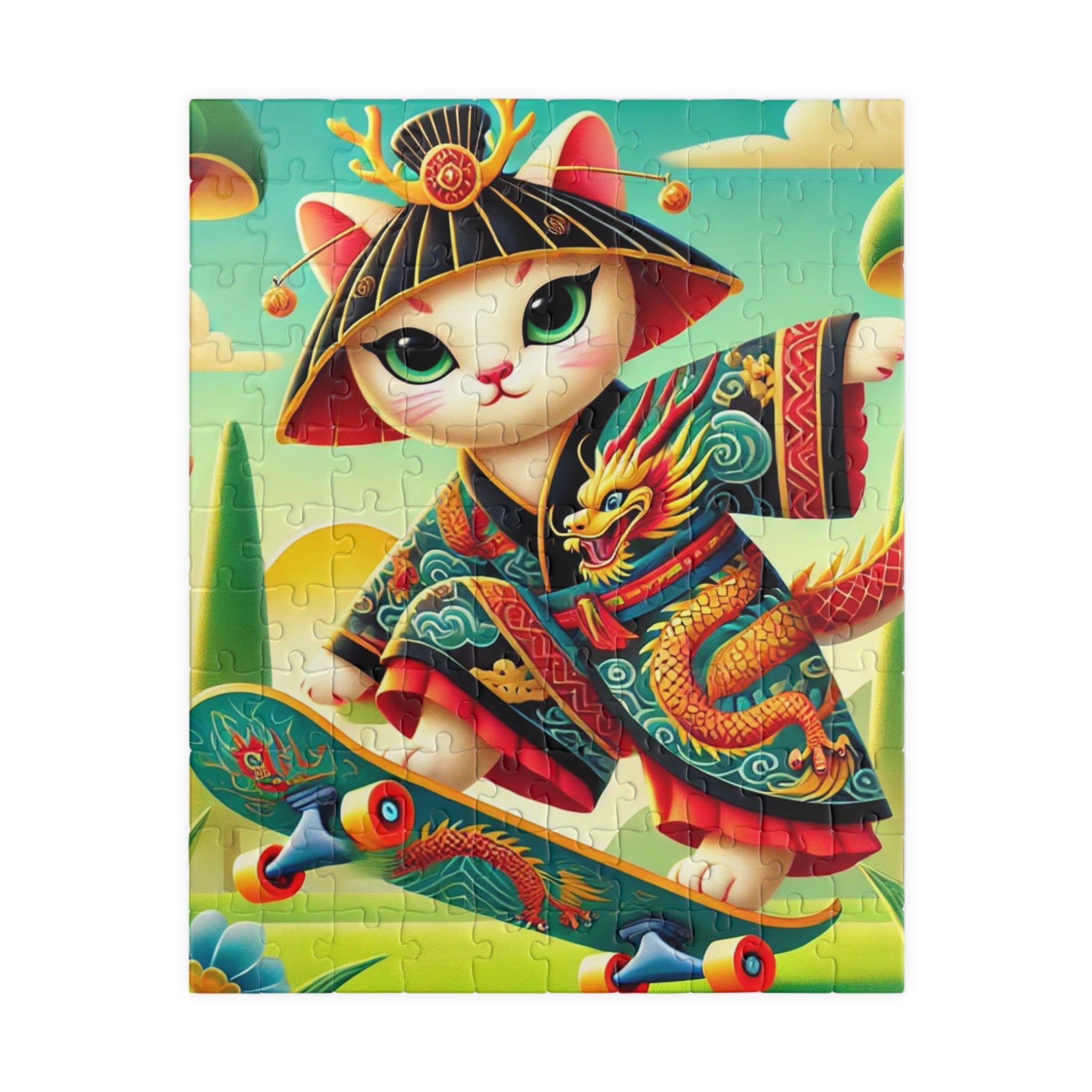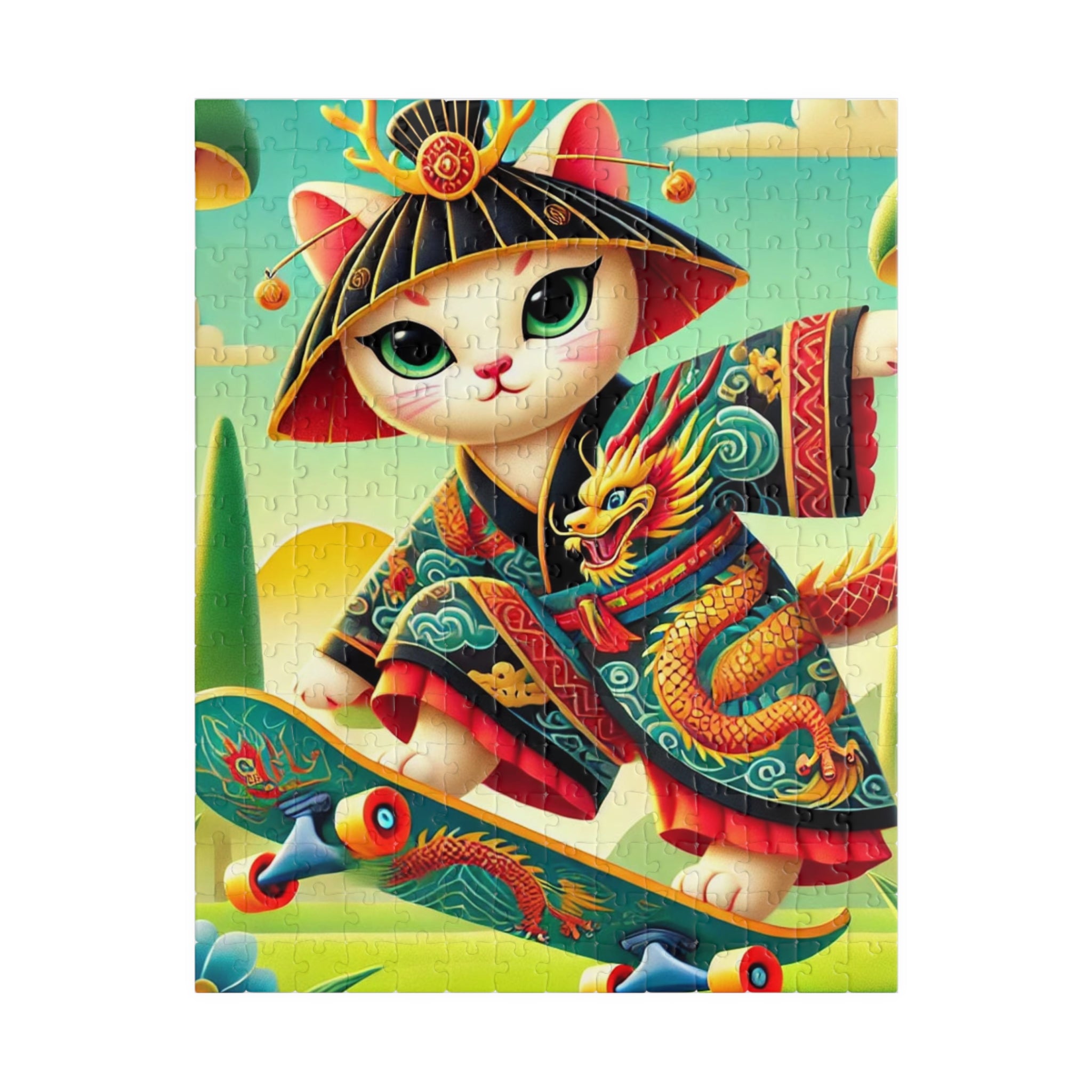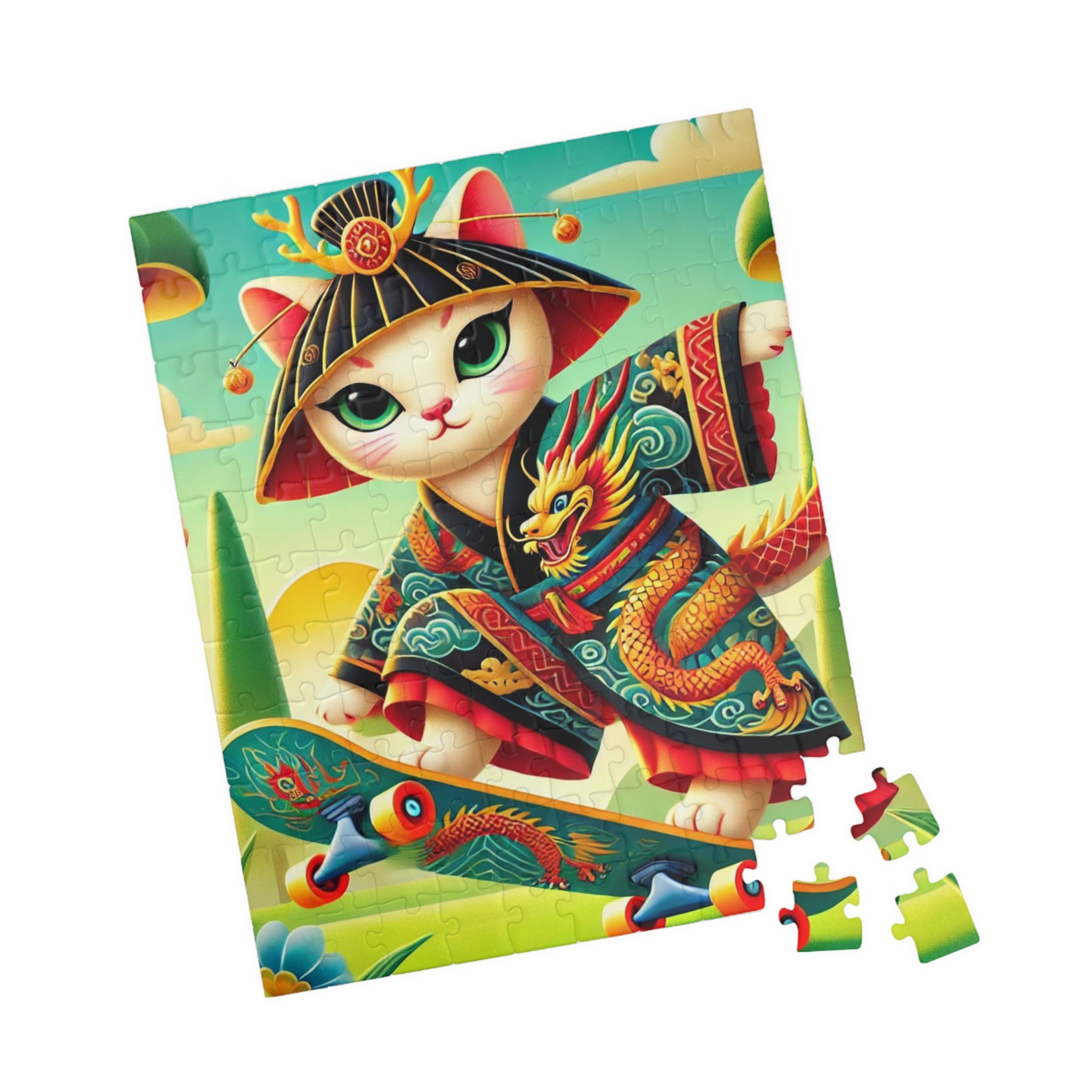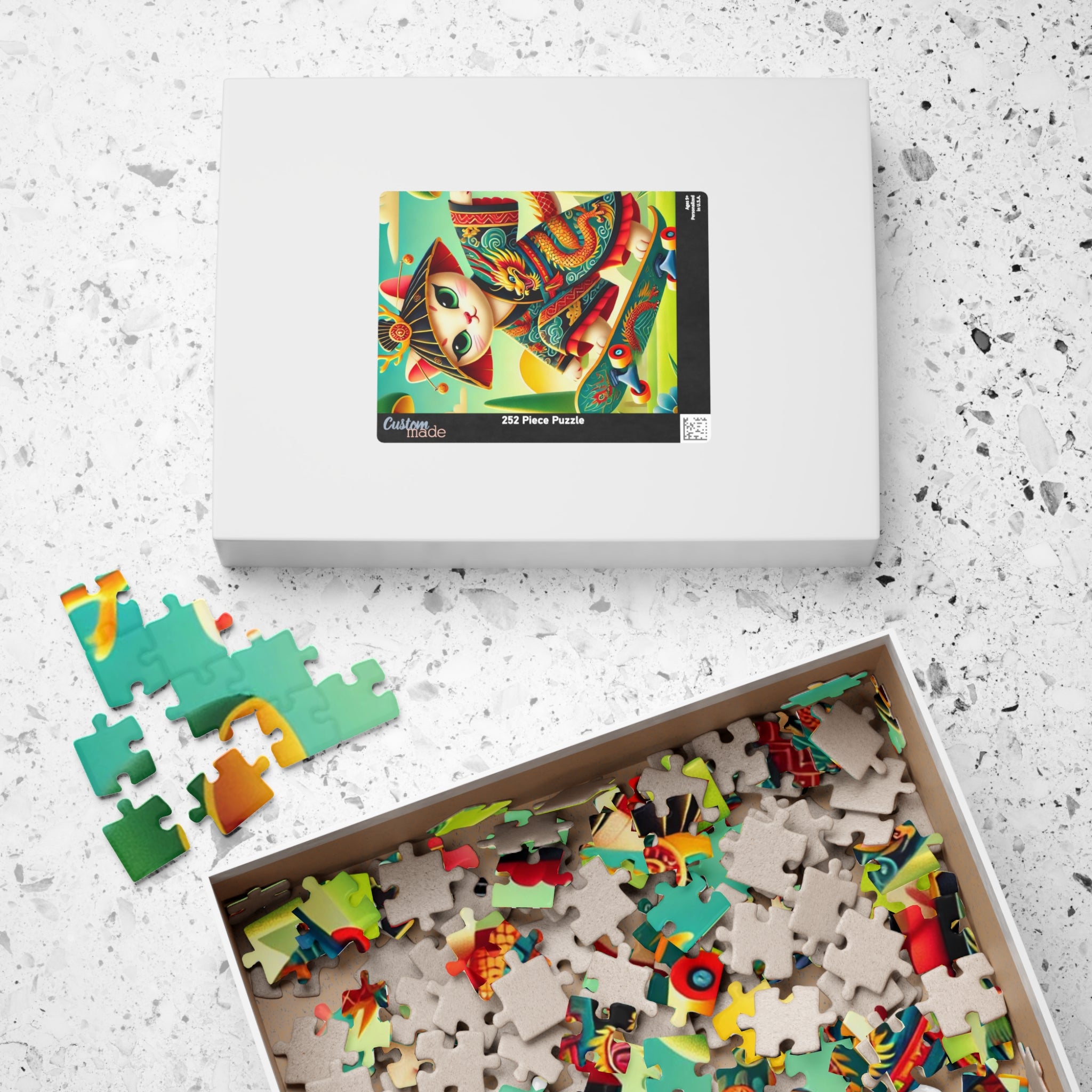 The Dragon Dance on Wheels artwork showcases a bold geisha kitten in a striking kimono adorned with intricate dragon patterns. With effortless grace, she performs daring tricks on a skateboard, blending traditional elegance with modern excitement. The dynamic composition radiates adventure, color, and artistic charm — an irresistible fusion of East and West that turns every puzzle session into a celebration of creativity.