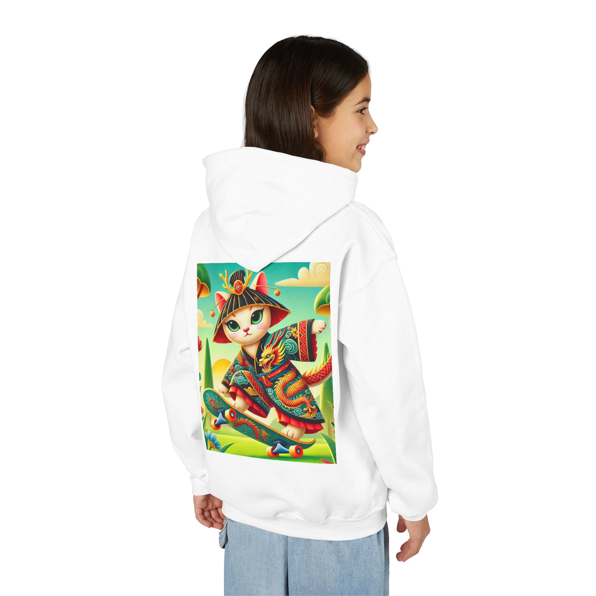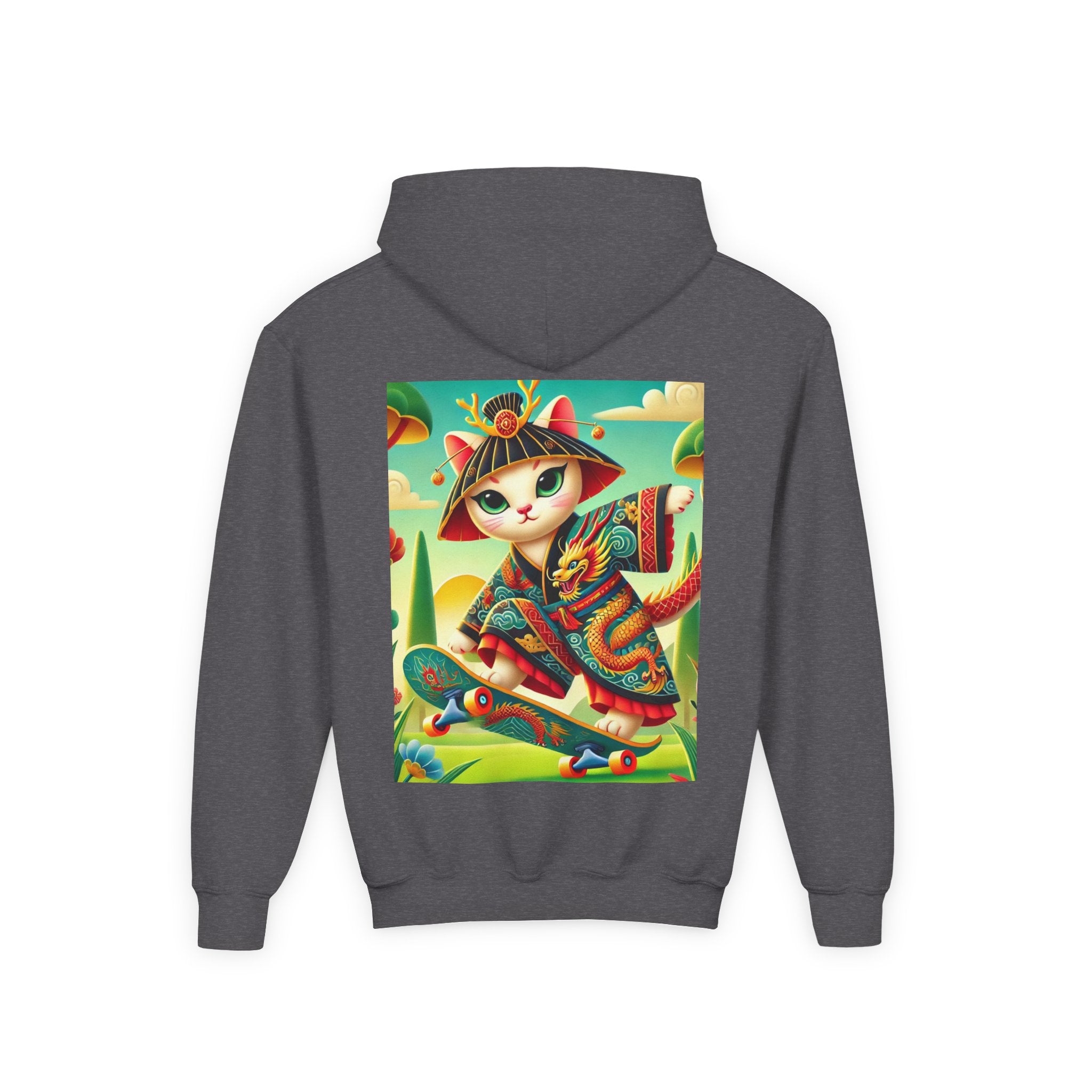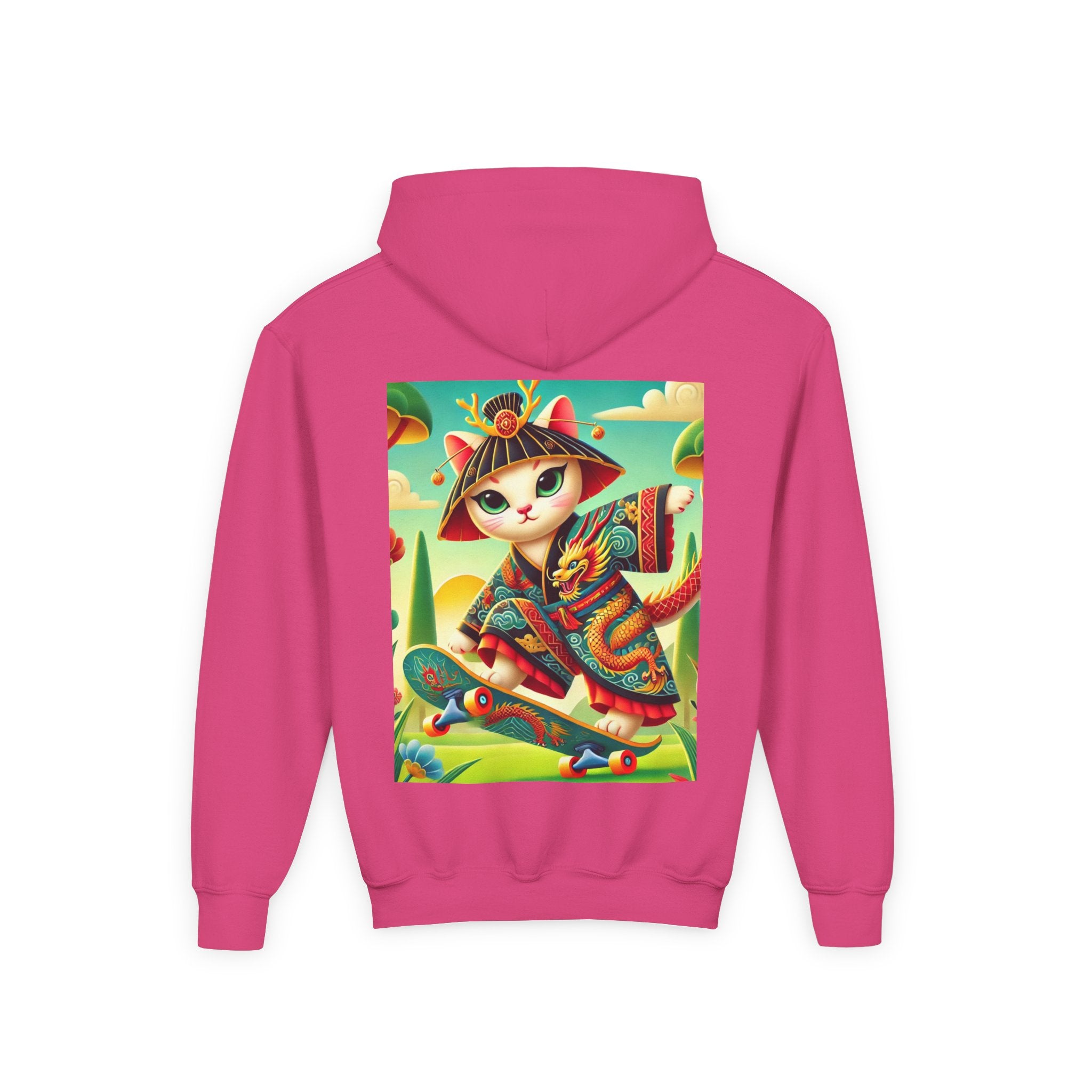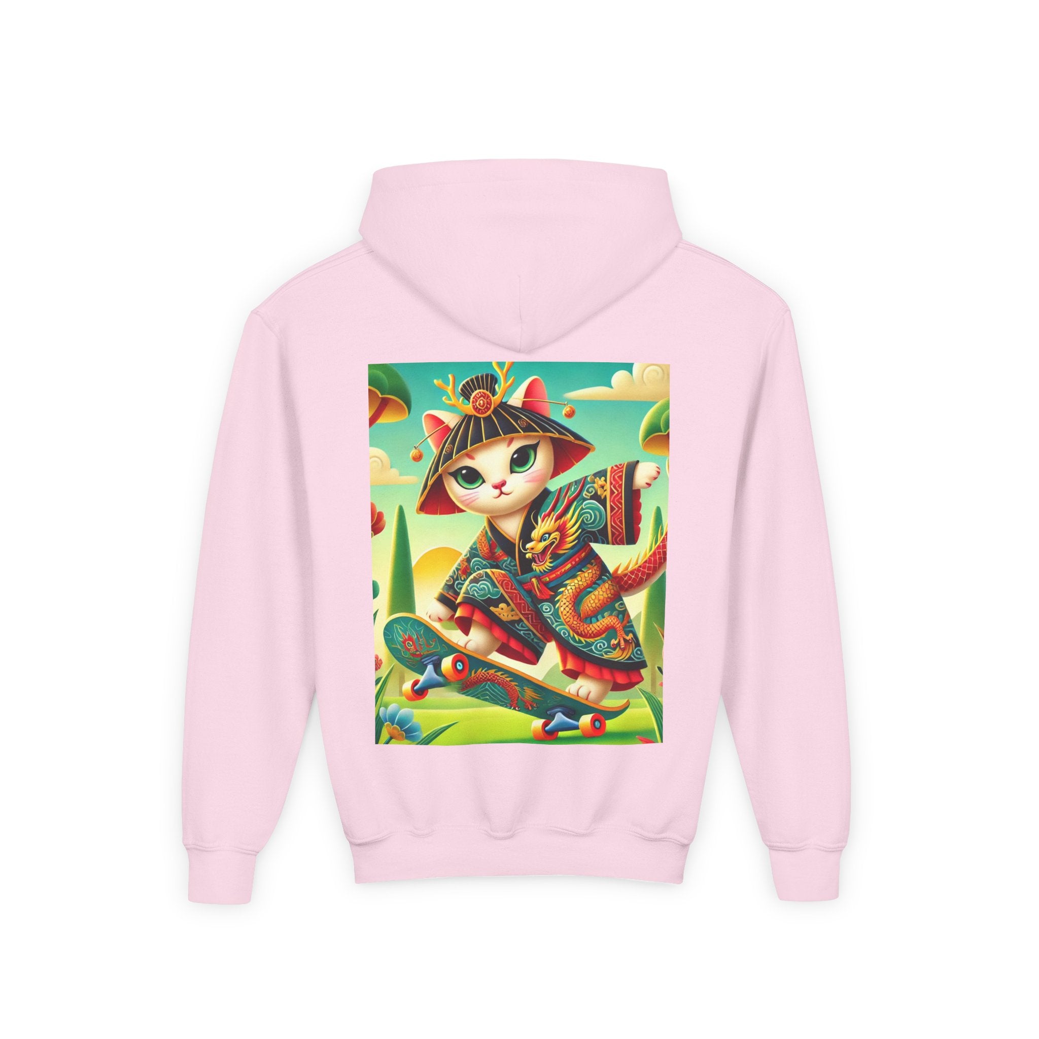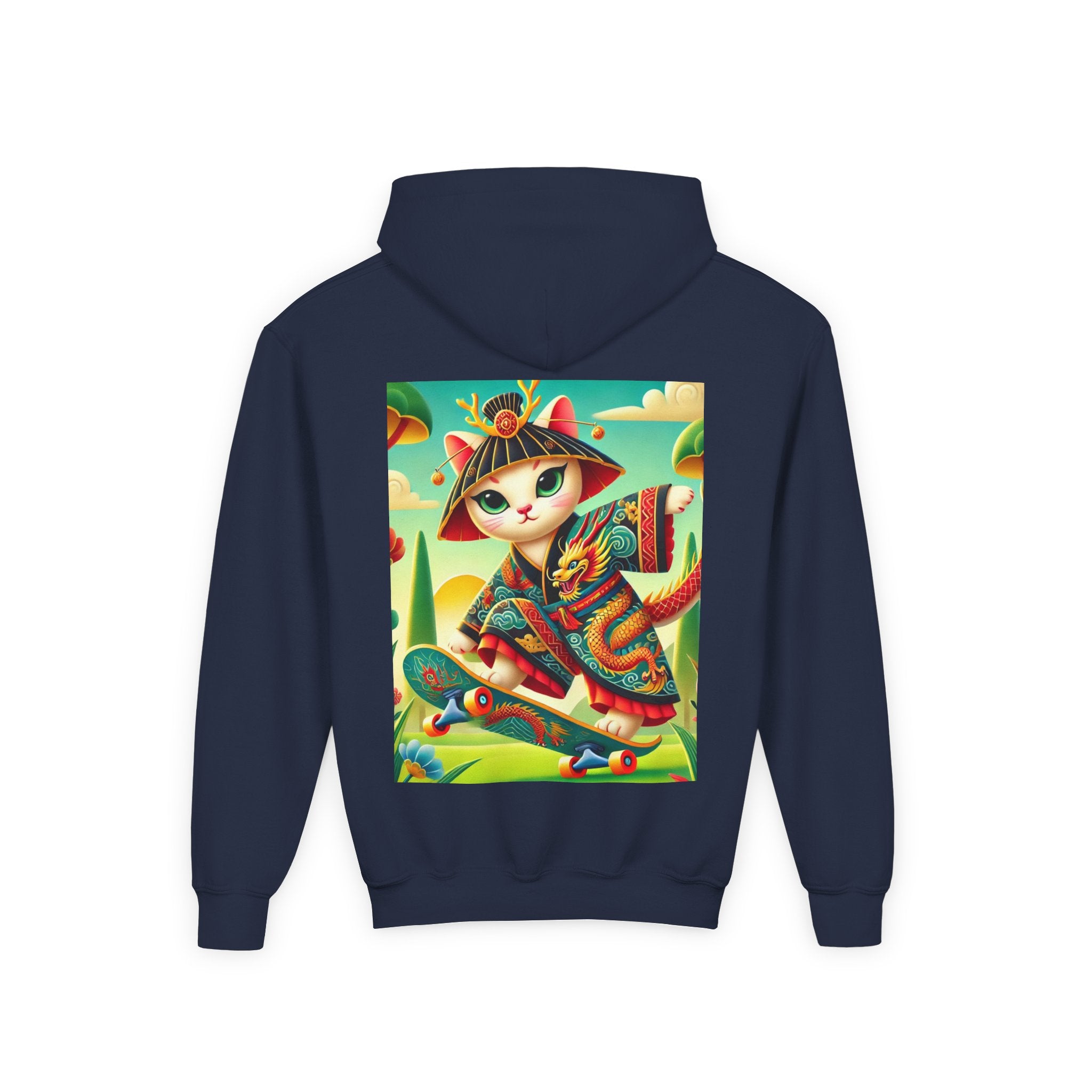 The Dragon Dance on Wheels design captures a bold geisha kitten performing daring tricks on a skateboard, dressed in a vibrant kimono adorned with detailed dragon motifs. Her graceful yet fearless movement merges traditional Japanese elegance with modern street flair. Surrounded by vivid colors and dynamic motion, the artwork radiates excitement and creativity—making this hoodie a perfect pick for energetic, art-loving kids.
