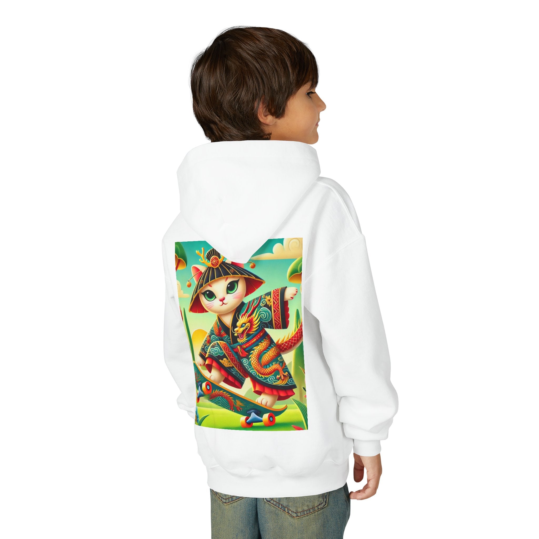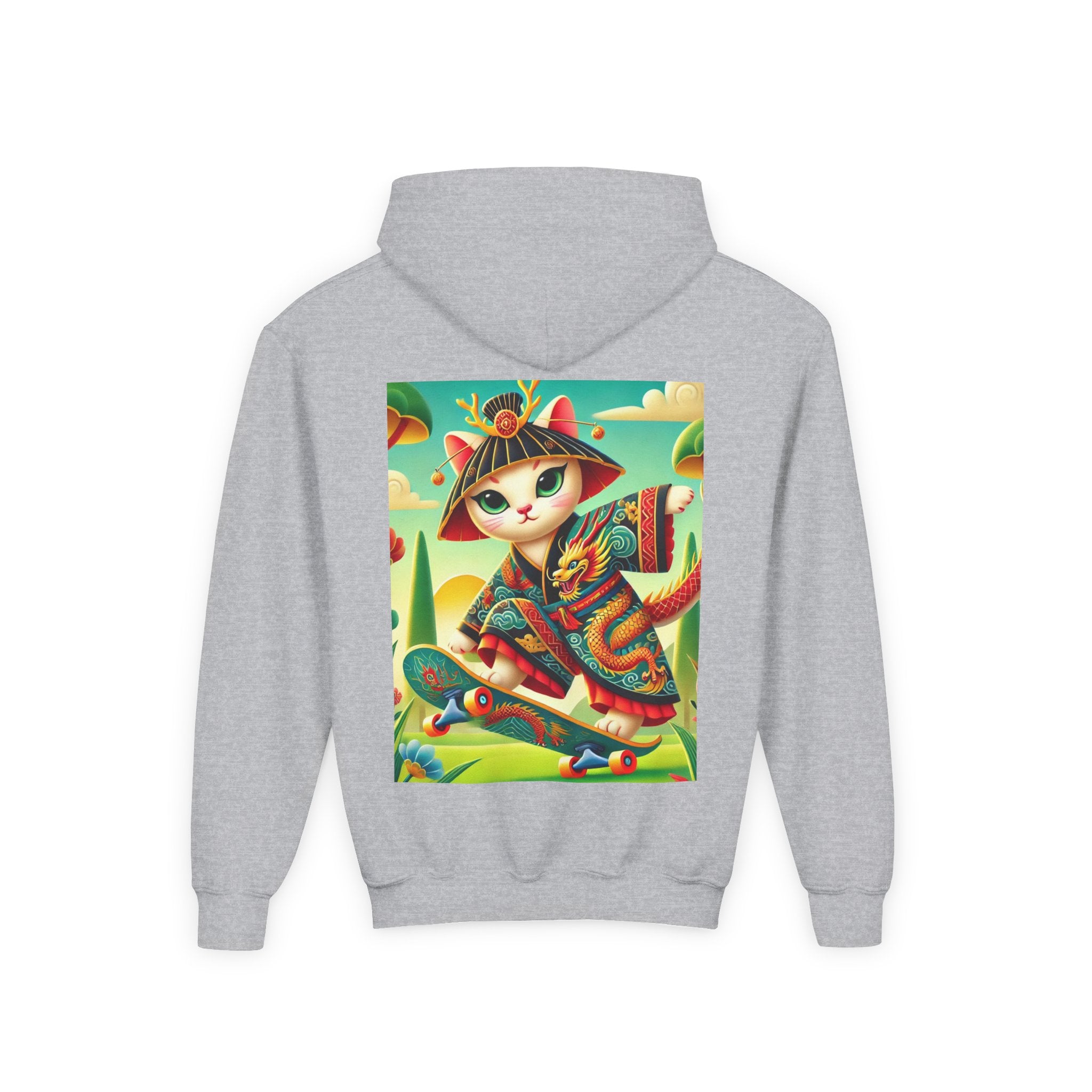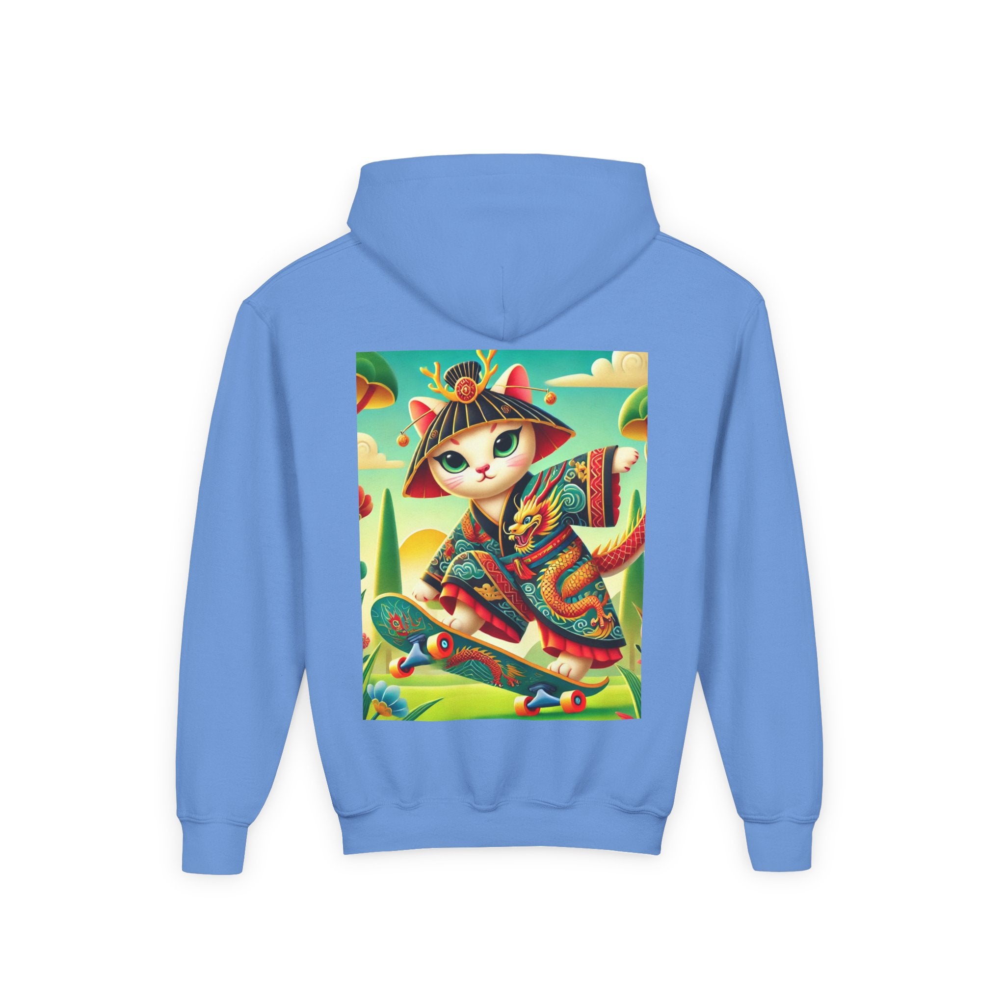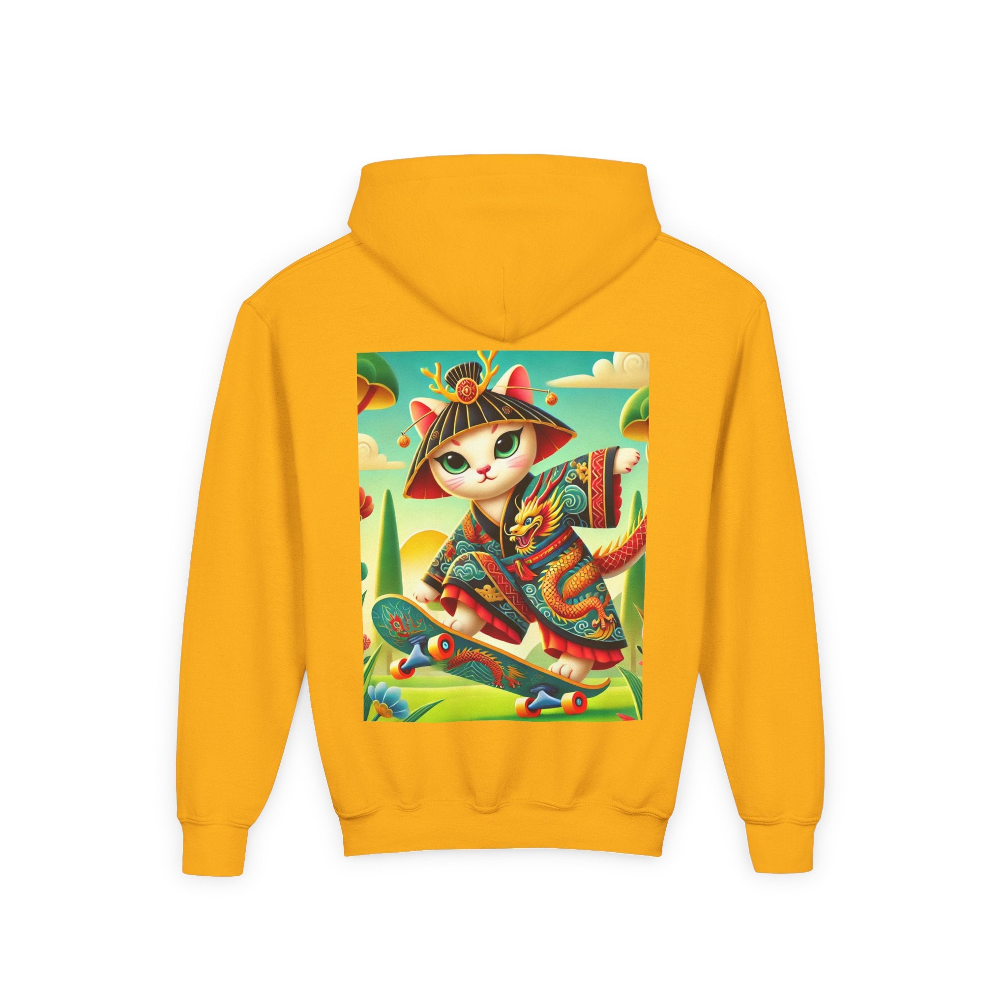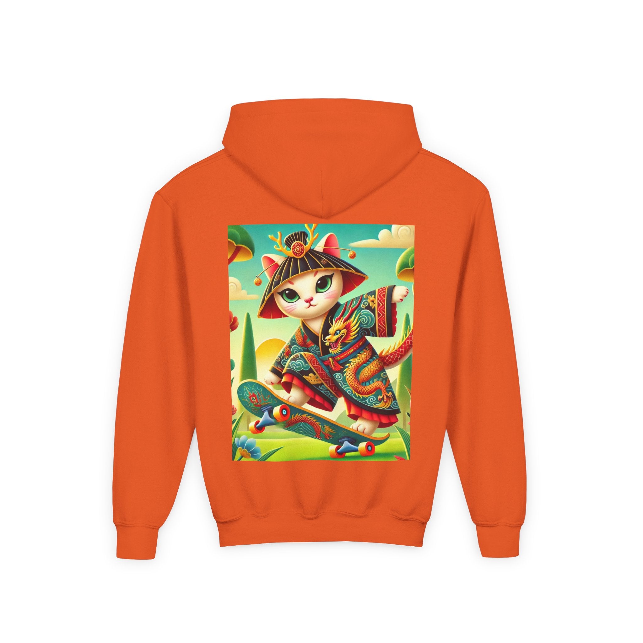 The Dragon Dance on Wheels design captures a bold geisha kitten performing daring tricks on a skateboard, dressed in a vibrant kimono adorned with detailed dragon motifs. Her graceful yet fearless movement merges traditional Japanese elegance with modern street flair. Surrounded by vivid colors and dynamic motion, the artwork radiates excitement and creativity—making this hoodie a perfect pick for energetic, art-loving kids.