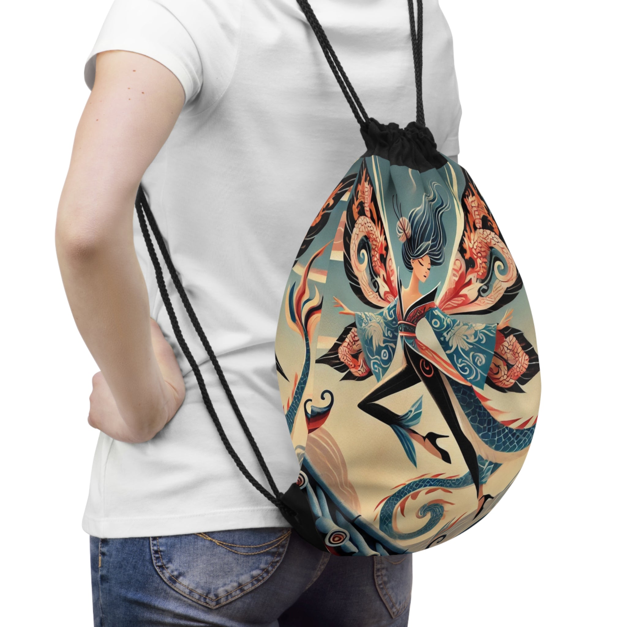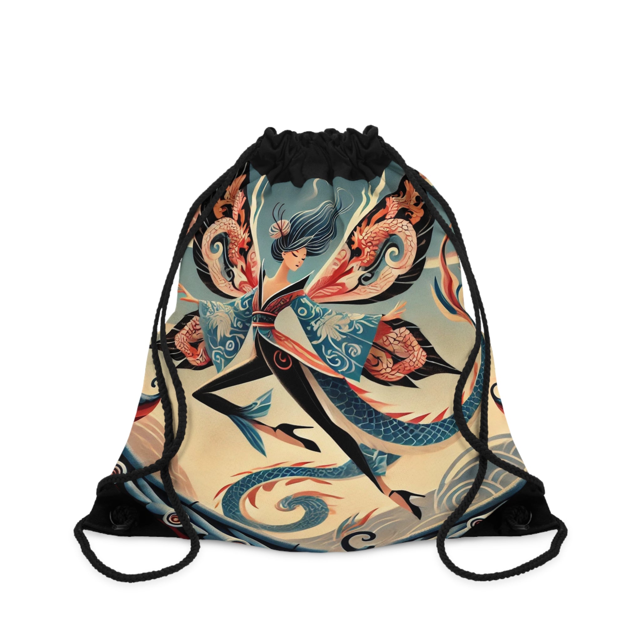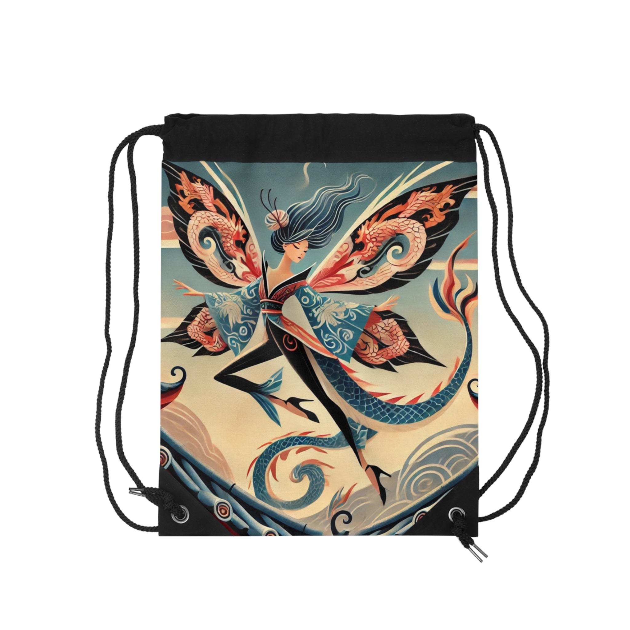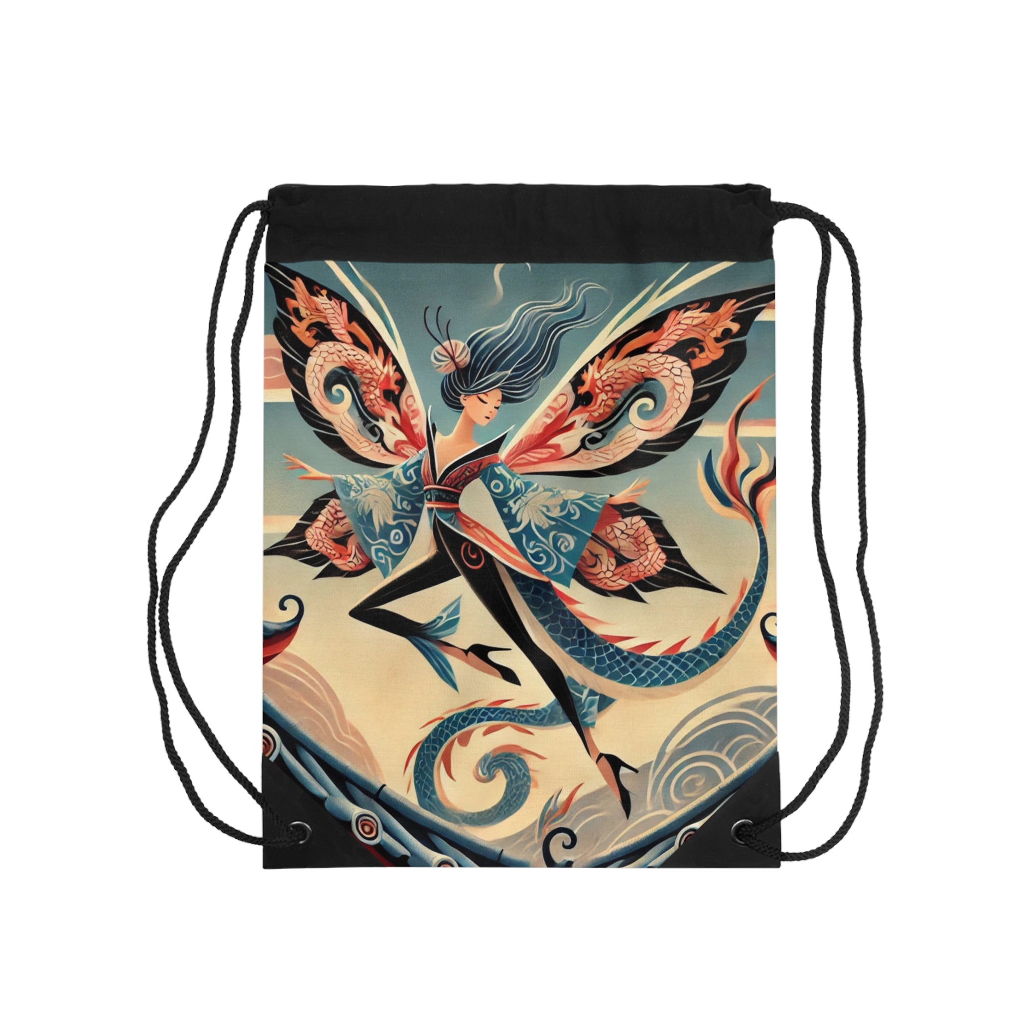 Dragon Fairy of the Temple Drawstring Bag captures mystique, strength, and elegance in one lightweight, durable design. Perfect for quick trips to the gym, store, or beach, this versatile drawstring bag offers both practicality and artistic allure. The Dragon Fairy of the Temple artwork showcases a fierce fairy poised atop an ancient temple roof, her sleek fitted kimono and translucent wings adorned with intricate dragon motifs. With her bold, commanding stance against a twilight sky, she embodies both power and grace, guarding the threshold where myth and magic converge. This captivating design transforms a simple accessory into a breathtaking tribute to fantasy and divine strength.