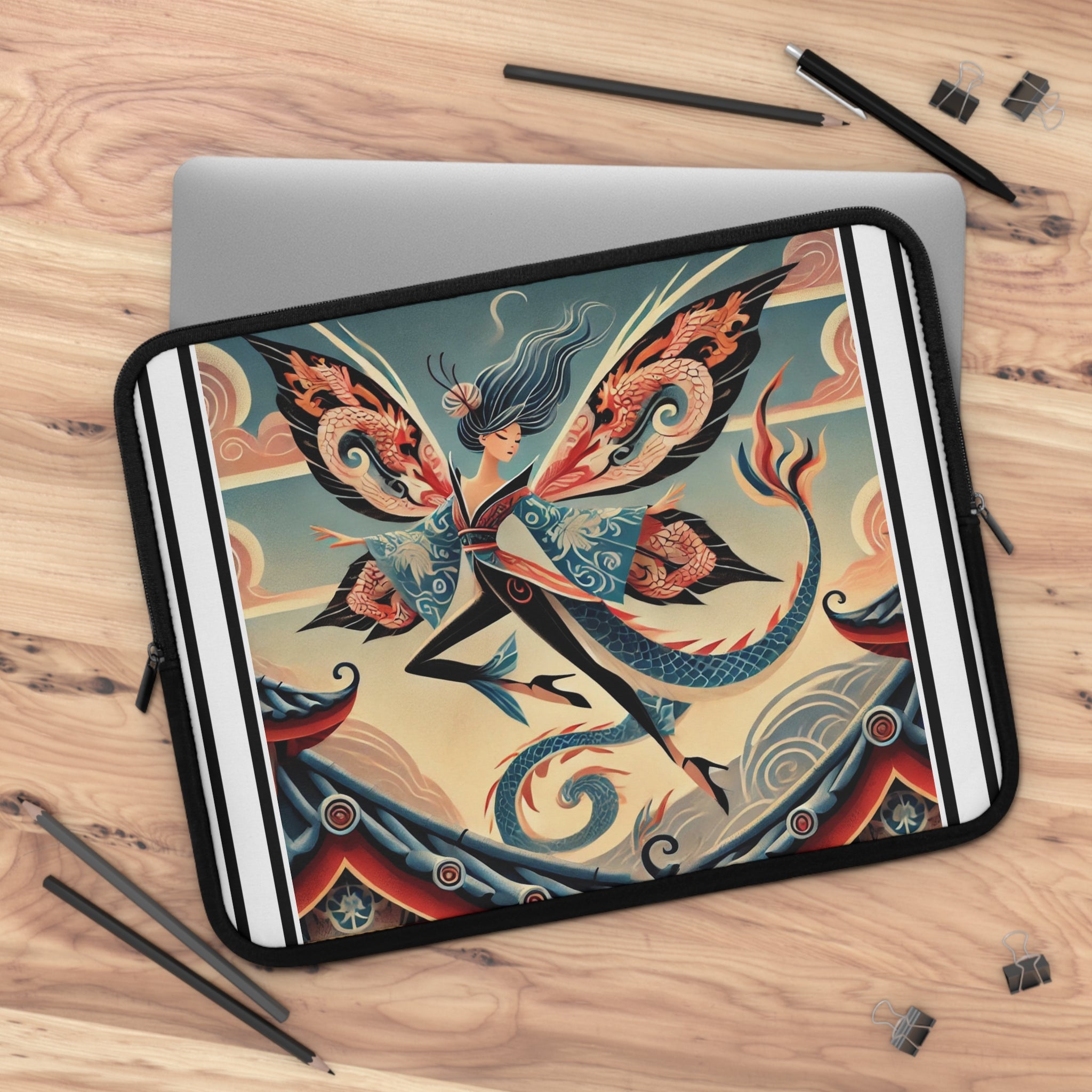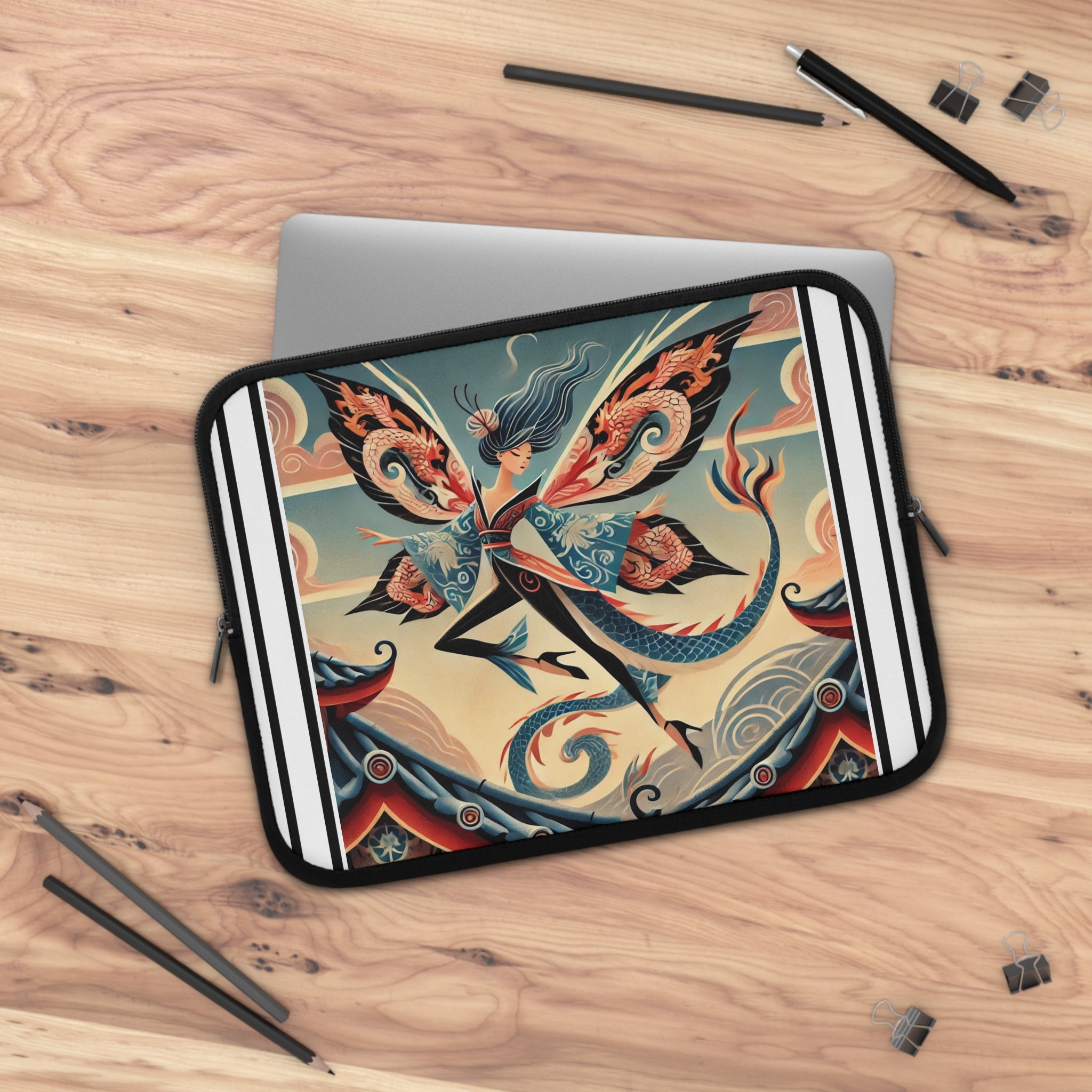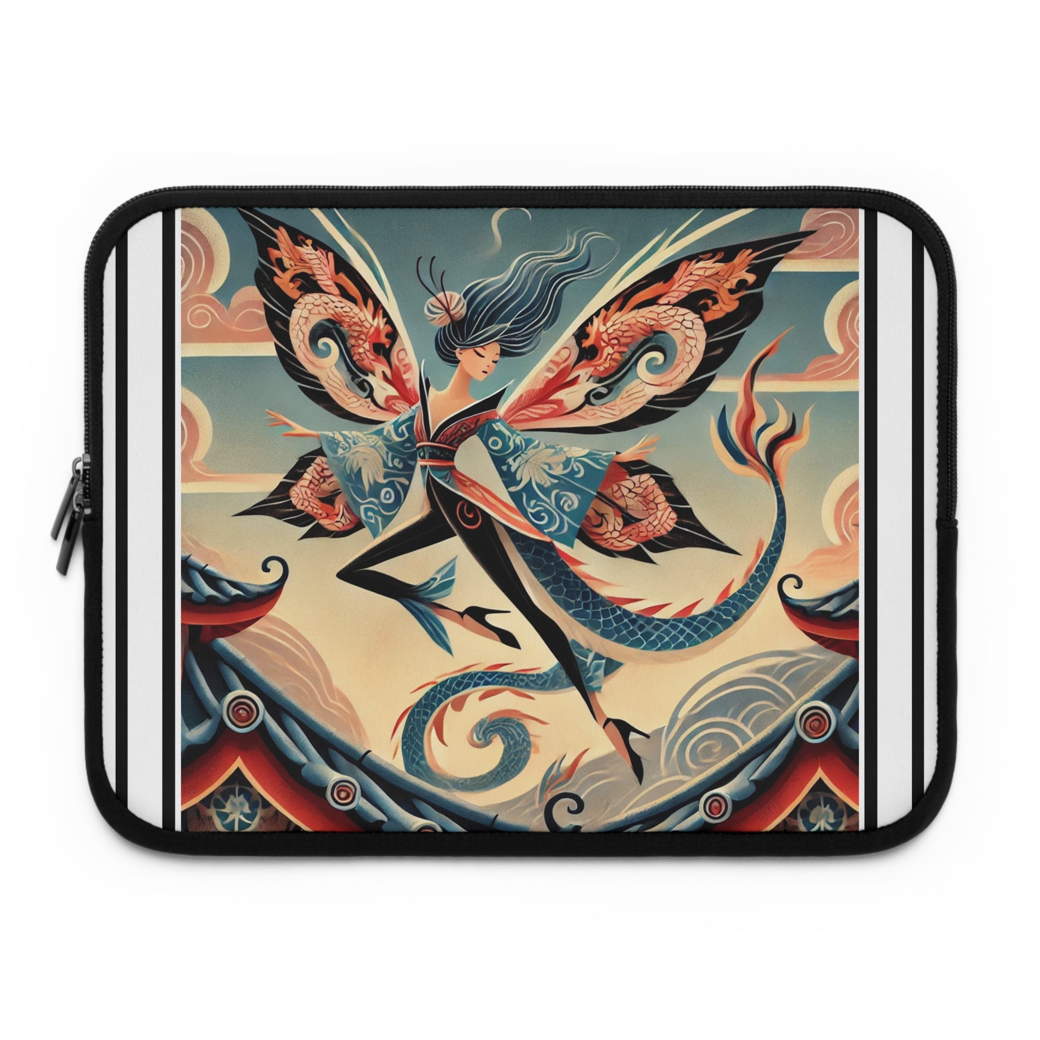 Step into a world where myth and elegance merge with the Dragon Fairy of the Temple Laptop Sleeve. This captivating design showcases a fierce fairy standing gracefully atop an ancient temple roof, her sleek, fitted kimono rippling in the breeze. Her wings shimmer with intricate dragon motifs, each scale glowing with mystical energy as sunlight filters through swirling clouds. With her poised stance and commanding presence, she embodies both strength and serenity — a guardian spirit watching over a realm where magic, tradition, and legend intertwine. The scene exudes power and balance, transforming everyday essentials into objects of wonder and storytelling.