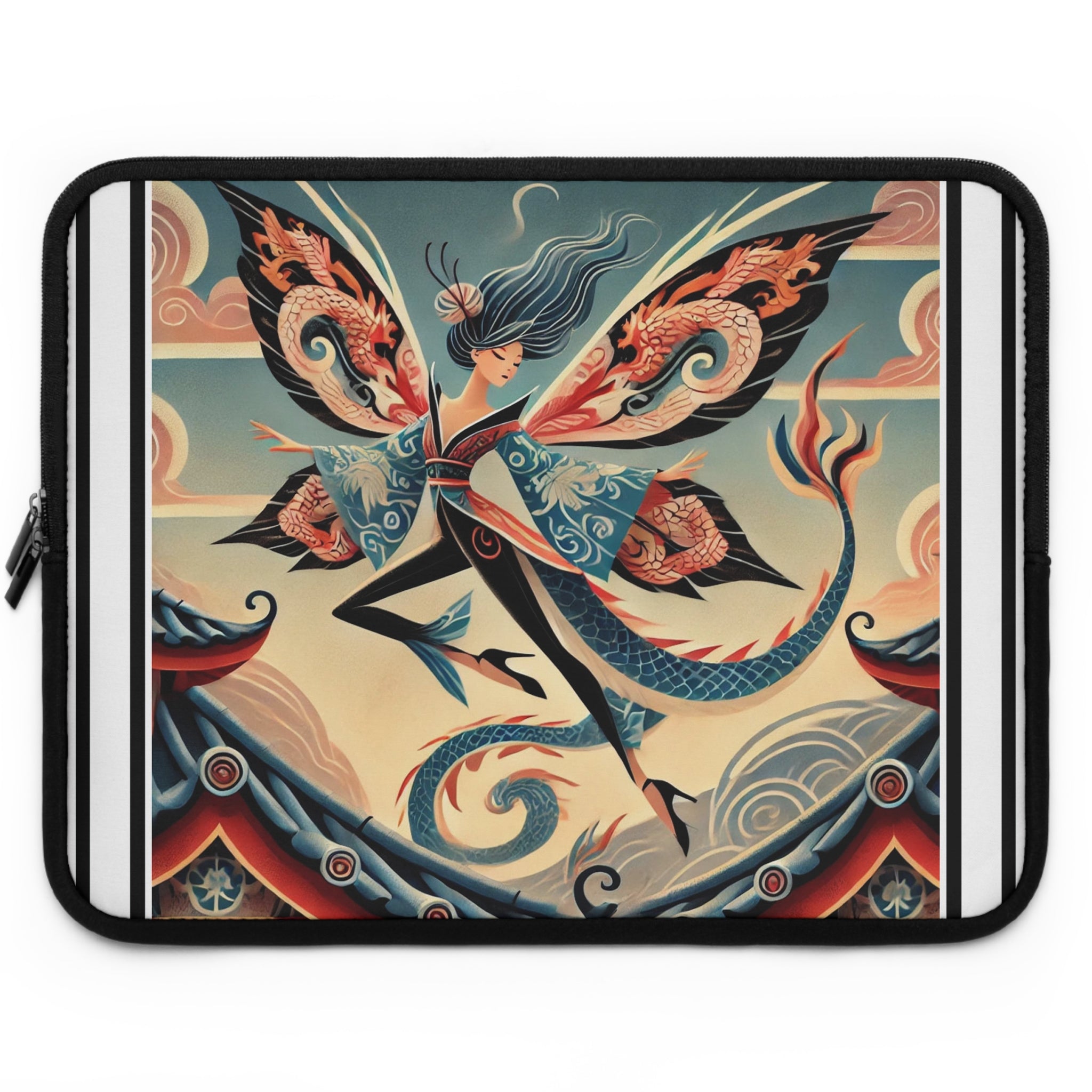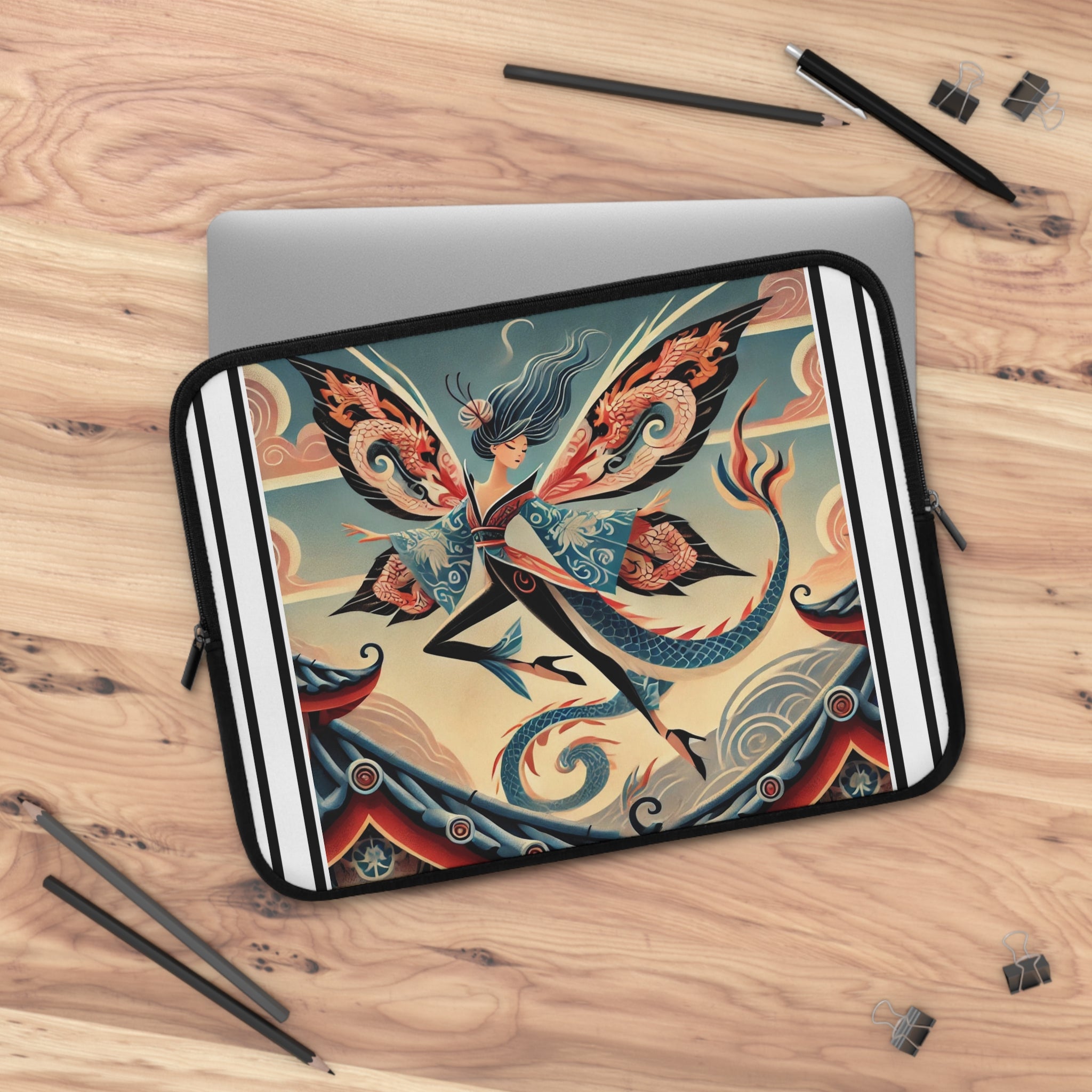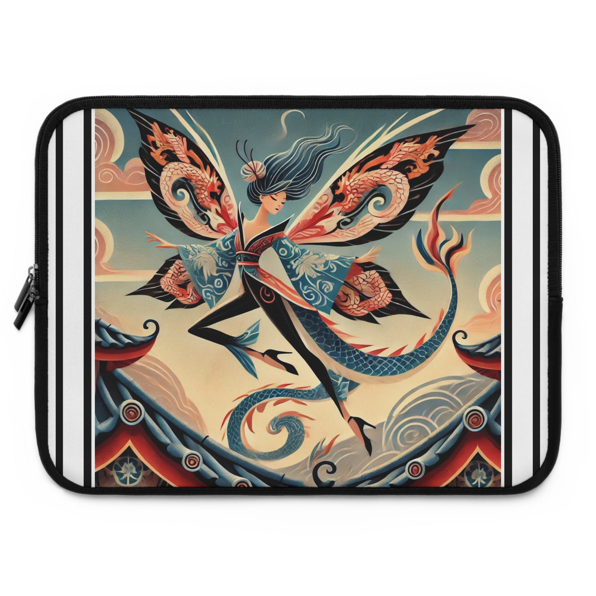 Step into a world where myth and elegance merge with the Dragon Fairy of the Temple Laptop Sleeve. This captivating design showcases a fierce fairy standing gracefully atop an ancient temple roof, her sleek, fitted kimono rippling in the breeze. Her wings shimmer with intricate dragon motifs, each scale glowing with mystical energy as sunlight filters through swirling clouds. With her poised stance and commanding presence, she embodies both strength and serenity — a guardian spirit watching over a realm where magic, tradition, and legend intertwine. The scene exudes power and balance, transforming everyday essentials into objects of wonder and storytelling.