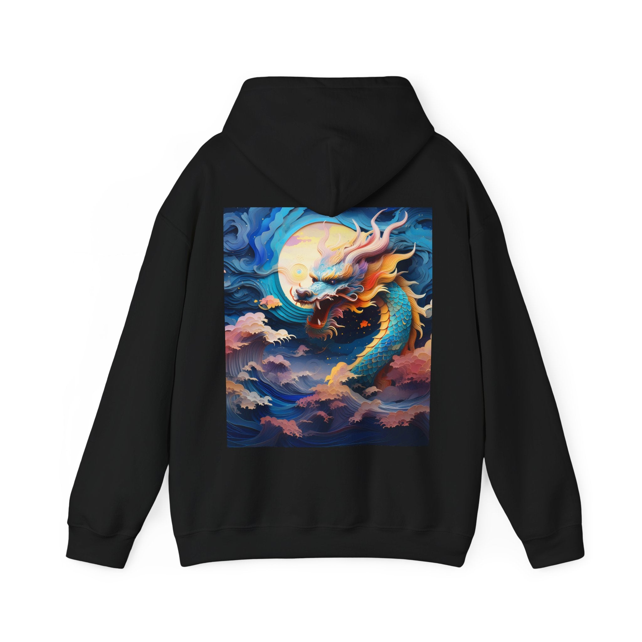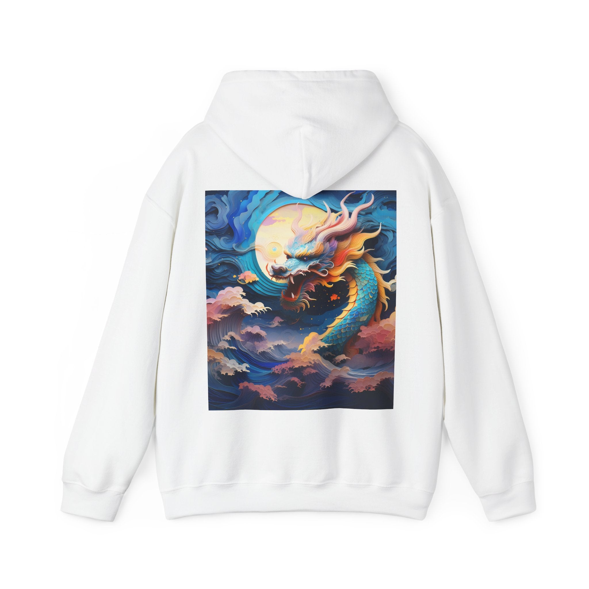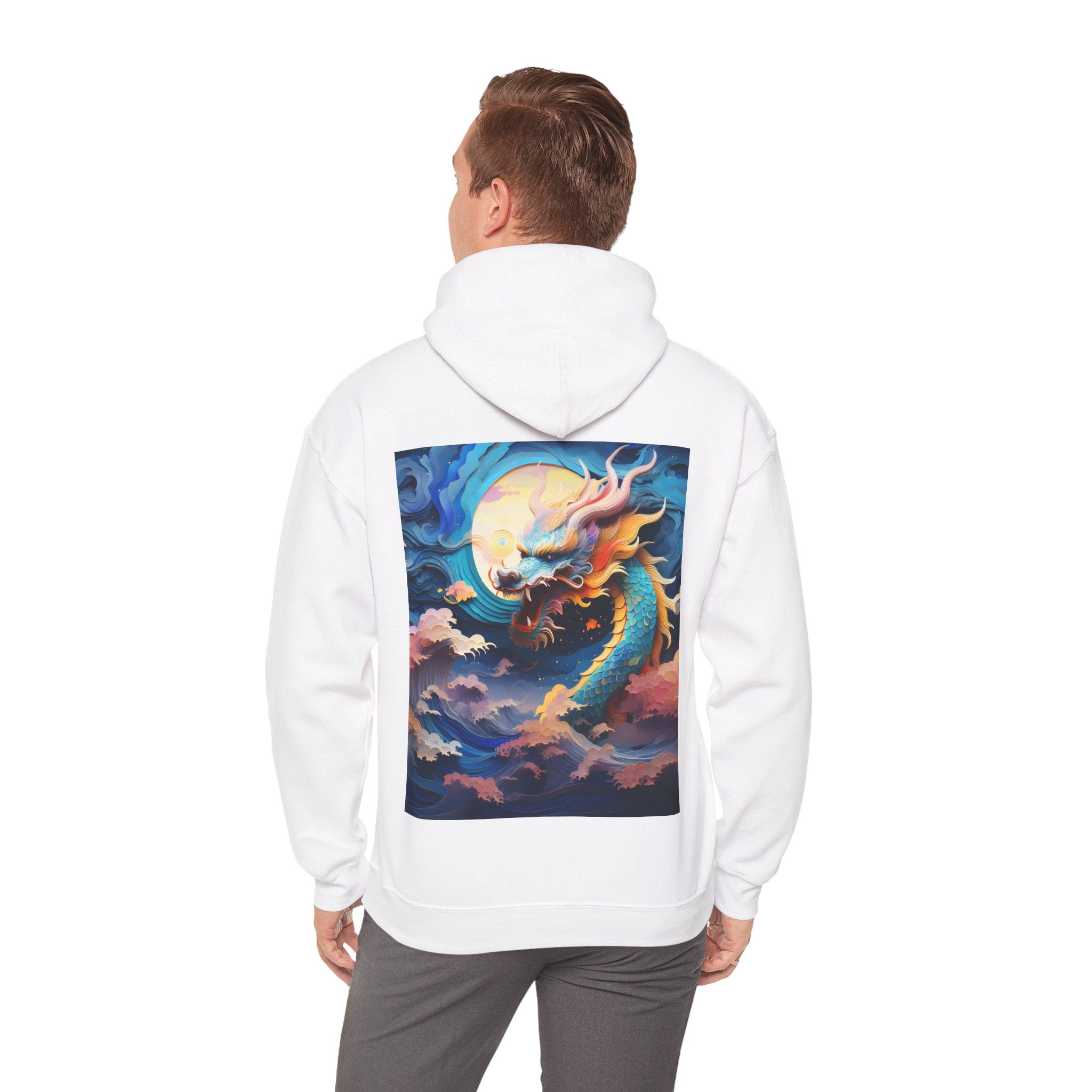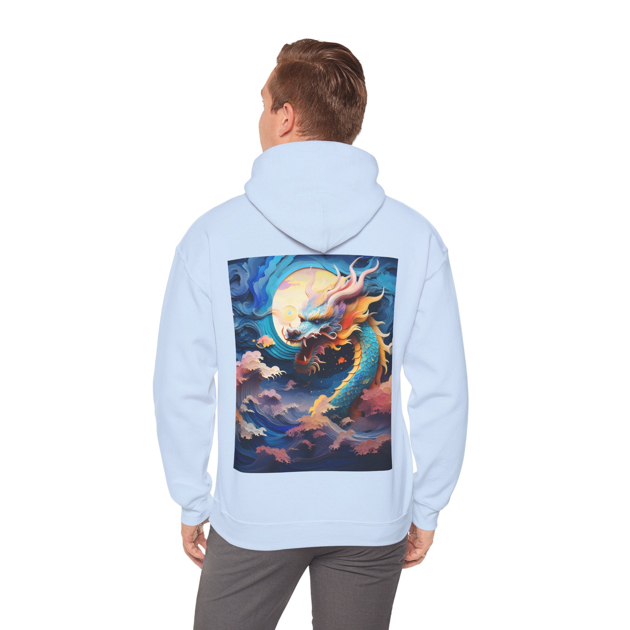 Dragon of the Tempest – Heavy Blend™ Hooded Sweatshirt brings the raw force of a storm and the timeless power of a dragon into one striking design. The artwork shows a mighty dragon soaring through a storm-tossed sky, its scales lit by flashes of light as waves crash and clouds swirl beneath it. Moving as one with the tempest, the creature becomes part of the chaos and the beauty, while a distant sun breaks softly through the storm—symbolizing resilience, renewal, and the ancient bond between nature’s power and mythic legend. The result is a vivid, energetic scene that turns the hoodie into wearable storytelling.