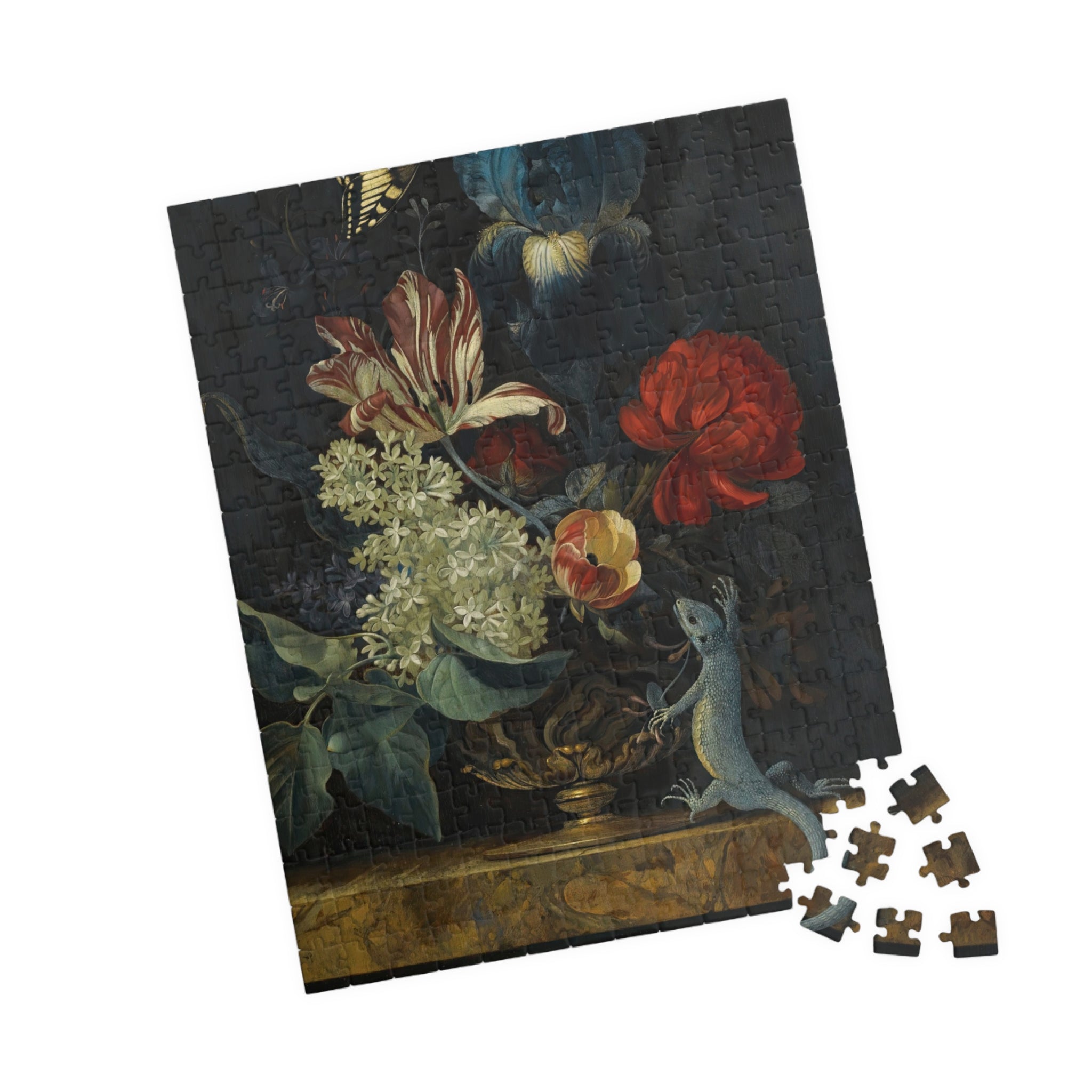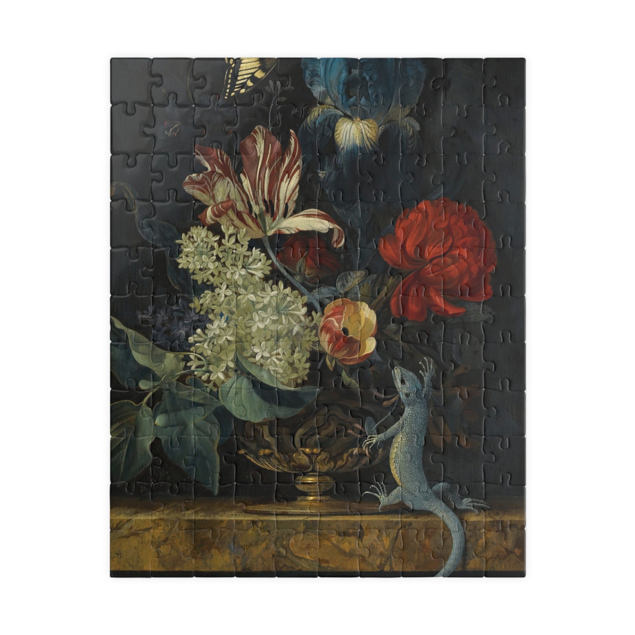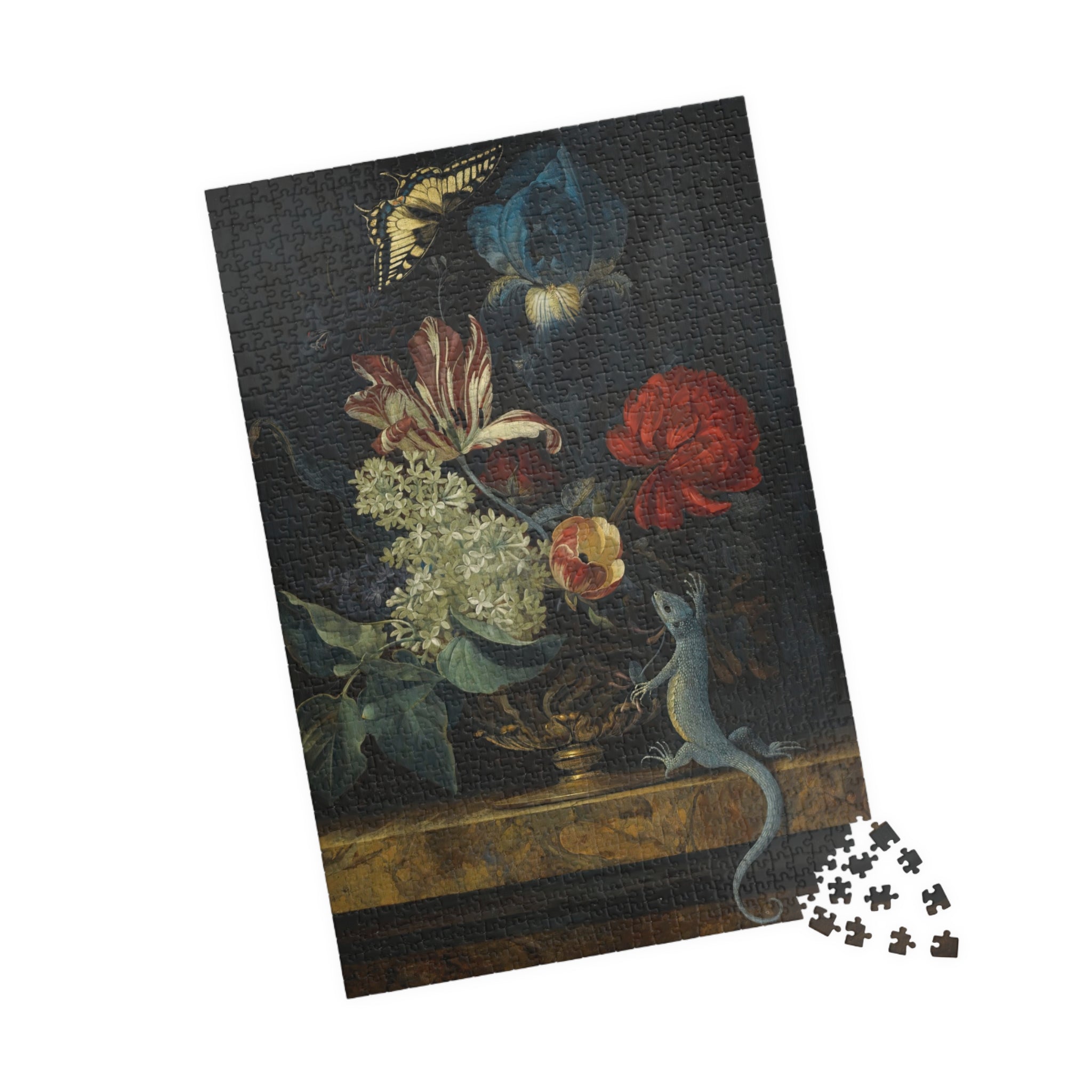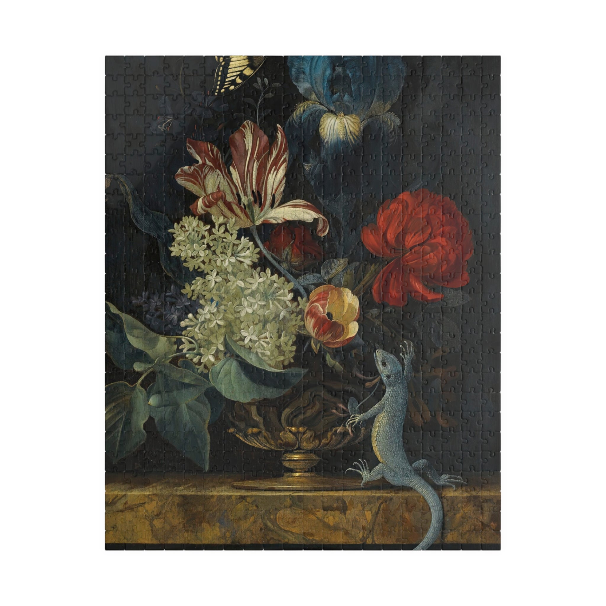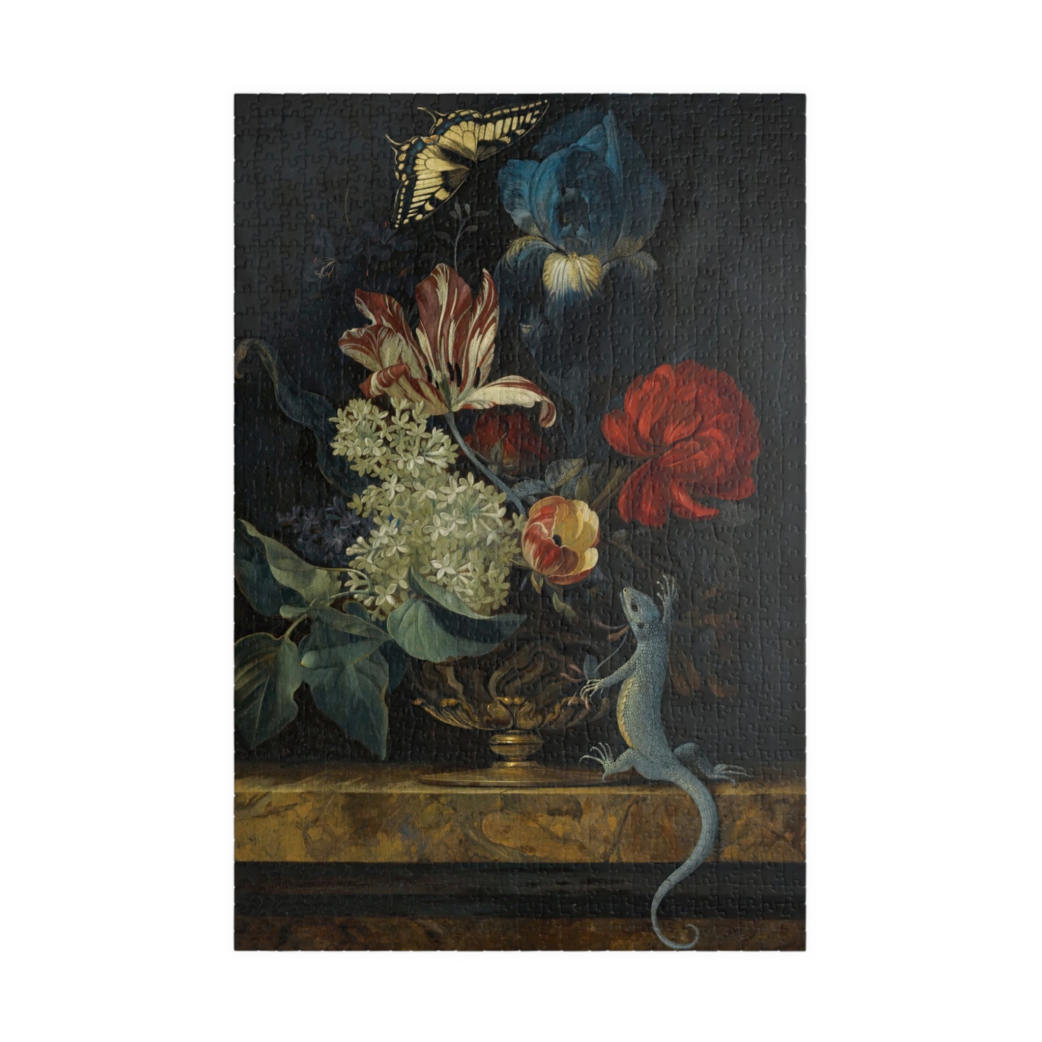 This 110–1014 piece art puzzle brings Willem van Aelst’s Dutch Baroque still life into your hands. Rich tulips, lilies, and irises rise from an ornate vase on polished marble, while a butterfly hovers and a lizard explores the ledge—tiny moments of motion and symbolism captured in luminous detail. The deep, moody backdrop makes the flowers’ colors sing, and the glossy finish highlights the painterly textures and subtle light play. Piecing it together is a quiet, absorbing way to slow down, study the brushwork, and feel the painting’s meditation on beauty and transience. Choose the piece count and orientation that fits your evening: a short, satisfying session or a longer, contemplative build that rewards patience and close looking.