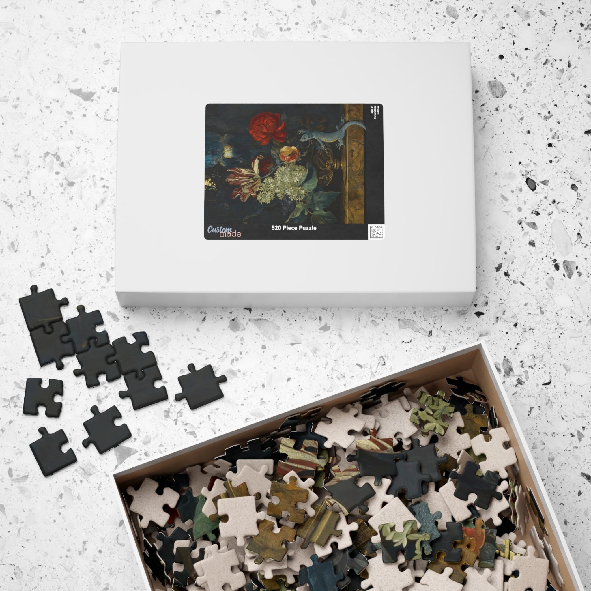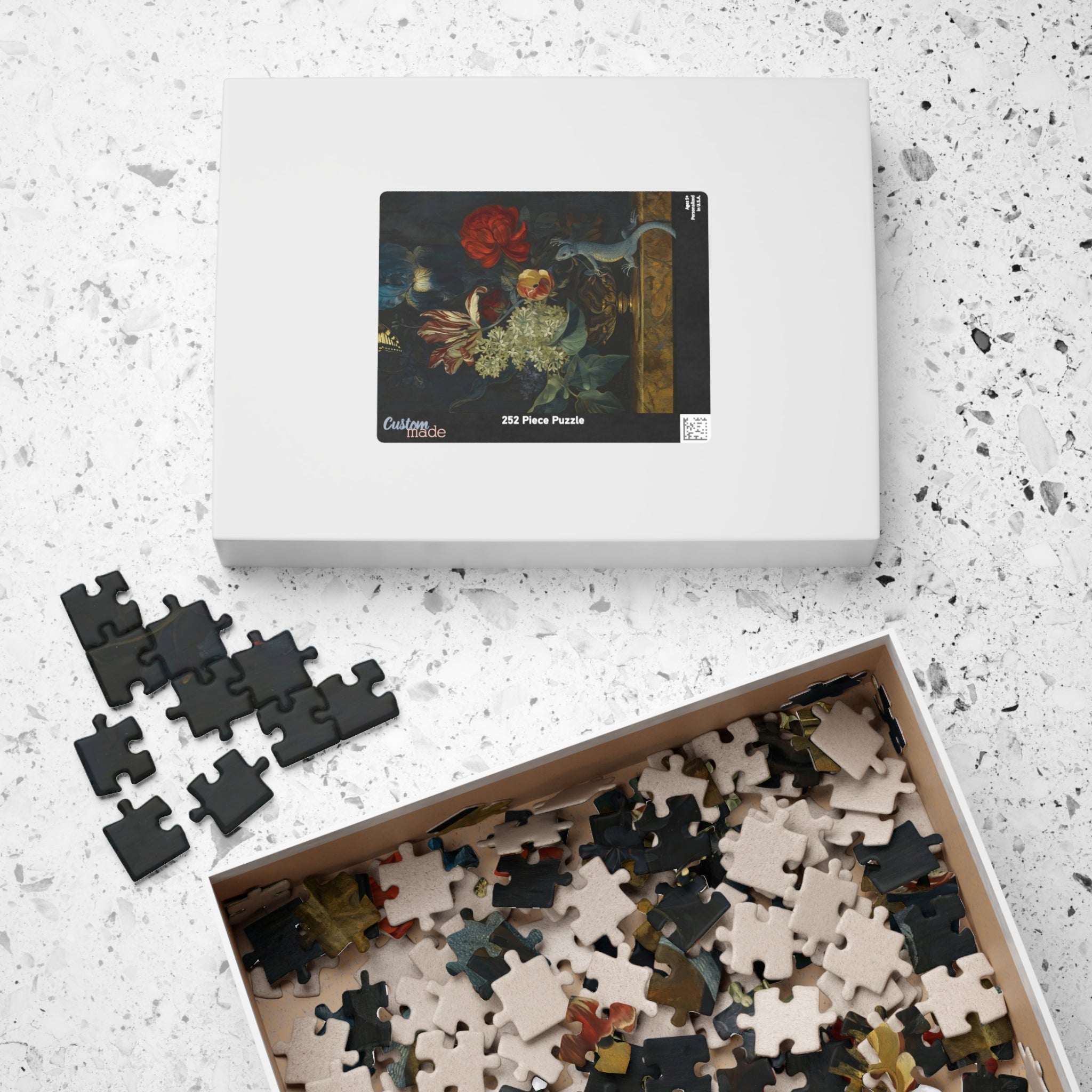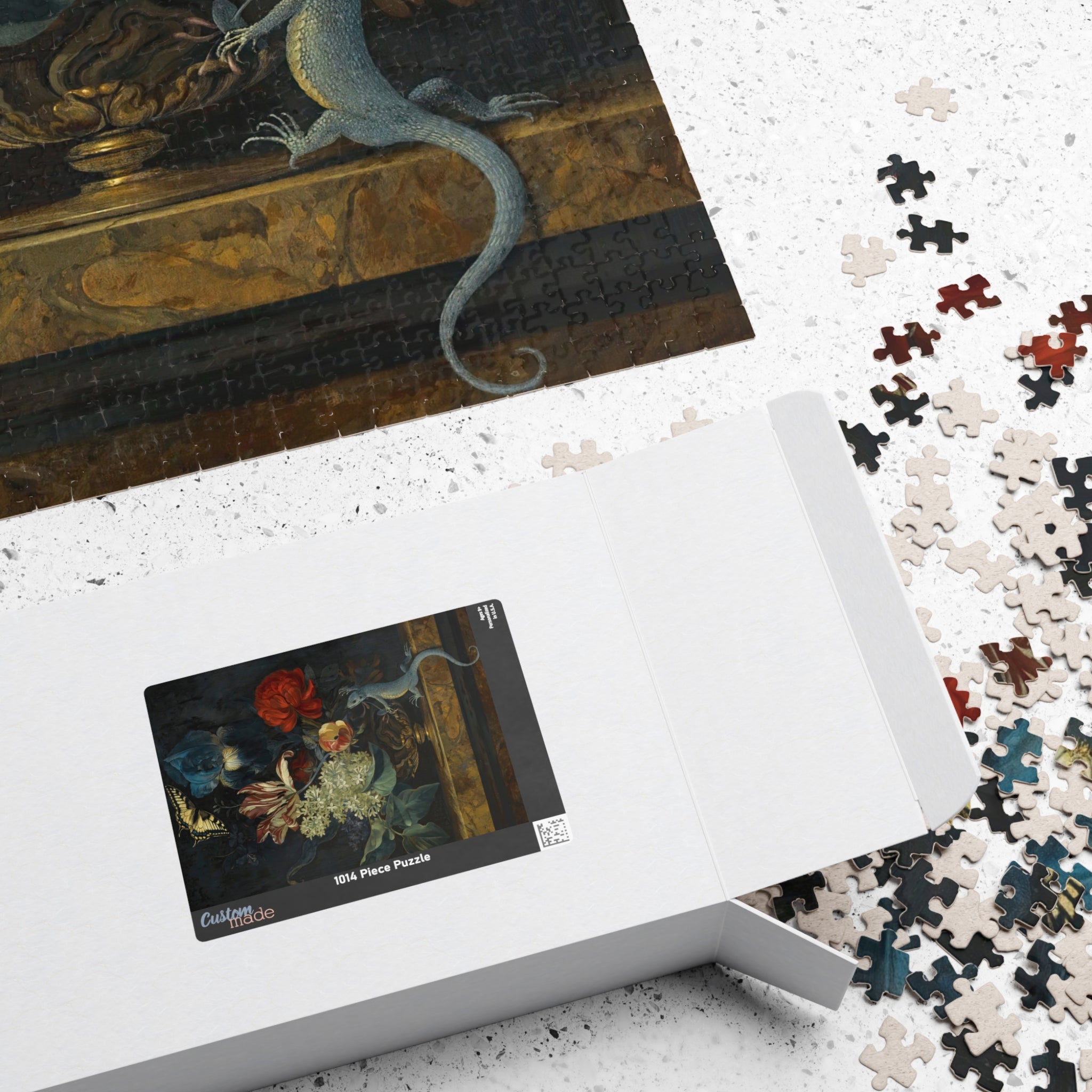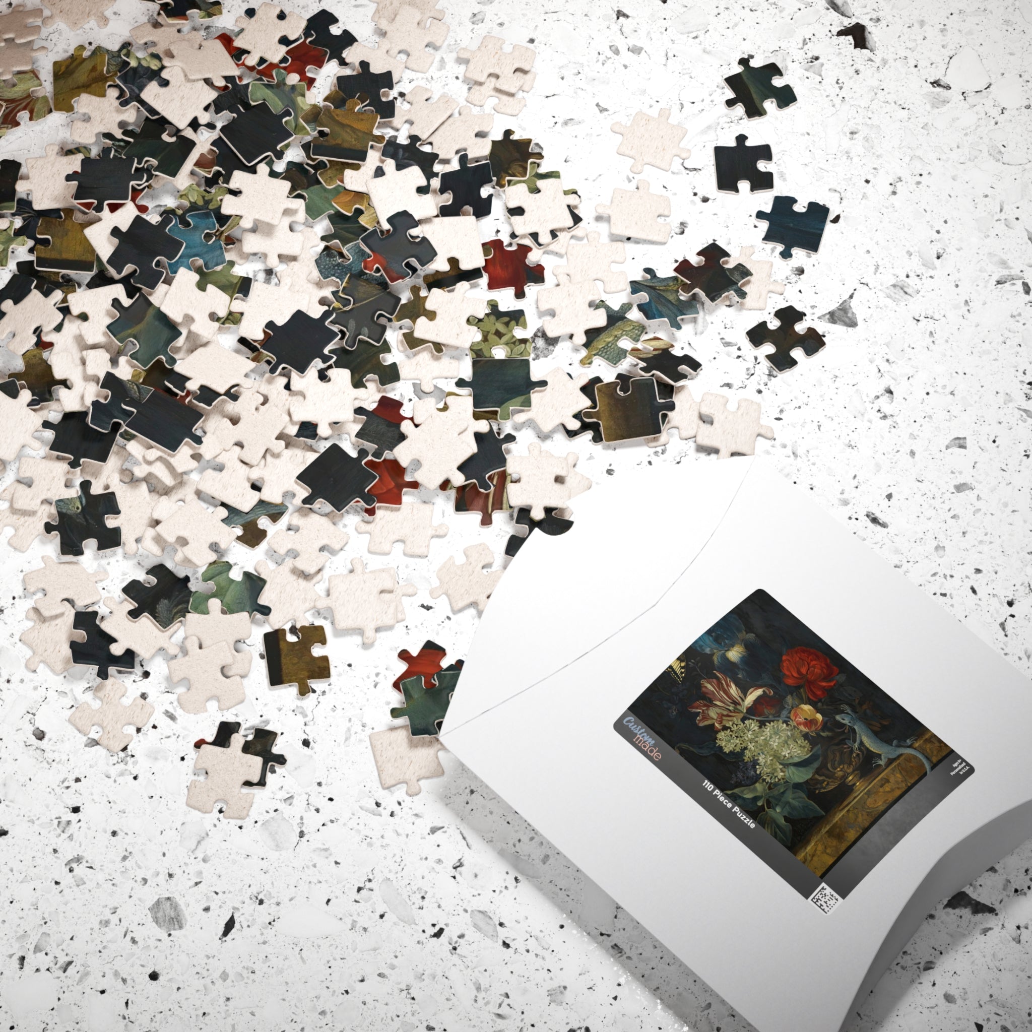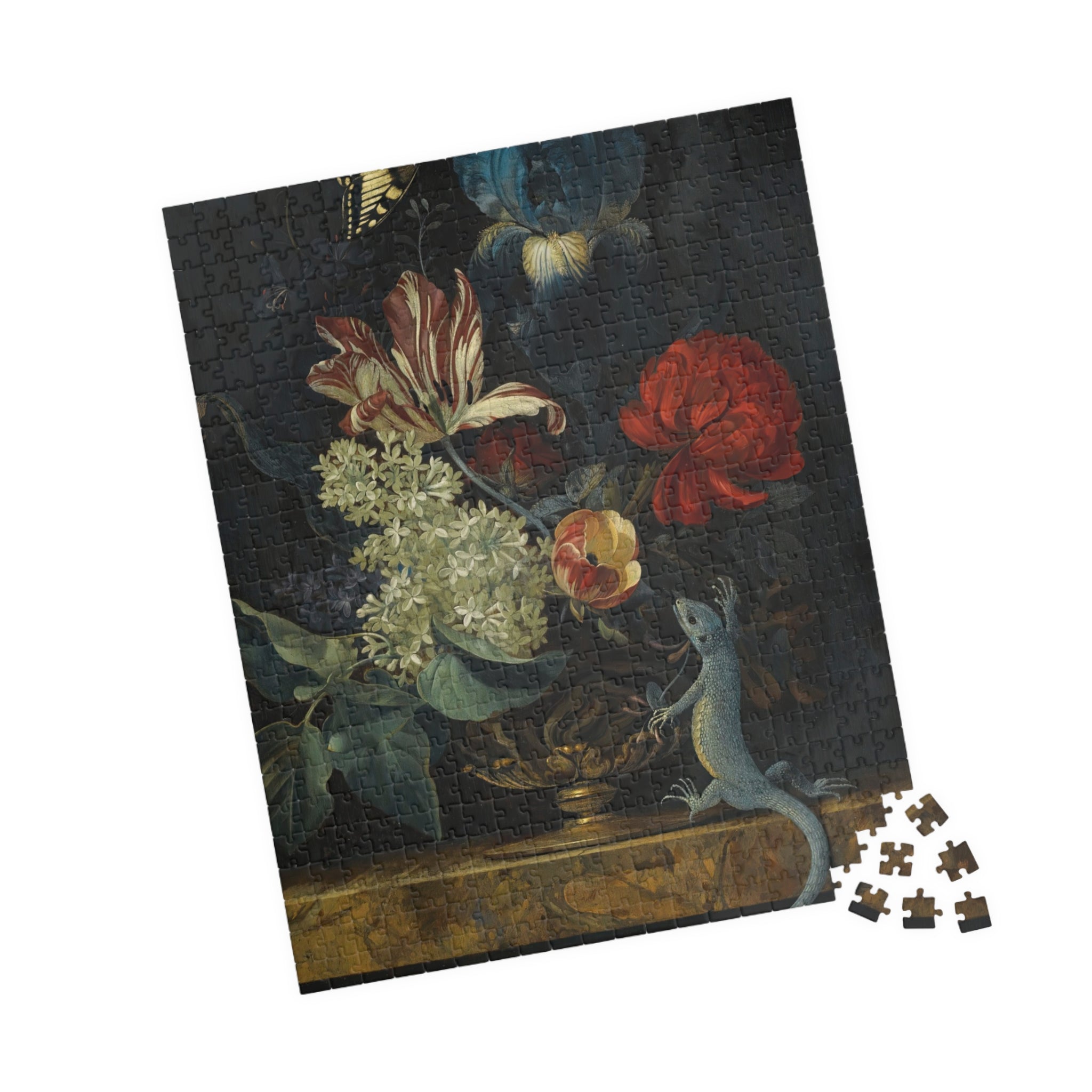 This 110–1014 piece art puzzle brings Willem van Aelst’s Dutch Baroque still life into your hands. Rich tulips, lilies, and irises rise from an ornate vase on polished marble, while a butterfly hovers and a lizard explores the ledge—tiny moments of motion and symbolism captured in luminous detail. The deep, moody backdrop makes the flowers’ colors sing, and the glossy finish highlights the painterly textures and subtle light play. Piecing it together is a quiet, absorbing way to slow down, study the brushwork, and feel the painting’s meditation on beauty and transience. Choose the piece count and orientation that fits your evening: a short, satisfying session or a longer, contemplative build that rewards patience and close looking.