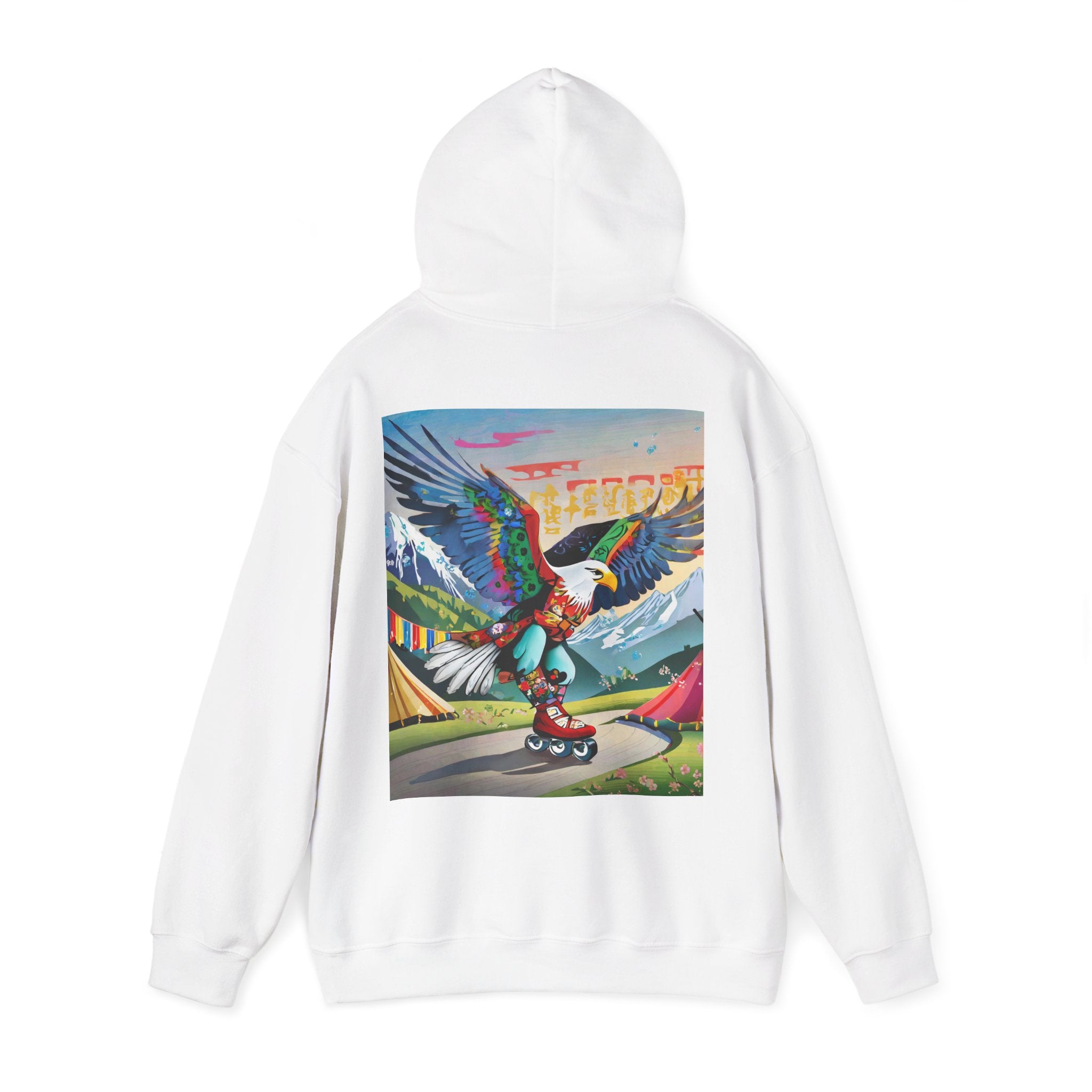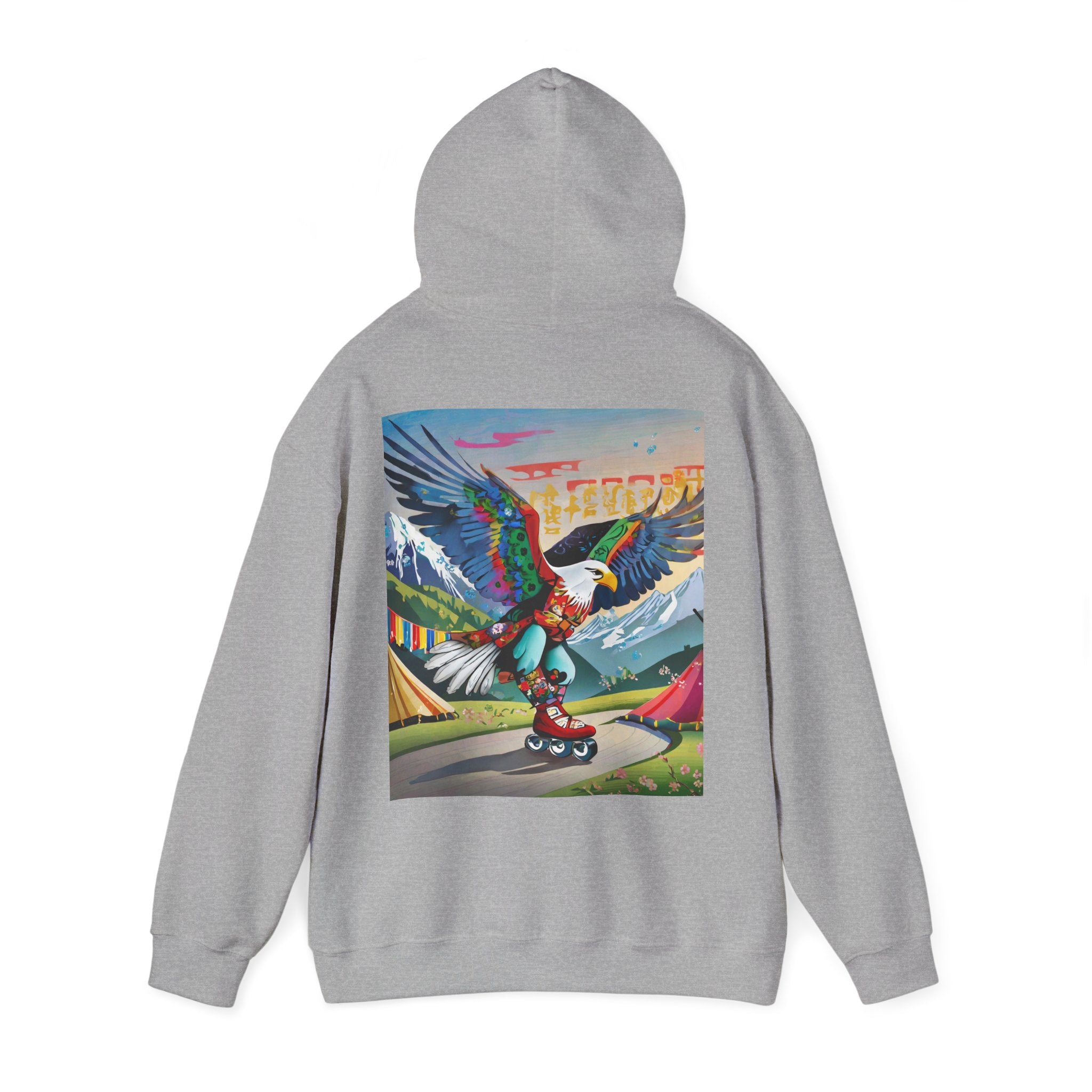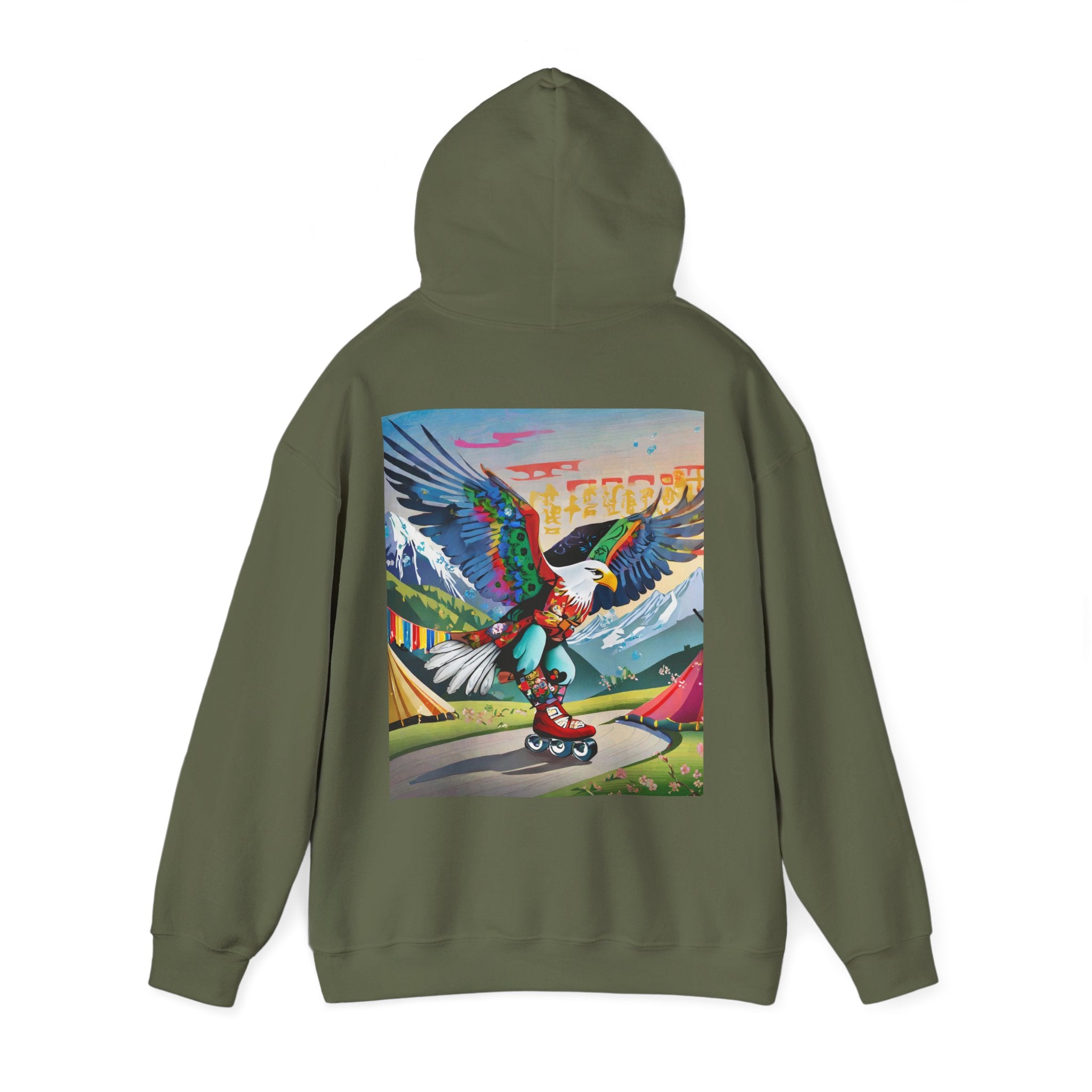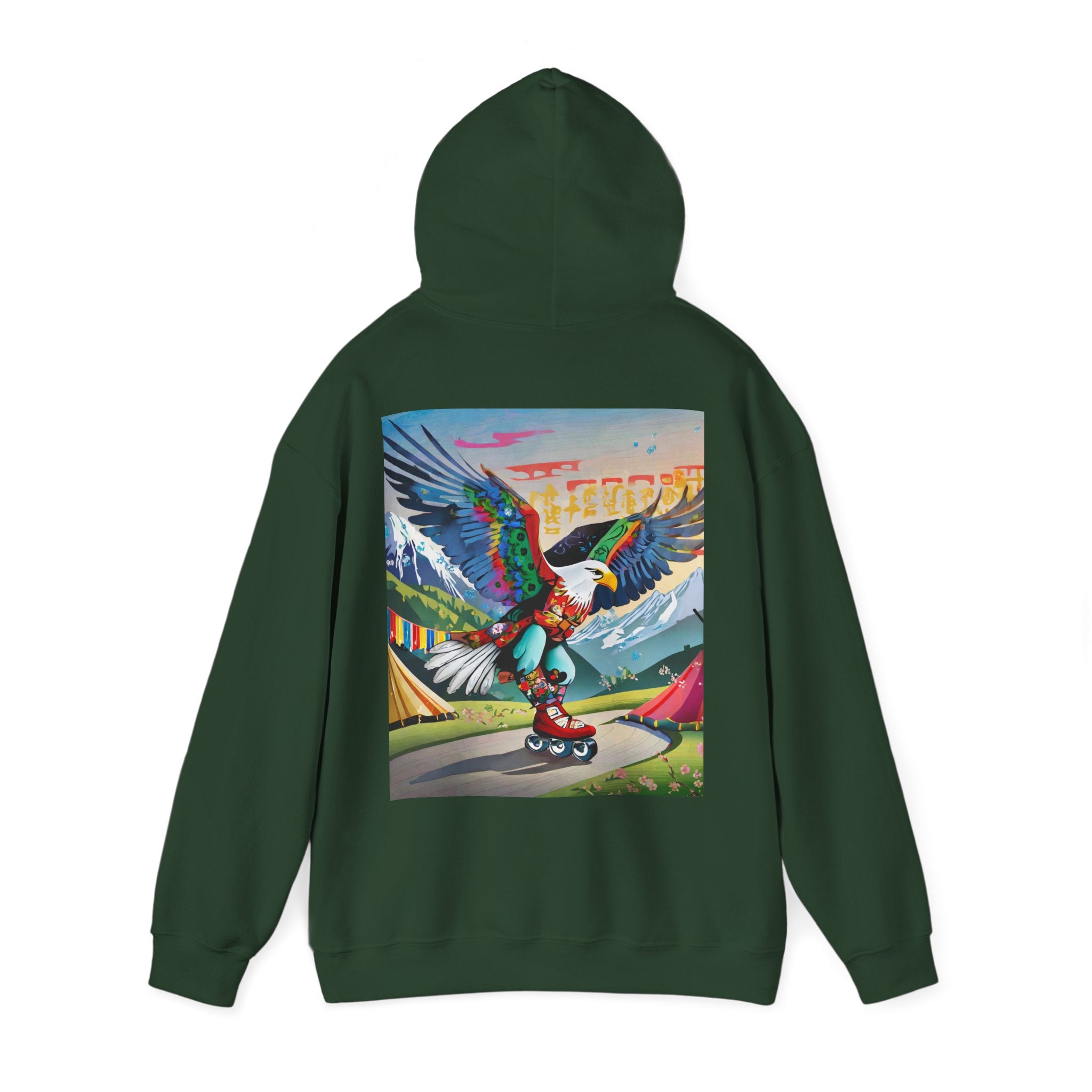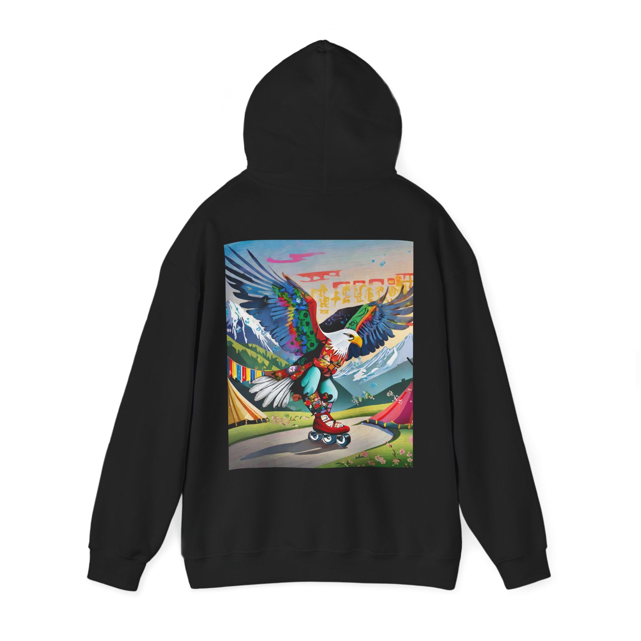 Eagle Skater brings together freedom, color, and motion in a playful, high-energy design. The artwork features a majestic eagle roller-skating through a vibrant mountain landscape, wings spread wide as it glides down a winding path. Painted in bold turquoise, red, and emerald hues, the eagle’s shimmering feathers blend tribal and modern styles, while its bright red skates add a fun, unexpected touch.