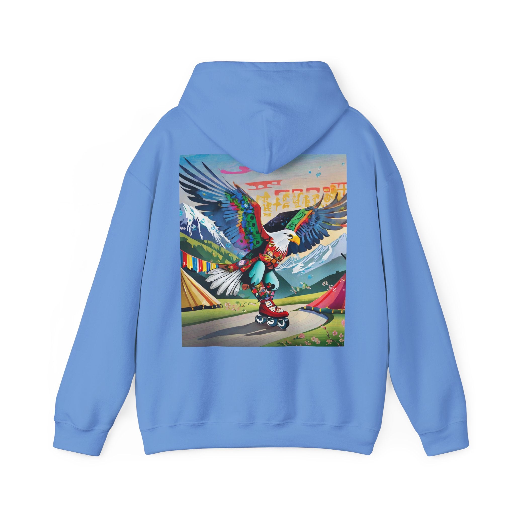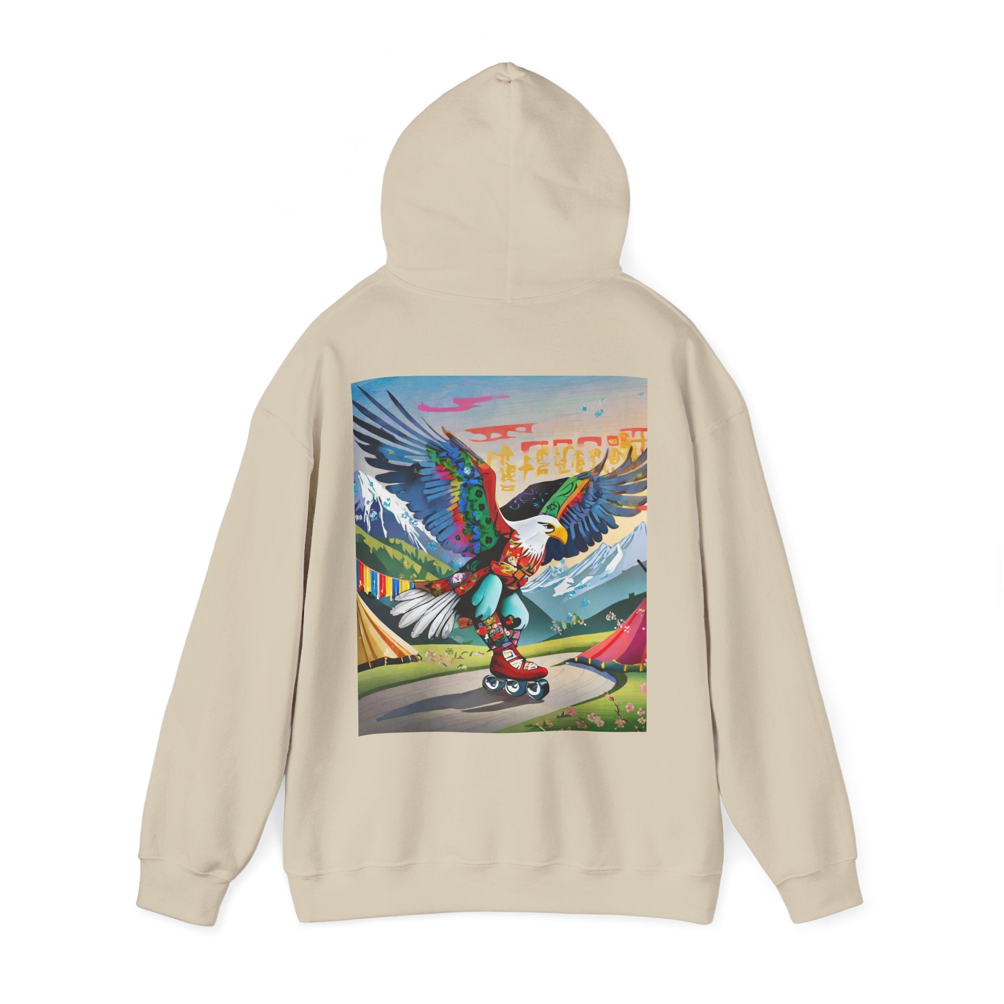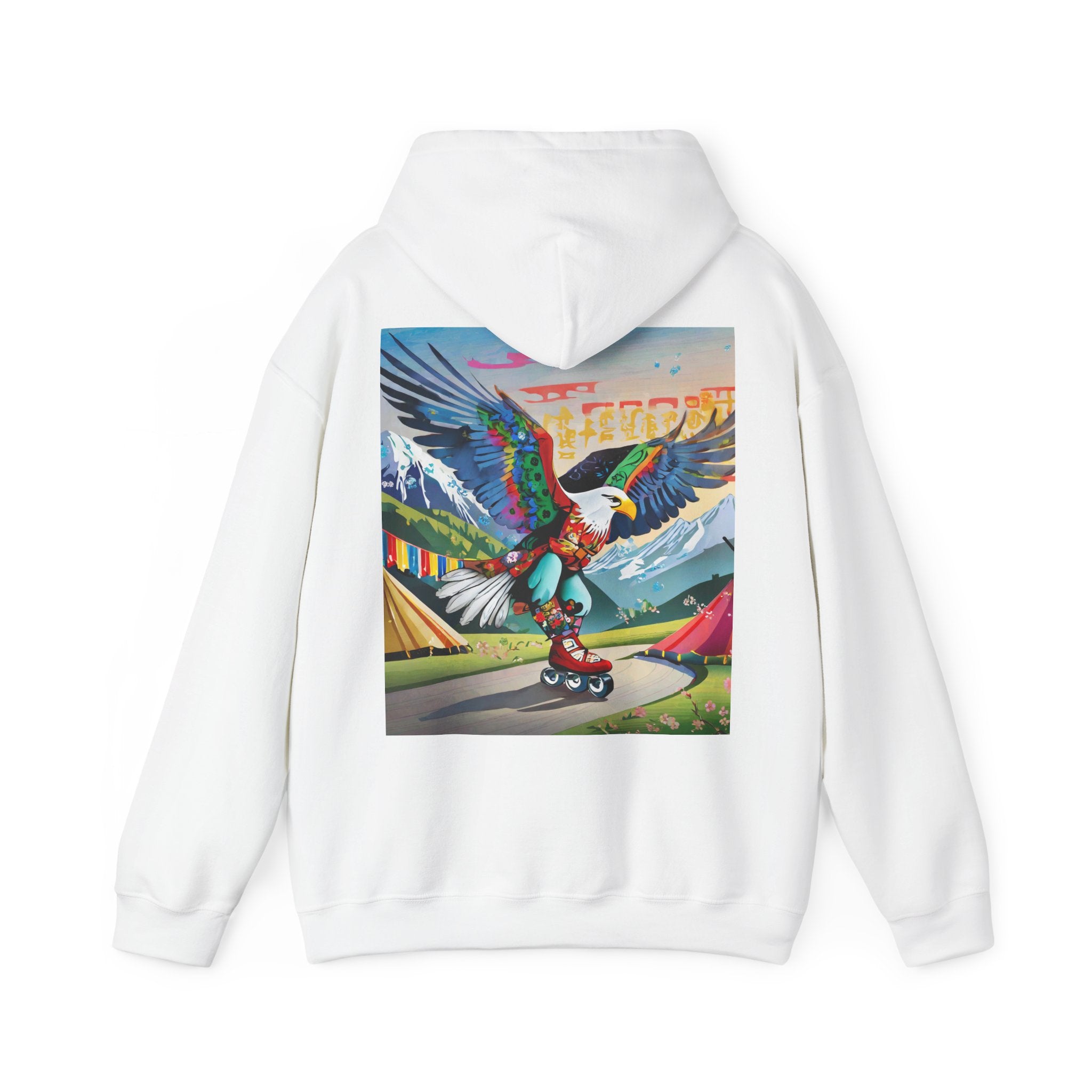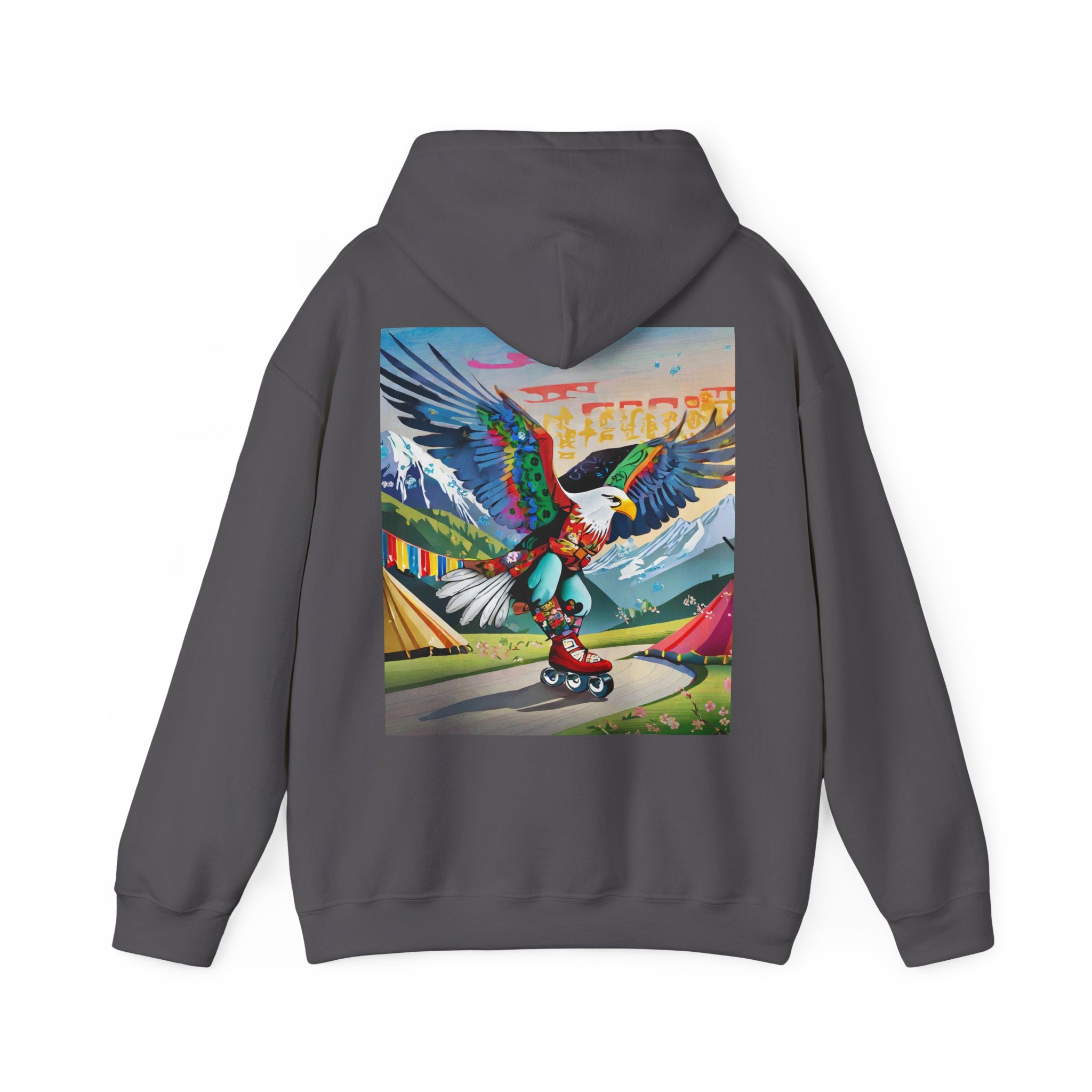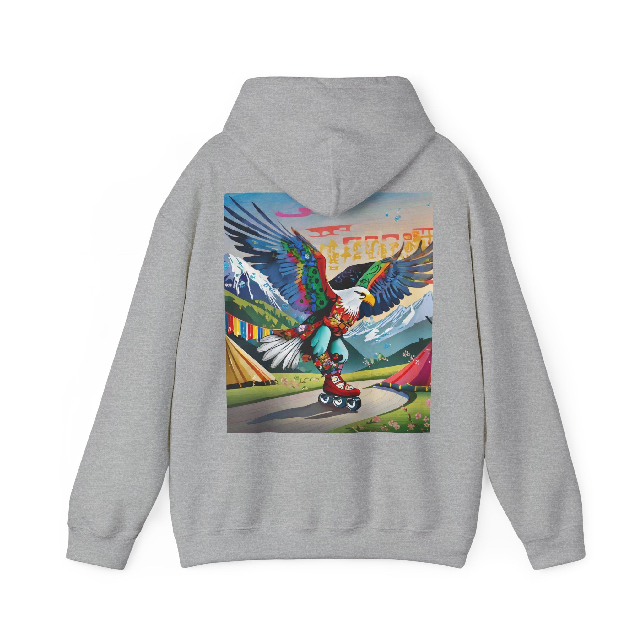 Eagle Skater brings together freedom, color, and motion in a playful, high-energy design. The artwork features a majestic eagle roller-skating through a vibrant mountain landscape, wings spread wide as it glides down a winding path. Painted in bold turquoise, red, and emerald hues, the eagle’s shimmering feathers blend tribal and modern styles, while its bright red skates add a fun, unexpected touch.