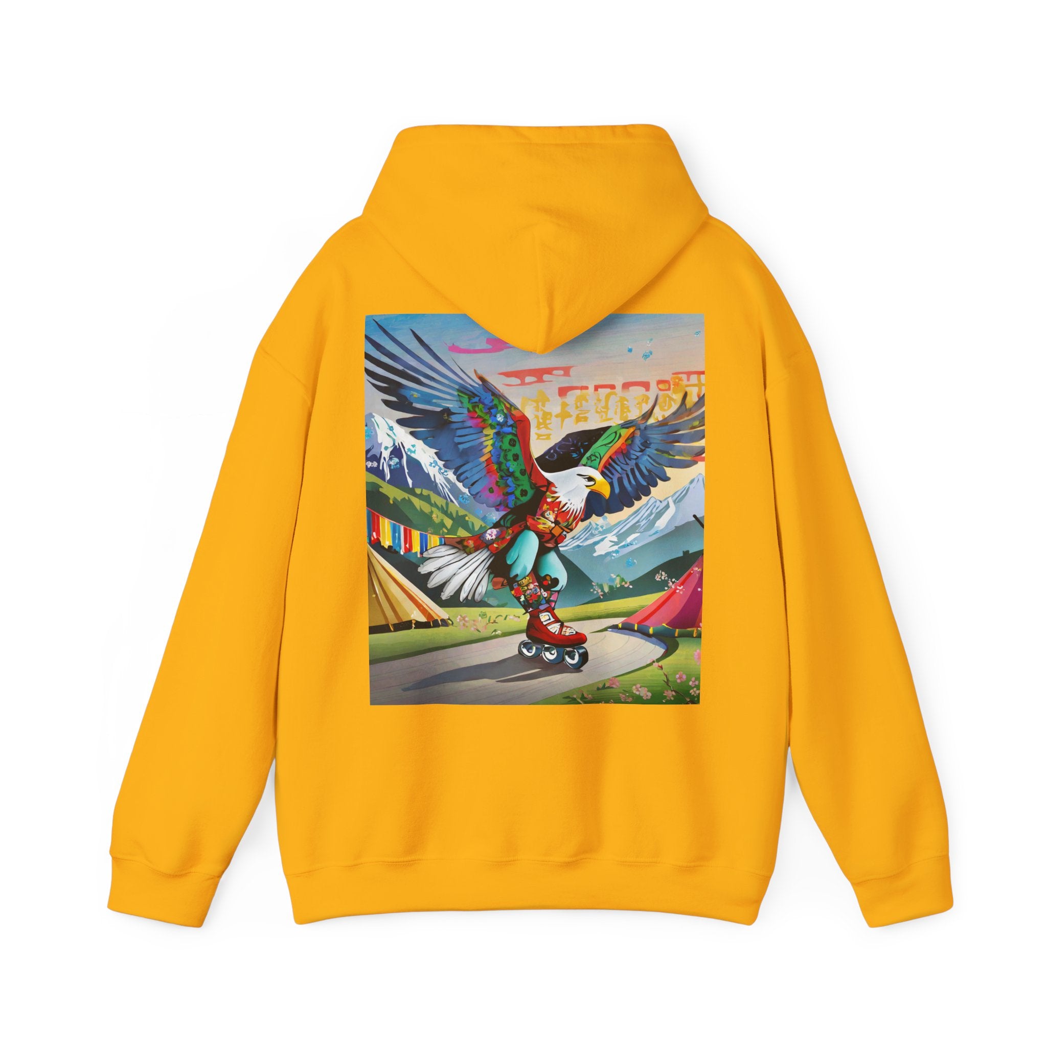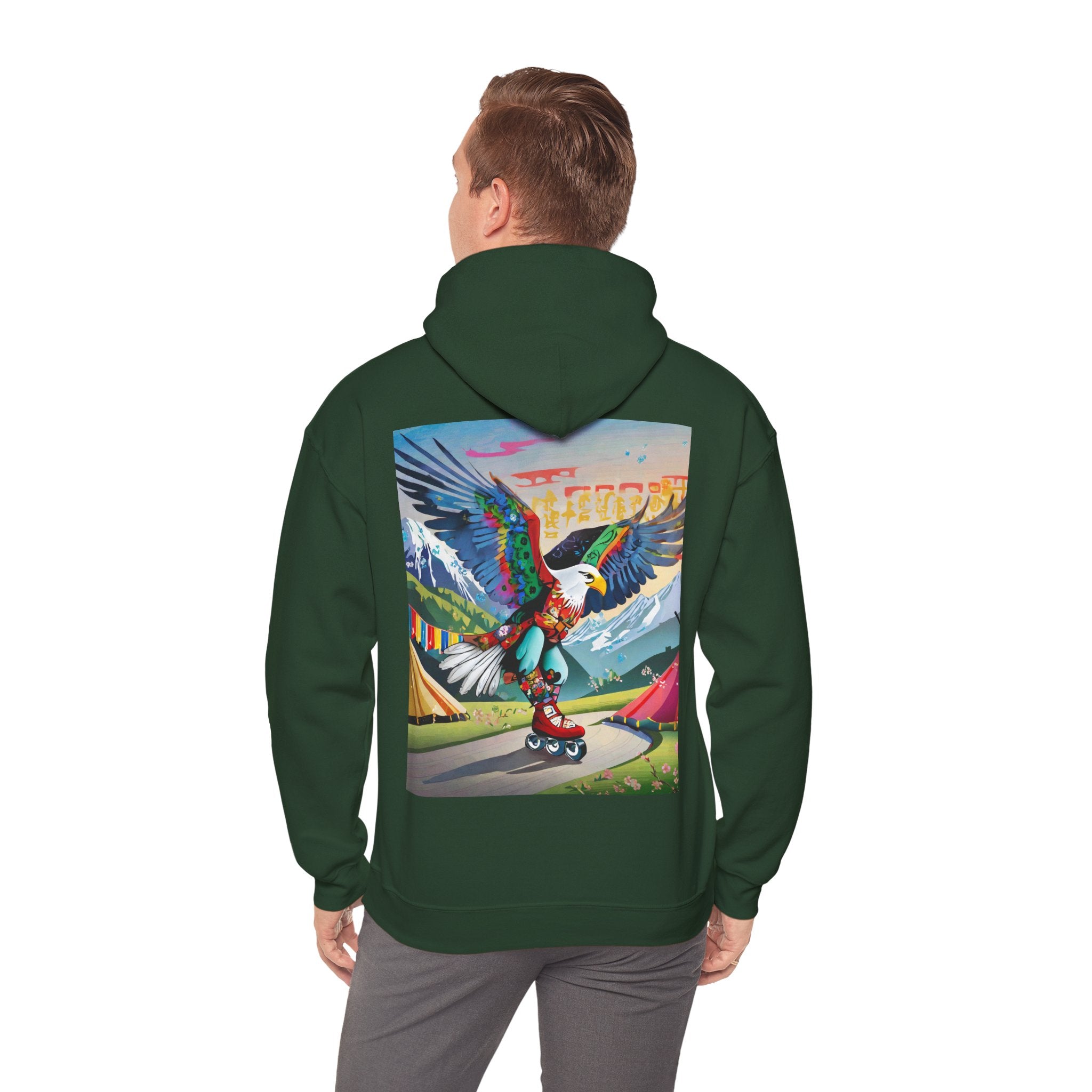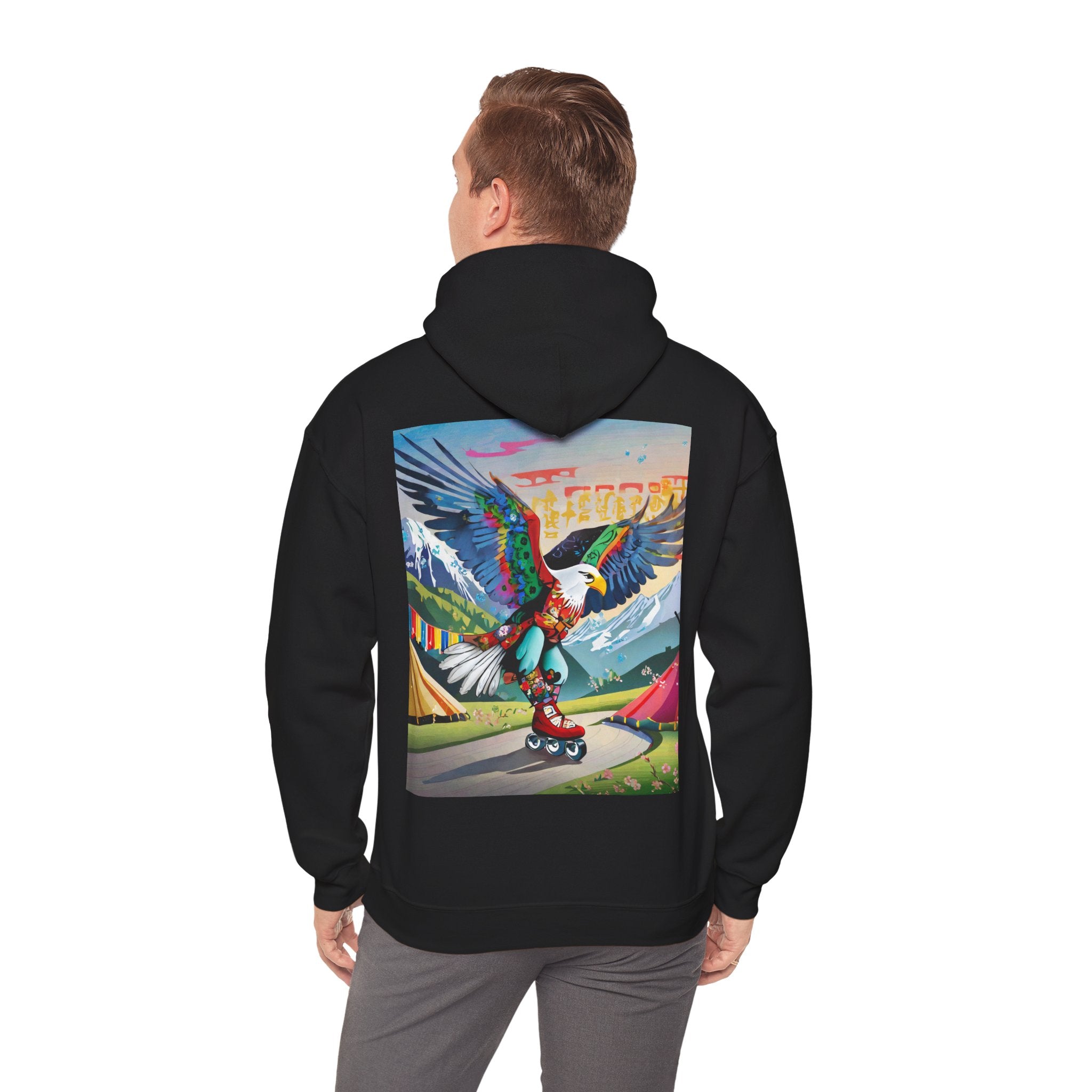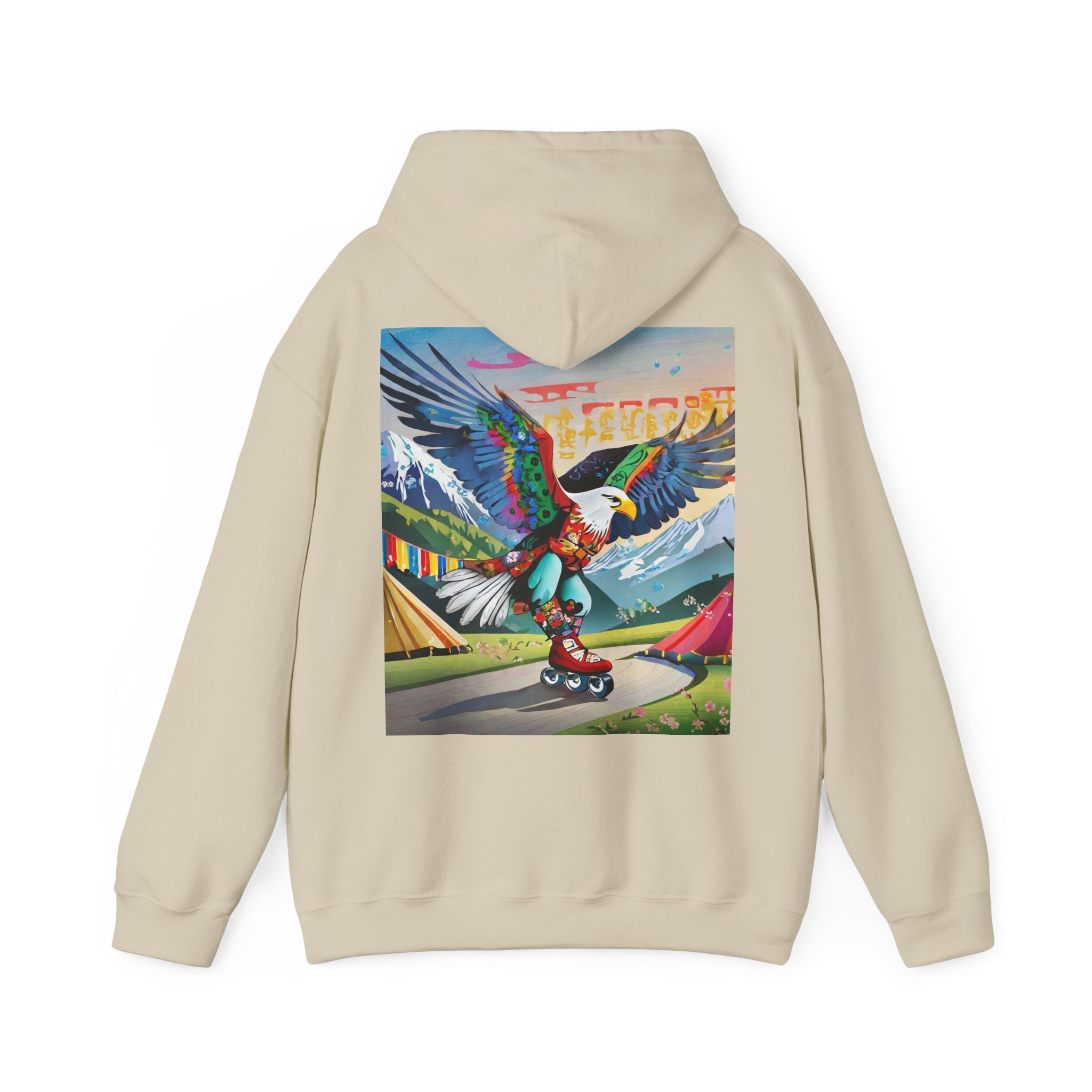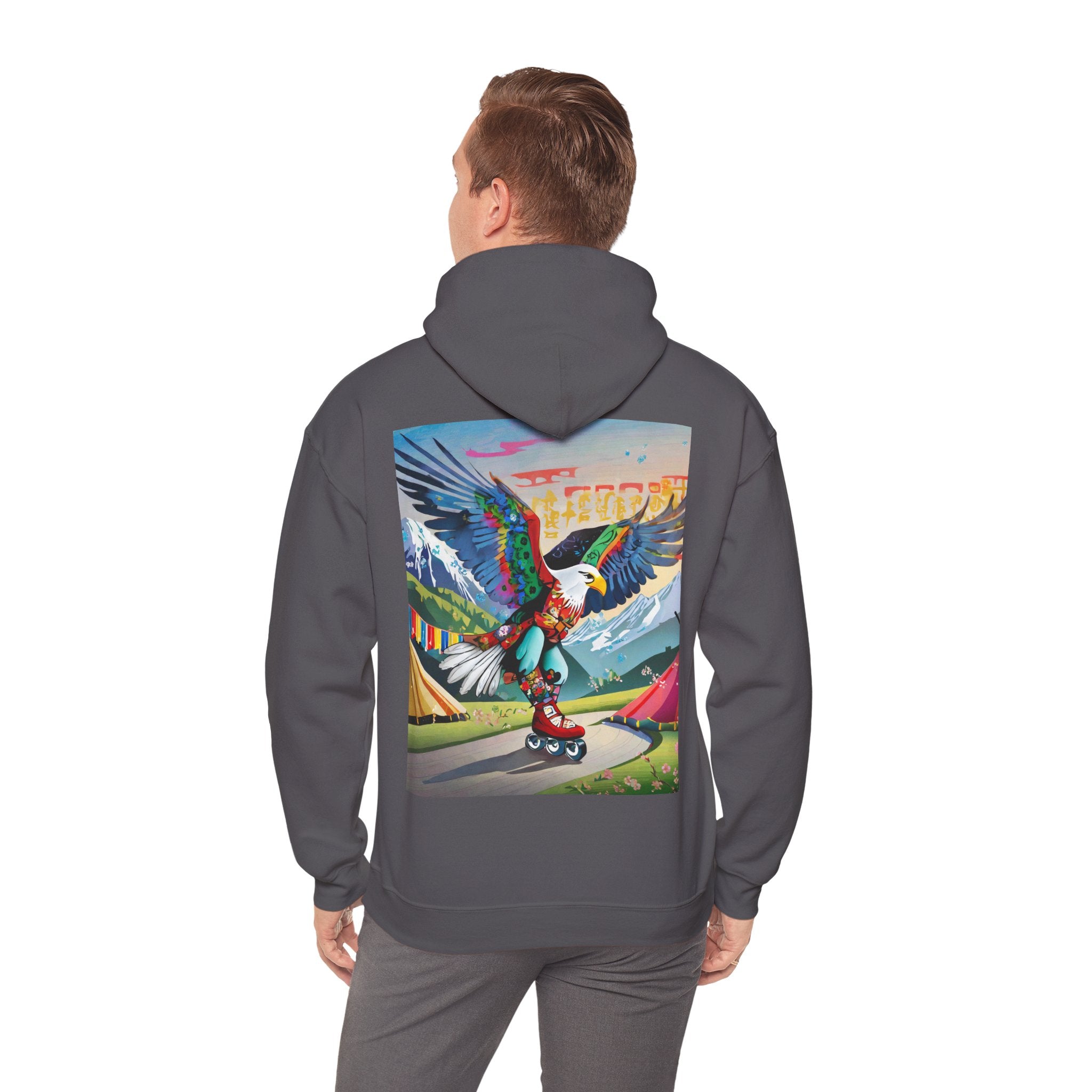 Eagle Skater brings together freedom, color, and motion in a playful, high-energy design. The artwork features a majestic eagle roller-skating through a vibrant mountain landscape, wings spread wide as it glides down a winding path. Painted in bold turquoise, red, and emerald hues, the eagle’s shimmering feathers blend tribal and modern styles, while its bright red skates add a fun, unexpected touch.