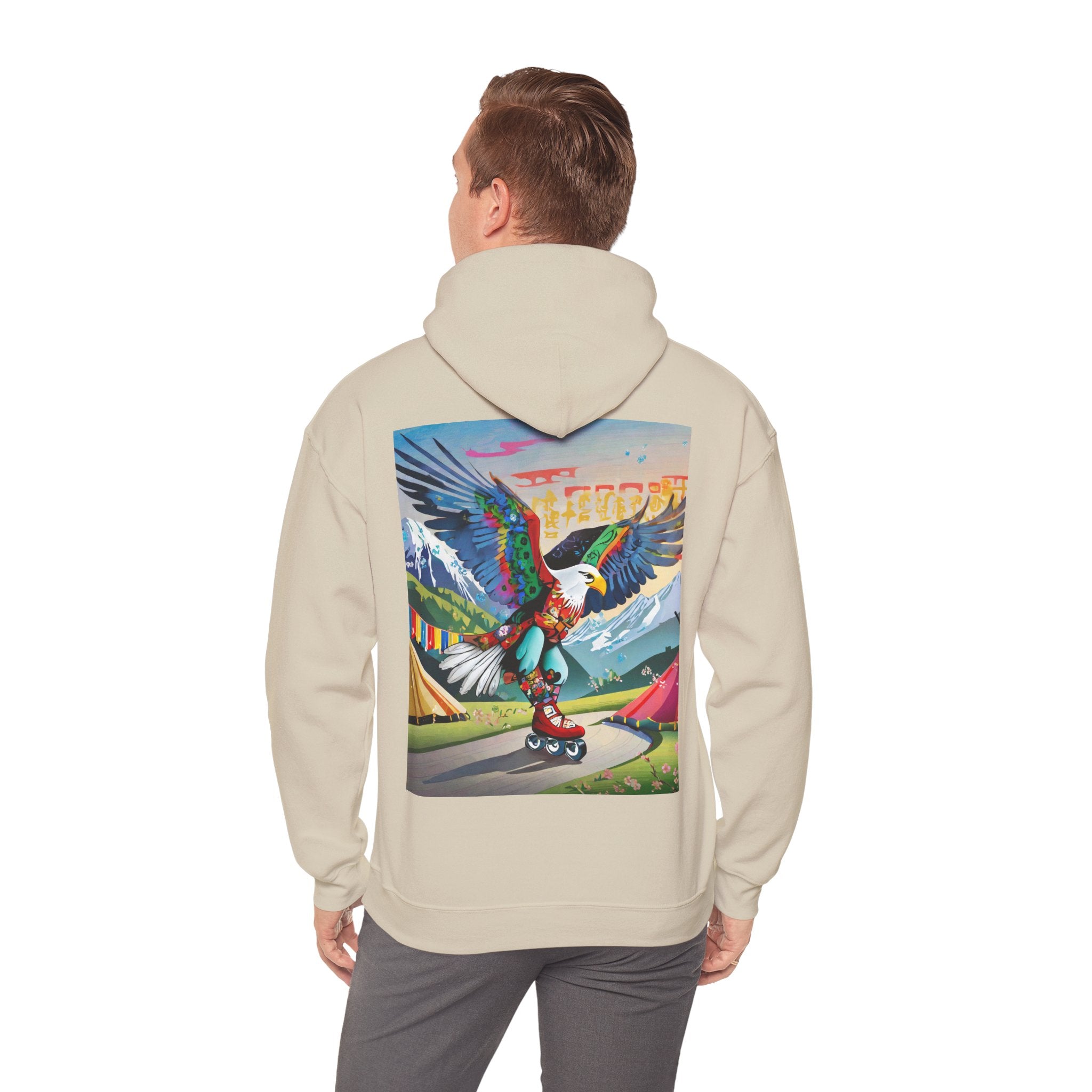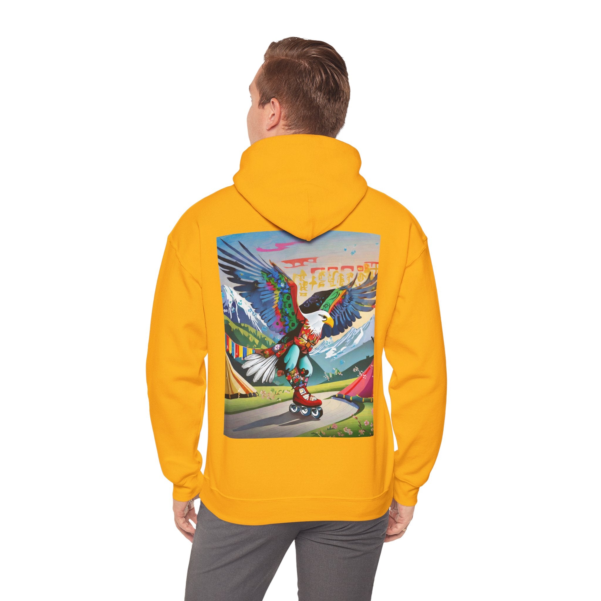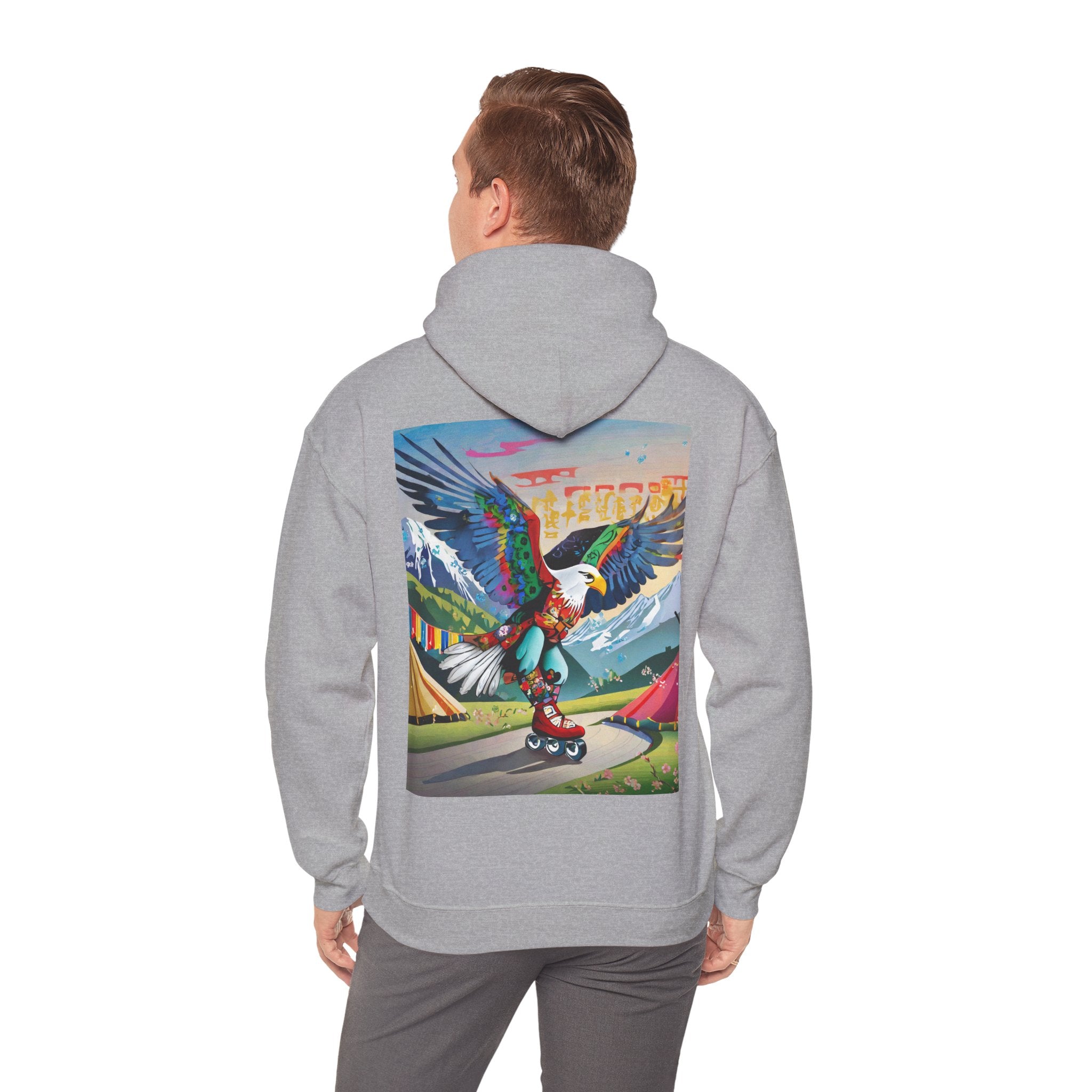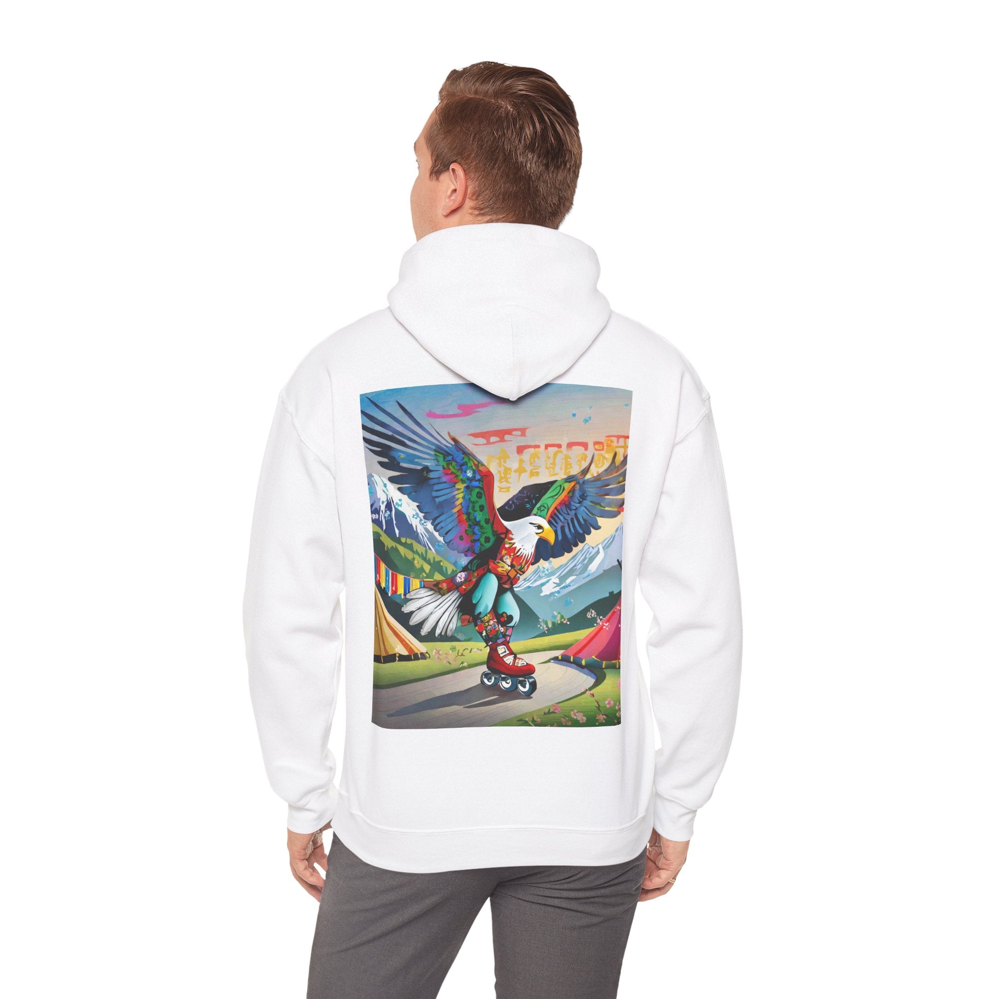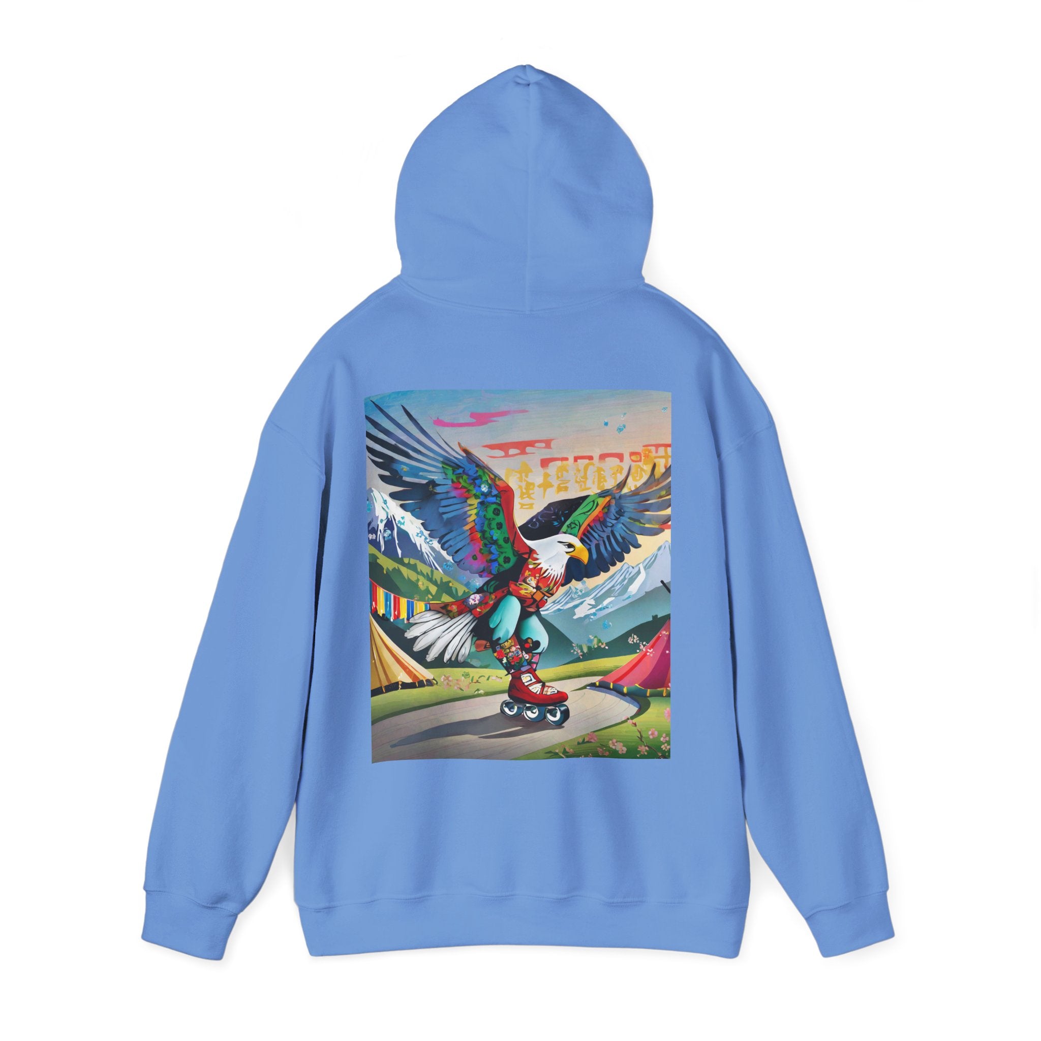 Eagle Skater brings together freedom, color, and motion in a playful, high-energy design. The artwork features a majestic eagle roller-skating through a vibrant mountain landscape, wings spread wide as it glides down a winding path. Painted in bold turquoise, red, and emerald hues, the eagle’s shimmering feathers blend tribal and modern styles, while its bright red skates add a fun, unexpected touch.
