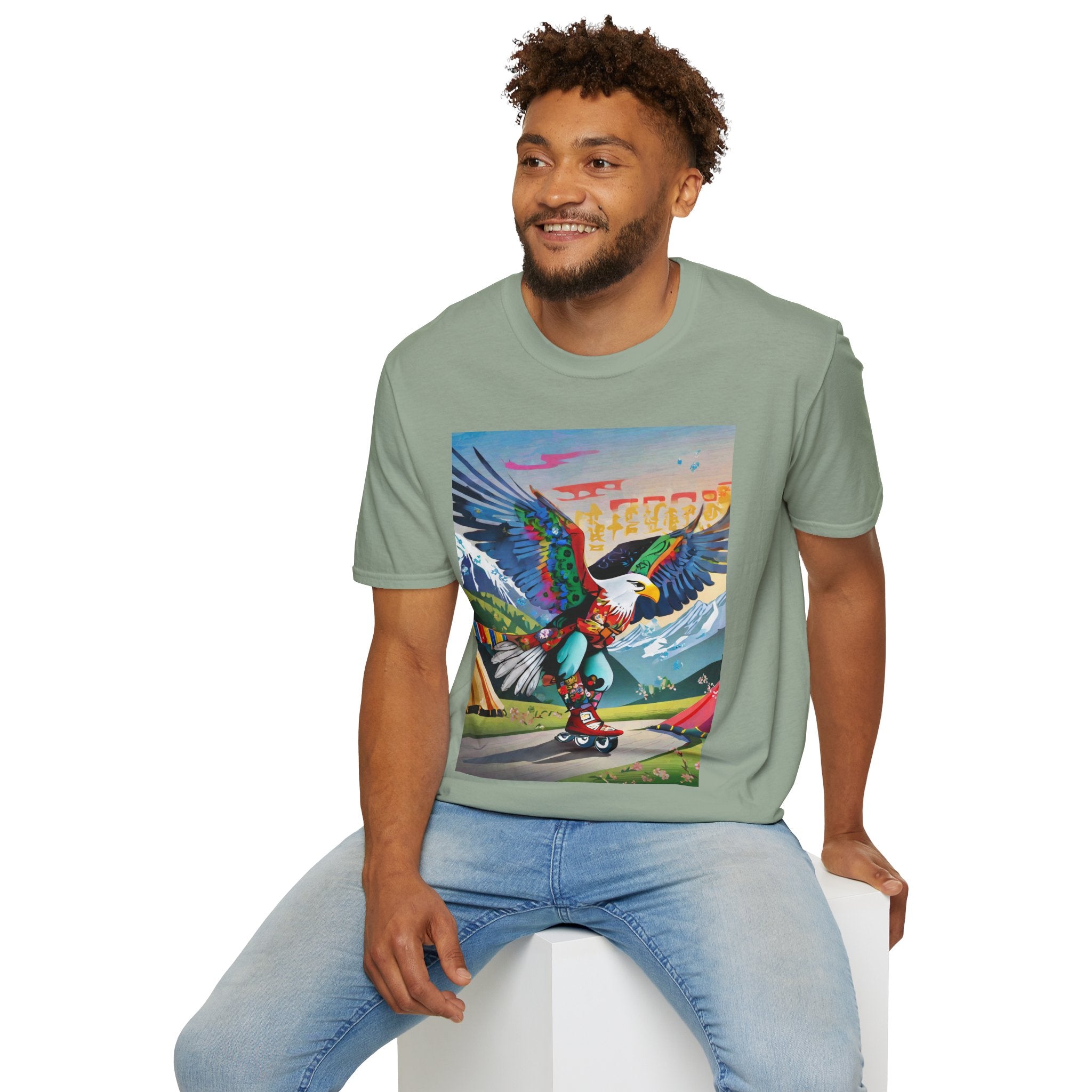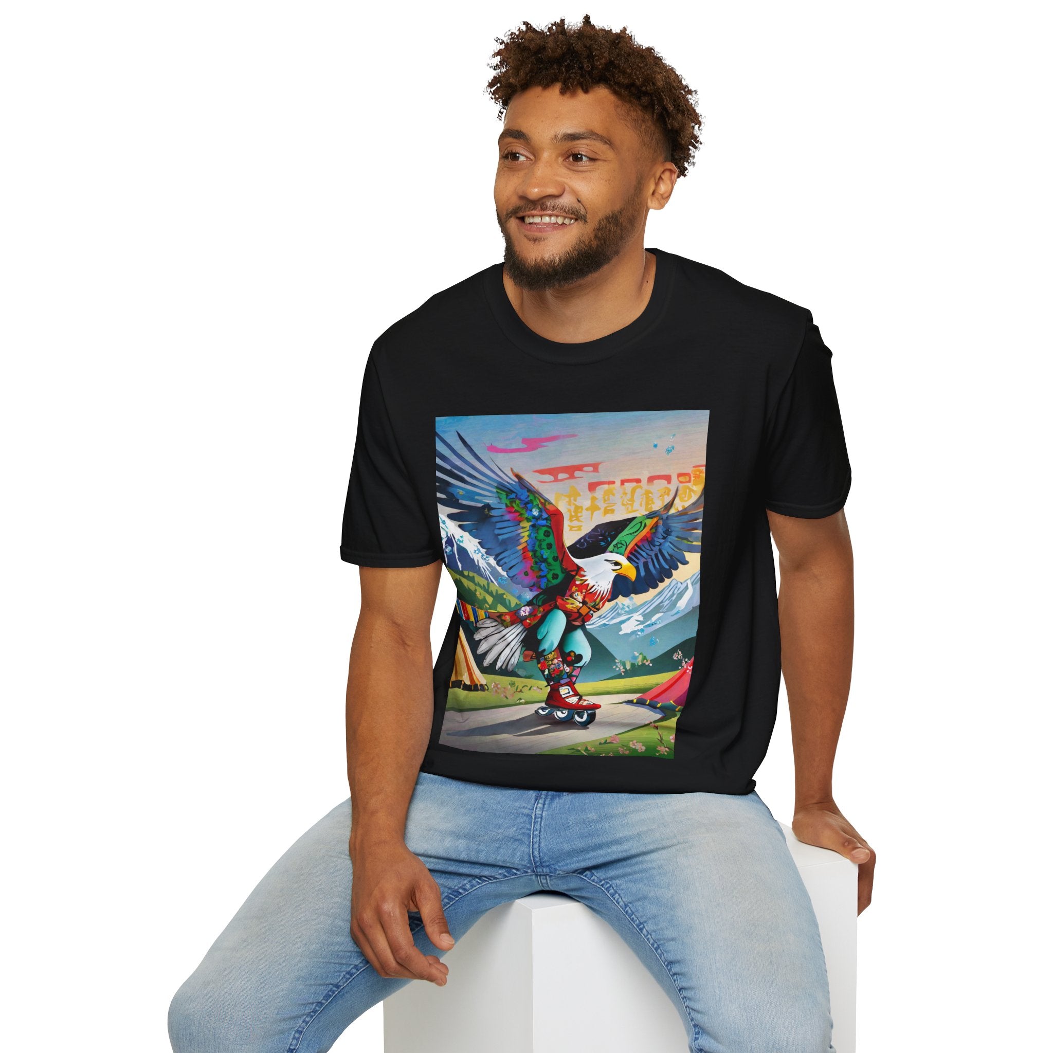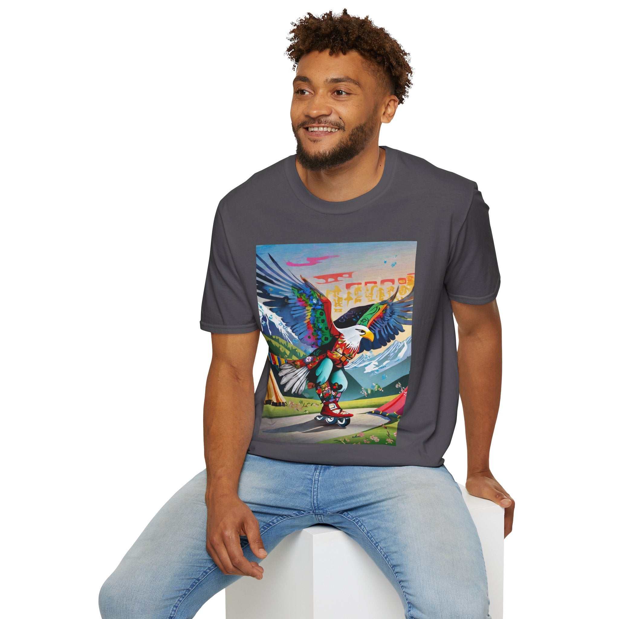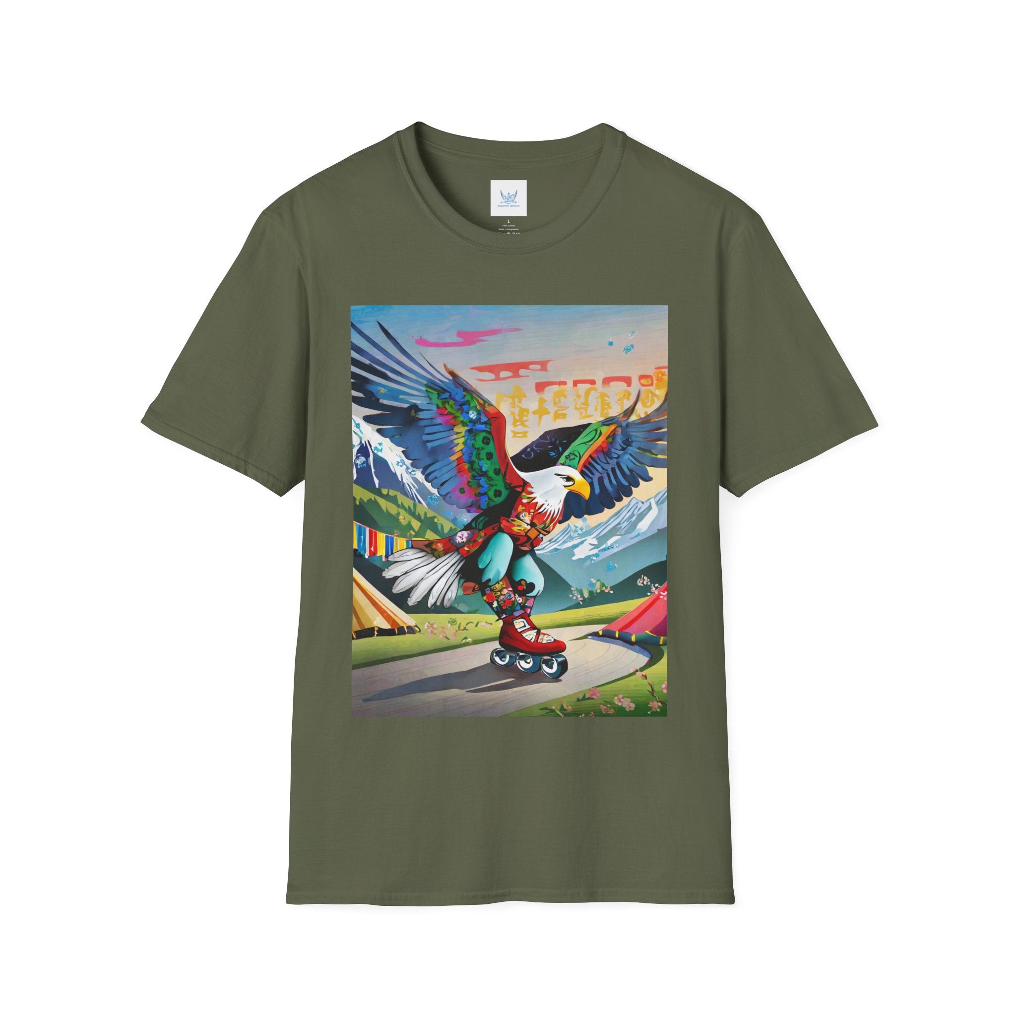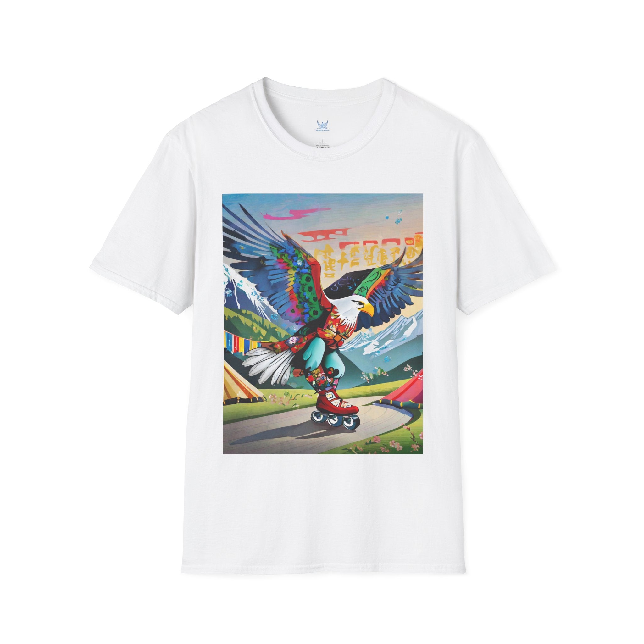 Eagle Skater Softstyle T-Shirt combines comfort, quality, and playful artistry in one standout piece. Made from the premium Gildan Softstyle® 64000 fabric, this shirt features a modern cut and a luxuriously soft texture perfect for everyday wear. Solid colors are crafted from 100% cotton, while heathers and sport grey incorporate polyester blends for added durability. Reinforced shoulders, a seamless design, and a ribbed-knit collar ensure long-lasting comfort and a smooth fit.