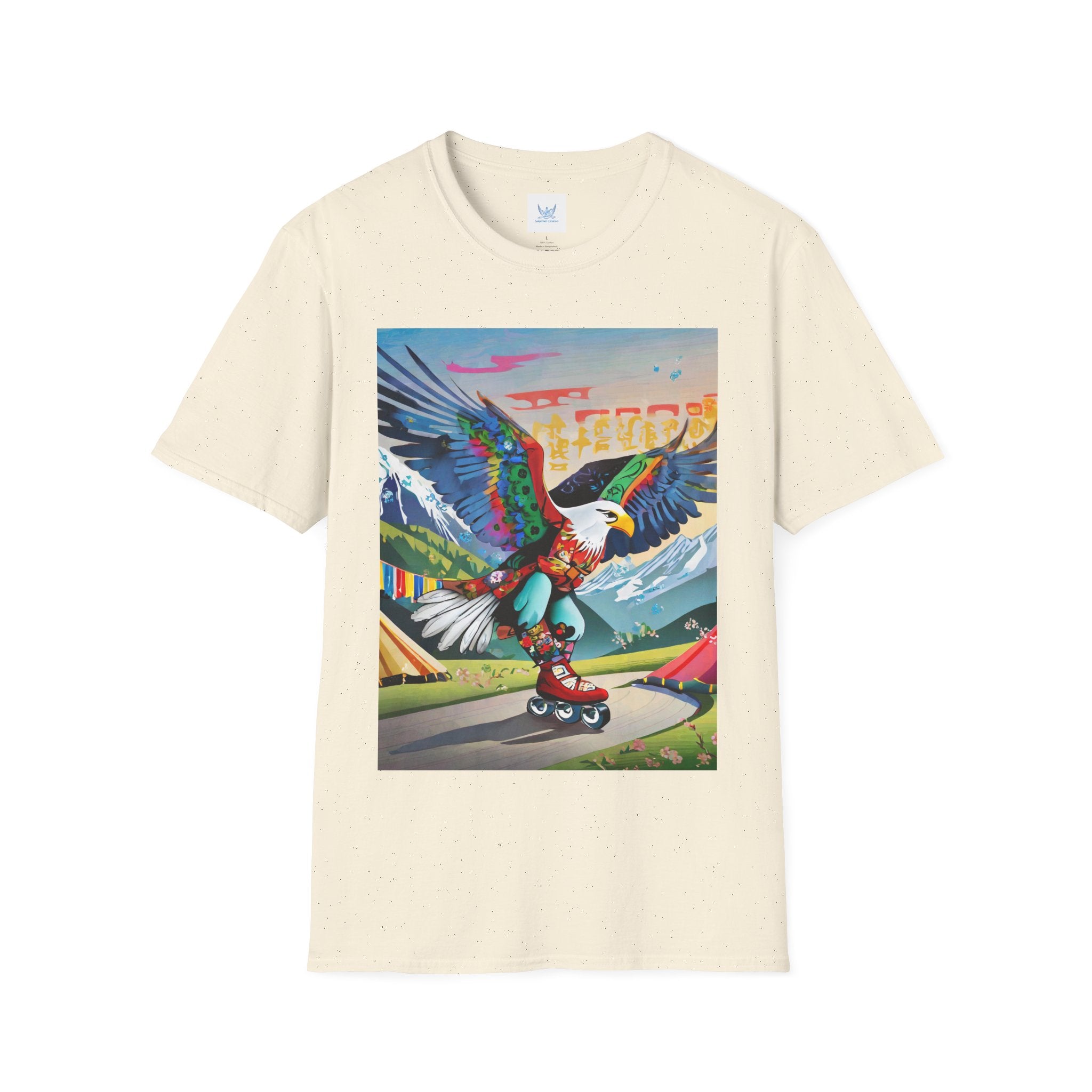 The artwork, Eagle Skater, portrays a majestic eagle gliding gracefully on roller skates beneath a sky adorned with fluttering Tibetan prayer flags. The vivid scene captures a sense of liberation and lighthearted strength, blending the spirit of freedom with whimsical motion. With every colorful detail, the design embodies balance, grace, and joyful energy—a perfect fusion of nature’s majesty and imaginative fun.