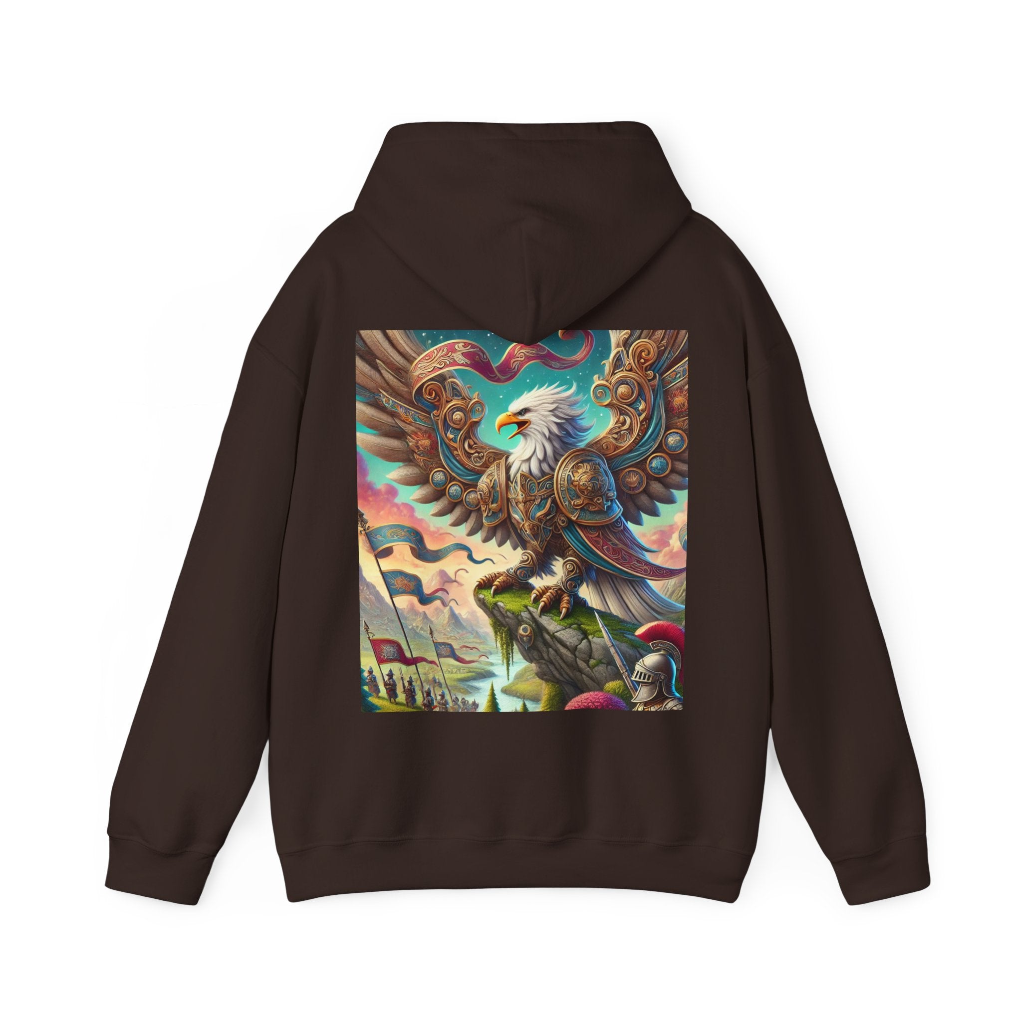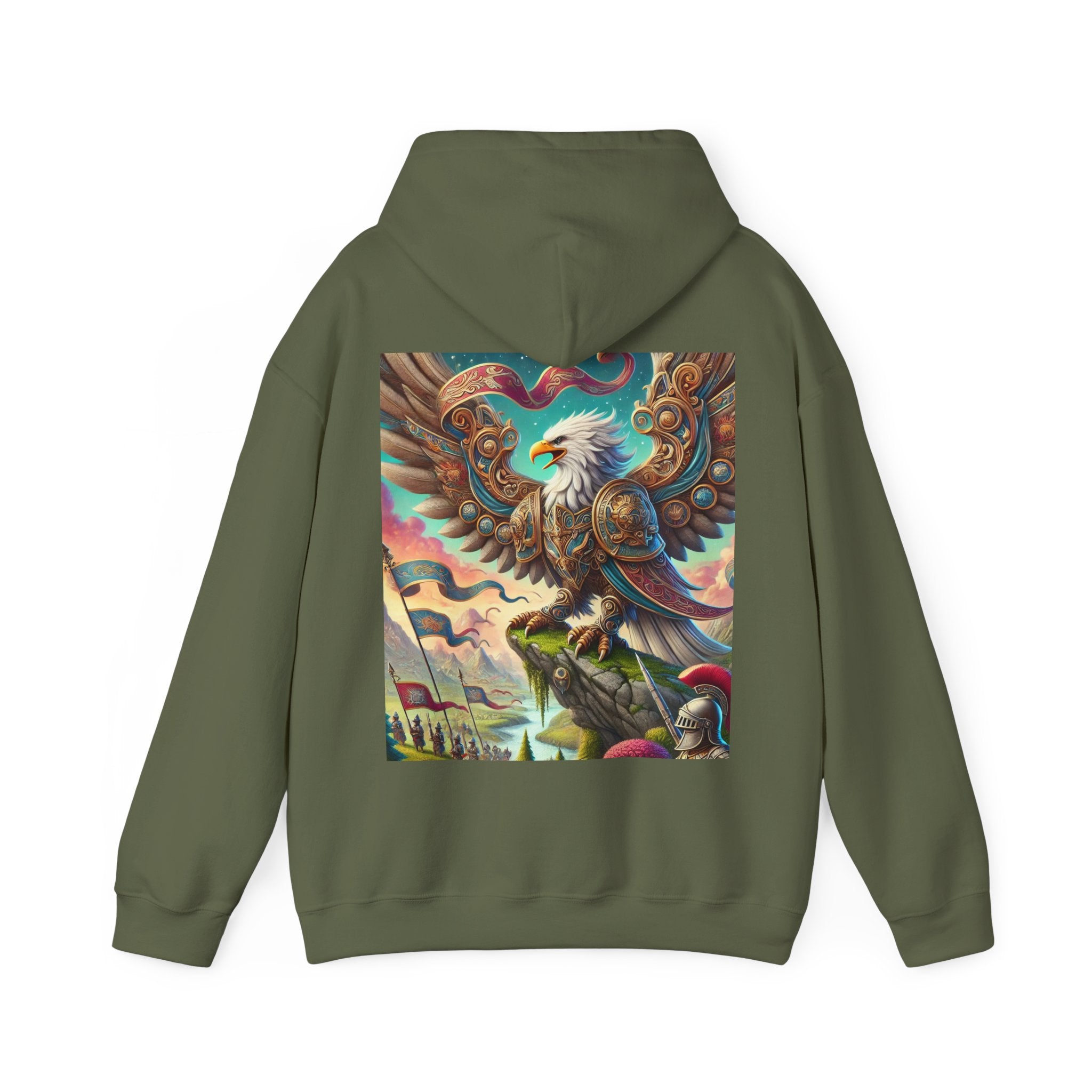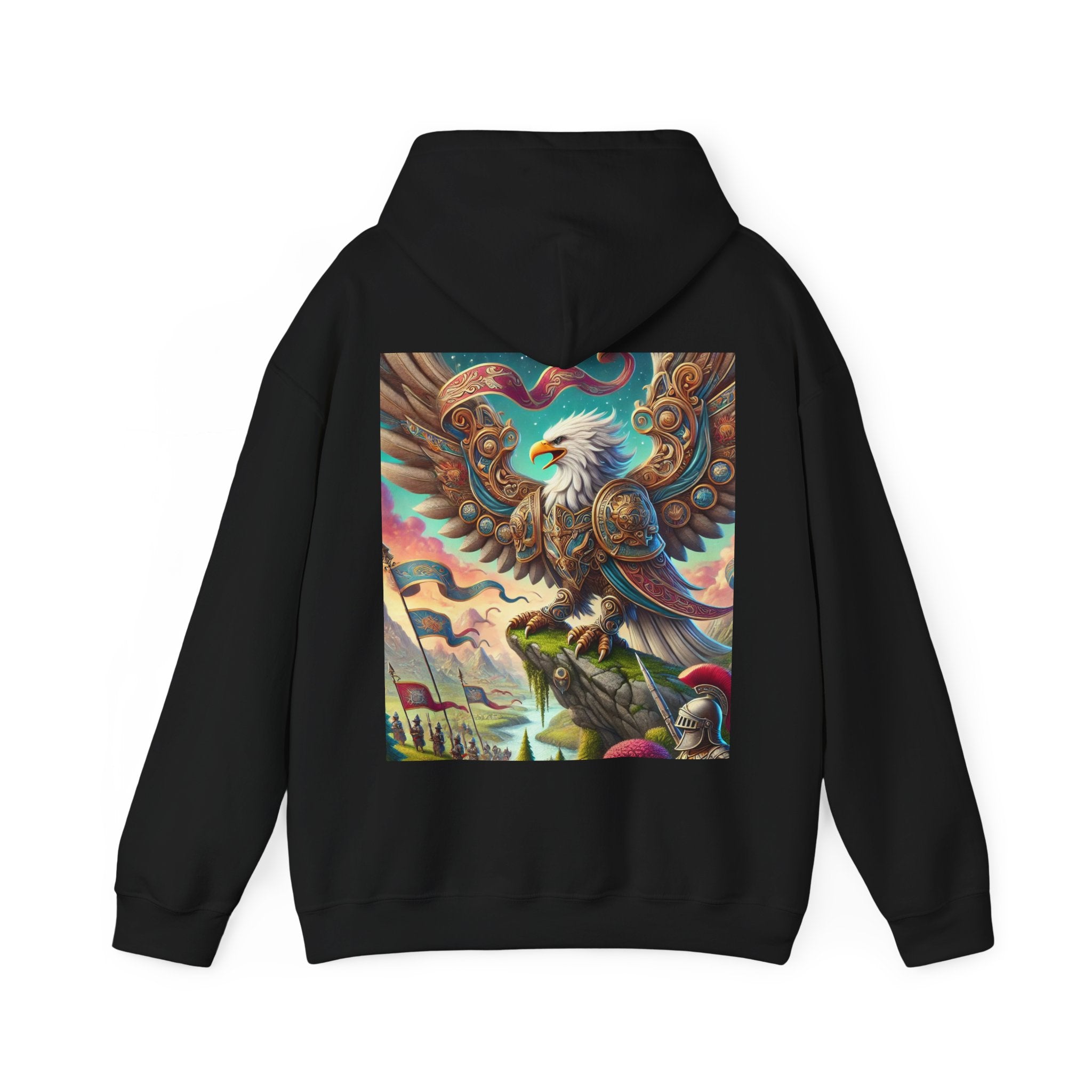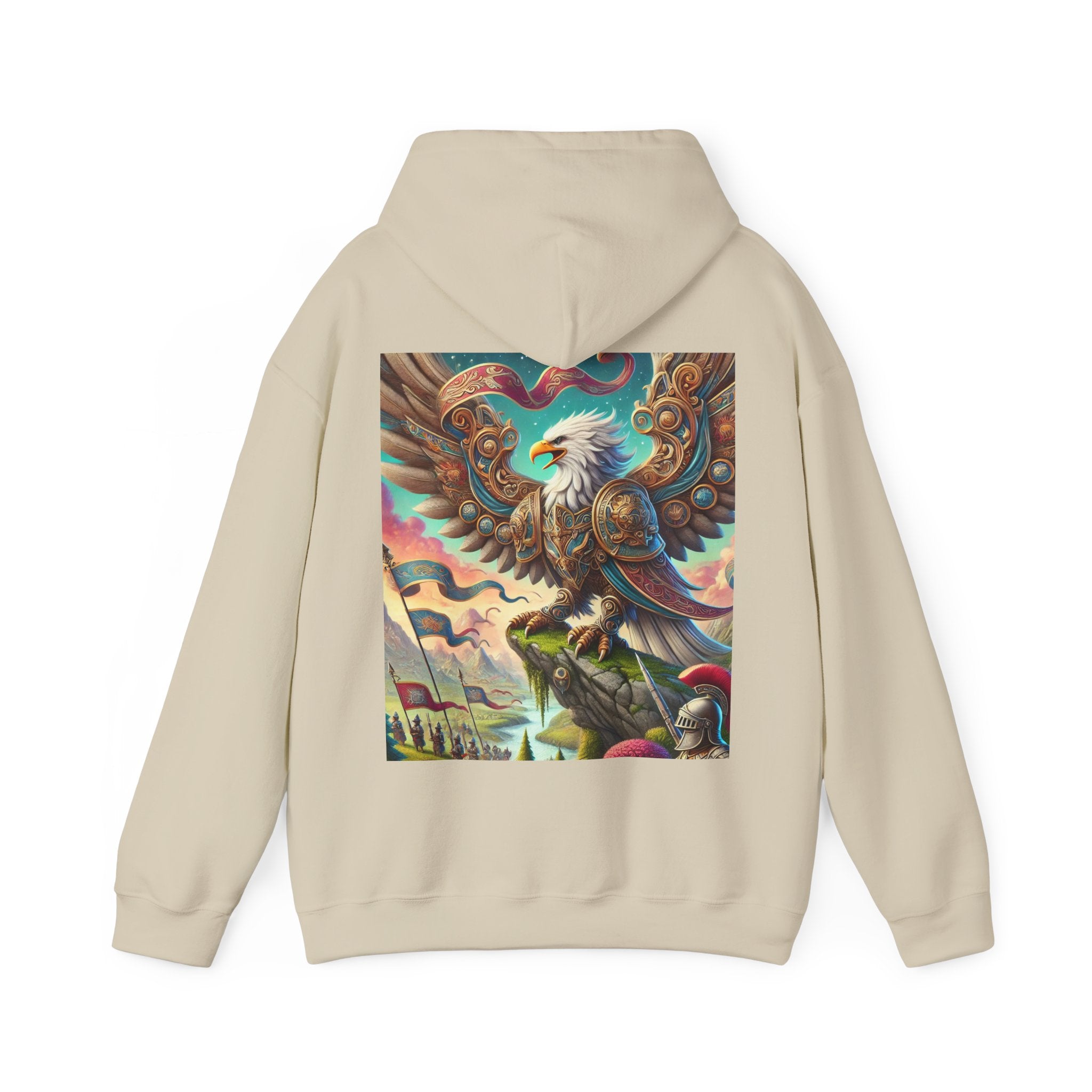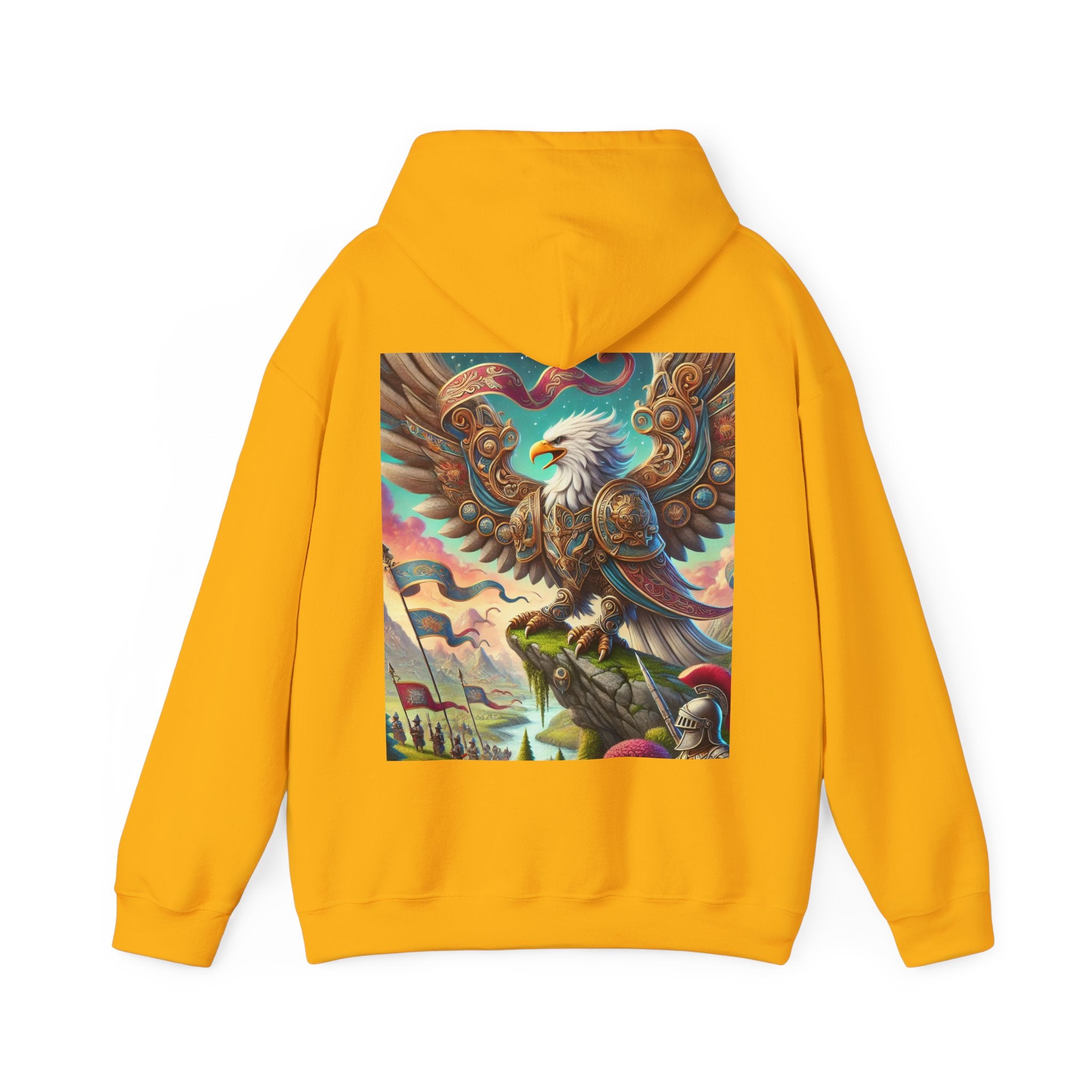 This evocative imagery pairs seamlessly with the Gildan Heavy Blend™ Hooded Sweatshirt, crafted from a soft cotton-poly blend that provides lasting warmth and dependable durability. Its unisex fit makes it a versatile everyday staple, while ribbed cuffs and hem help maintain its shape over time. The roomy front pocket adds convenience, and the double-lined hood with matching drawcord creates a clean, cohesive finish. Combining comfort with a bold artistic presence, this hoodie brings the spirit of the eagle warrior into your wardrobe with style and strength.