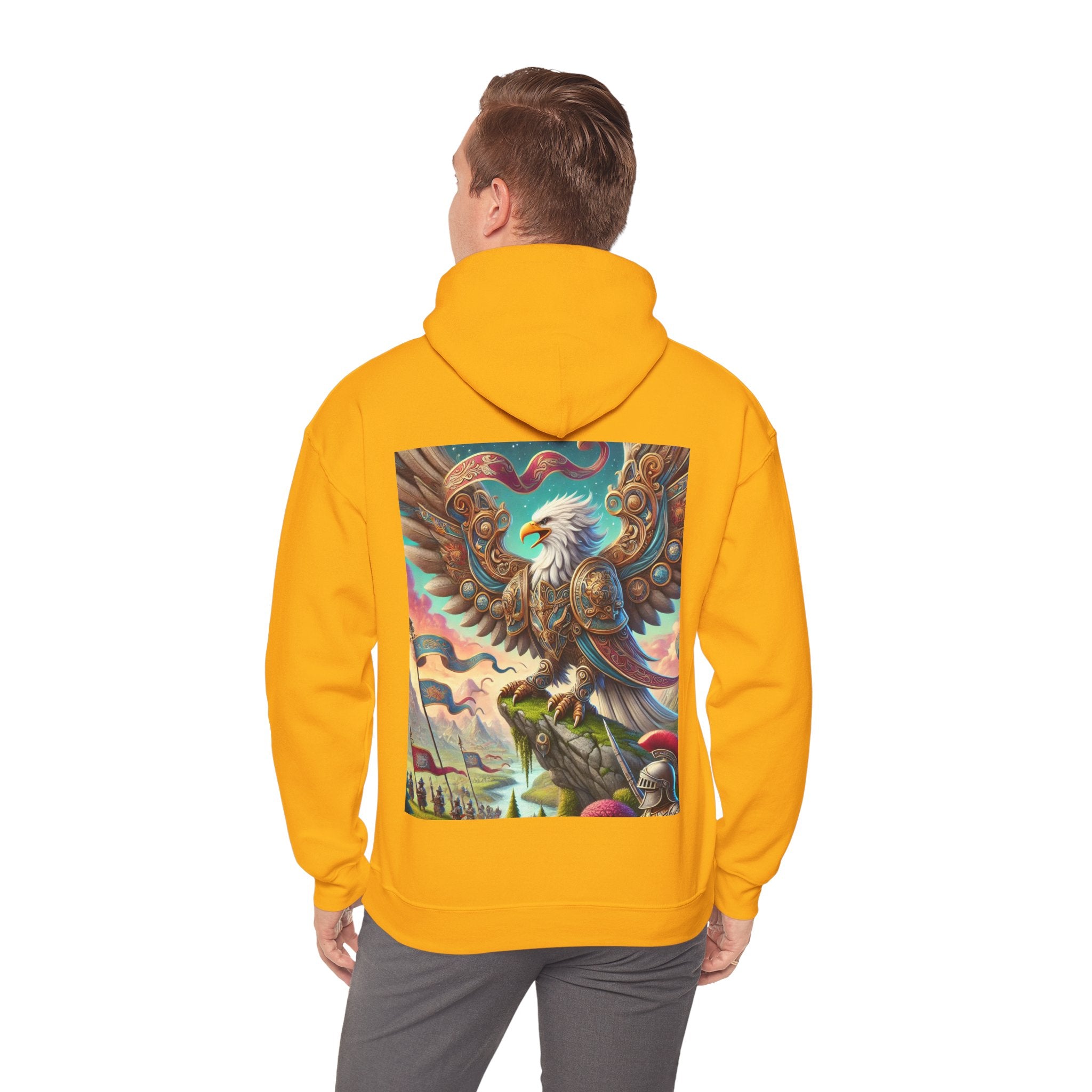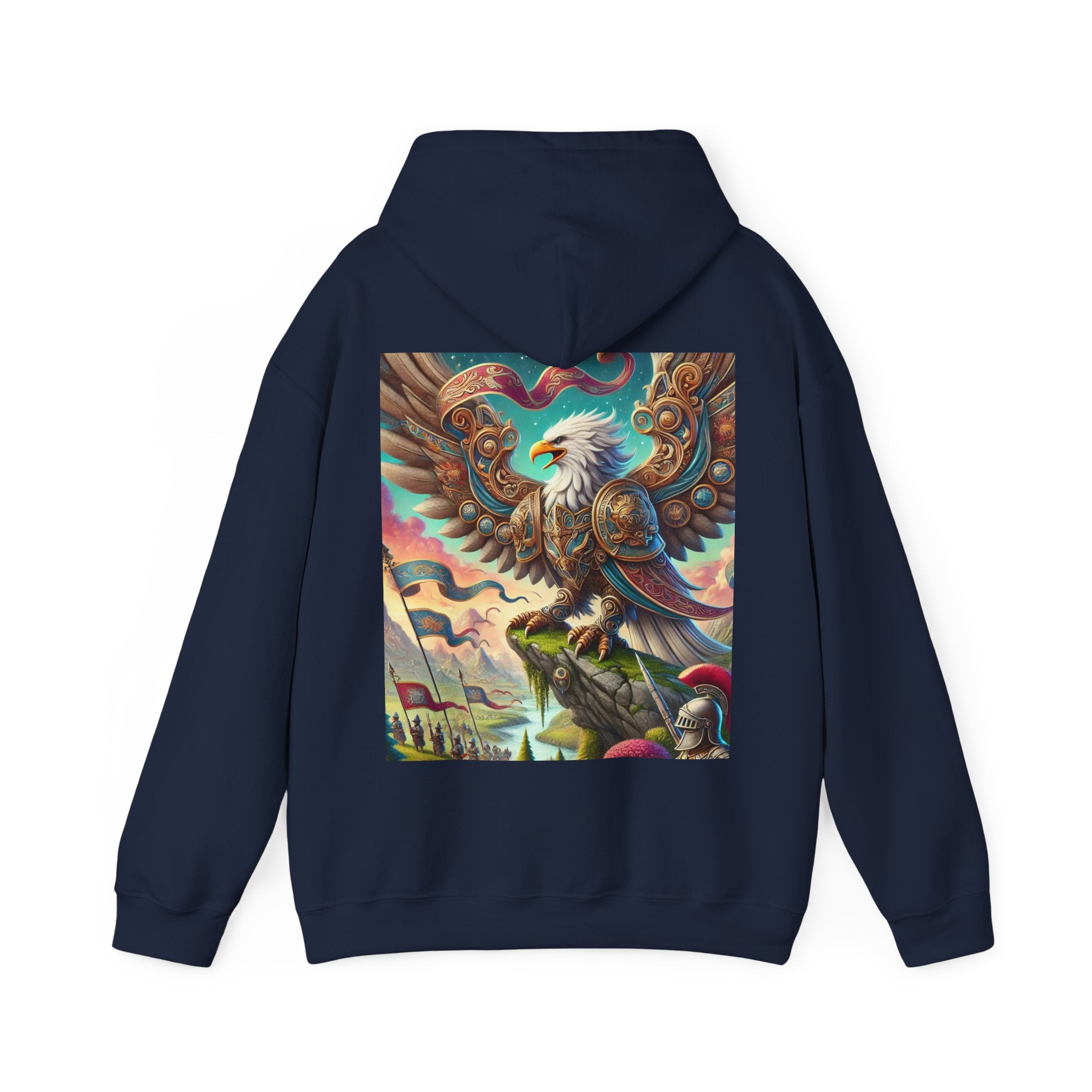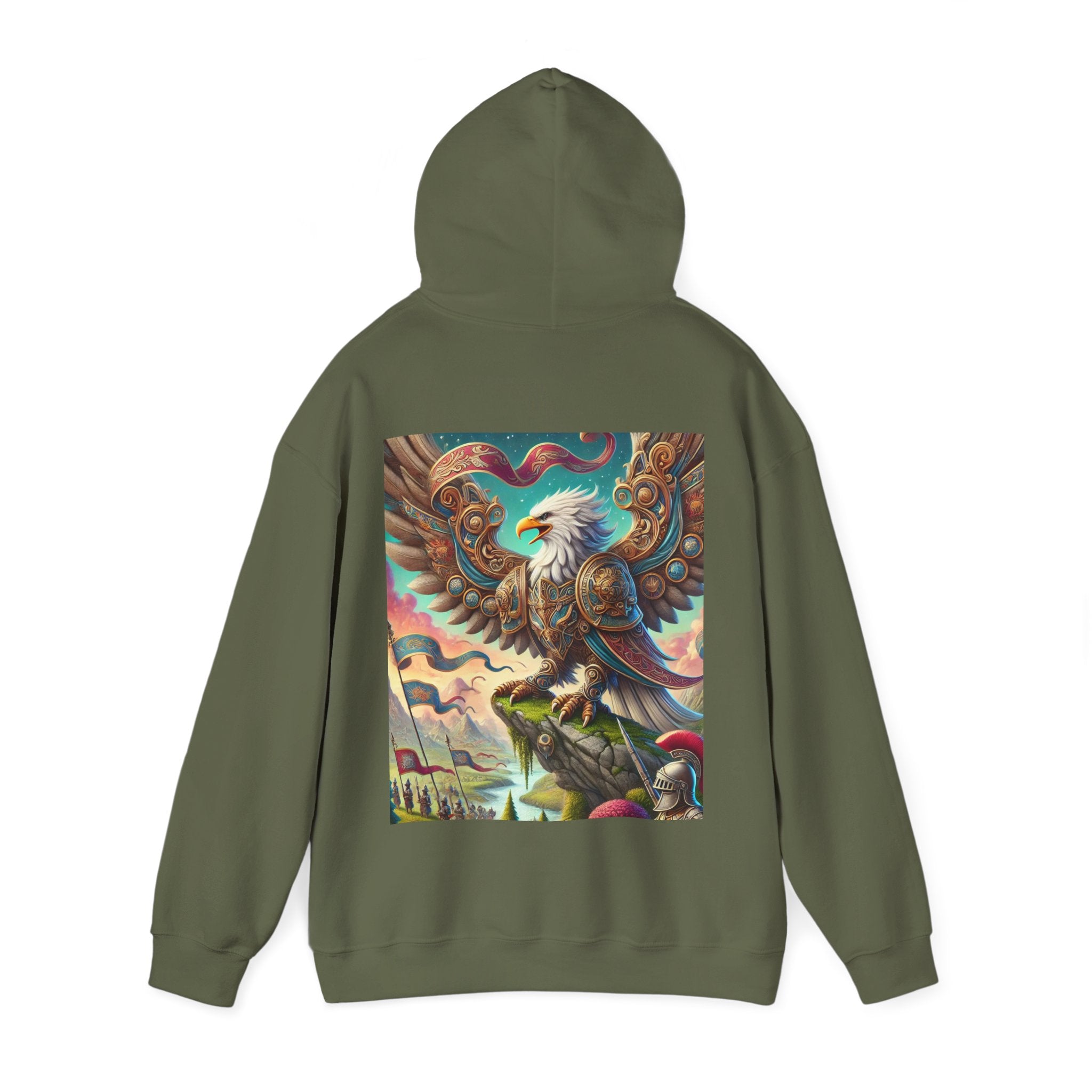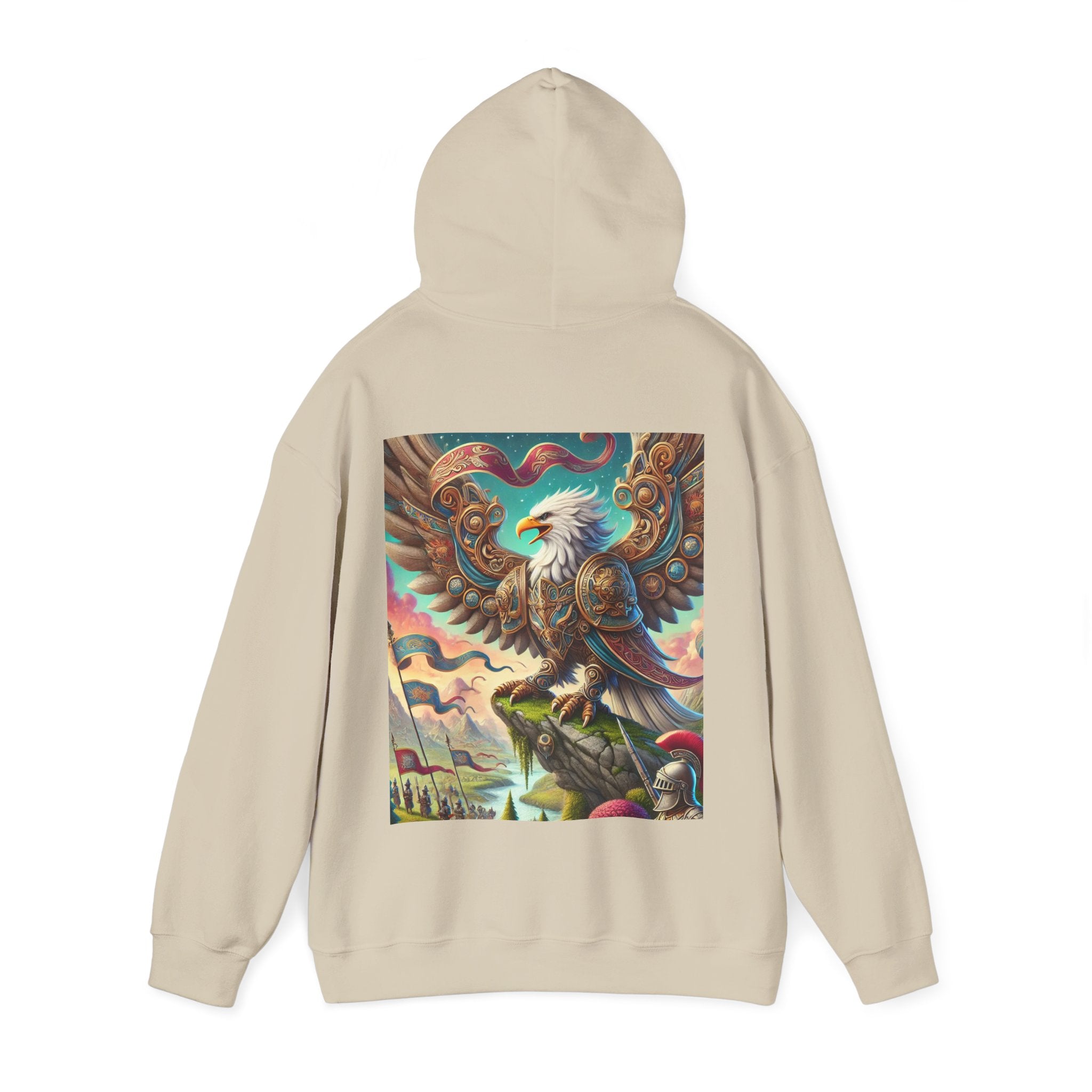 This evocative imagery pairs seamlessly with the Gildan Heavy Blend™ Hooded Sweatshirt, crafted from a soft cotton-poly blend that provides lasting warmth and dependable durability. Its unisex fit makes it a versatile everyday staple, while ribbed cuffs and hem help maintain its shape over time. The roomy front pocket adds convenience, and the double-lined hood with matching drawcord creates a clean, cohesive finish. Combining comfort with a bold artistic presence, this hoodie brings the spirit of the eagle warrior into your wardrobe with style and strength.