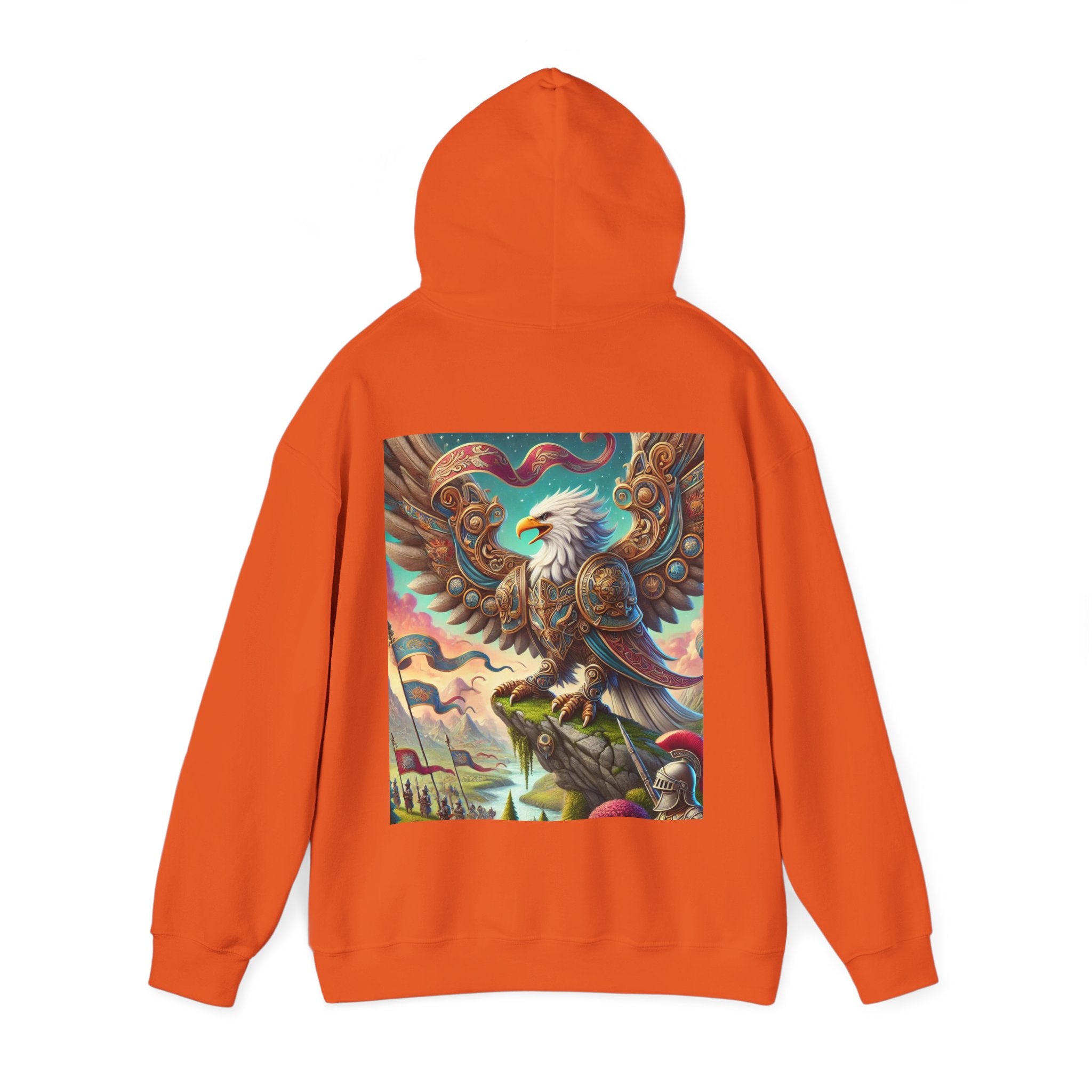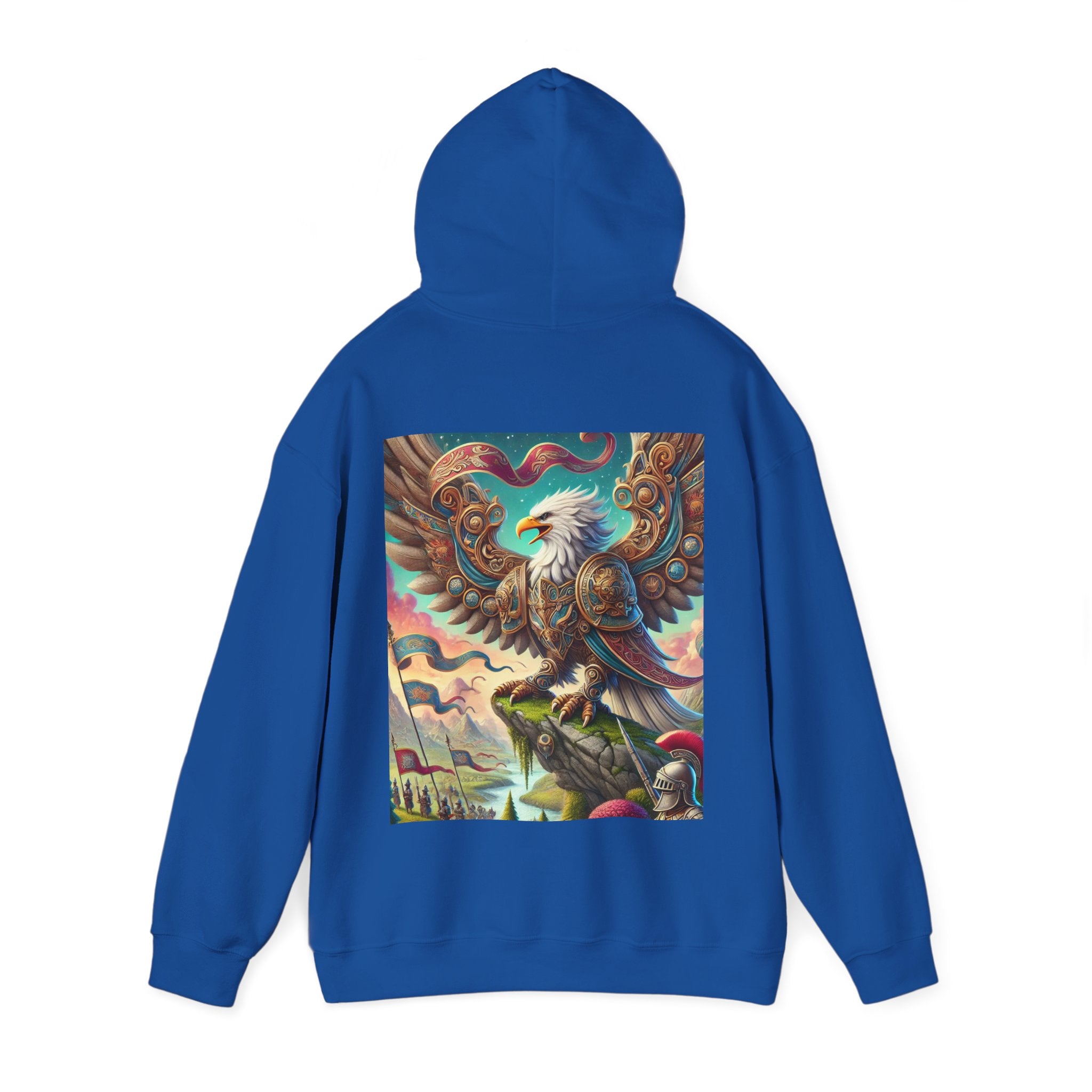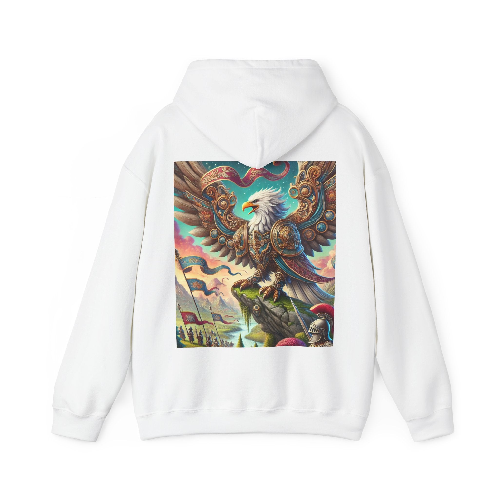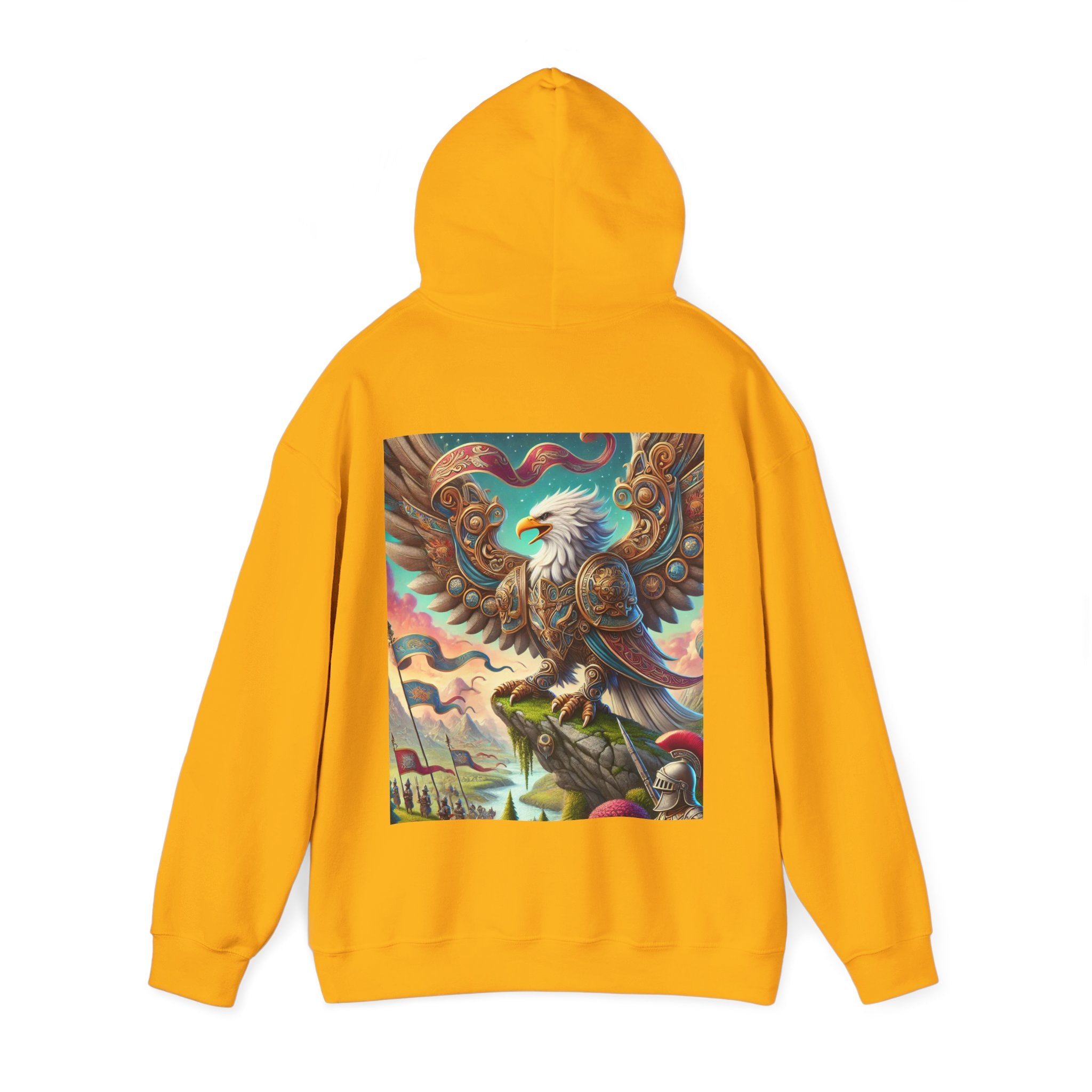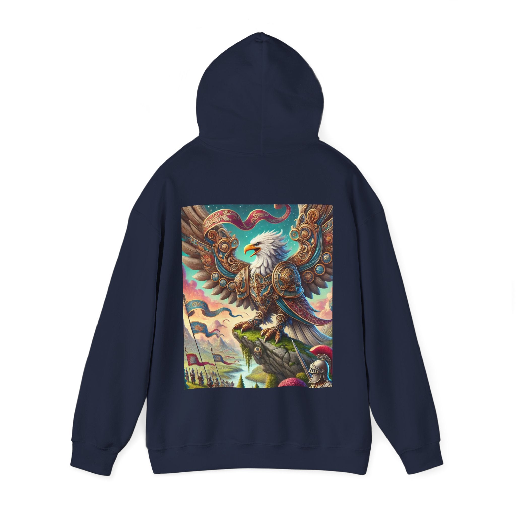 This evocative imagery pairs seamlessly with the Gildan Heavy Blend™ Hooded Sweatshirt, crafted from a soft cotton-poly blend that provides lasting warmth and dependable durability. Its unisex fit makes it a versatile everyday staple, while ribbed cuffs and hem help maintain its shape over time. The roomy front pocket adds convenience, and the double-lined hood with matching drawcord creates a clean, cohesive finish. Combining comfort with a bold artistic presence, this hoodie brings the spirit of the eagle warrior into your wardrobe with style and strength.
