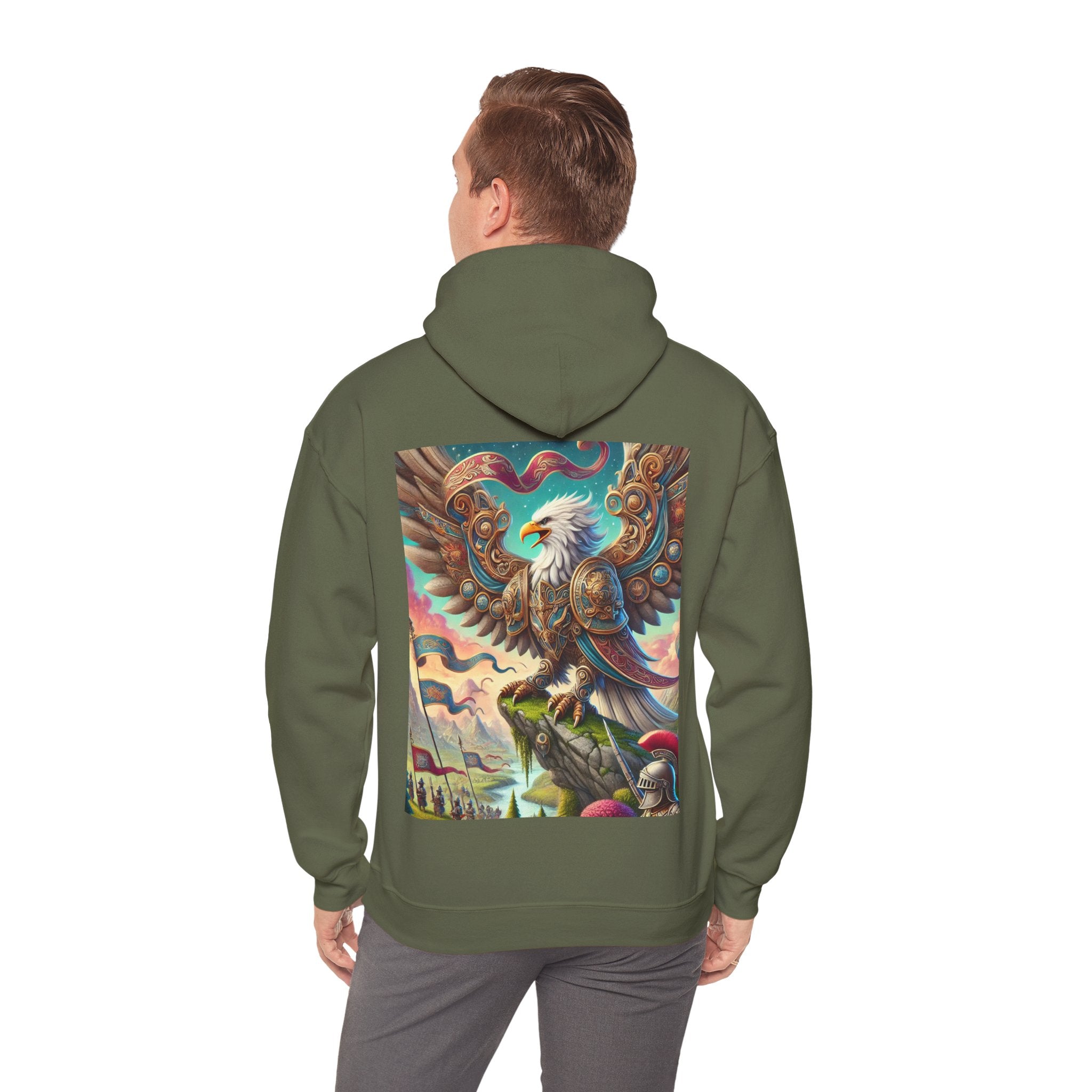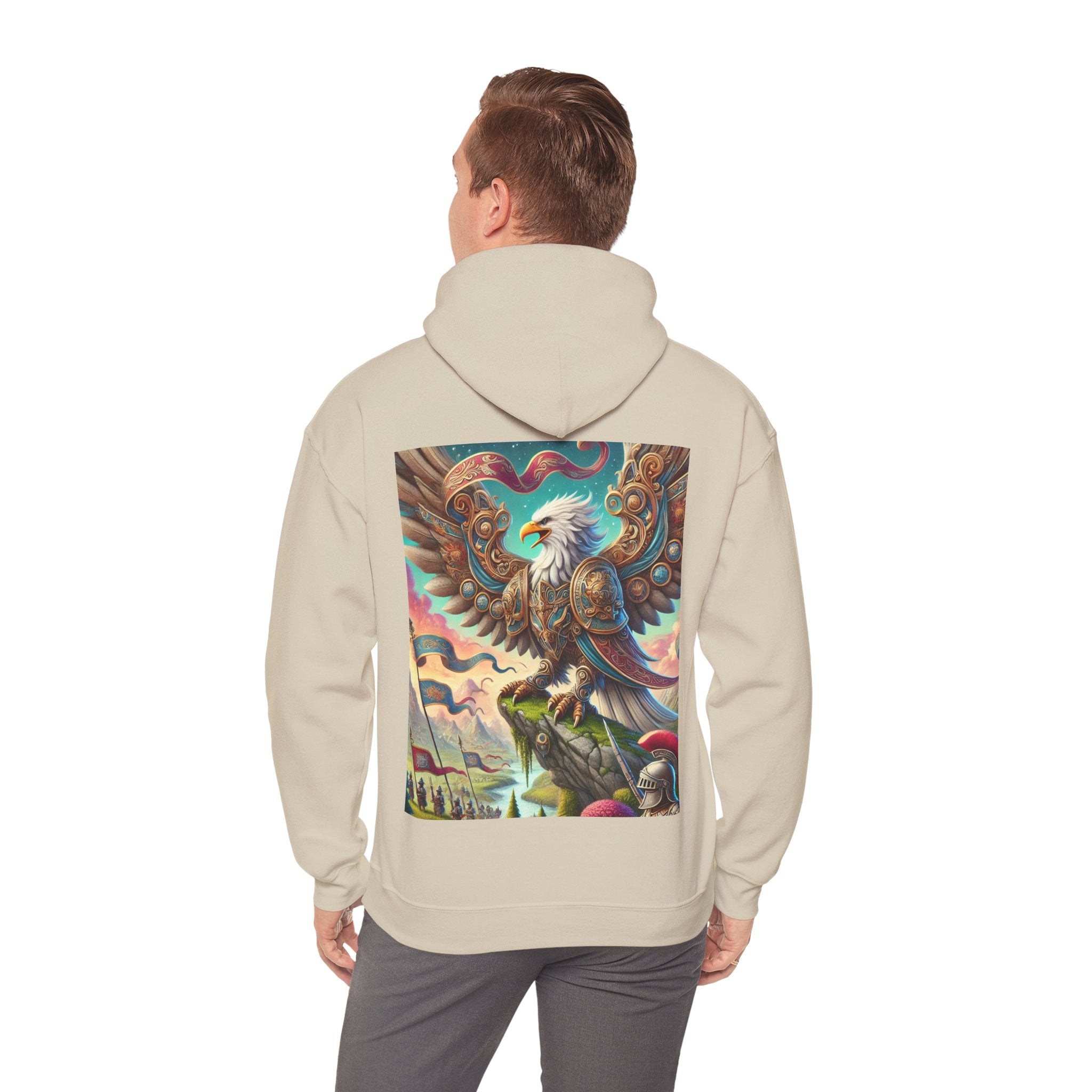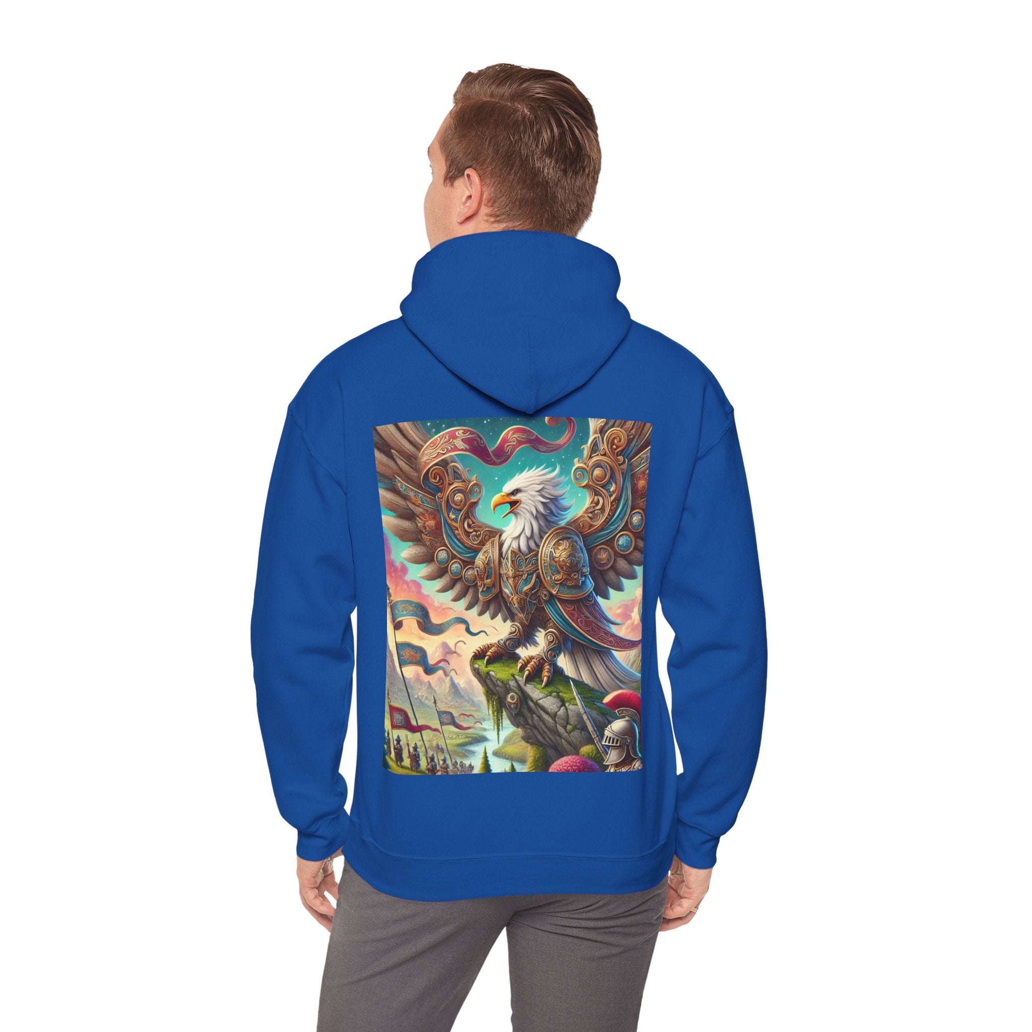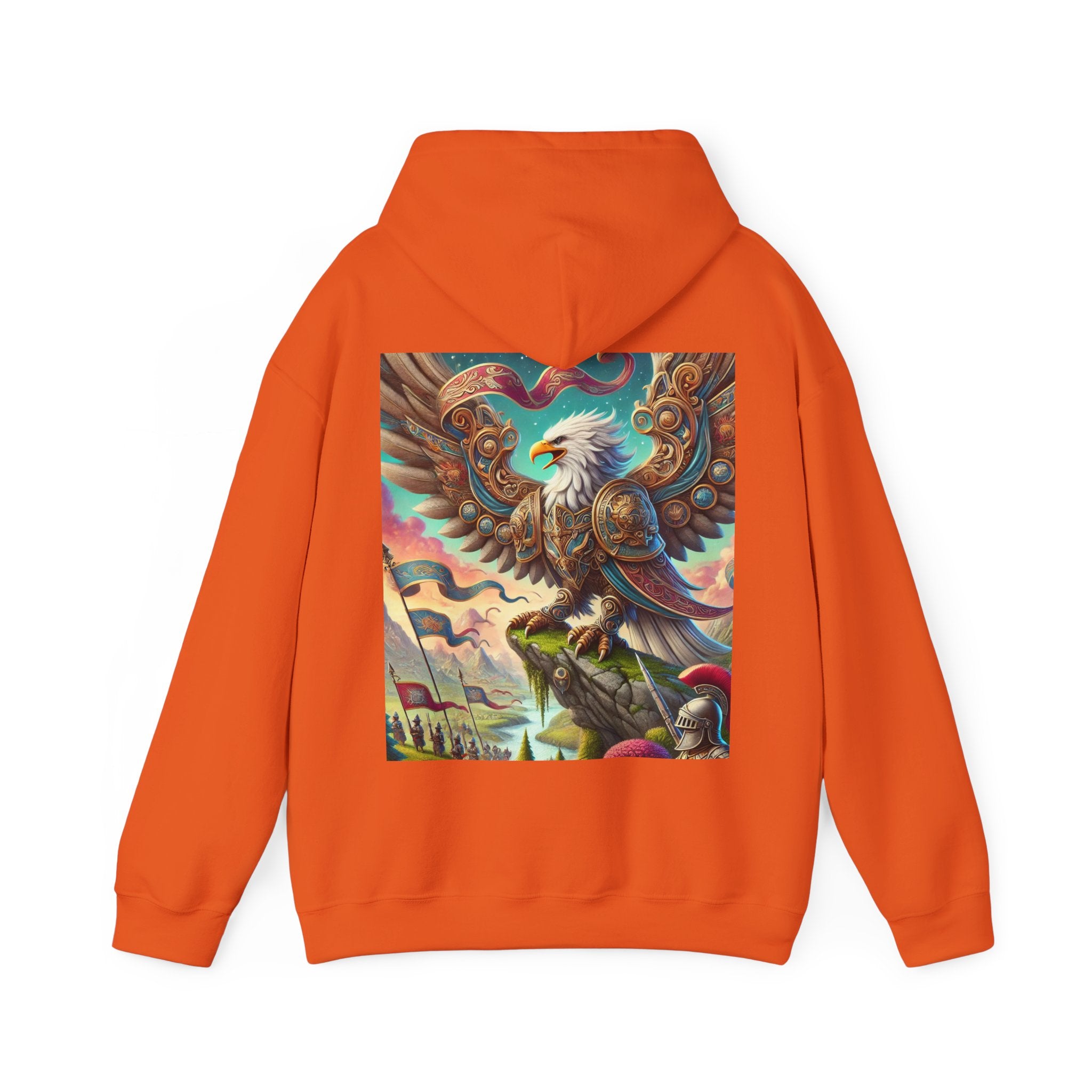 This evocative imagery pairs seamlessly with the Gildan Heavy Blend™ Hooded Sweatshirt, crafted from a soft cotton-poly blend that provides lasting warmth and dependable durability. Its unisex fit makes it a versatile everyday staple, while ribbed cuffs and hem help maintain its shape over time. The roomy front pocket adds convenience, and the double-lined hood with matching drawcord creates a clean, cohesive finish. Combining comfort with a bold artistic presence, this hoodie brings the spirit of the eagle warrior into your wardrobe with style and strength.