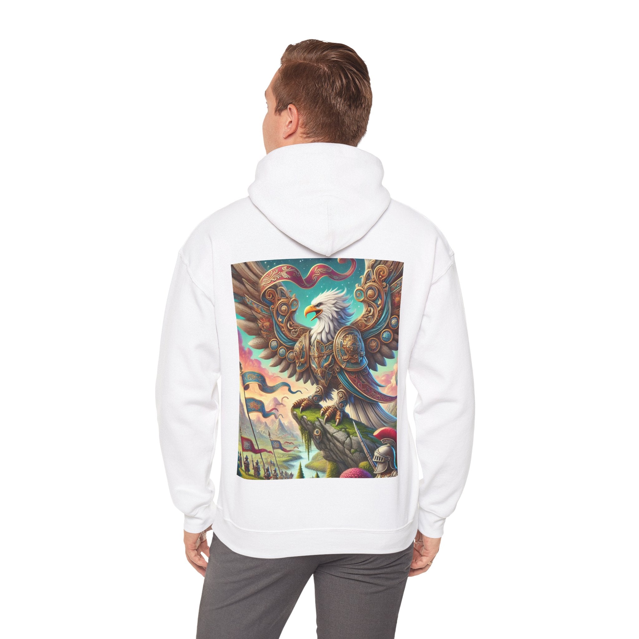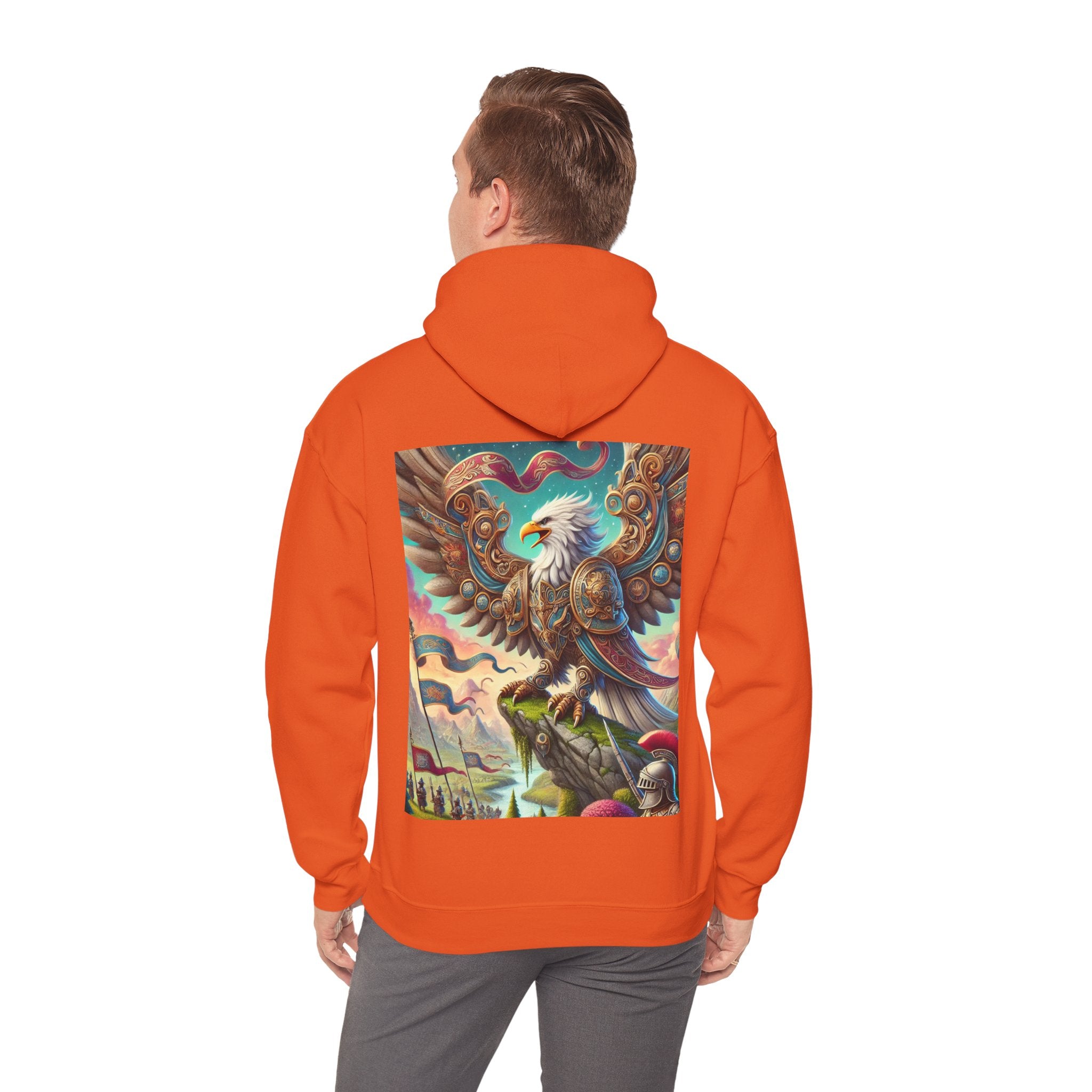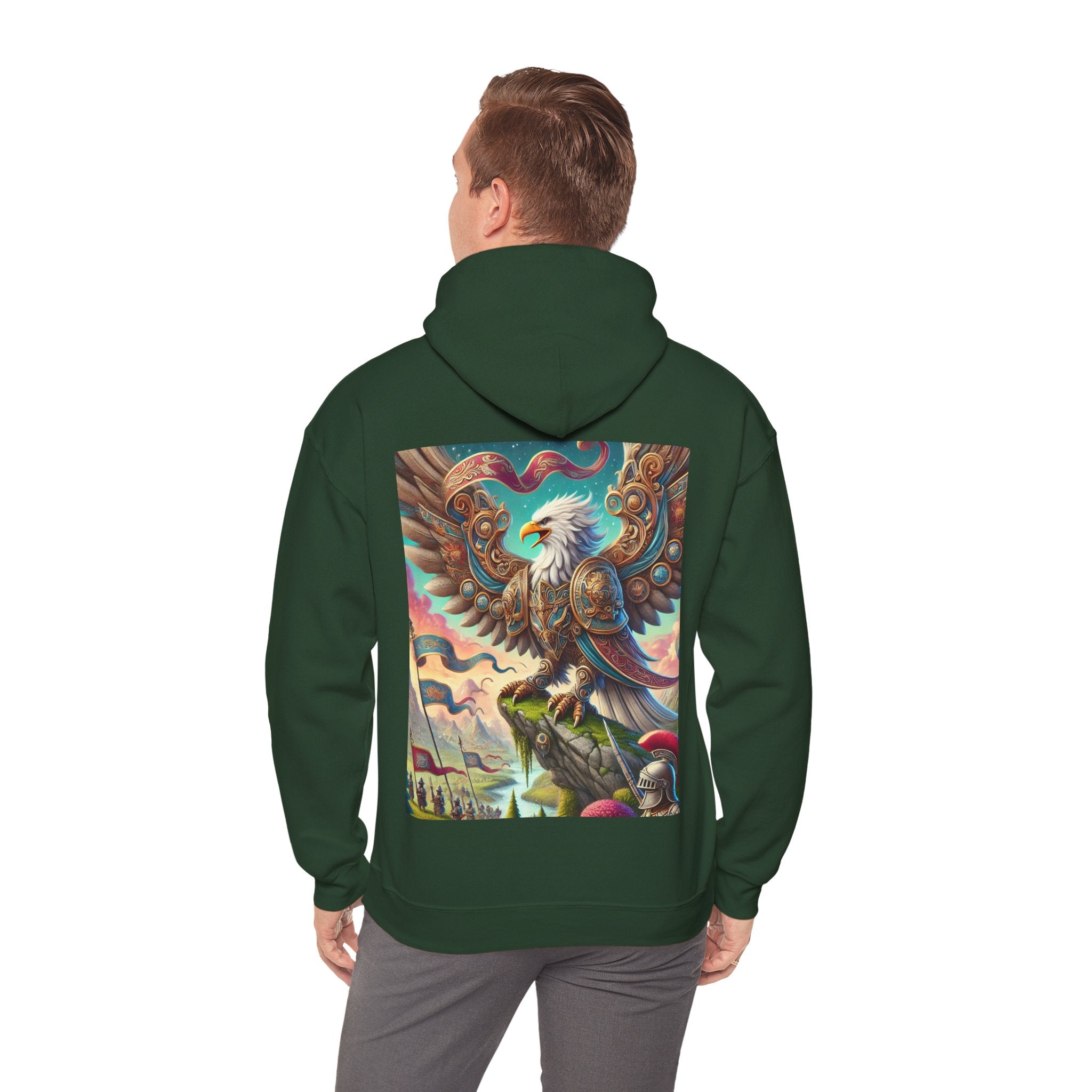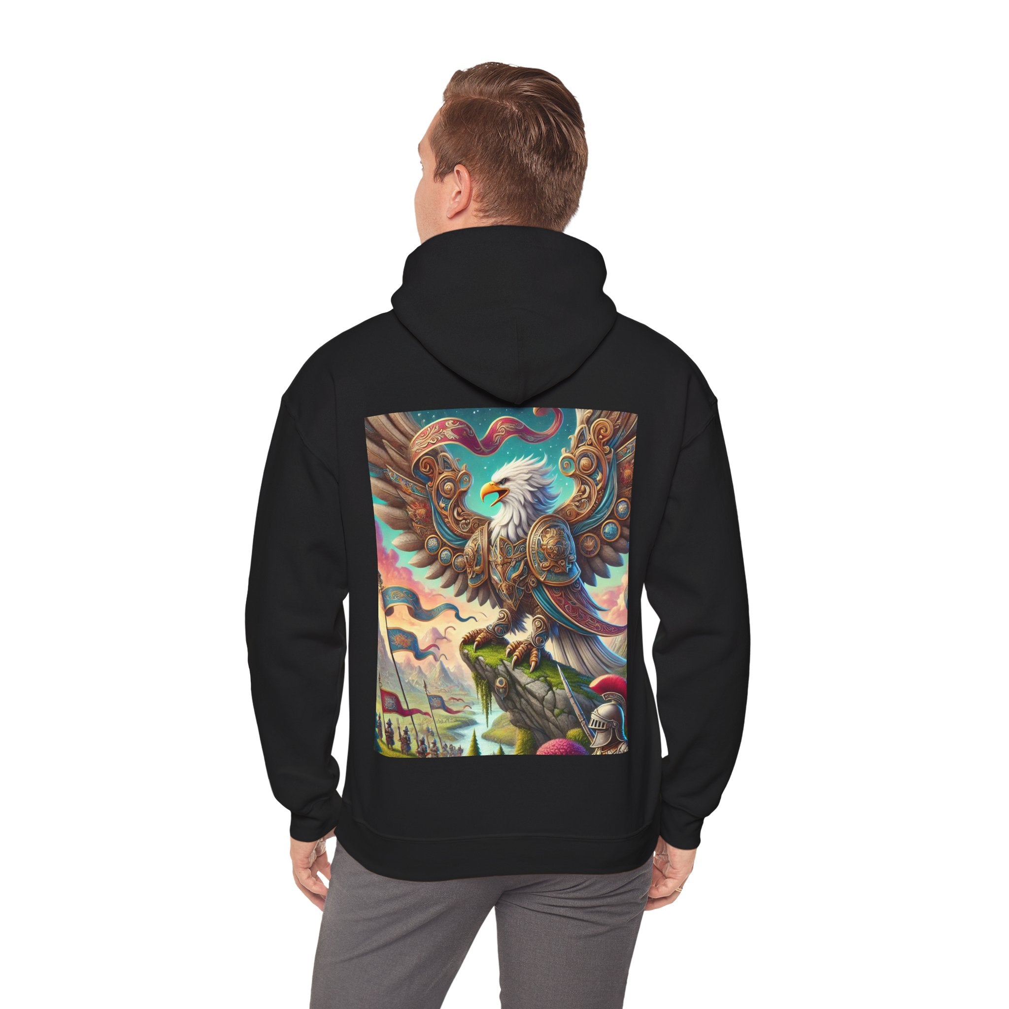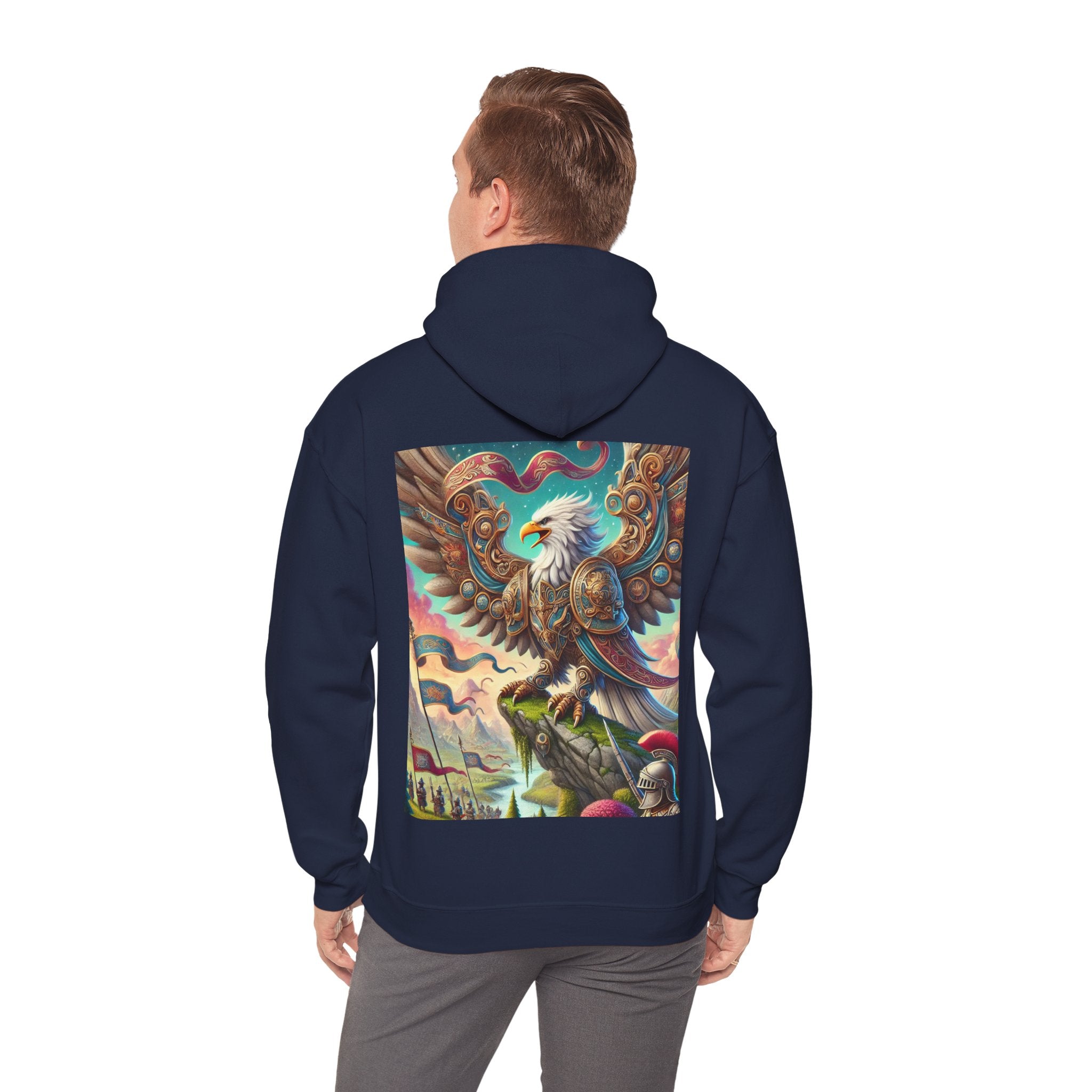 This evocative imagery pairs seamlessly with the Gildan Heavy Blend™ Hooded Sweatshirt, crafted from a soft cotton-poly blend that provides lasting warmth and dependable durability. Its unisex fit makes it a versatile everyday staple, while ribbed cuffs and hem help maintain its shape over time. The roomy front pocket adds convenience, and the double-lined hood with matching drawcord creates a clean, cohesive finish. Combining comfort with a bold artistic presence, this hoodie brings the spirit of the eagle warrior into your wardrobe with style and strength.