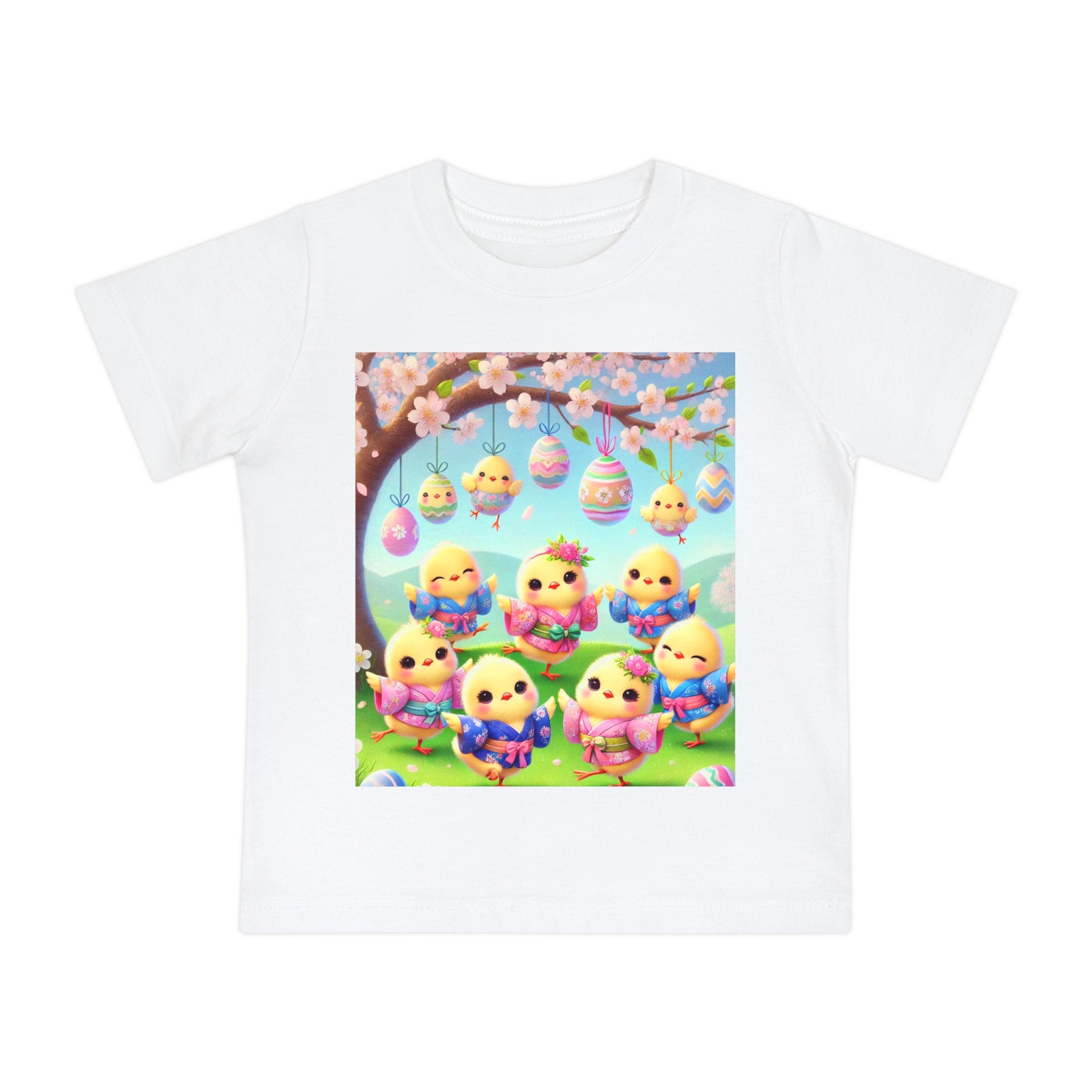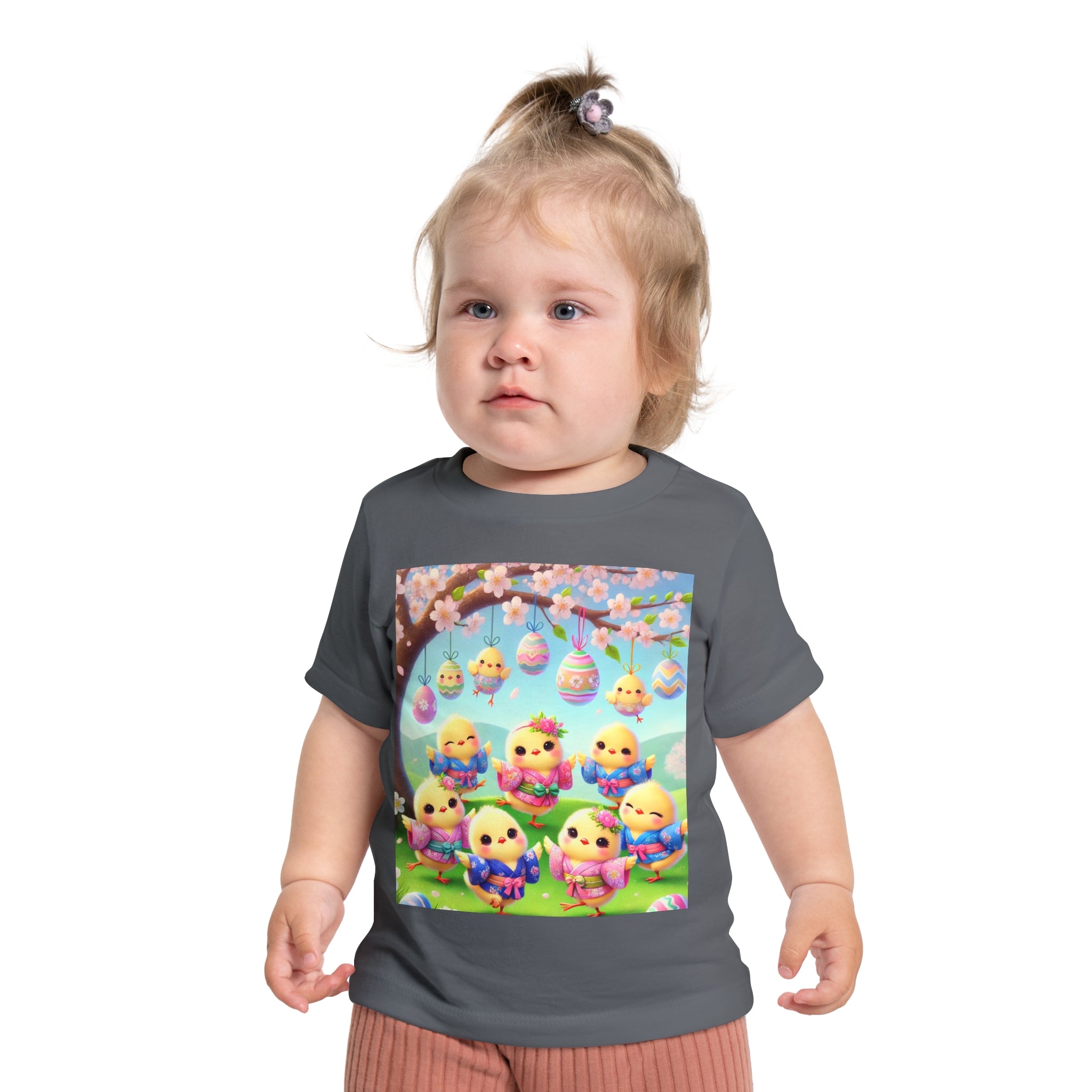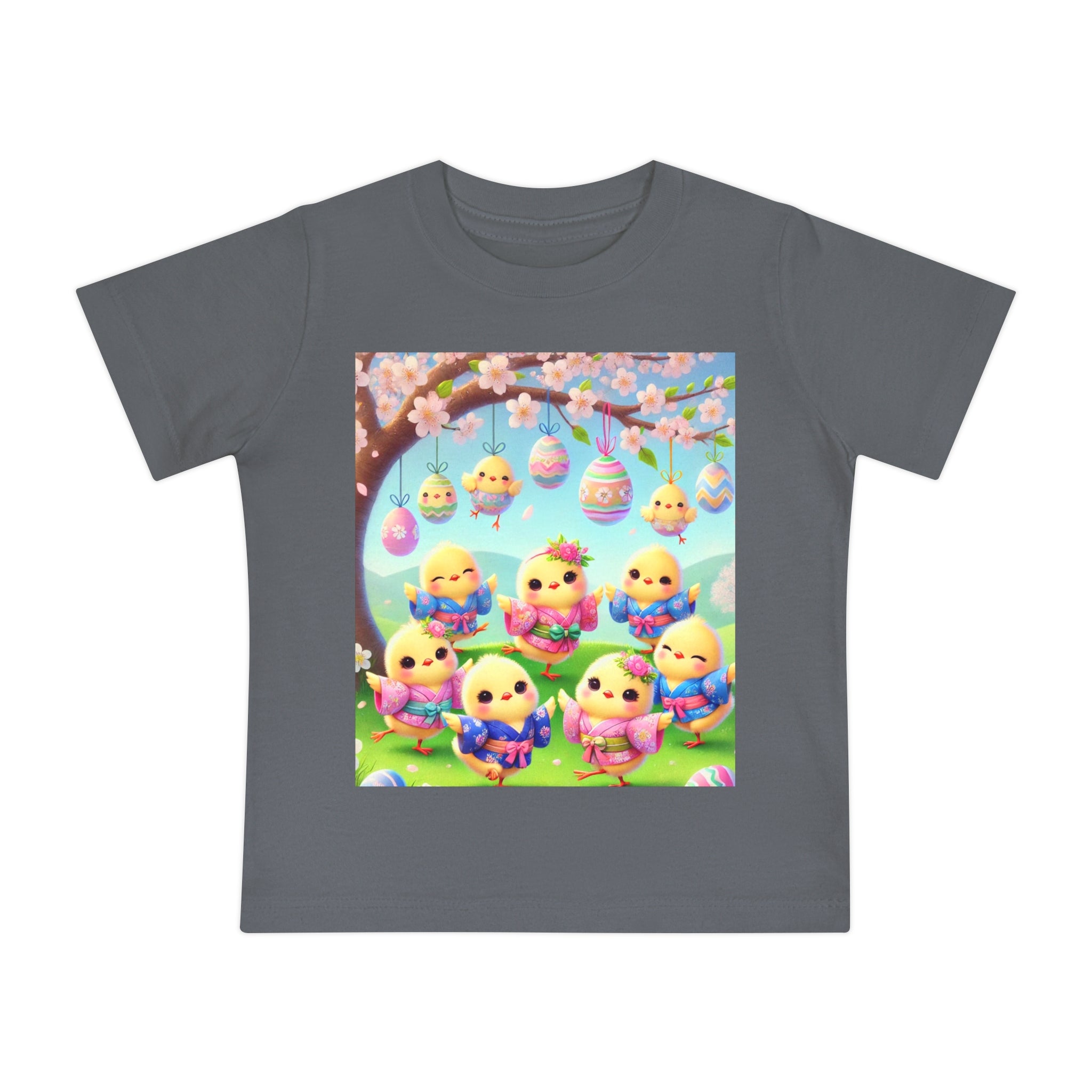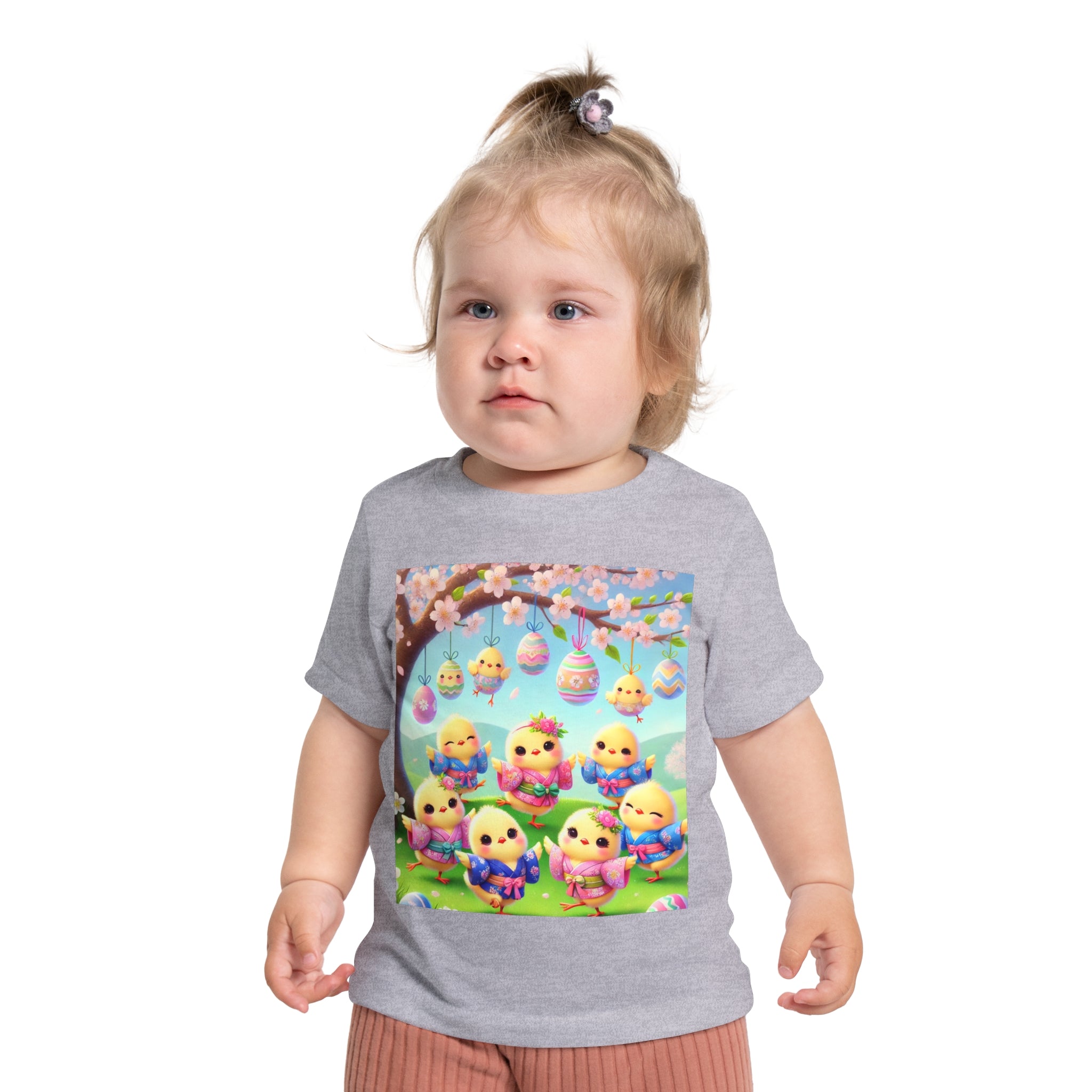 Easter Chicks and Springtime Wishes Baby T-Shirt Baby's first steps should be done with style, and this crew neck t-shirt is here to help. For children—it's super soft and comfortable. For parental figures—it's shrink-resistant and durable. All of that is made possible with the pre-shrunk, 100% airlume combed and ringspun cotton (Athletic Heather: 90/10 airlume combed and ringspun cotton-polyester blend; Additional Heather colors: 52/48 airlume combed and ringspun cotton-polyester blend). Featuring the joyful artwork of Easter Chicks and Springtime Wishes, this tee showcases fluffy yellow chicks gathered beneath blooming branches and hanging Easter eggs, with soft petals, pastel colors, and playful poses that capture togetherness, seasonal renewal, and the warm, lighthearted magic of Easter.