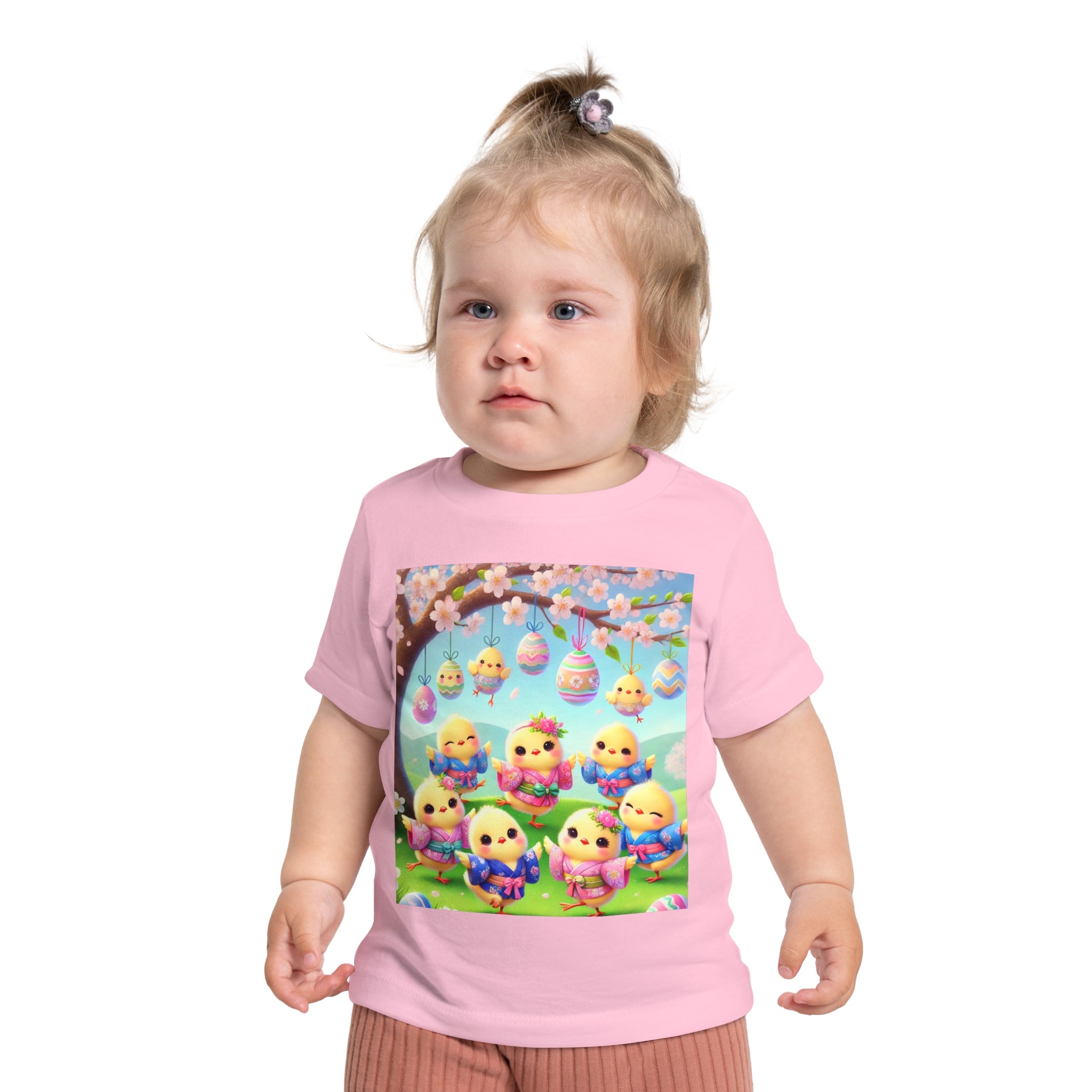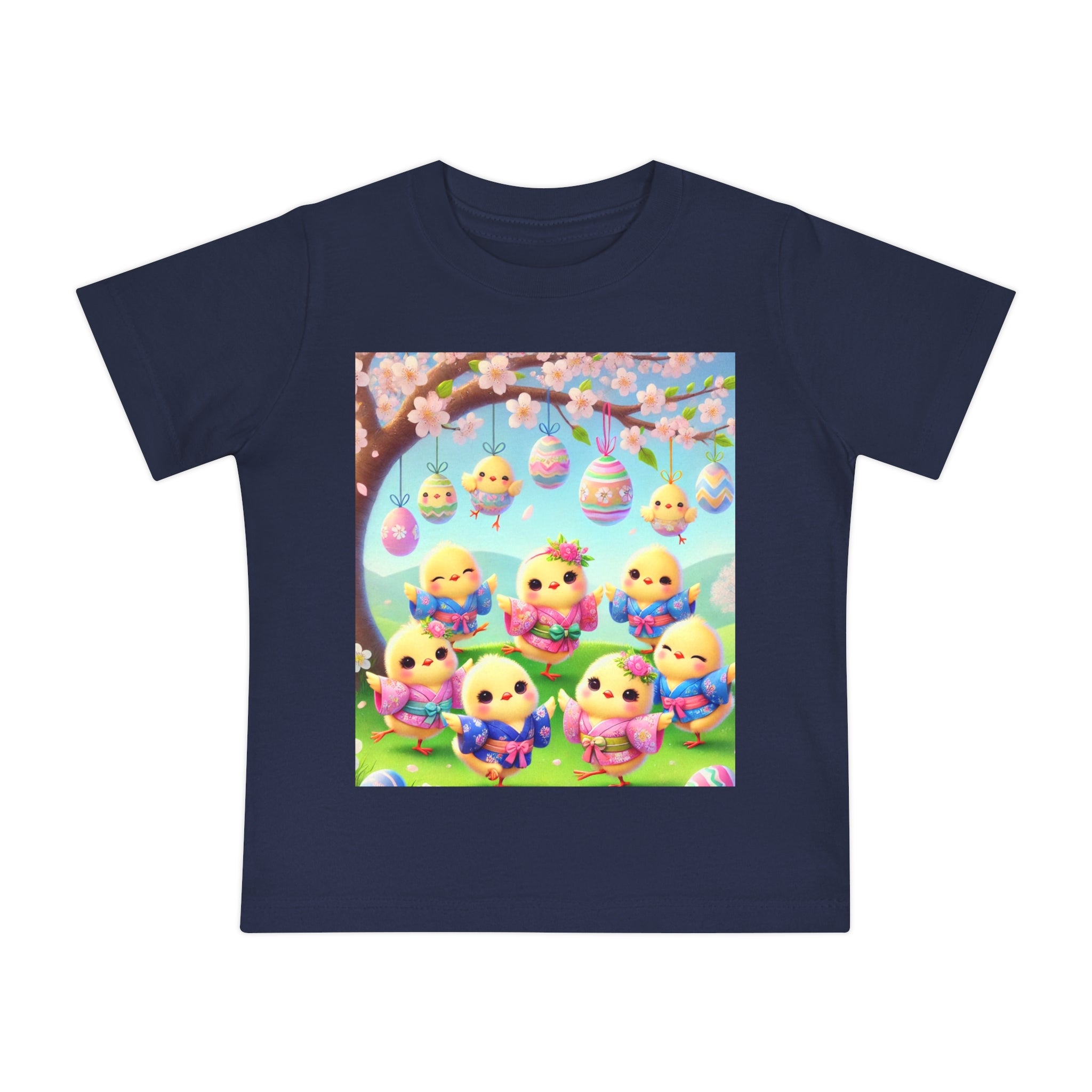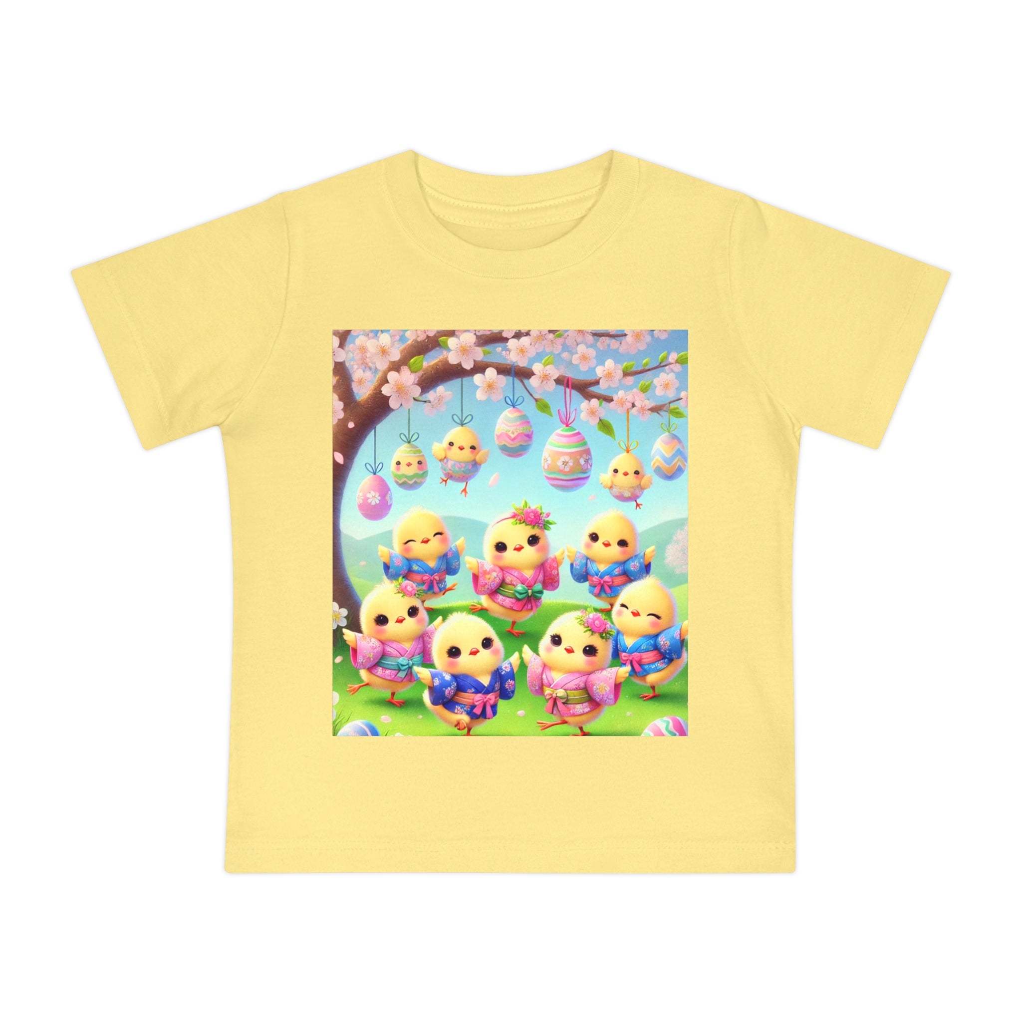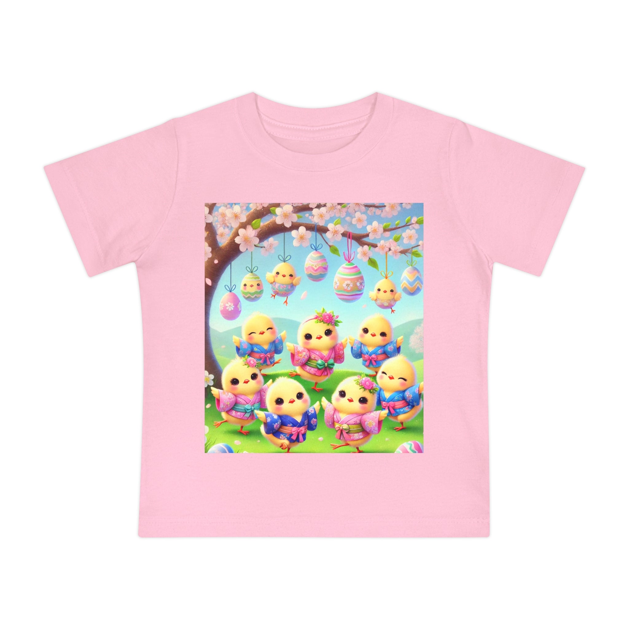 Easter Chicks and Springtime Wishes Baby T-Shirt Baby's first steps should be done with style, and this crew neck t-shirt is here to help. For children—it's super soft and comfortable. For parental figures—it's shrink-resistant and durable. All of that is made possible with the pre-shrunk, 100% airlume combed and ringspun cotton (Athletic Heather: 90/10 airlume combed and ringspun cotton-polyester blend; Additional Heather colors: 52/48 airlume combed and ringspun cotton-polyester blend). Featuring the joyful artwork of Easter Chicks and Springtime Wishes, this tee showcases fluffy yellow chicks gathered beneath blooming branches and hanging Easter eggs, with soft petals, pastel colors, and playful poses that capture togetherness, seasonal renewal, and the warm, lighthearted magic of Easter.