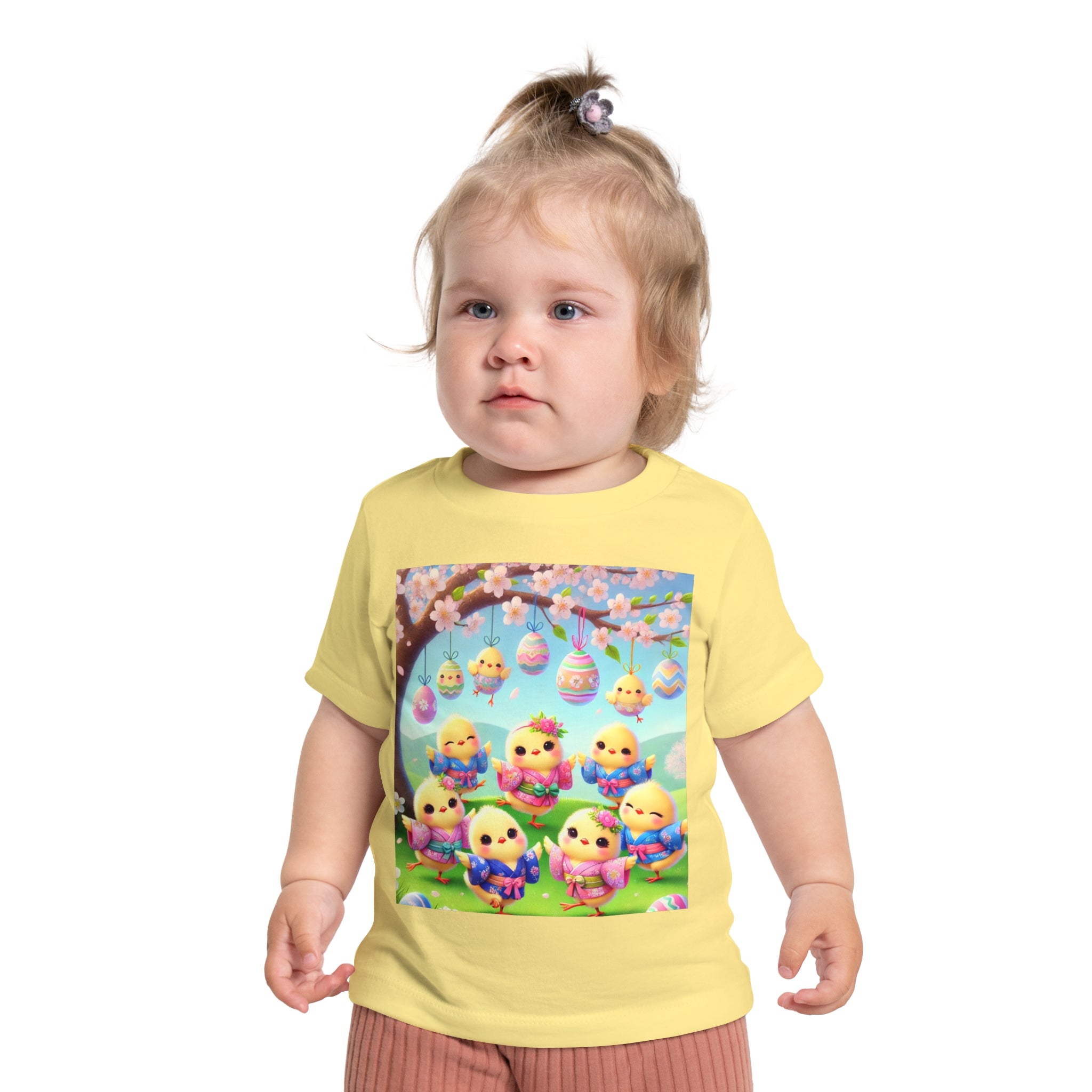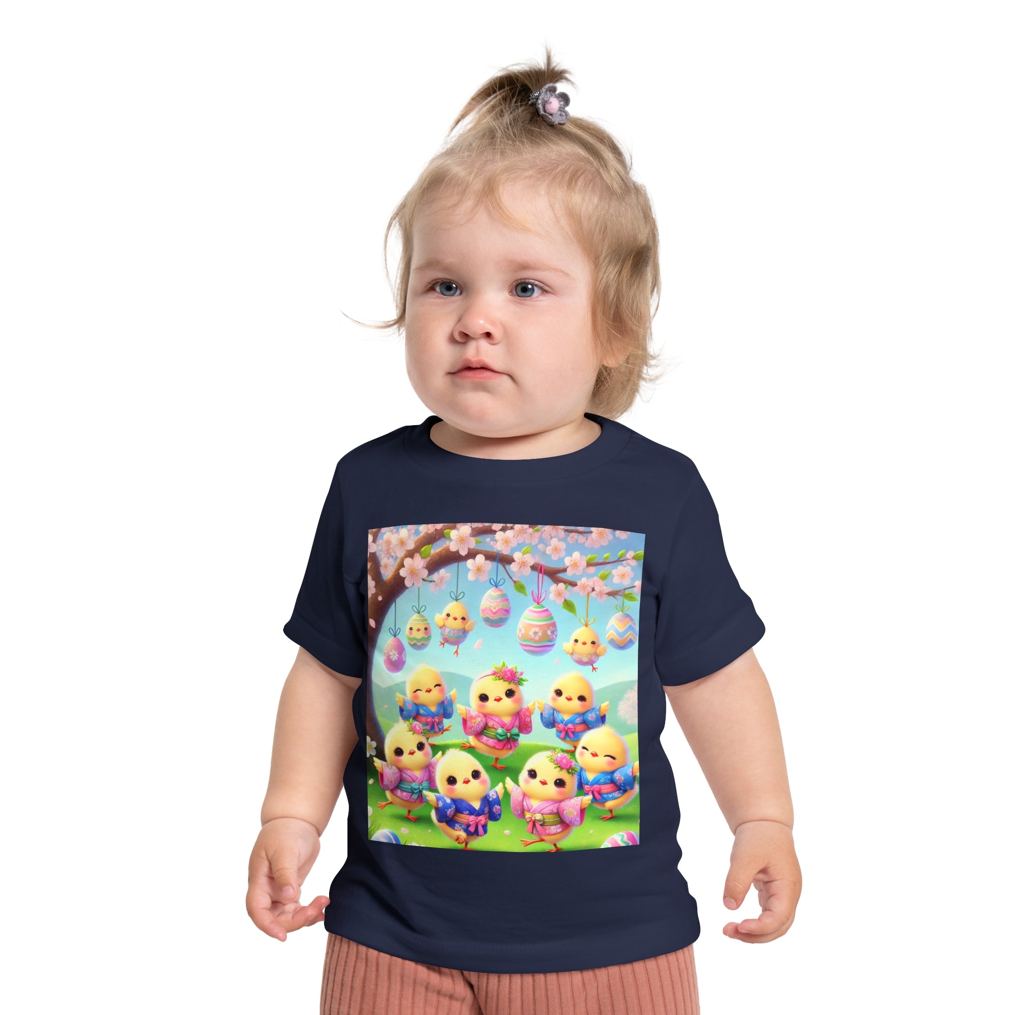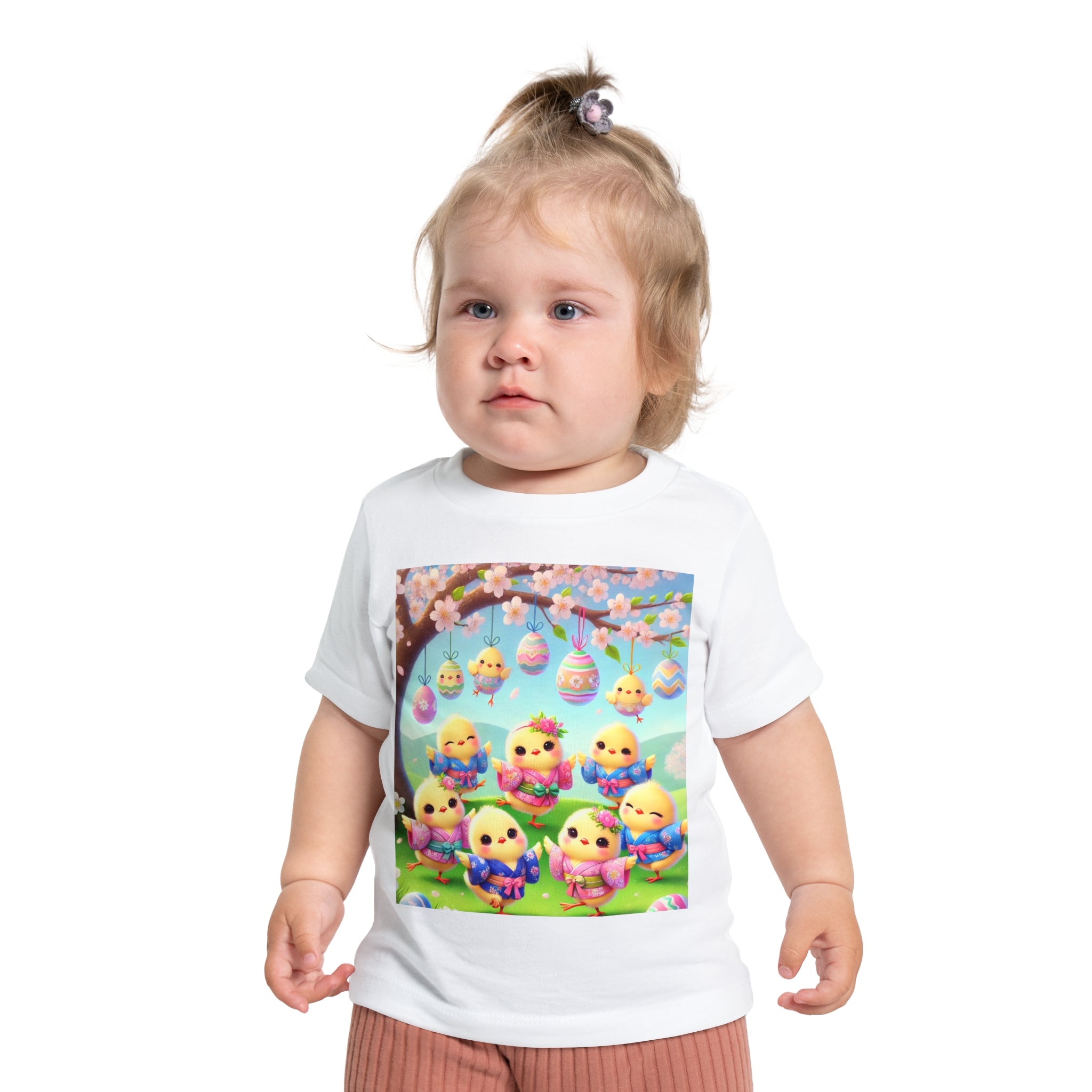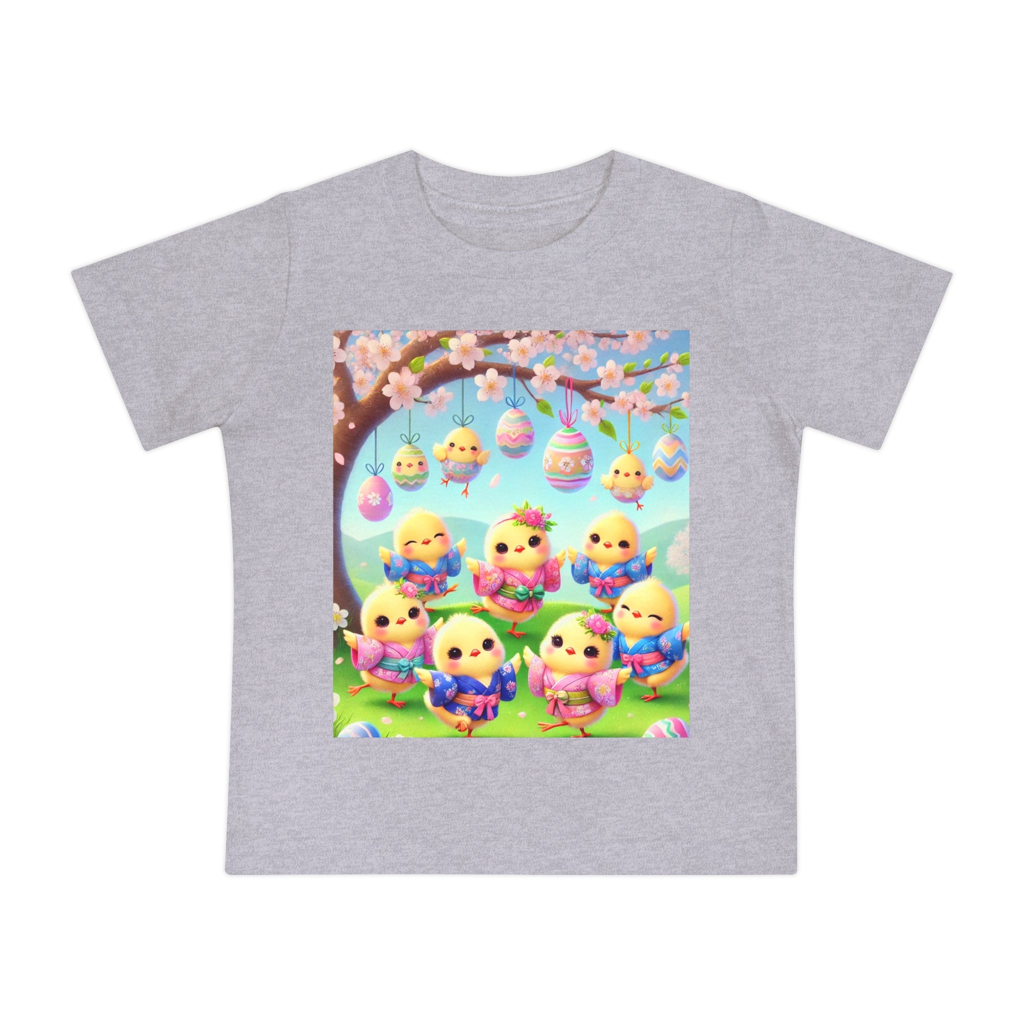 Easter Chicks and Springtime Wishes Baby T-Shirt Baby's first steps should be done with style, and this crew neck t-shirt is here to help. For children—it's super soft and comfortable. For parental figures—it's shrink-resistant and durable. All of that is made possible with the pre-shrunk, 100% airlume combed and ringspun cotton (Athletic Heather: 90/10 airlume combed and ringspun cotton-polyester blend; Additional Heather colors: 52/48 airlume combed and ringspun cotton-polyester blend). Featuring the joyful artwork of Easter Chicks and Springtime Wishes, this tee showcases fluffy yellow chicks gathered beneath blooming branches and hanging Easter eggs, with soft petals, pastel colors, and playful poses that capture togetherness, seasonal renewal, and the warm, lighthearted magic of Easter.