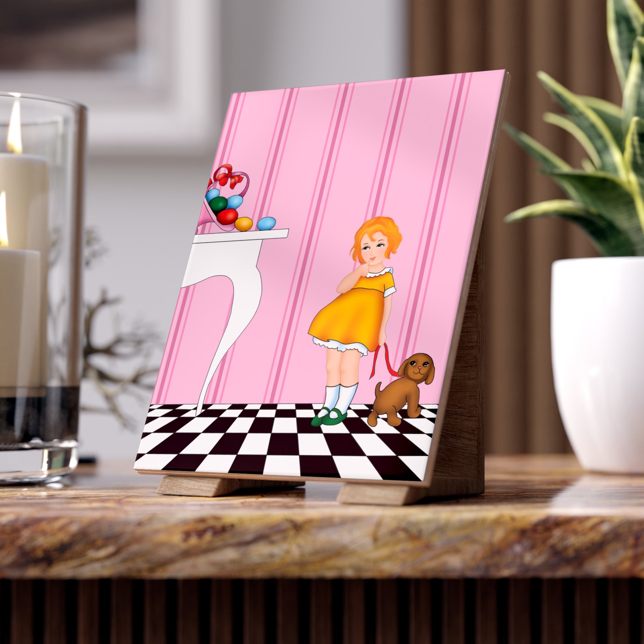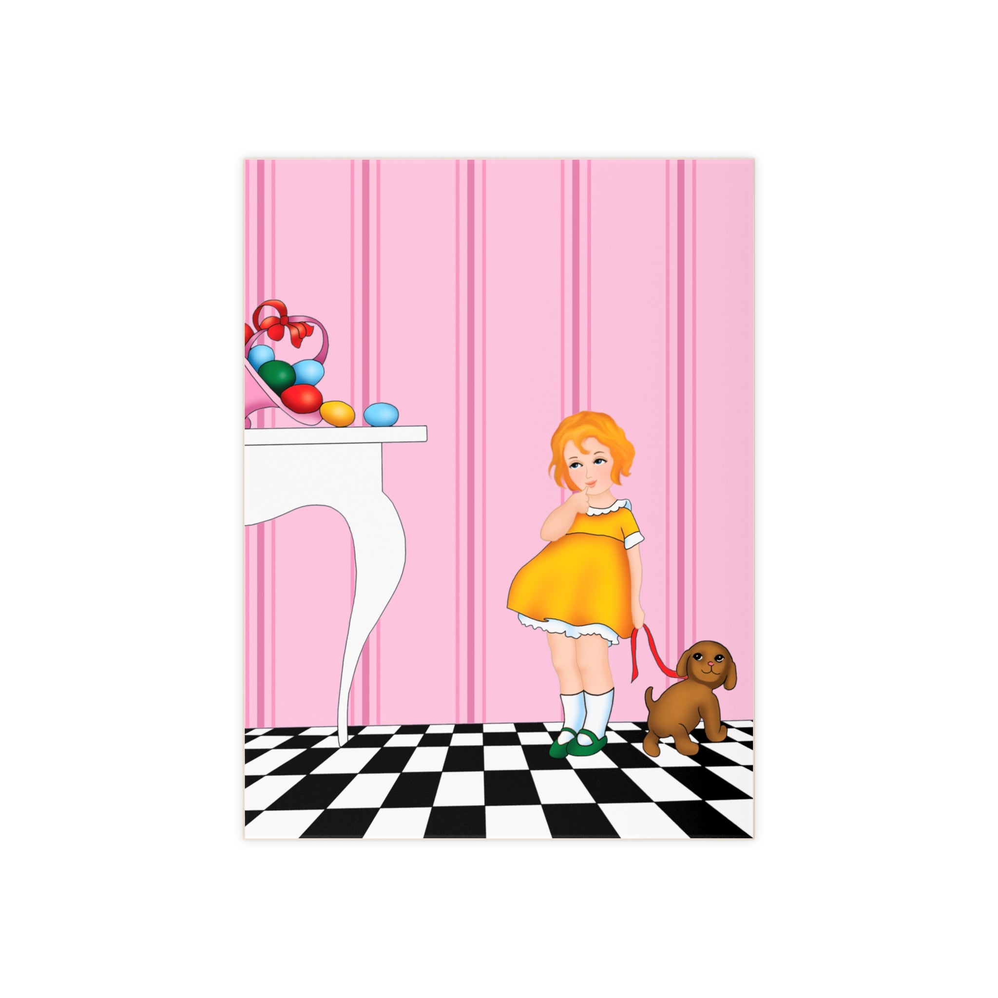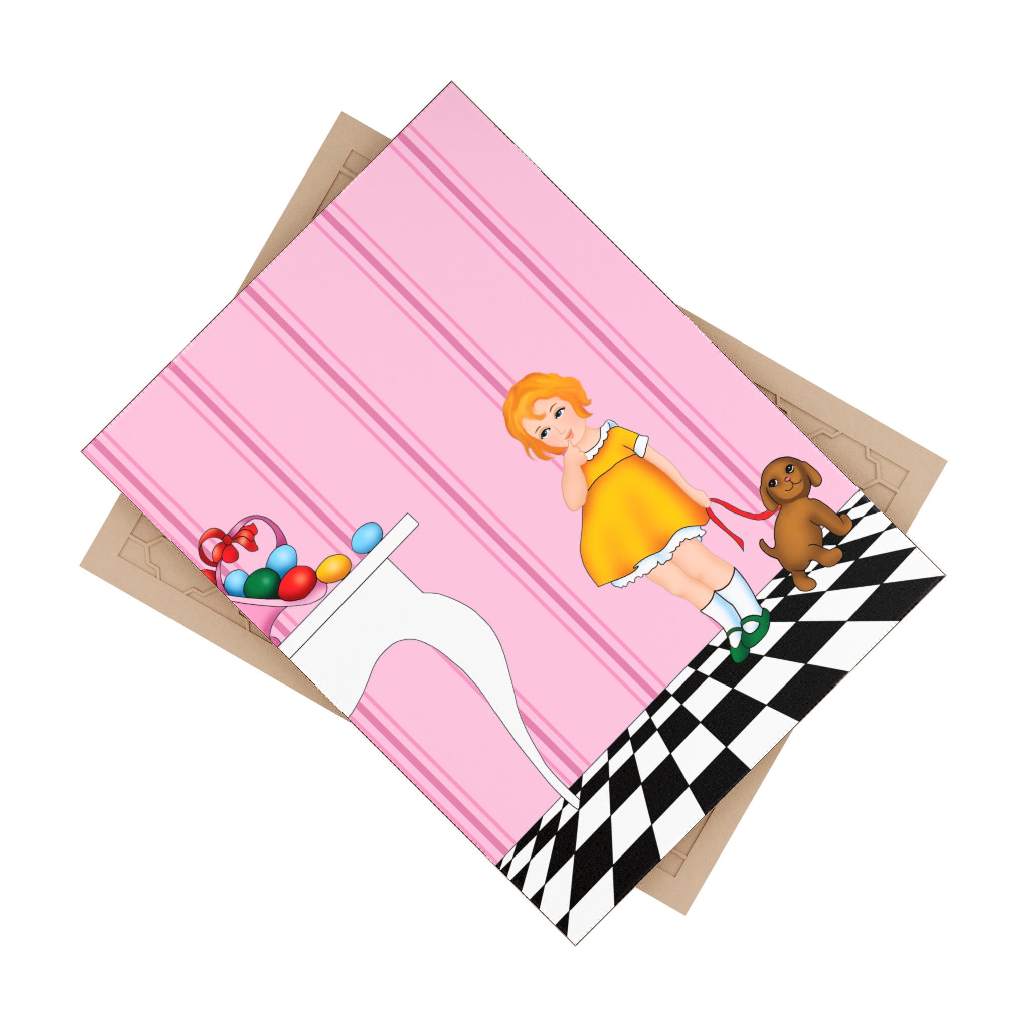 The artwork depicts a tender moment of childhood innocence set in a softly stylized interior: a young girl in a golden dress stands on a black-and-white checkerboard floor, holding the ribbon leash of her small puppy. Pastel pink striped walls and a white table filled with colorful Easter eggs complete the scene, blending playful holiday joy with elegant, vintage-inspired design in a bright, illustrative palette.