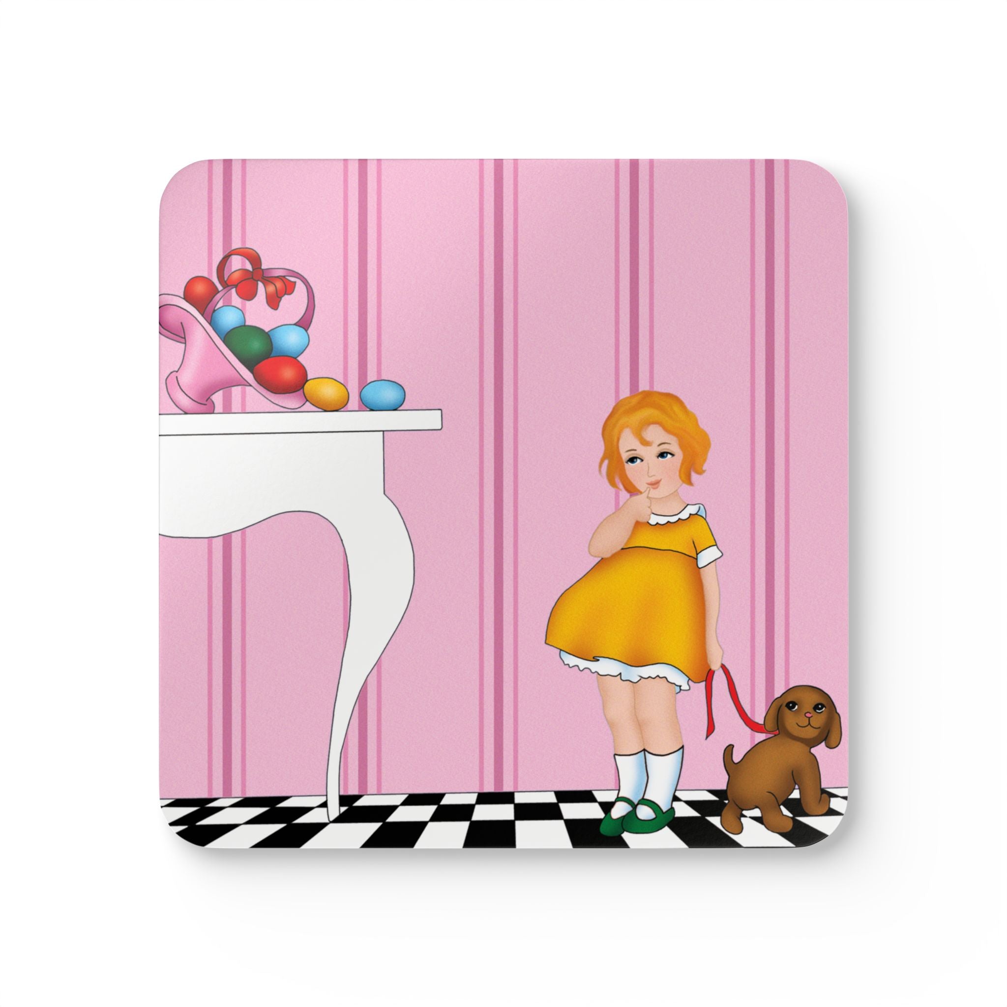 The artwork depicts a tender moment of childhood innocence set in a softly stylized, Art Deco–inspired interior. A young girl in a golden dress stands on a black-and-white checkerboard floor, holding the ribbon leash of her small puppy, while pastel pink striped walls and a white table filled with colorful Easter eggs create a playful, elegant springtime scene rendered in a cheerful, illustrative style.
