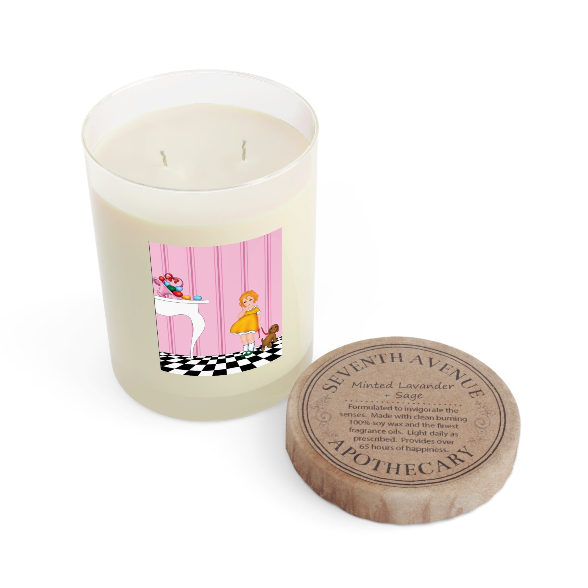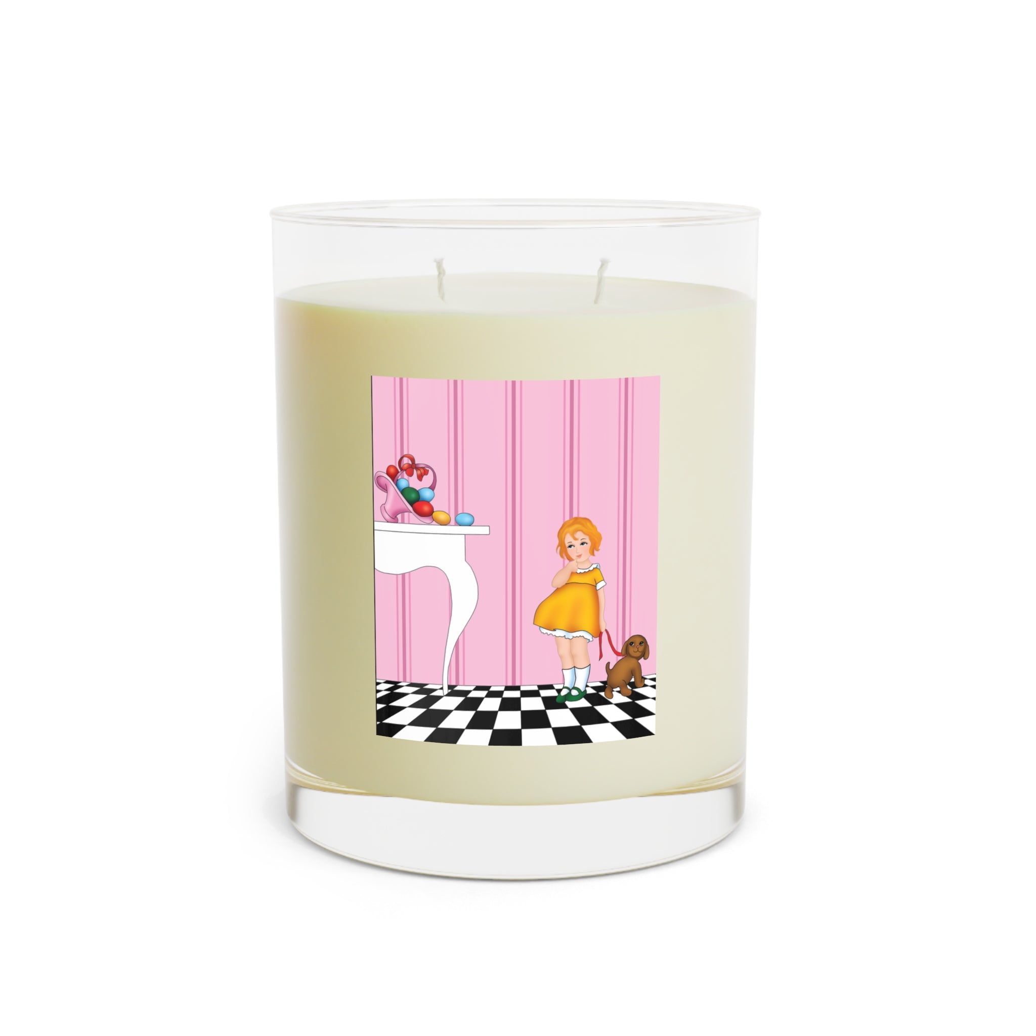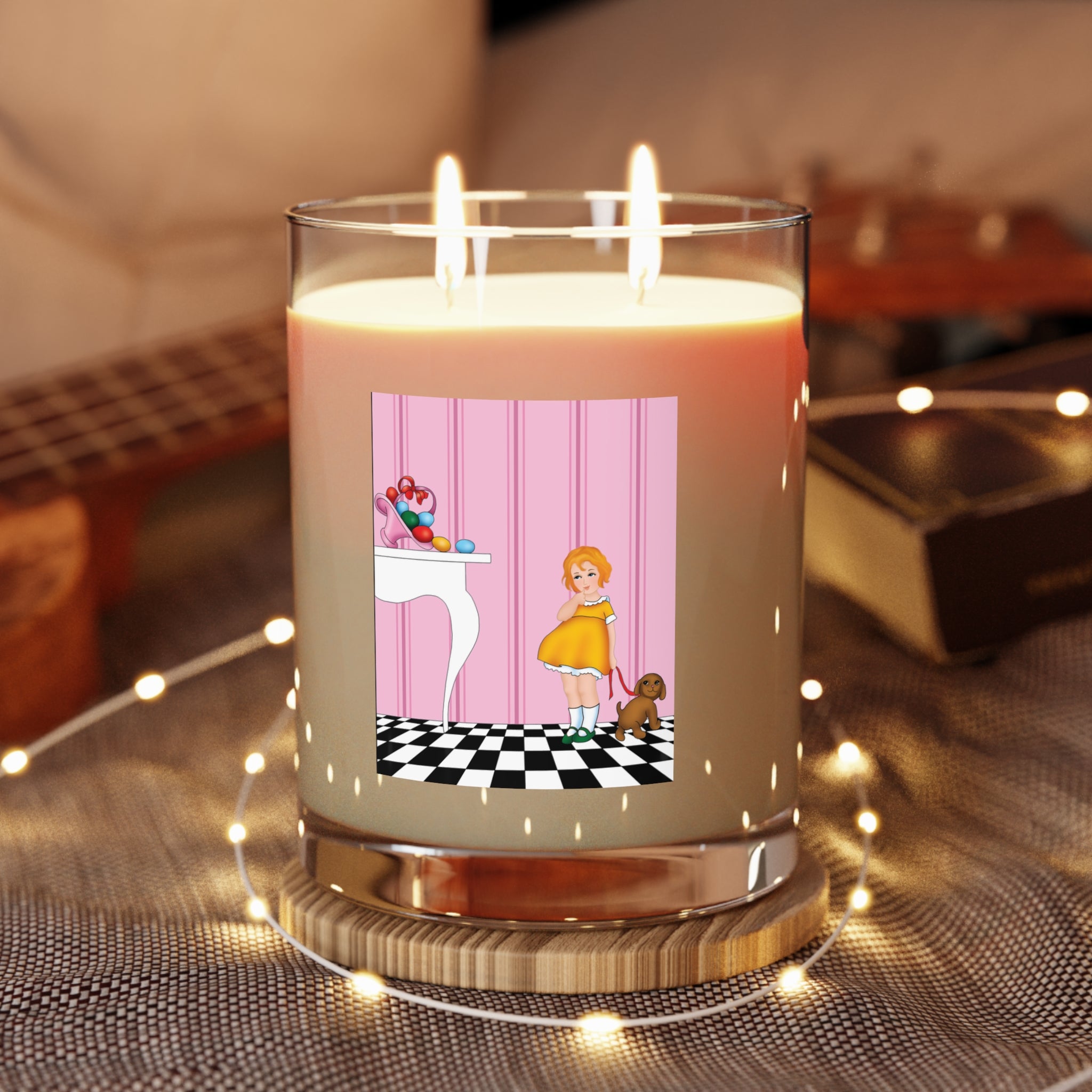 The wrap-around artwork depicts a tender moment of childhood innocence set in a softly stylized, Art Deco–inspired interior. A young girl in a golden dress stands on a black-and-white checkerboard floor, holding the ribbon leash of her small puppy, while pastel pink striped walls and a white table filled with colorful Easter eggs create a playful, elegant springtime scene. The cheerful, illustrative style pairs perfectly with soothing scents—turning a simple candle into a bright seasonal accent for your home.