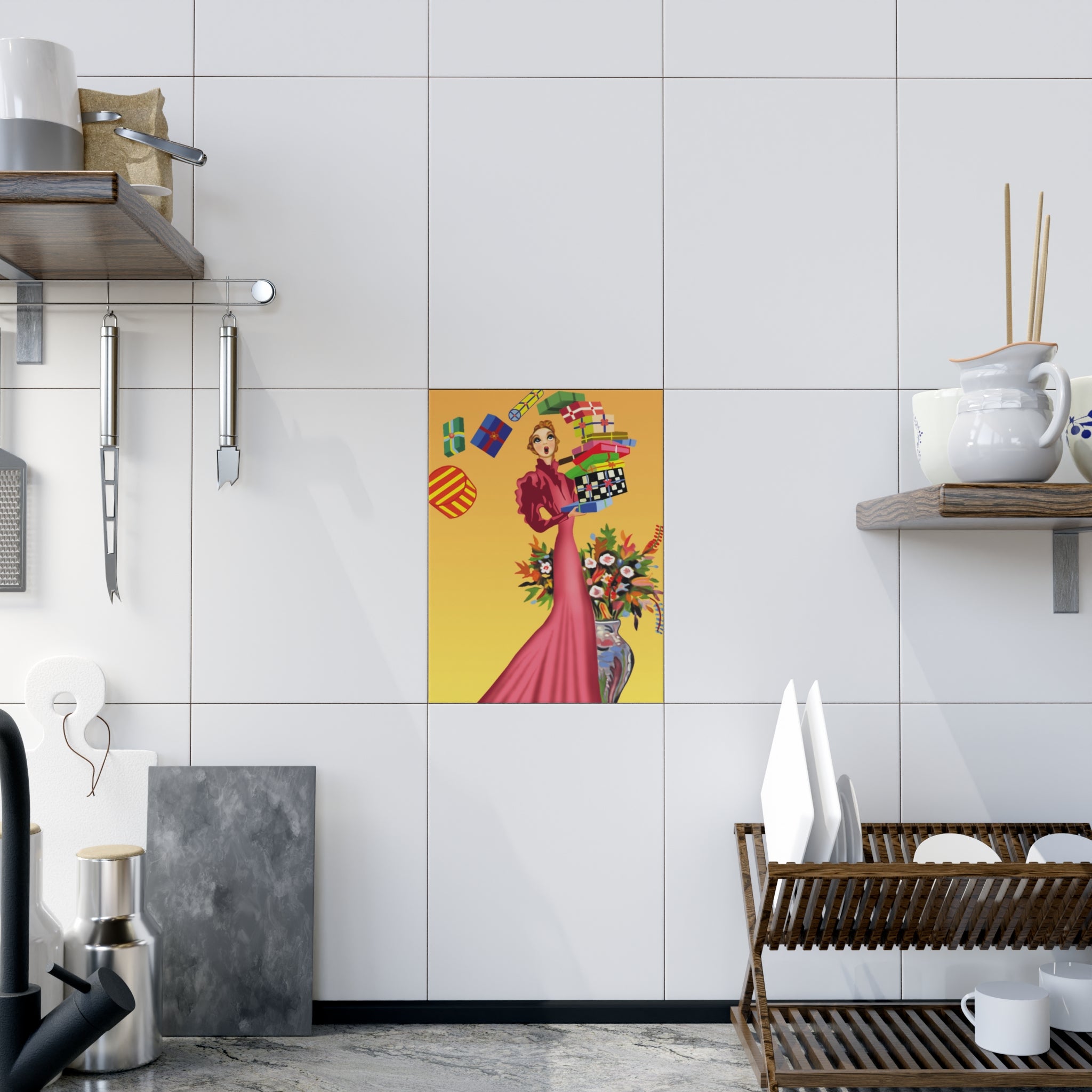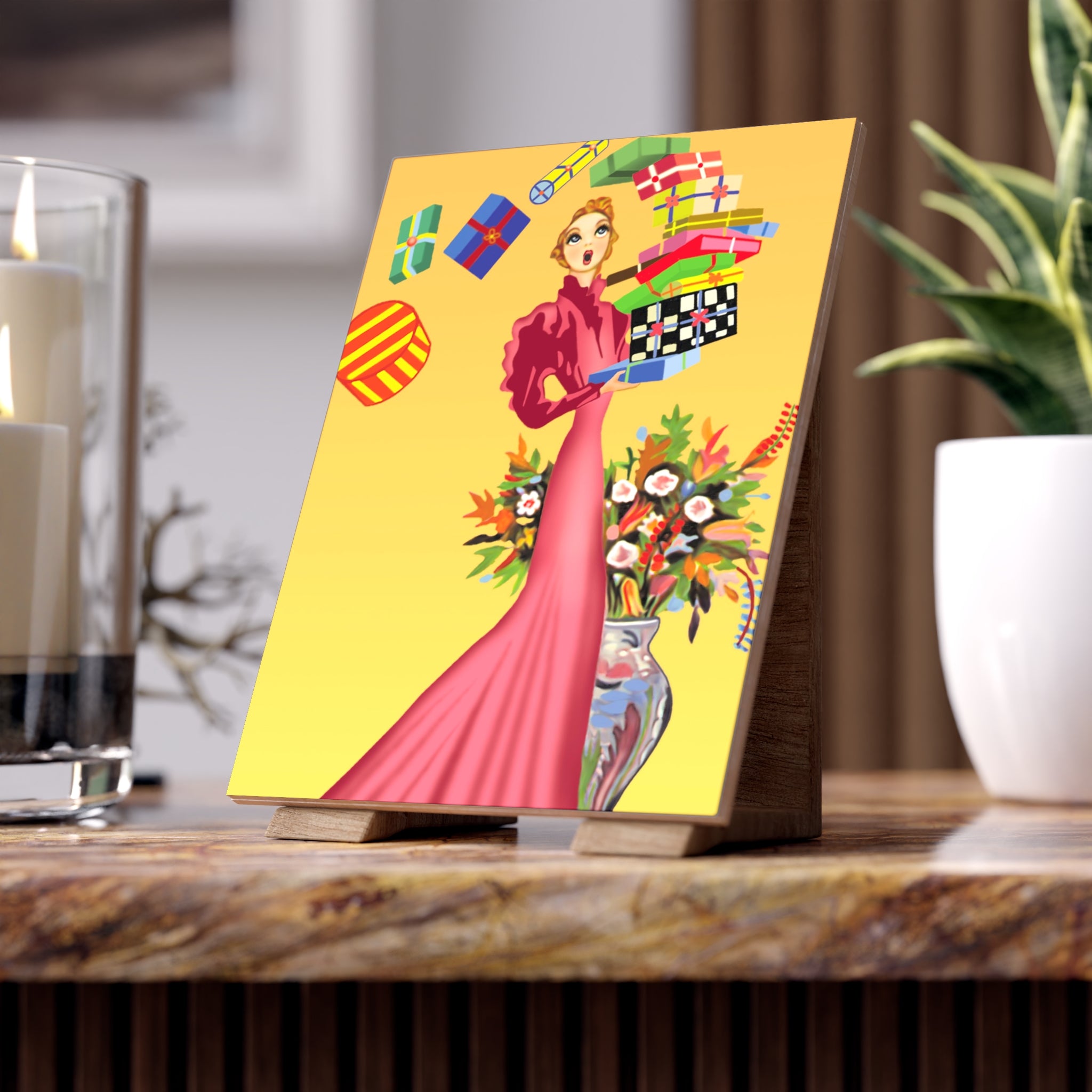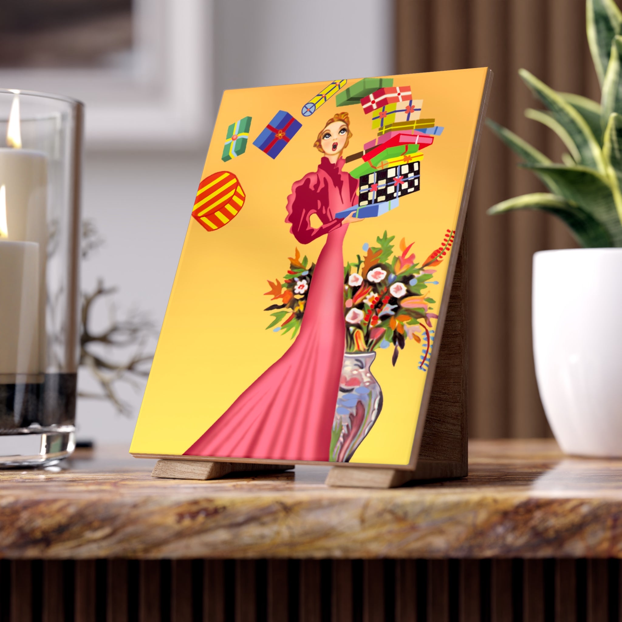 Turn everyday décor into a festive centerpiece with the Elegant Holiday Woman with Gifts Ceramic Tile. The artwork tells a joyful holiday story: a graceful woman in a flowing rose-pink gown balances a tower of brightly wrapped gifts, while a silver vase bursts with vibrant seasonal flowers. Framed by bold red, green, and black borders, the design captures timeless elegance with playful holiday whimsy.