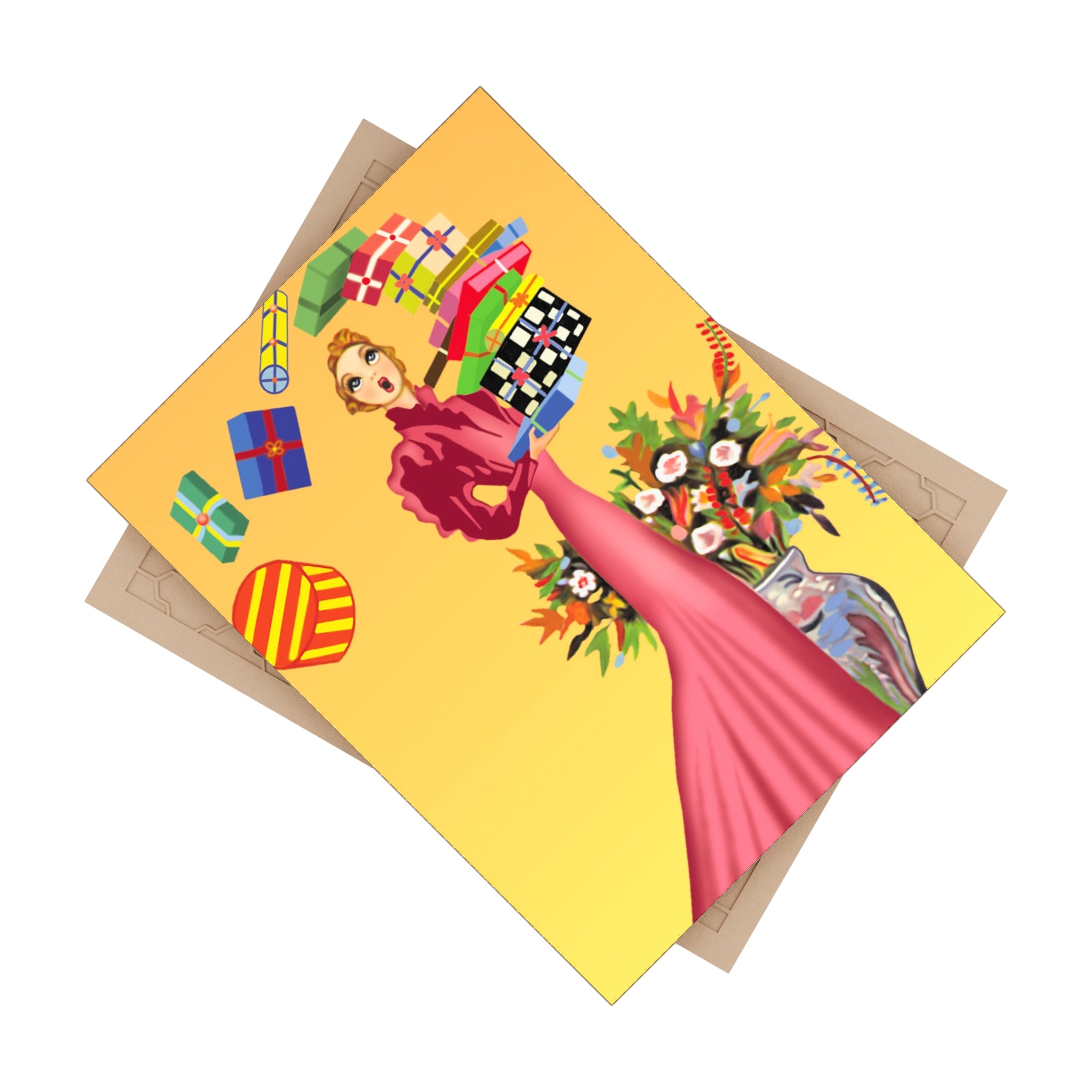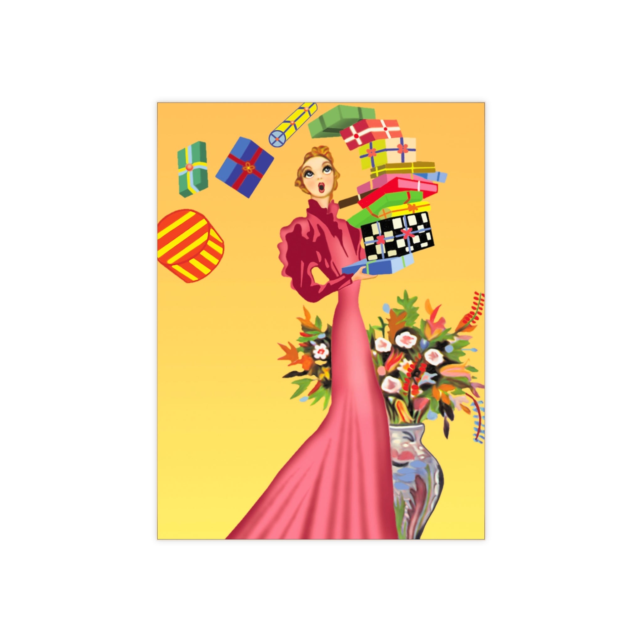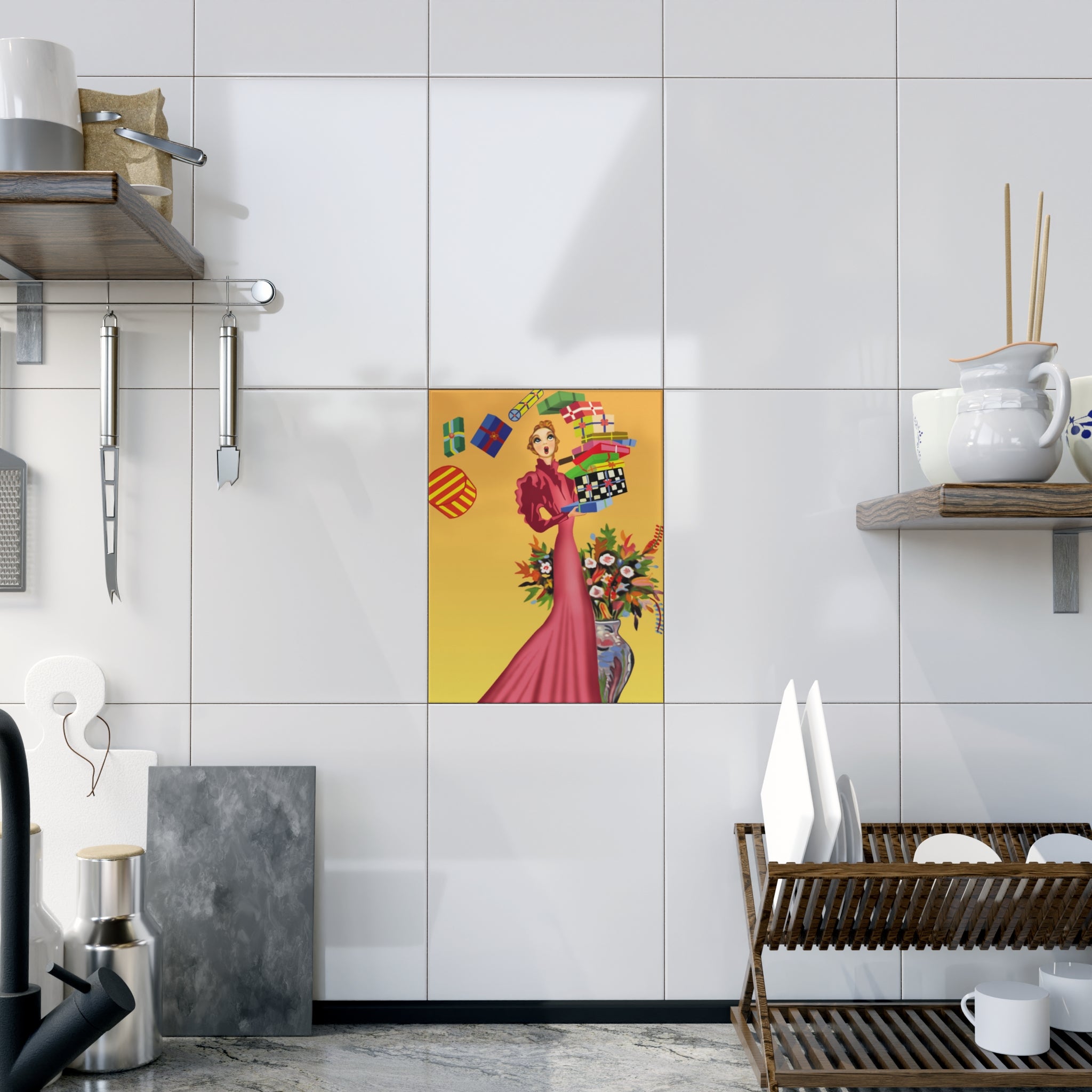 Turn everyday décor into a festive centerpiece with the Elegant Holiday Woman with Gifts Ceramic Tile. The artwork tells a joyful holiday story: a graceful woman in a flowing rose-pink gown balances a tower of brightly wrapped gifts, while a silver vase bursts with vibrant seasonal flowers. Framed by bold red, green, and black borders, the design captures timeless elegance with playful holiday whimsy.