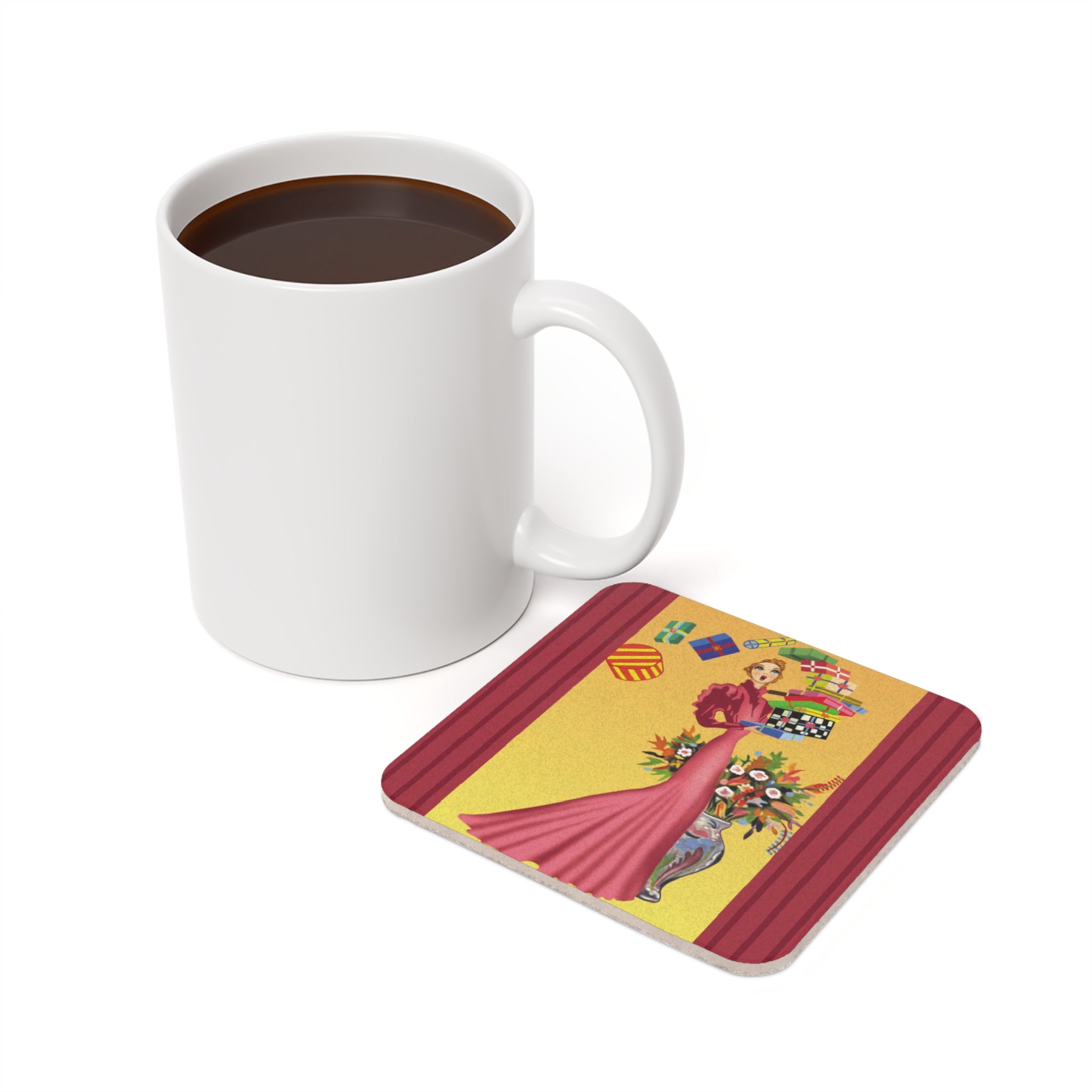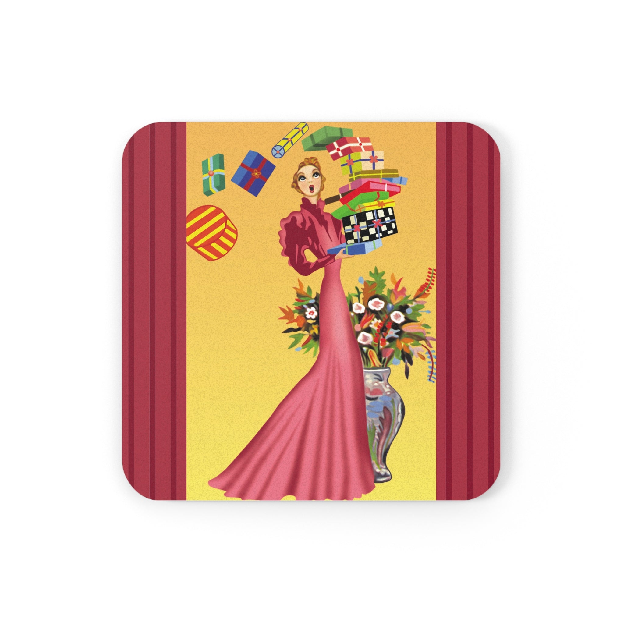 Protect your surfaces with a touch of festive elegance. The Elegant Holiday Woman with Gifts Cork Back Coaster transforms a functional piece into a work of holiday art. The design tells a joyful story: a graceful woman in a flowing rose-pink gown steadies a tower of brightly wrapped gifts beside a silver vase of vibrant flowers. Framed by bold red, green, and black borders, the scene radiates playful whimsy and timeless holiday sophistication—bringing warmth and charm to every table.