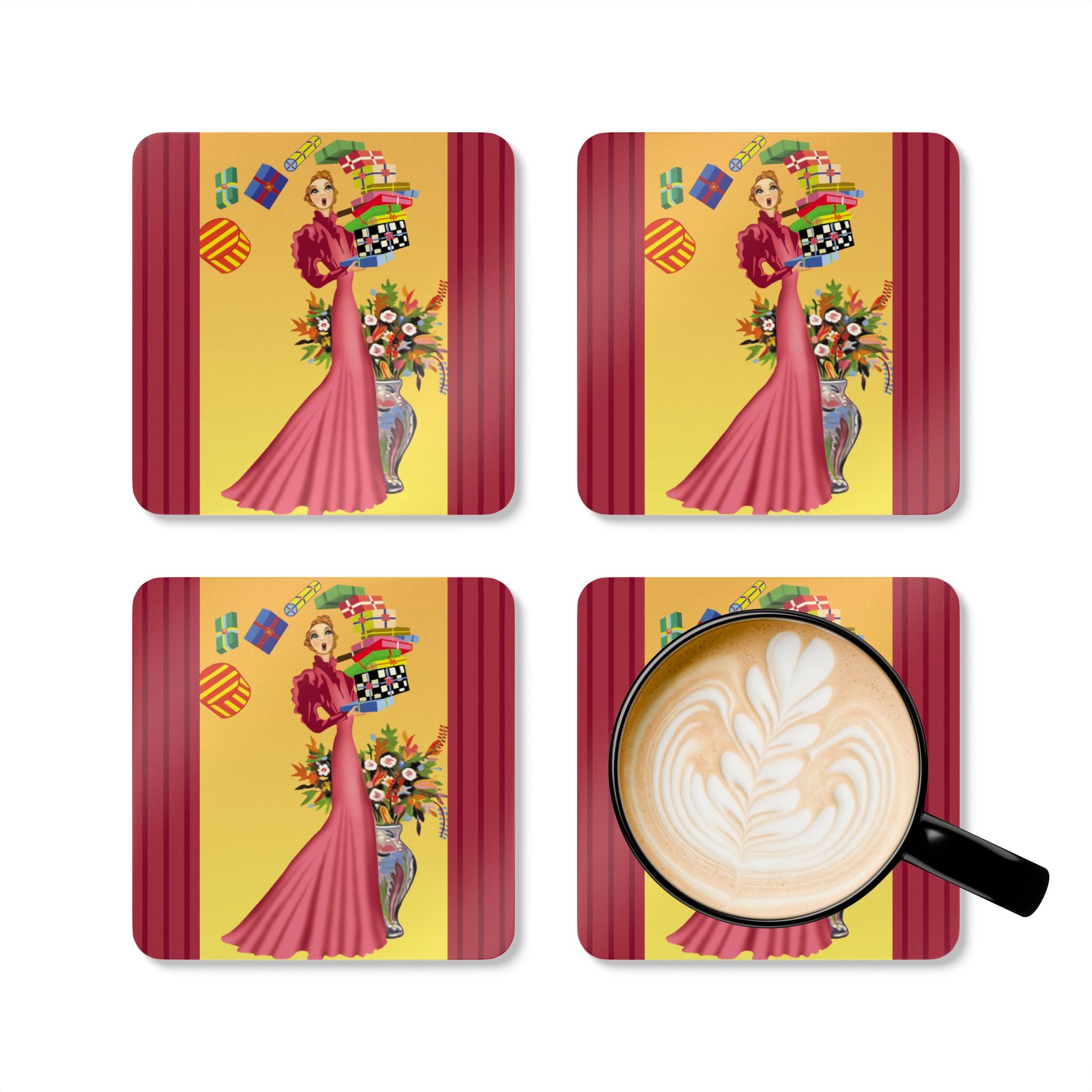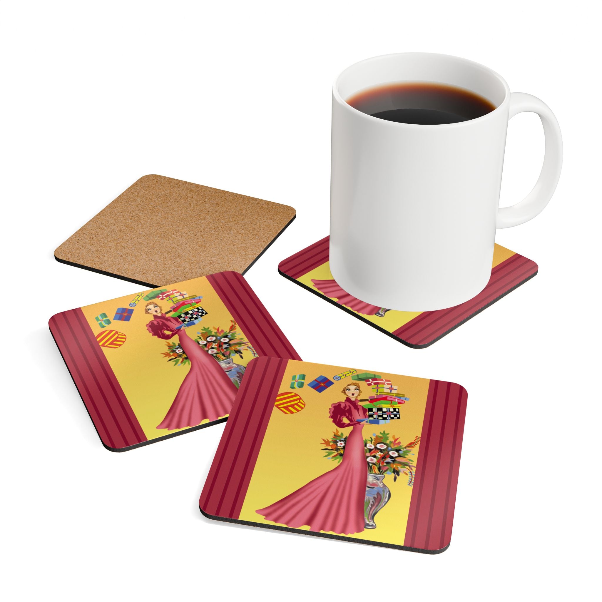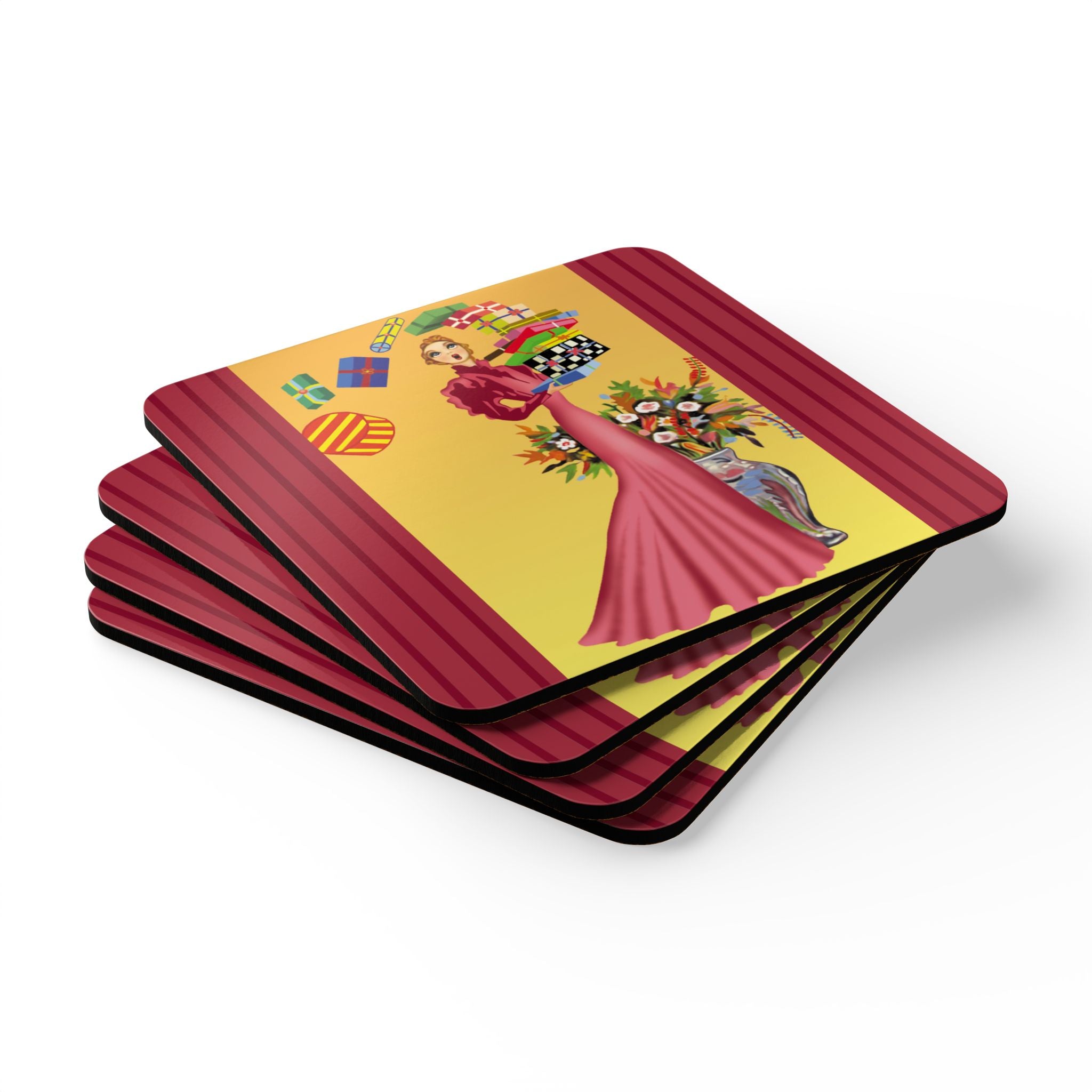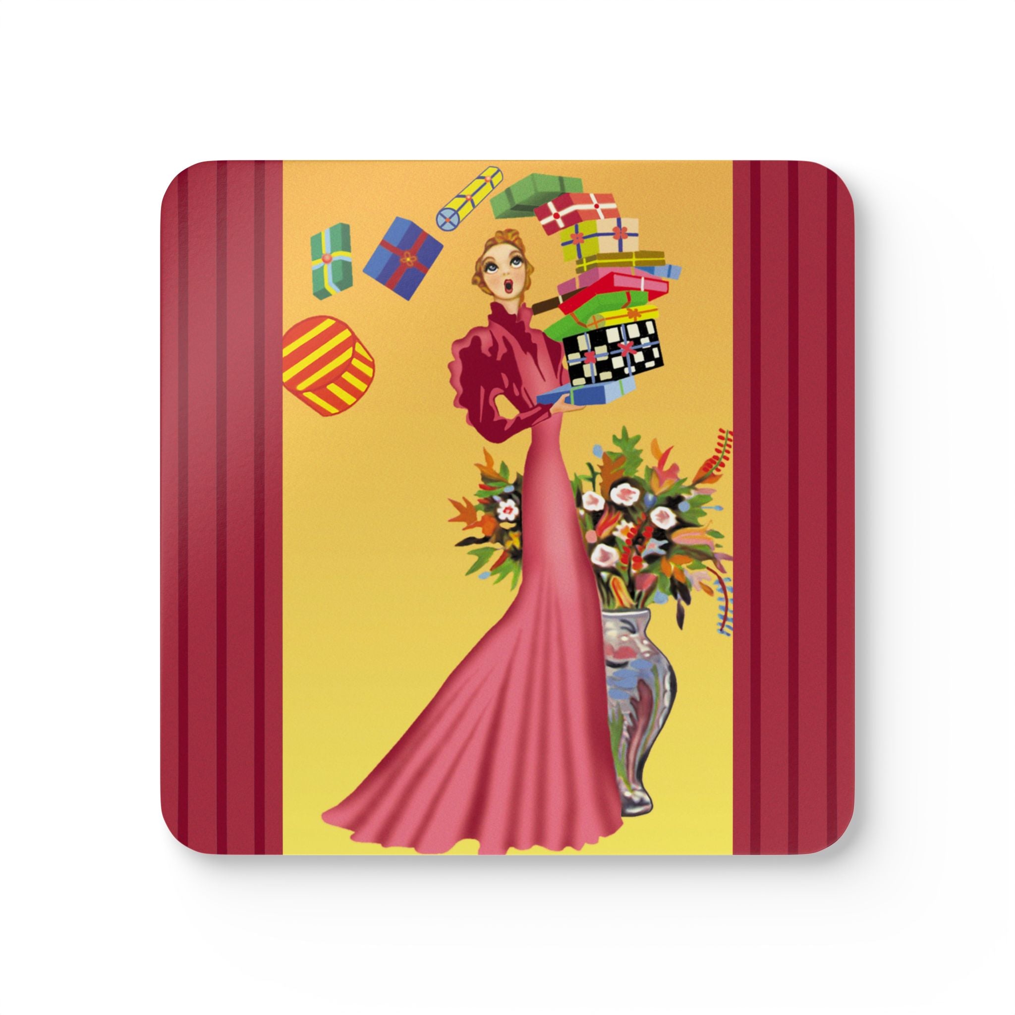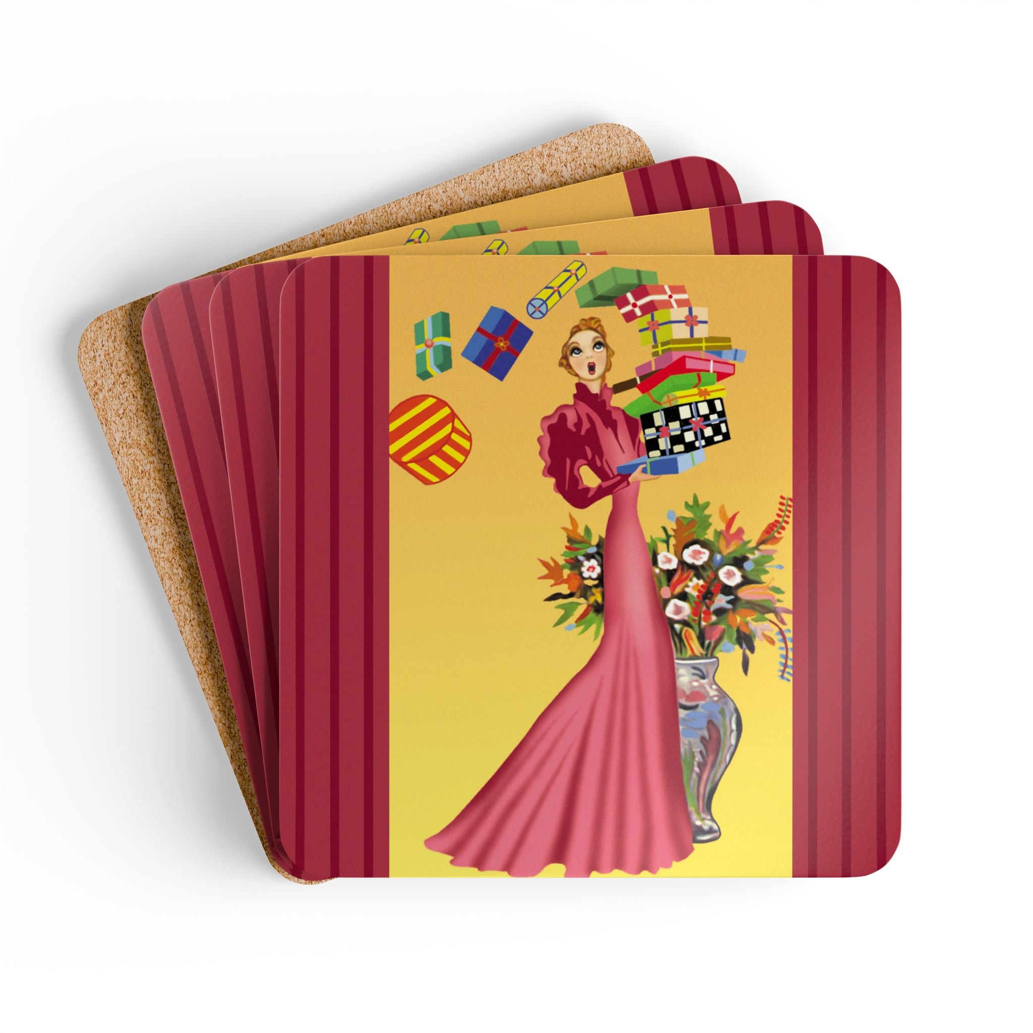 Add festive elegance to your table with the Elegant Holiday Woman with Gifts Corkwood Coaster Set. Each coaster captures a whimsical holiday scene: a graceful woman in a flowing rose-pink gown balances a tower of brightly wrapped gifts beside a silver vase bursting with seasonal flowers. Framed by bold red, green, and black borders, the design radiates playful charm and timeless sophistication—bringing holiday cheer to every gathering.