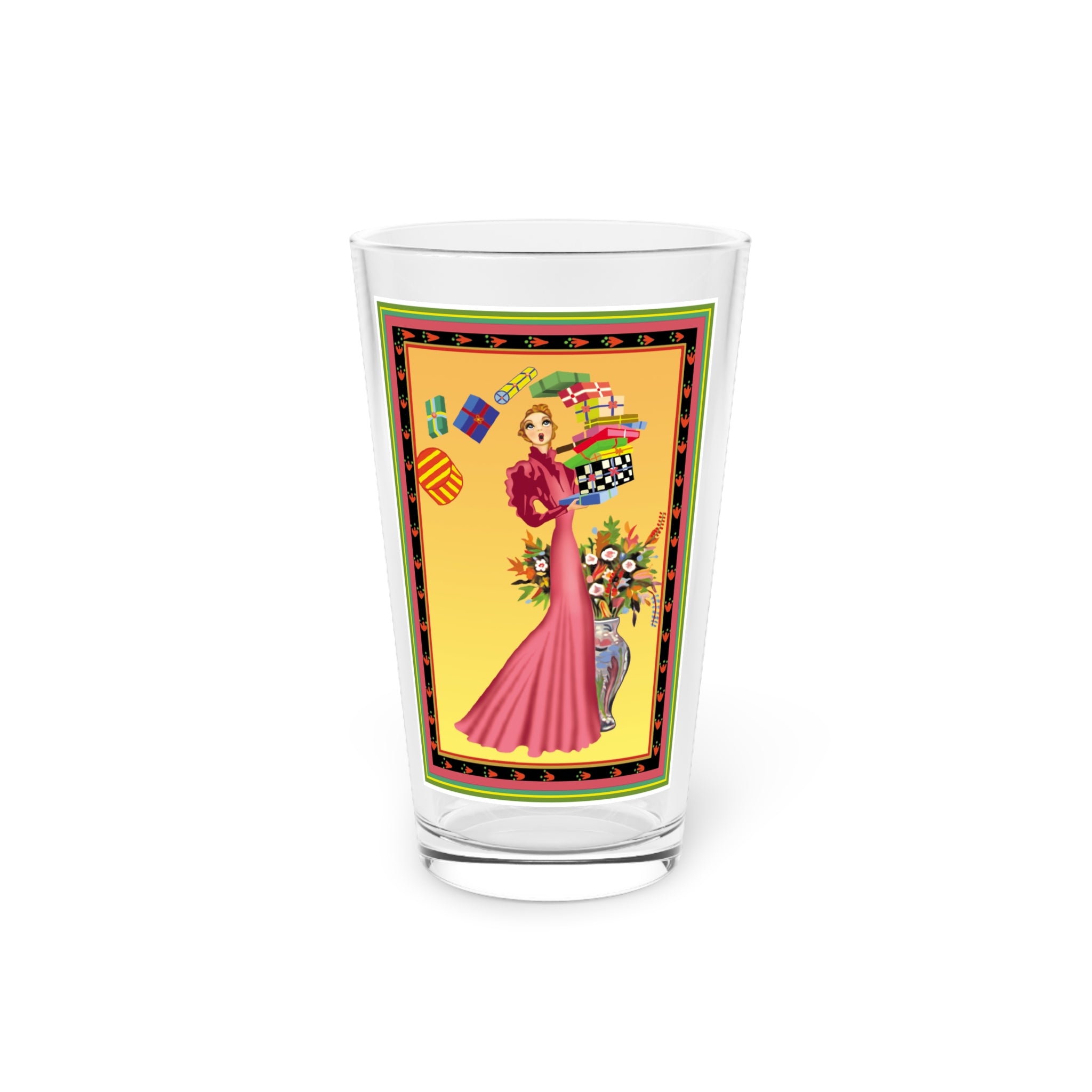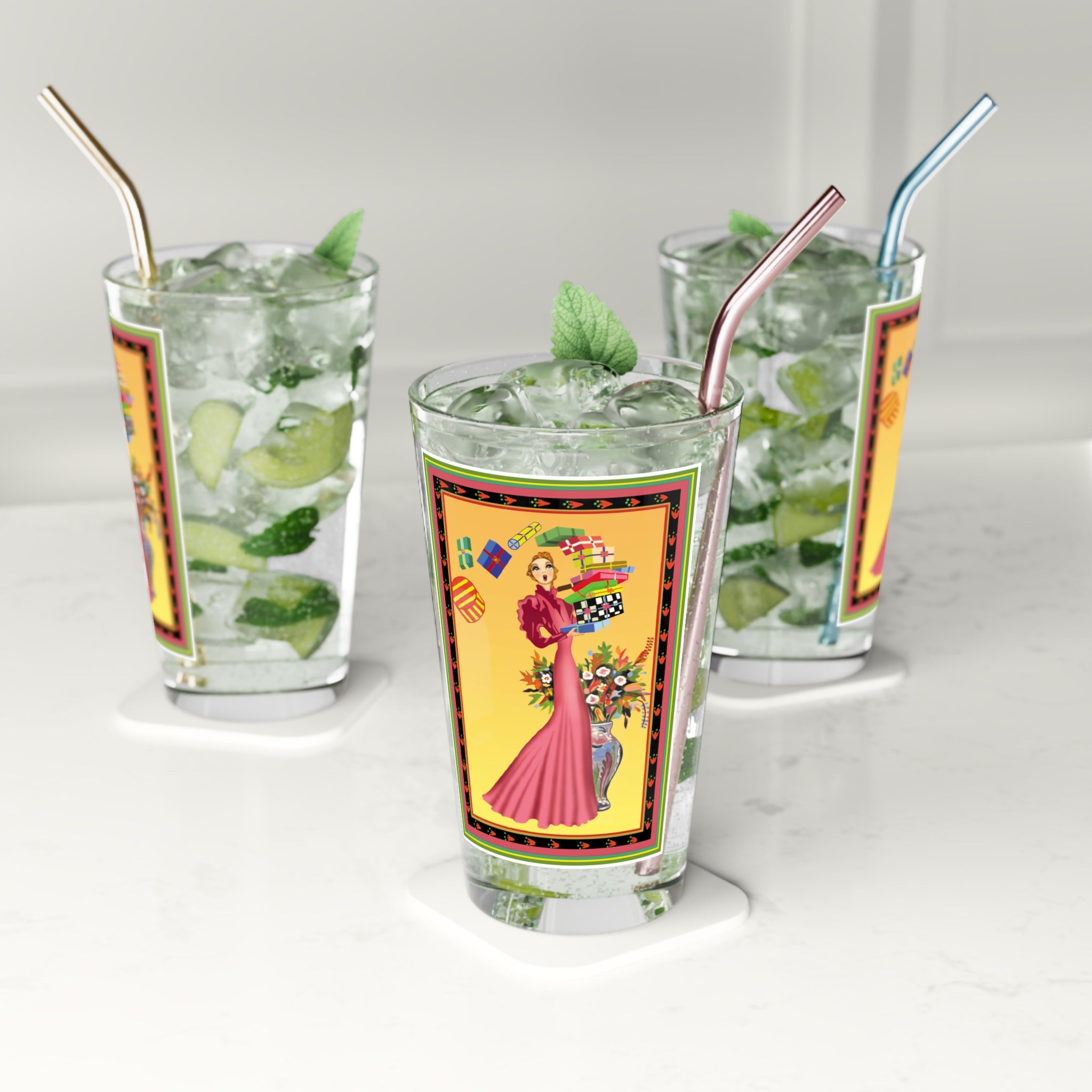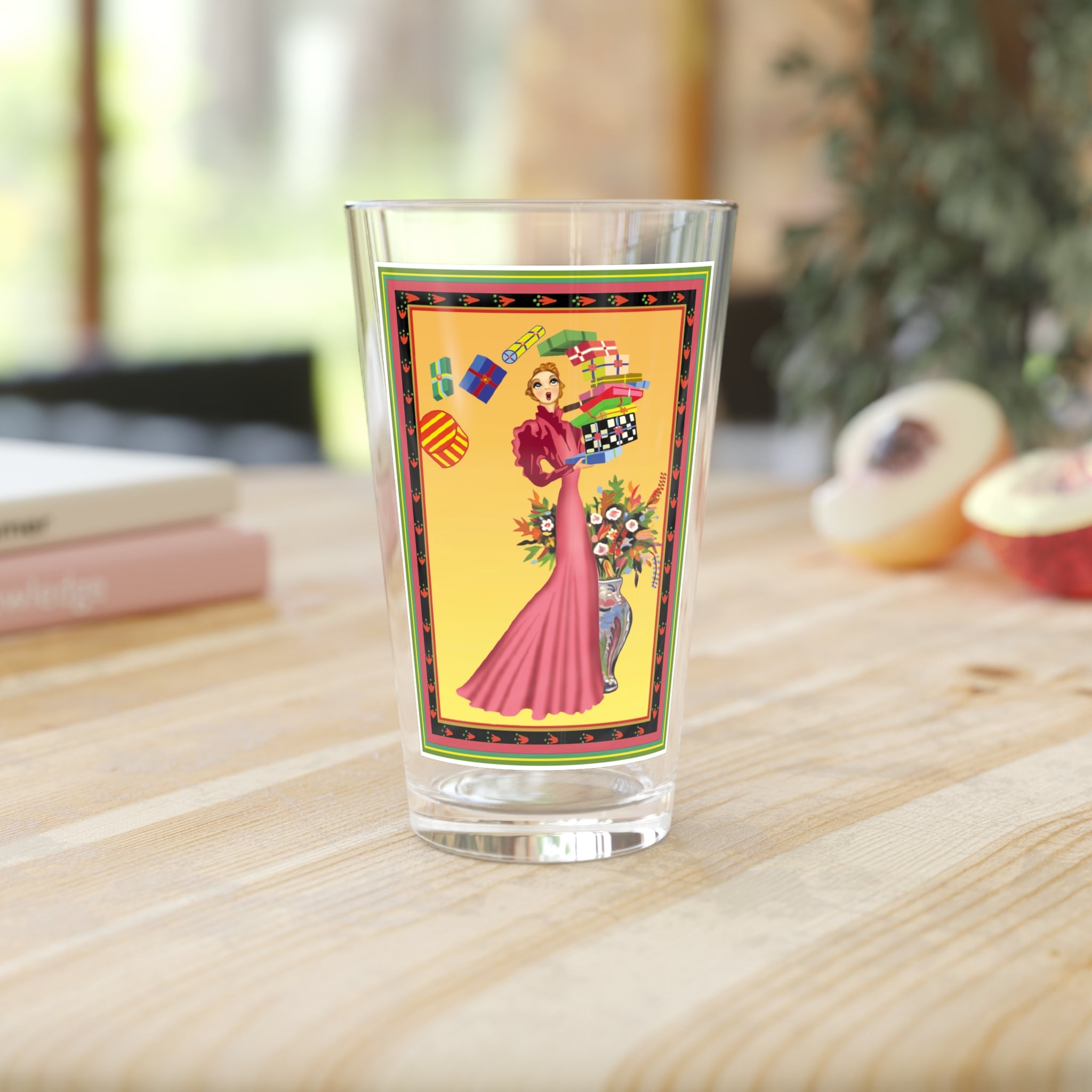 Add festive charm to every pour with the Elegant Holiday Woman with Gifts Glass. A graceful woman in a rose-pink gown balances a tower of holiday gifts beside a silver vase of flowers, all framed by a bold red, green, and black border.