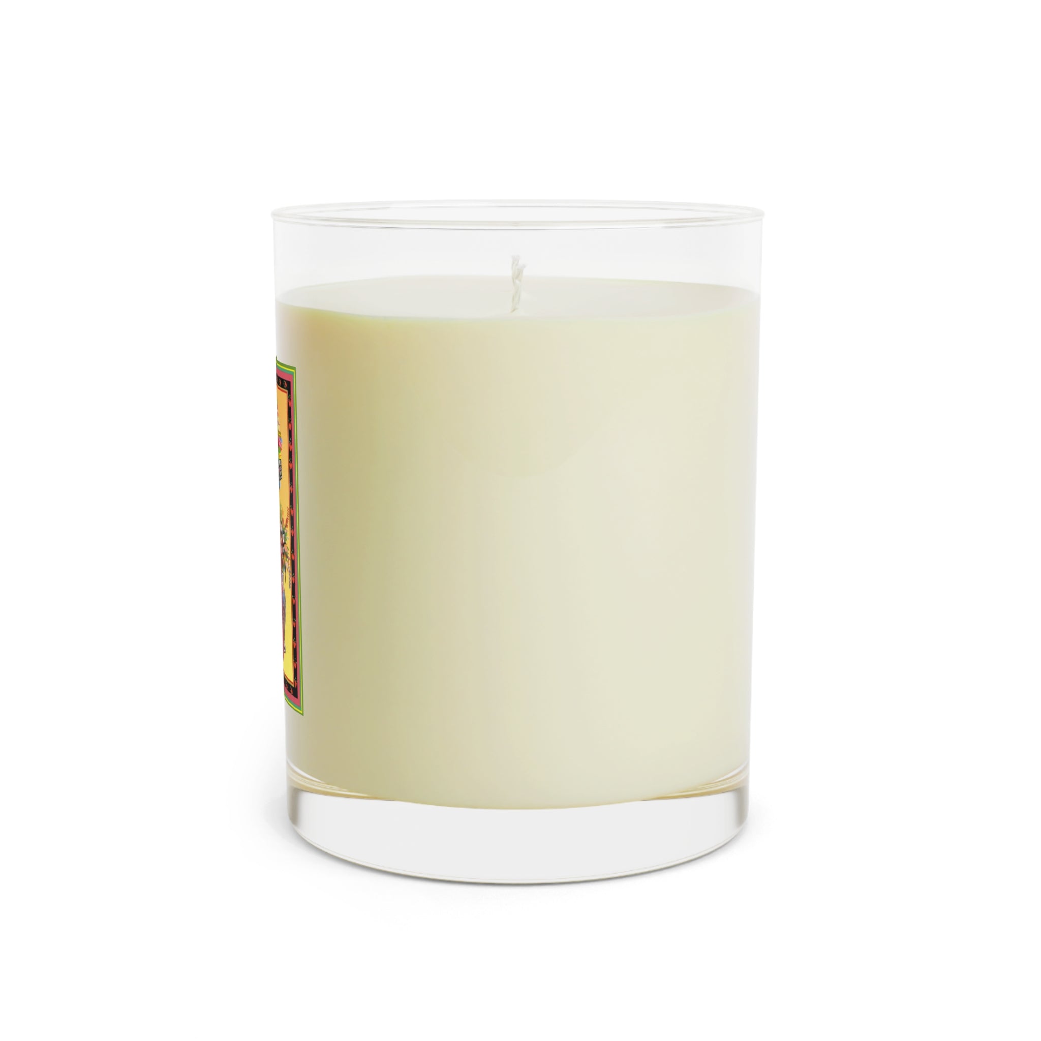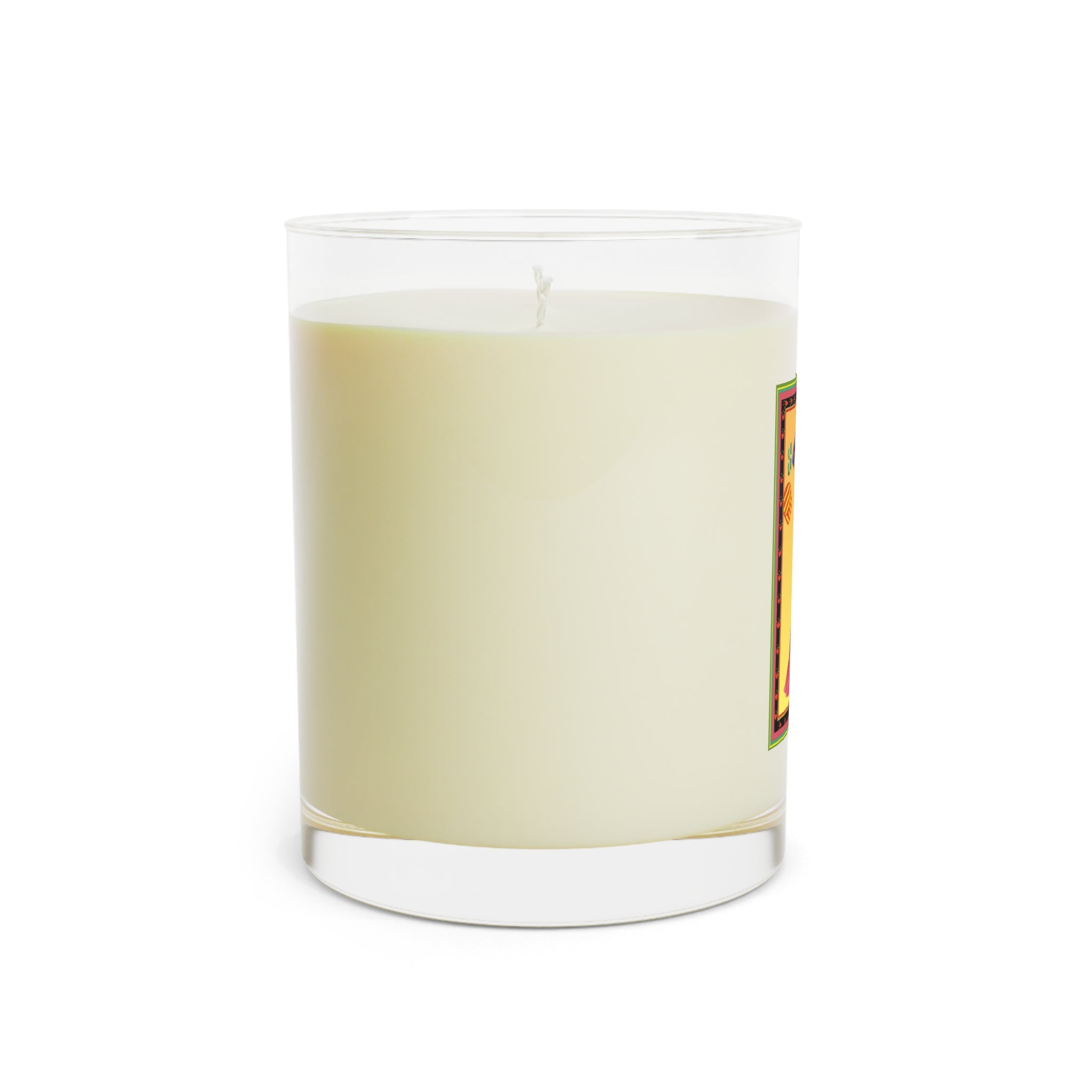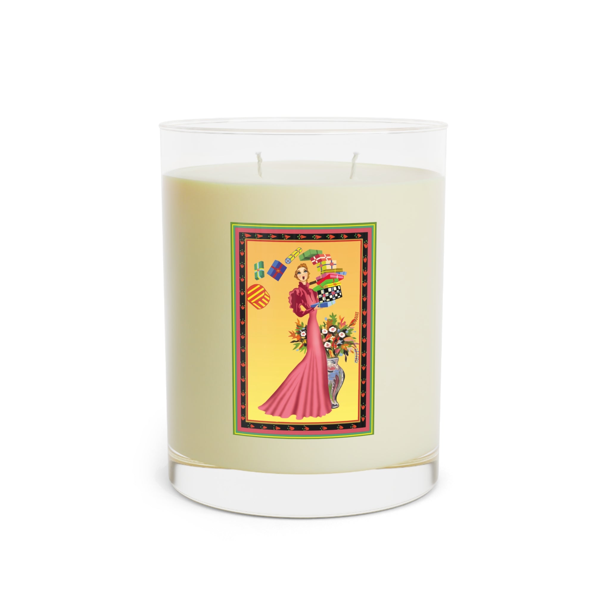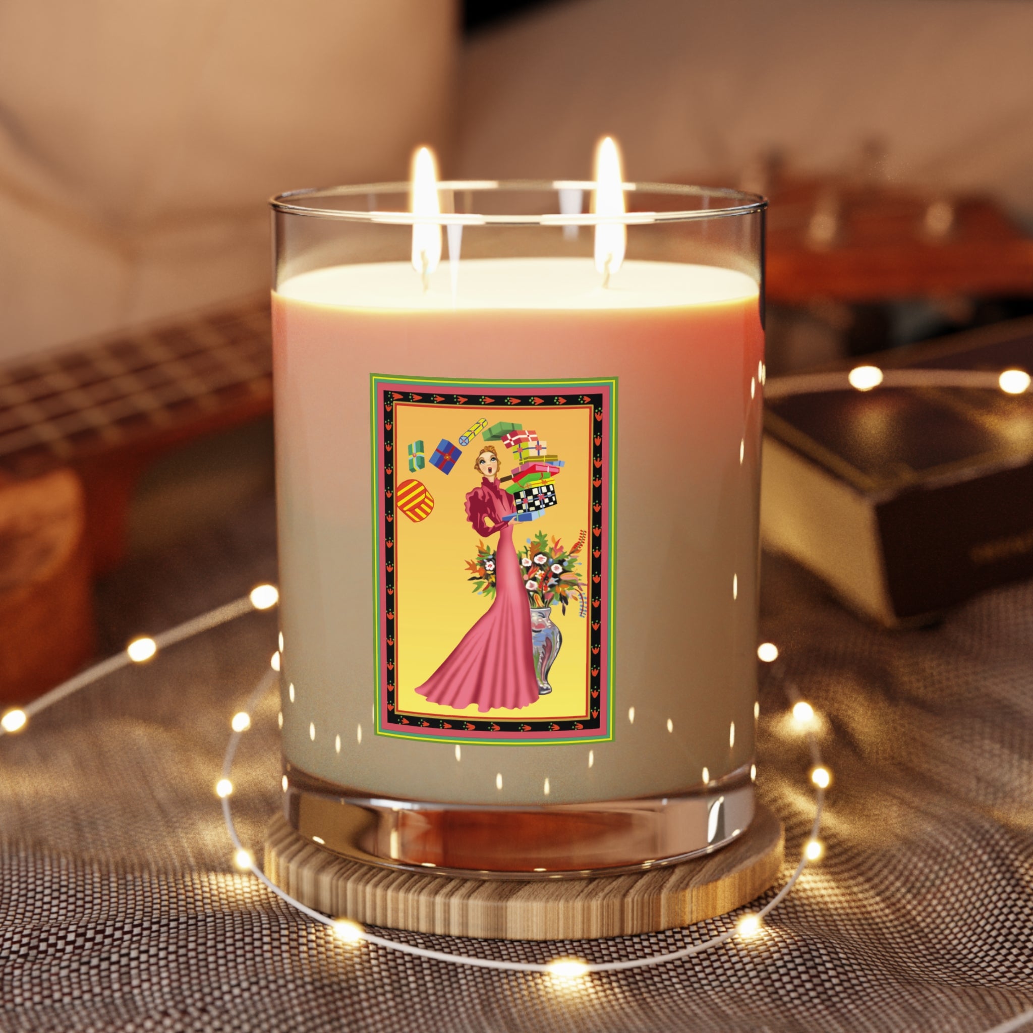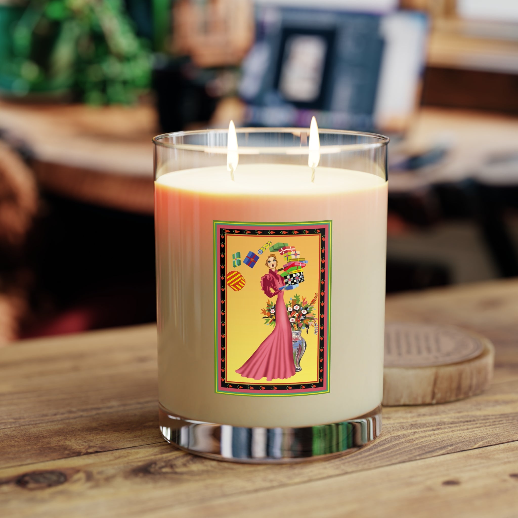 Create a cozy holiday atmosphere with the Elegant Holiday Woman with Gifts Scented Candle. The glass jar is wrapped in a festive artwork that tells a story of abundance and charm: a graceful woman in a flowing rose-pink gown steadies a tower of brightly wrapped gifts, while a silver vase overflows with seasonal flowers. Framed by bold red, green, and black borders, the design captures both playful whimsy and timeless holiday elegance.
